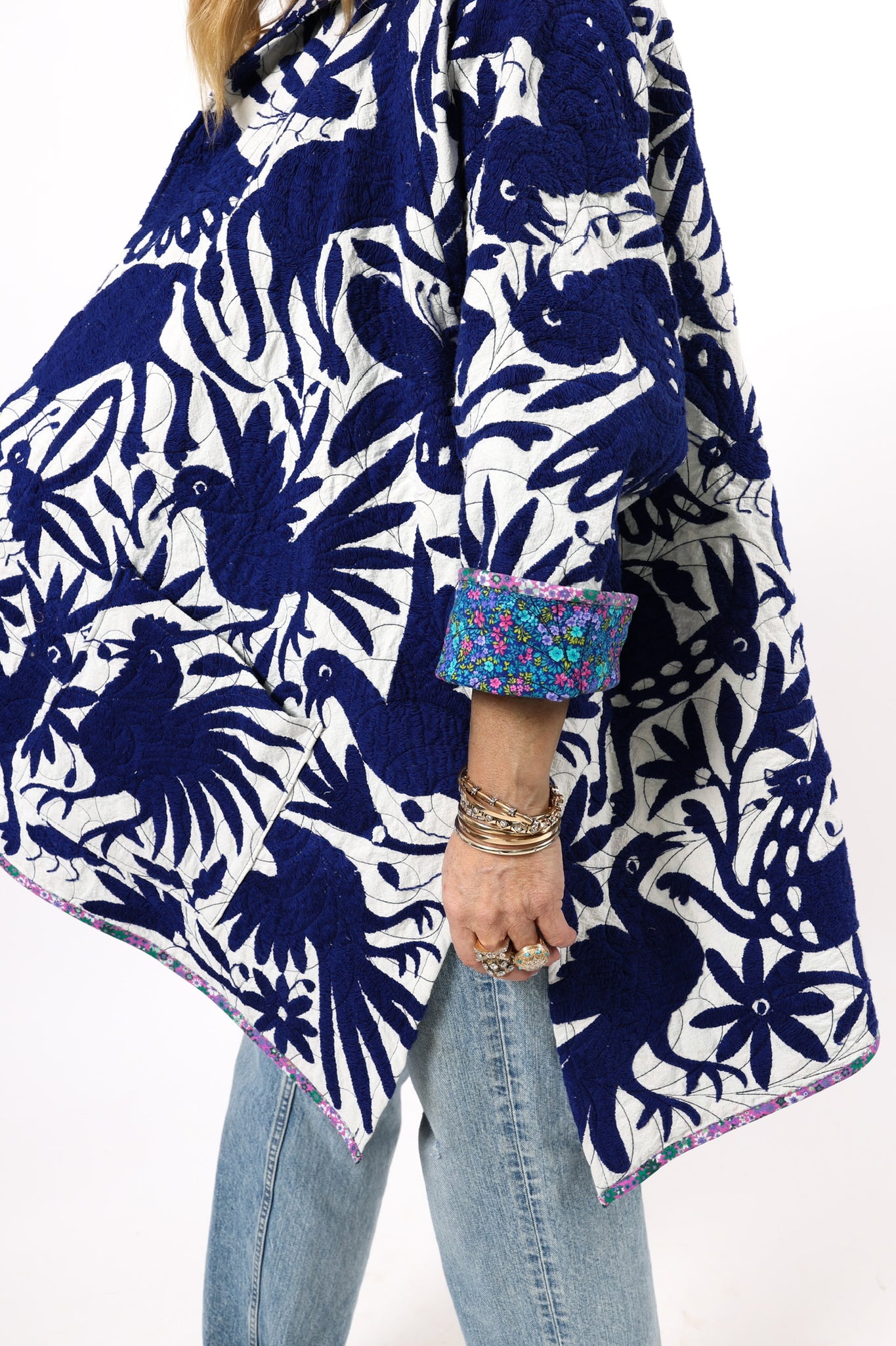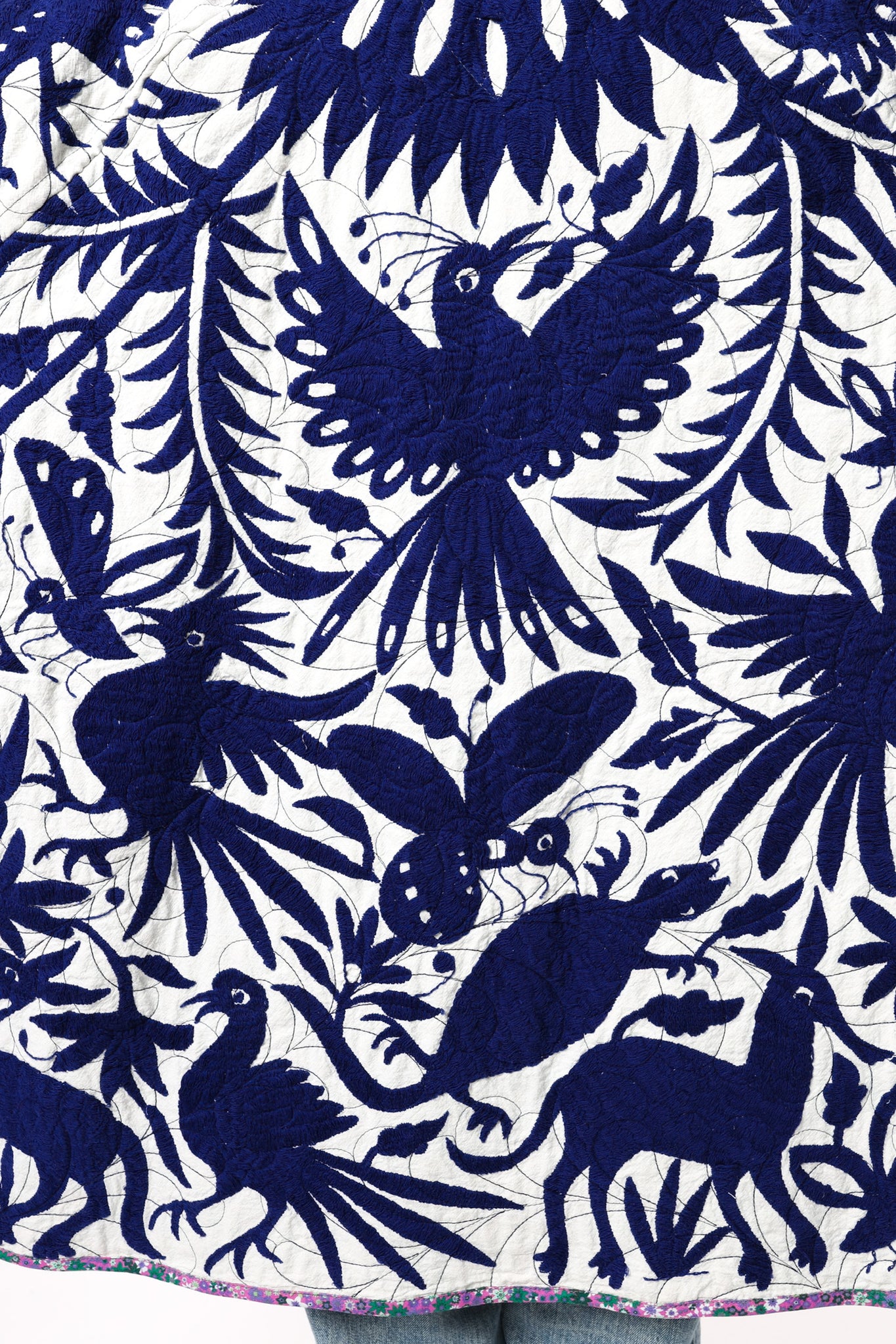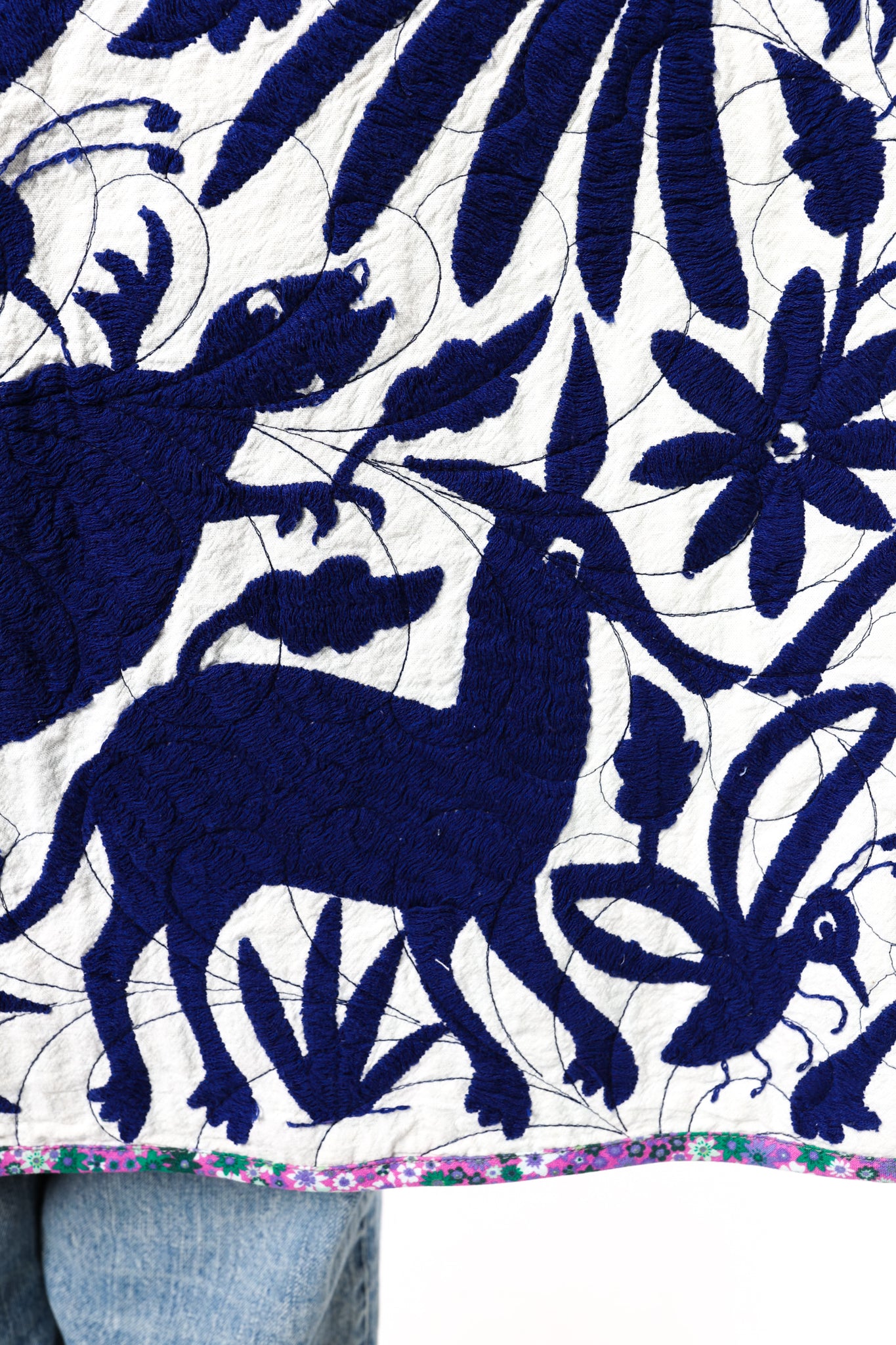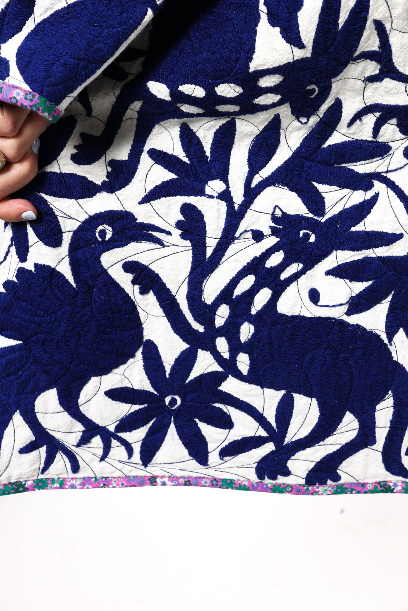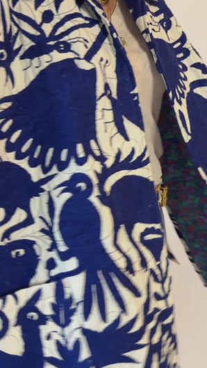 This is a hand embroidered Otomi from San Miguel, Mexico. These handmade Otomis are becoming harder and harder to find because younger generations are not continuing the traditions of their ancestors. Otomi embroidery is a Mexican style of hand embroidery. The Otomi textiles, also known as tenangos, take weeks or even years for the women to embroider. They are said to be based off of cliff paintings in the Tepehua-Otomi mountains in the area. Some say that they may be also inspired by cave paintings in the Mexican Plateau area. The embroidery is done on ivory cotton. To make this Otomi into a quilt we added floral fabric for the backing(inside of jacket). We recommend cuffing the sleeves to show off this fun fabric. In our opinion, the jacket is very very thin and lightweight with no loft or batting. This is absolutely a Lady Lancaster 10/10. It is very flattering and comfortable to wear, and has a great drape. Please Note: due to the hand embroidered art these textiles can snag more easily than quilts and should be worn more carefully. We consider this a show horse and not a work horse so we highly recommend the new owner of this piece handle with care. If you have further questions, please direct message us and we are happy to send you a video.
