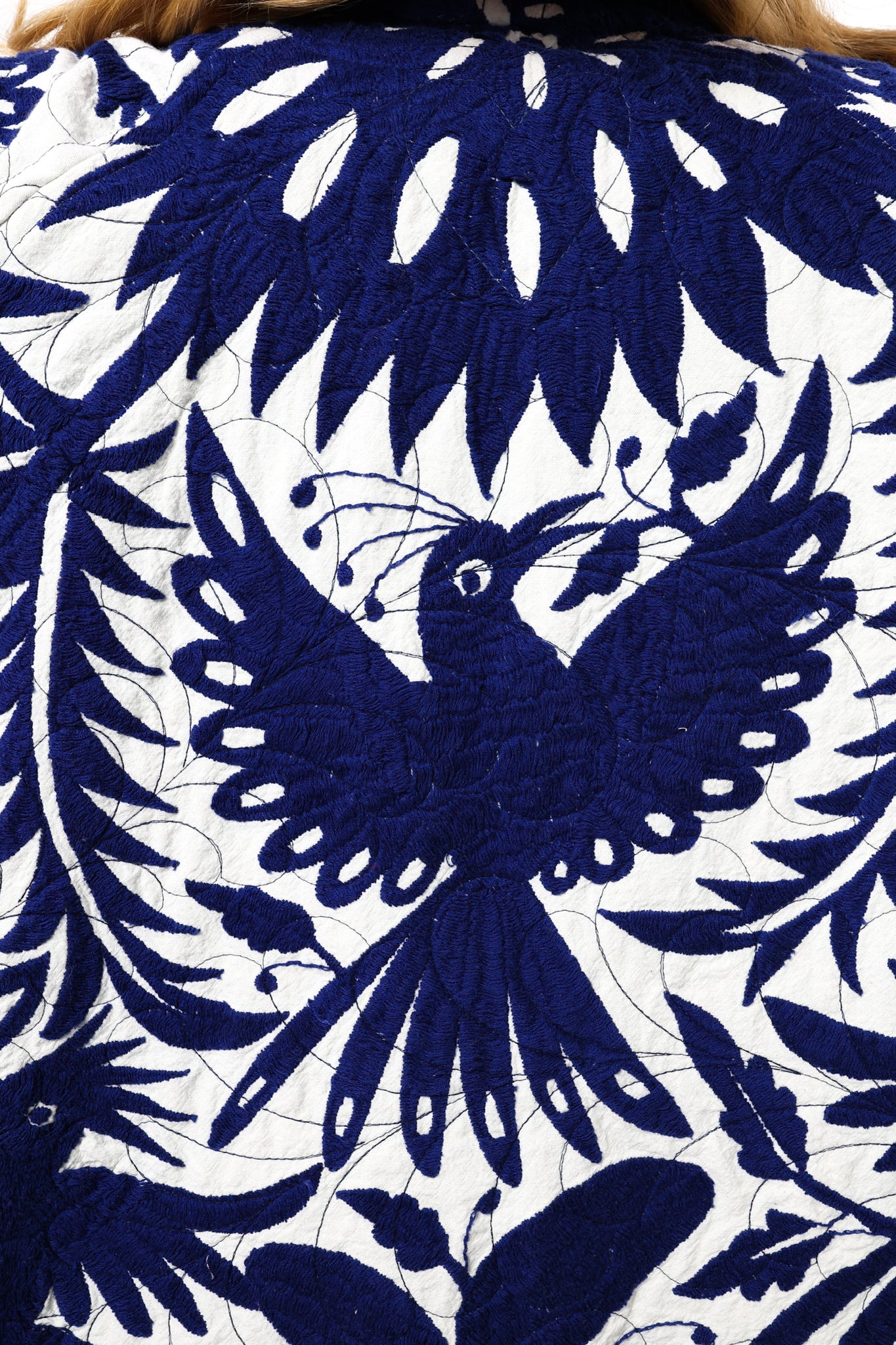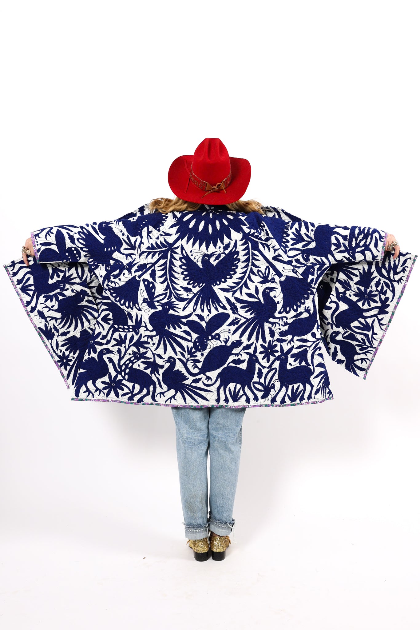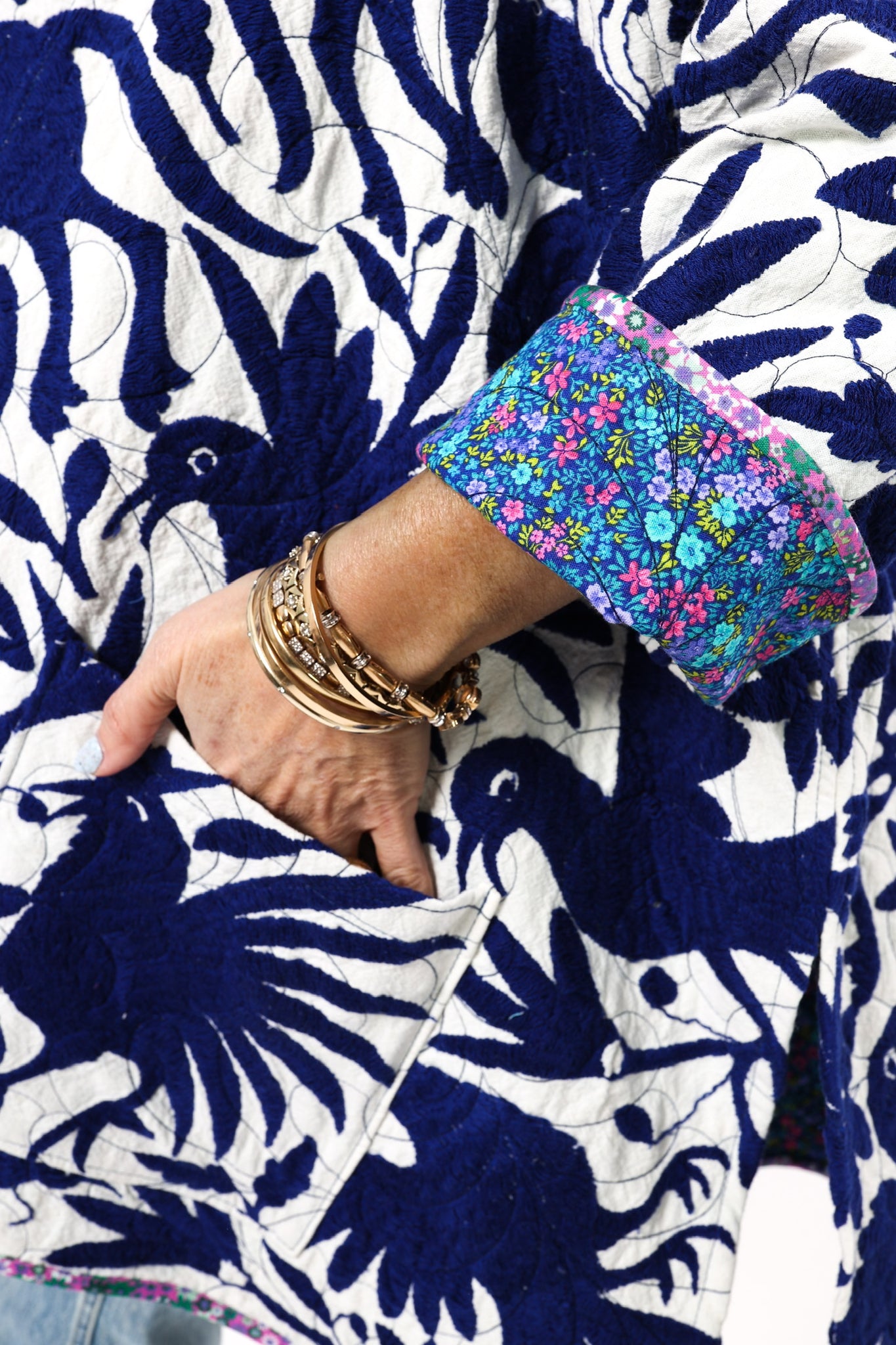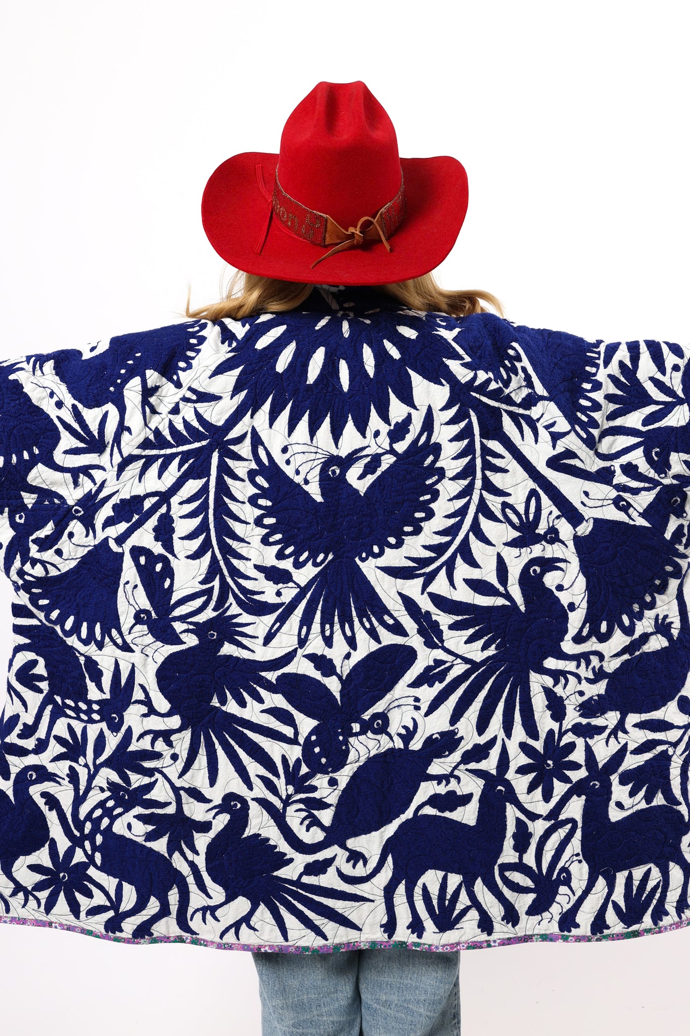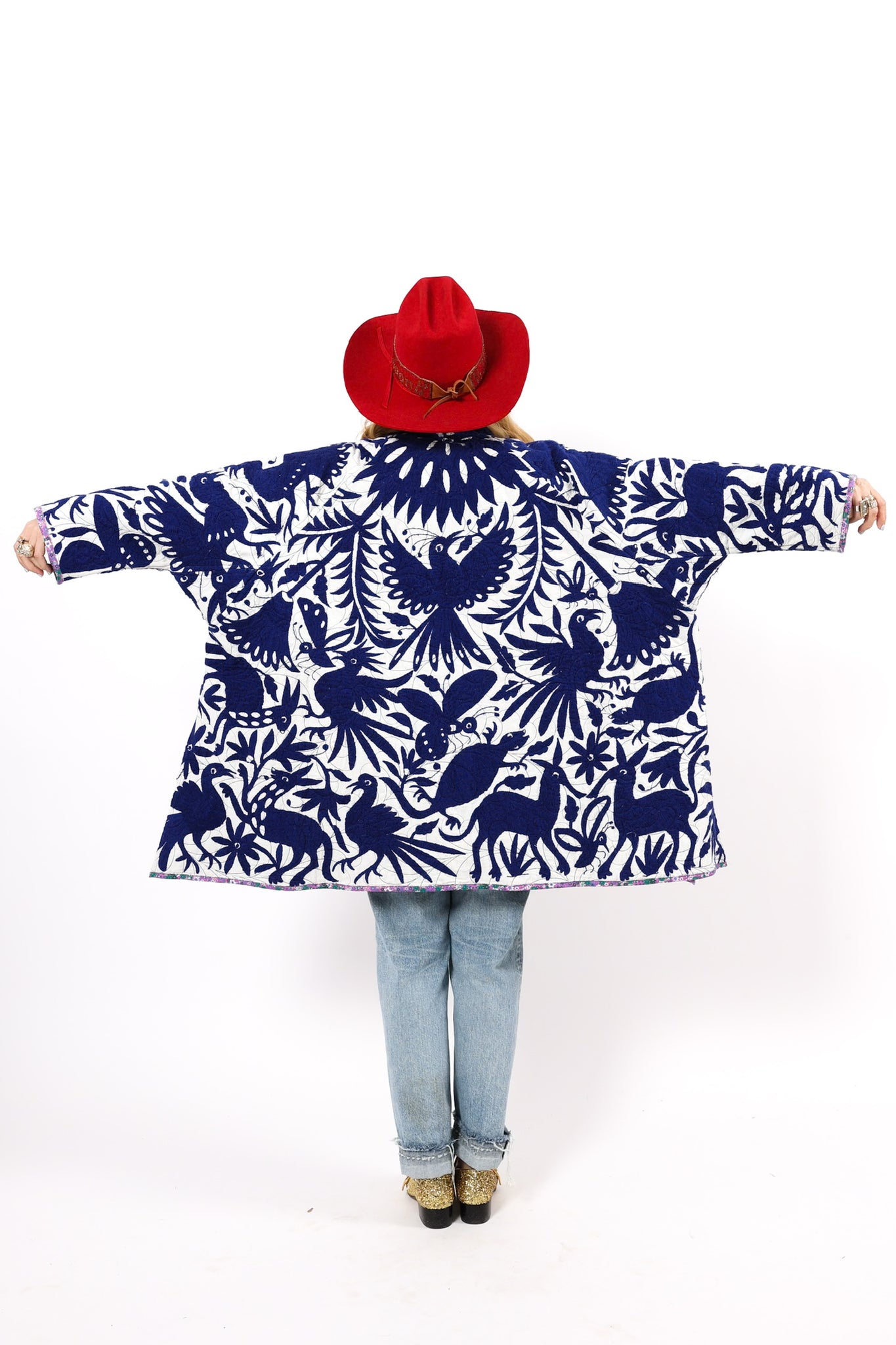 This is a hand embroidered Otomi from San Miguel, Mexico. These handmade Otomis are becoming harder and harder to find because younger generations are not continuing the traditions of their ancestors. Otomi embroidery is a Mexican style of hand embroidery. The Otomi textiles, also known as tenangos, take weeks or even years for the women to embroider. They are said to be based off of cliff paintings in the Tepehua-Otomi mountains in the area. Some say that they may be also inspired by cave paintings in the Mexican Plateau area. The embroidery is done on ivory cotton. To make this Otomi into a quilt we added floral fabric for the backing(inside of jacket). We recommend cuffing the sleeves to show off this fun fabric. In our opinion, the jacket is very very thin and lightweight with no loft or batting. This is absolutely a Lady Lancaster 10/10. It is very flattering and comfortable to wear, and has a great drape. Please Note: due to the hand embroidered art these textiles can snag more easily than quilts and should be worn more carefully. We consider this a show horse and not a work horse so we highly recommend the new owner of this piece handle with care. If you have further questions, please direct message us and we are happy to send you a video.