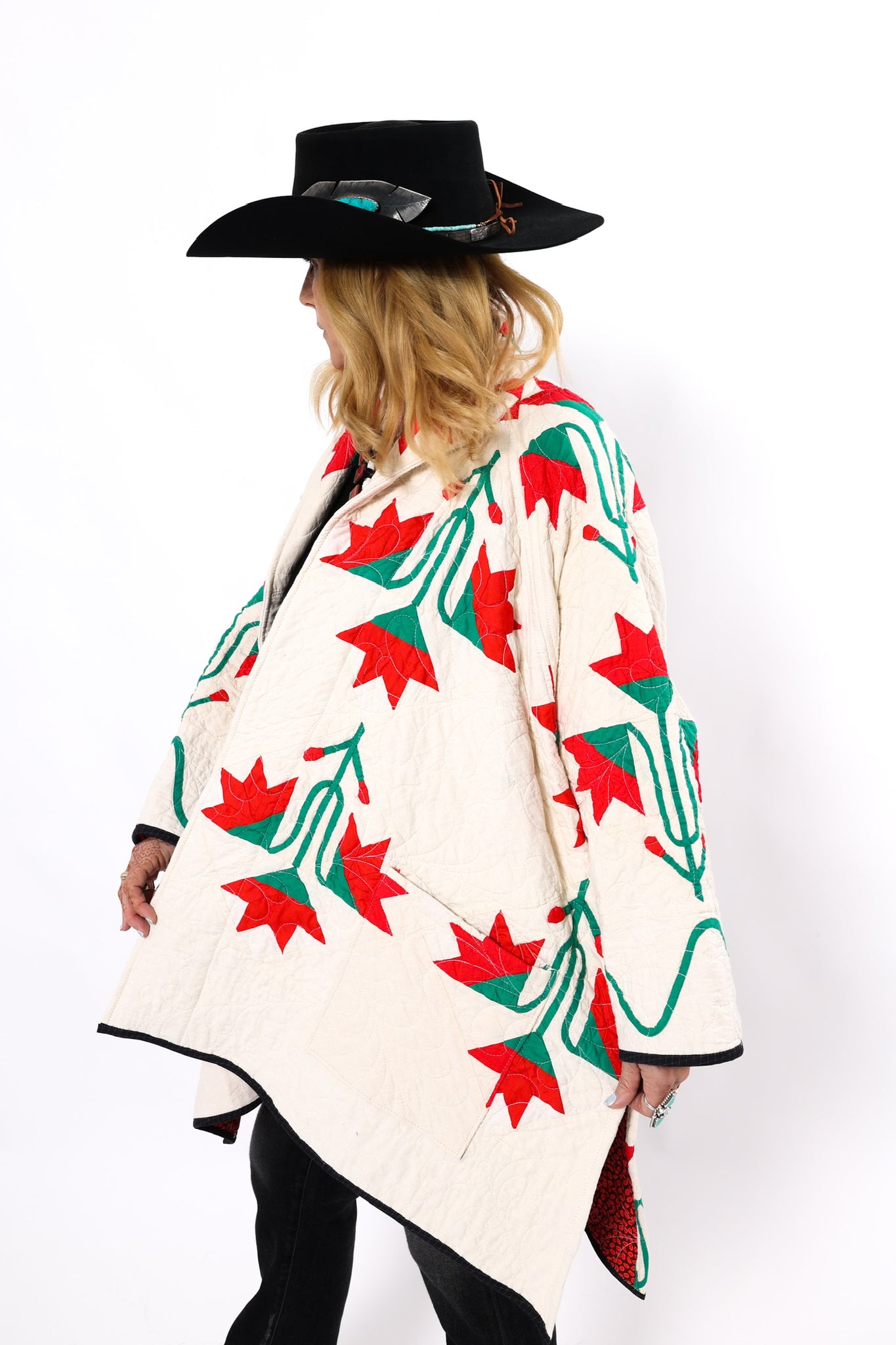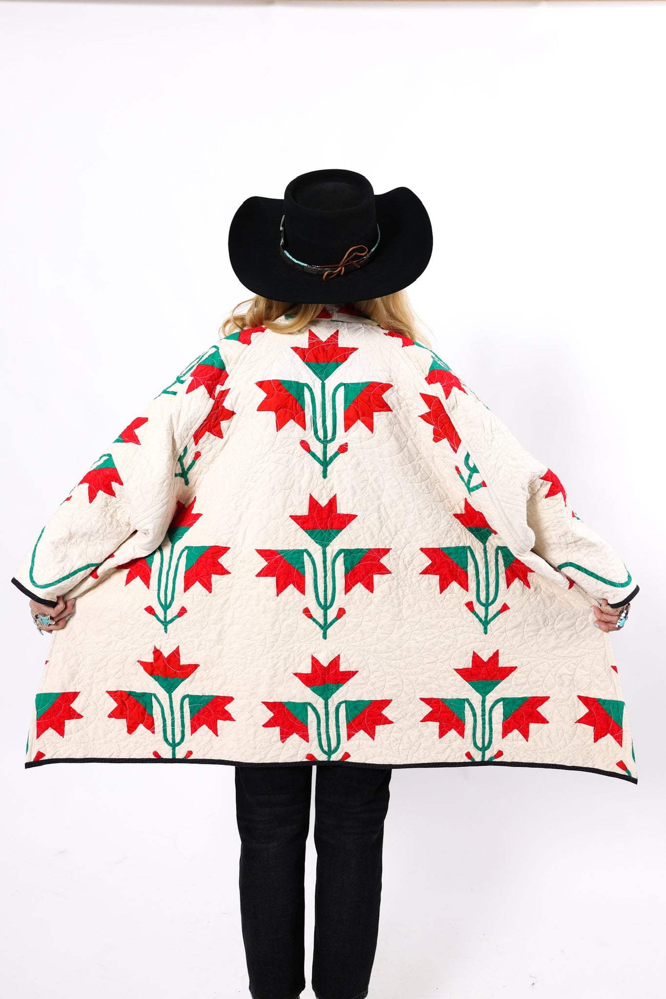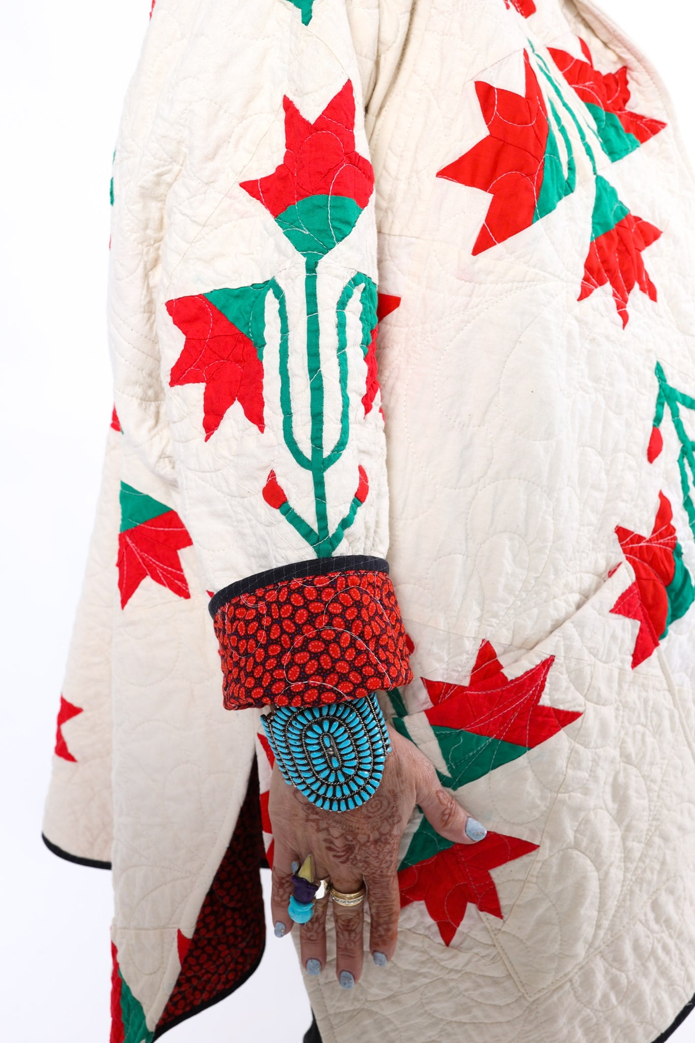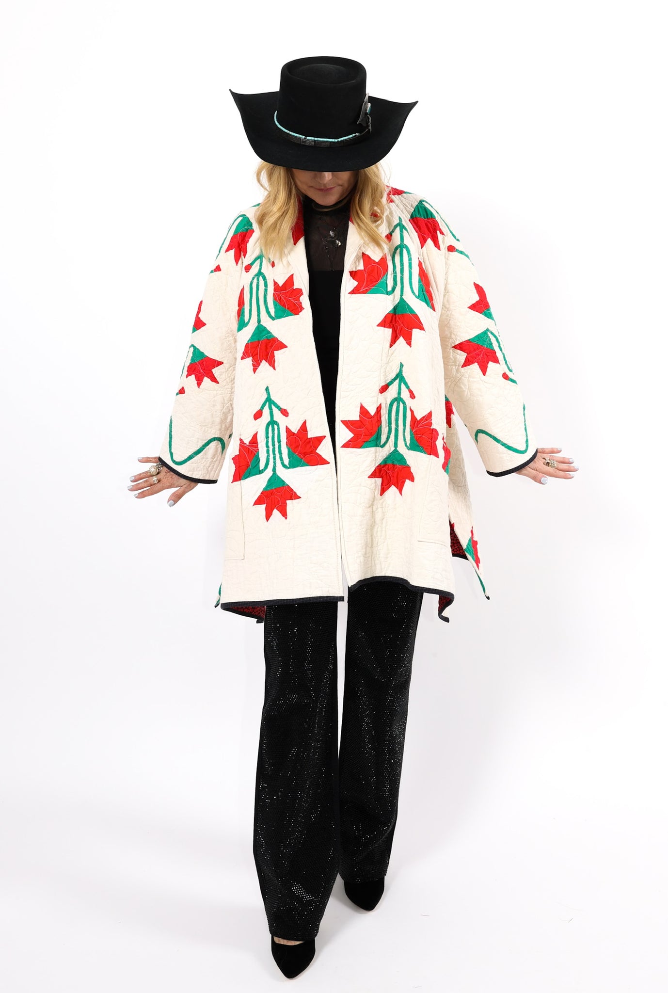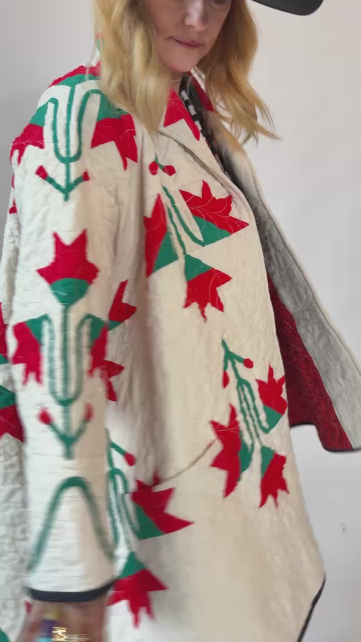 Do you like to dress on theme? If so, this is perfect for your next Christmas party! This is an antique American quilt top made circa 1950s-1970s.. It is a traditional Tulip applique quilt pattern. The top has been beautifully hand sewn and hand appliqued. To complete the quilt, we backed the top with a corresponding red novelty fabric which can best be appreciated when the jacket is worn inside out or the sleeves are cuffed. In our opinion, the jacket is soft, lightweight, and has an excellent drape. The ground fabric is not a stark white nor was it meant to be, it is more of an almond. This is a beauty and a stunner and is in excellent condition. This is a Lady Lancaster 10/10. It is wearable American Folk Art. If you have further questions, please direct message us and we are happy to send you a video.