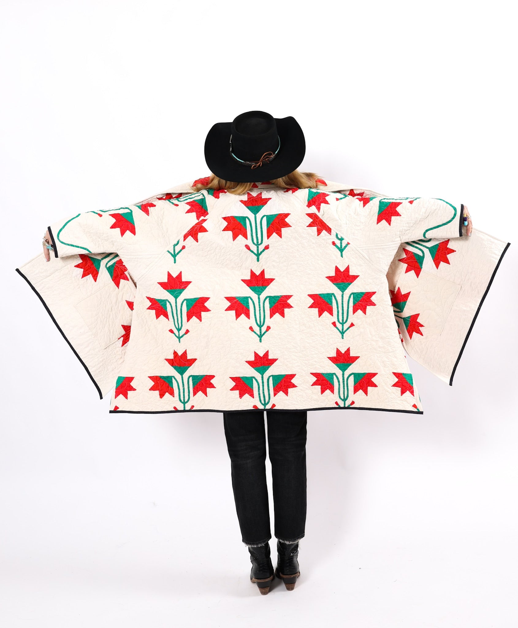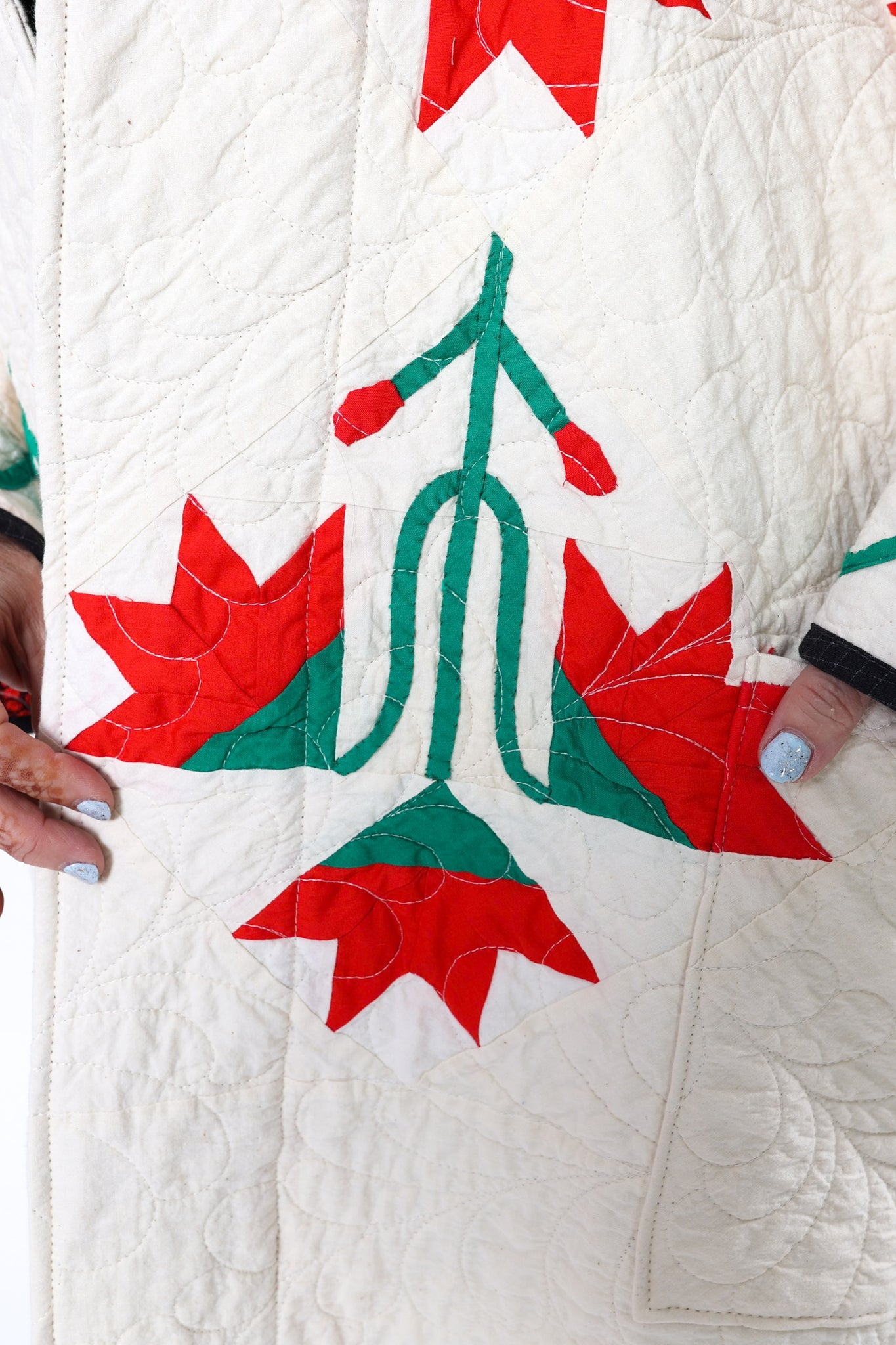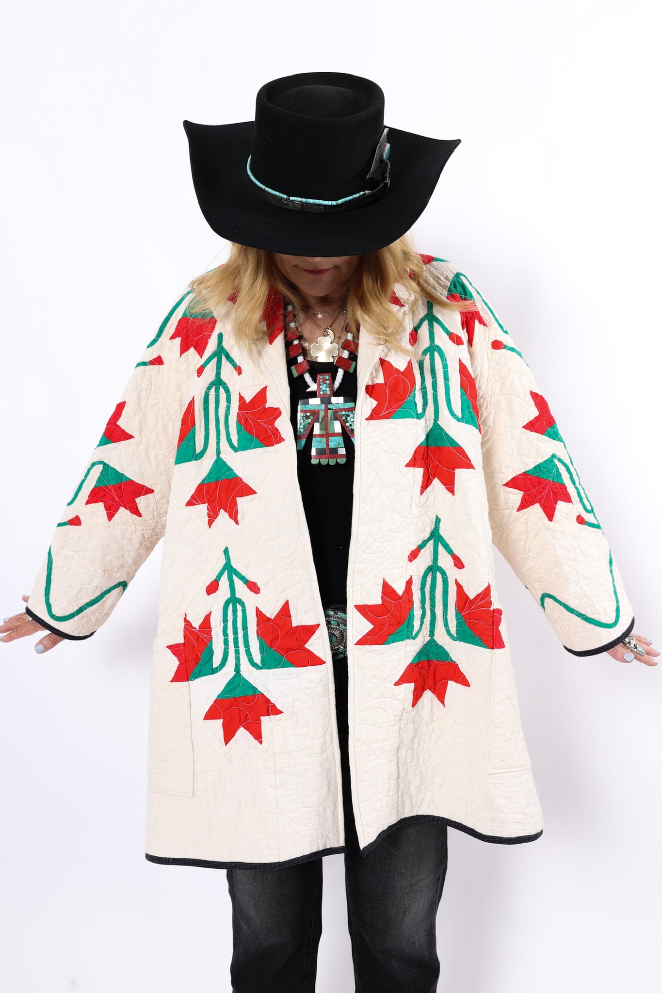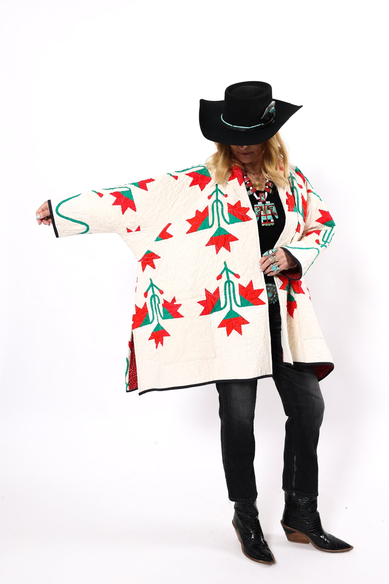 Do you like to dress on theme? If so, this is perfect for your next Christmas party! This is an antique American quilt top made circa 1950s-1970s.. It is a traditional Tulip applique quilt pattern. The top has been beautifully hand sewn and hand appliqued. To complete the quilt, we backed the top with a corresponding red novelty fabric which can best be appreciated when the jacket is worn inside out or the sleeves are cuffed. In our opinion, the jacket is soft, lightweight, and has an excellent drape. The ground fabric is not a stark white nor was it meant to be, it is more of an almond. This is a beauty and a stunner and is in excellent condition. This is a Lady Lancaster 10/10. It is wearable American Folk Art. If you have further questions, please direct message us and we are happy to send you a video.