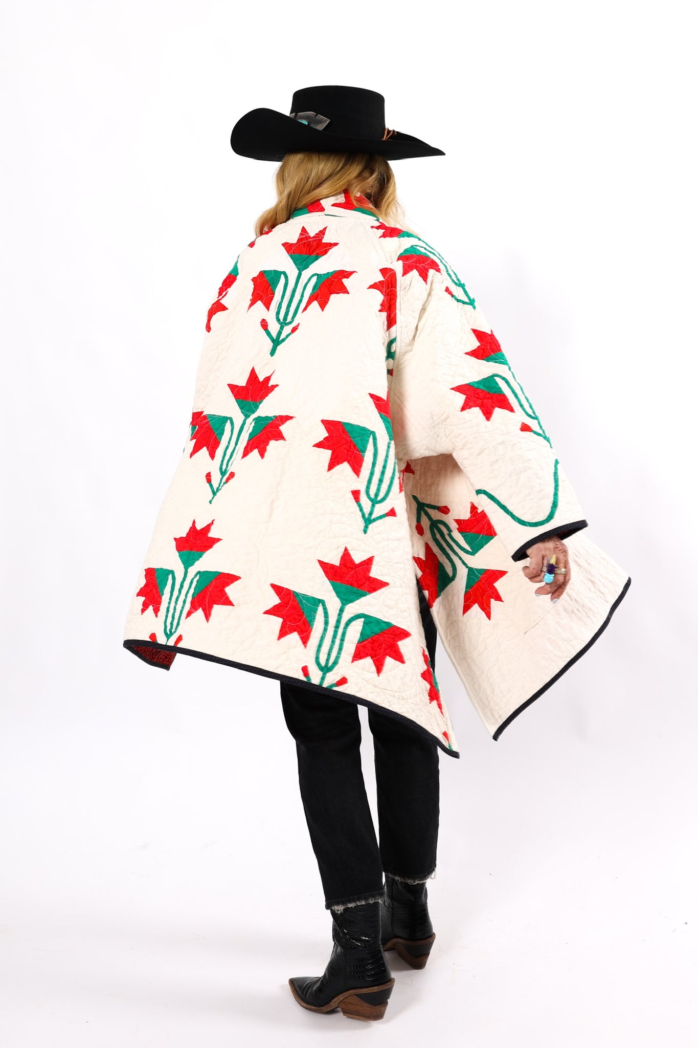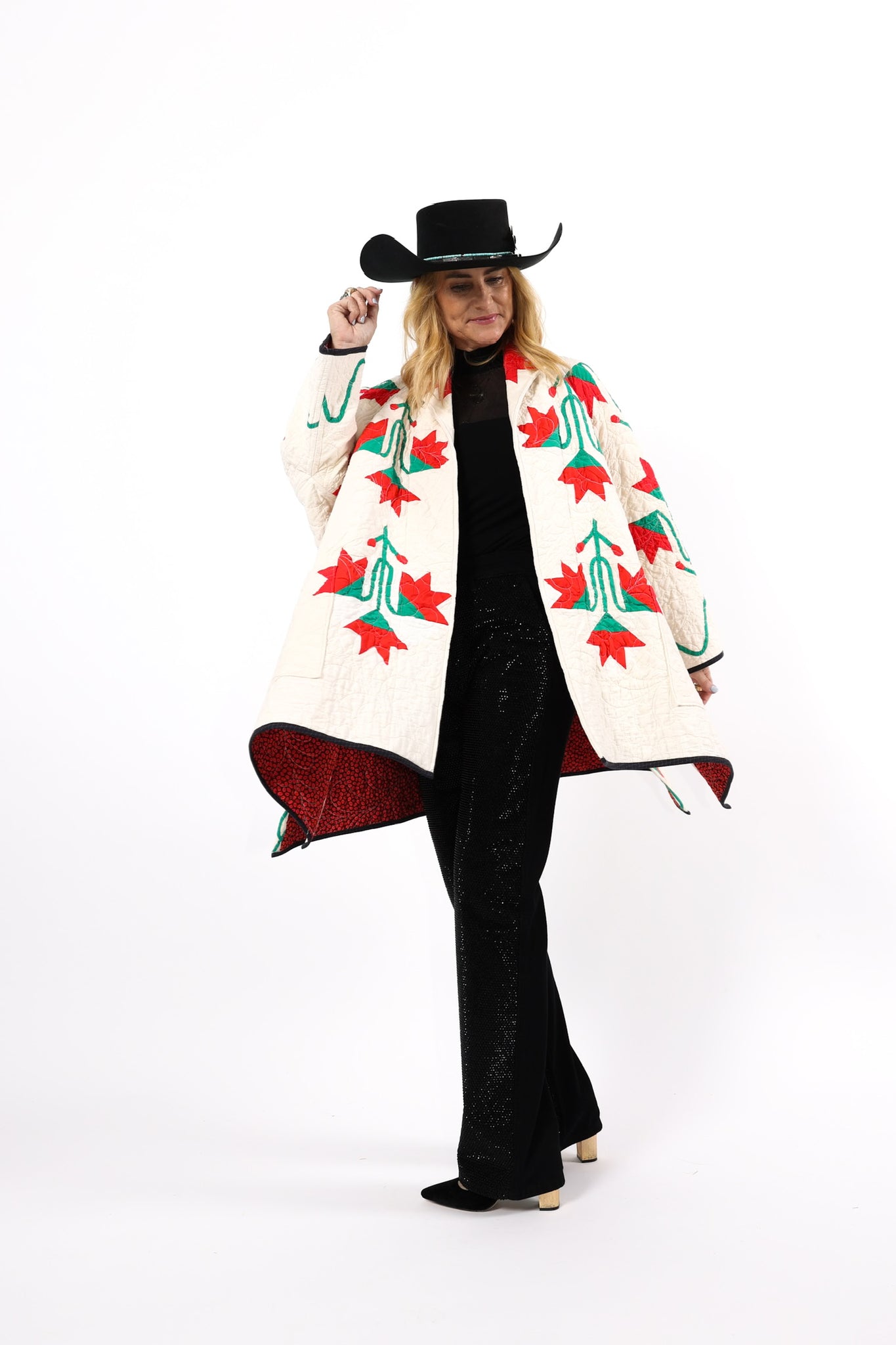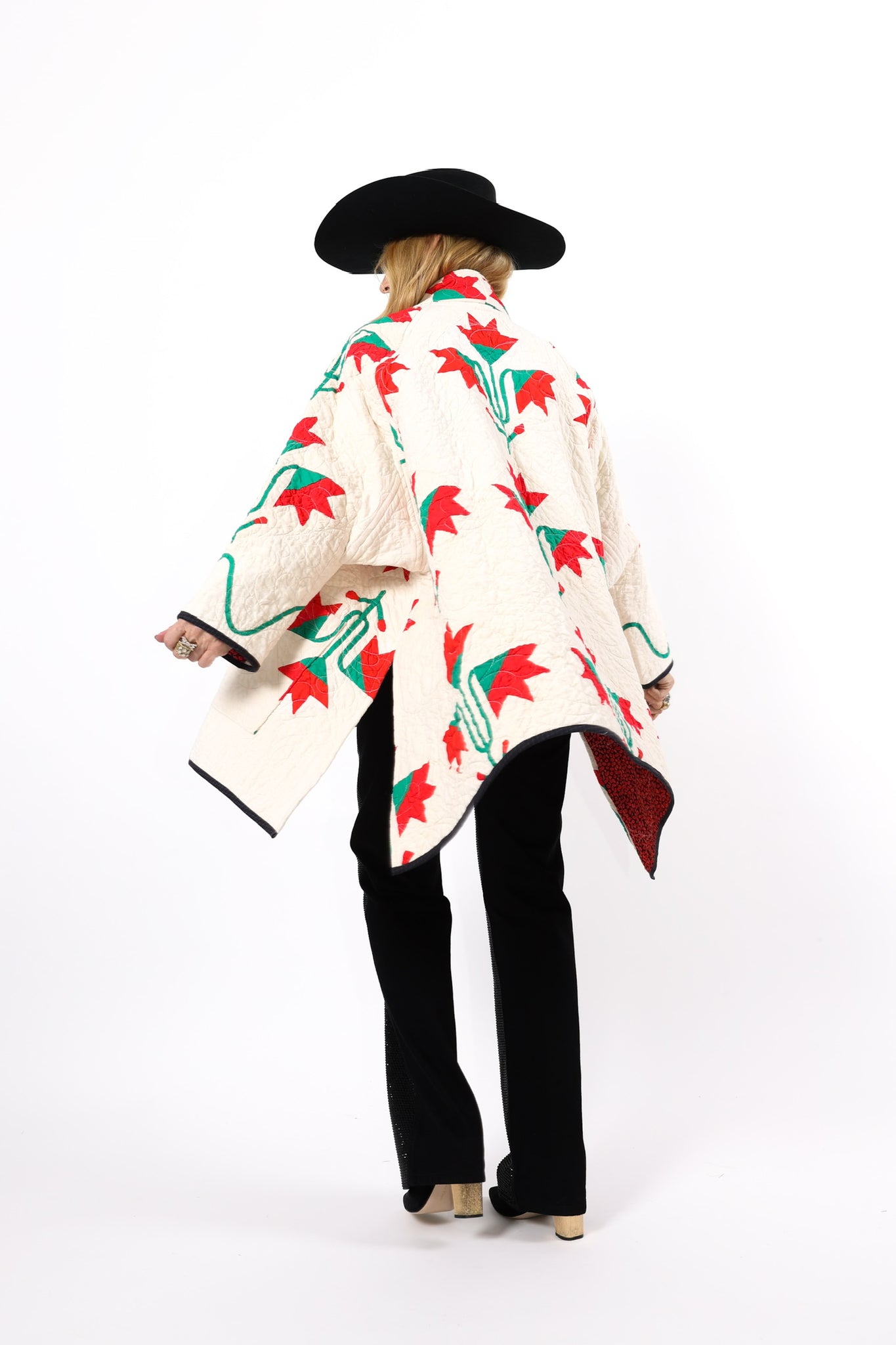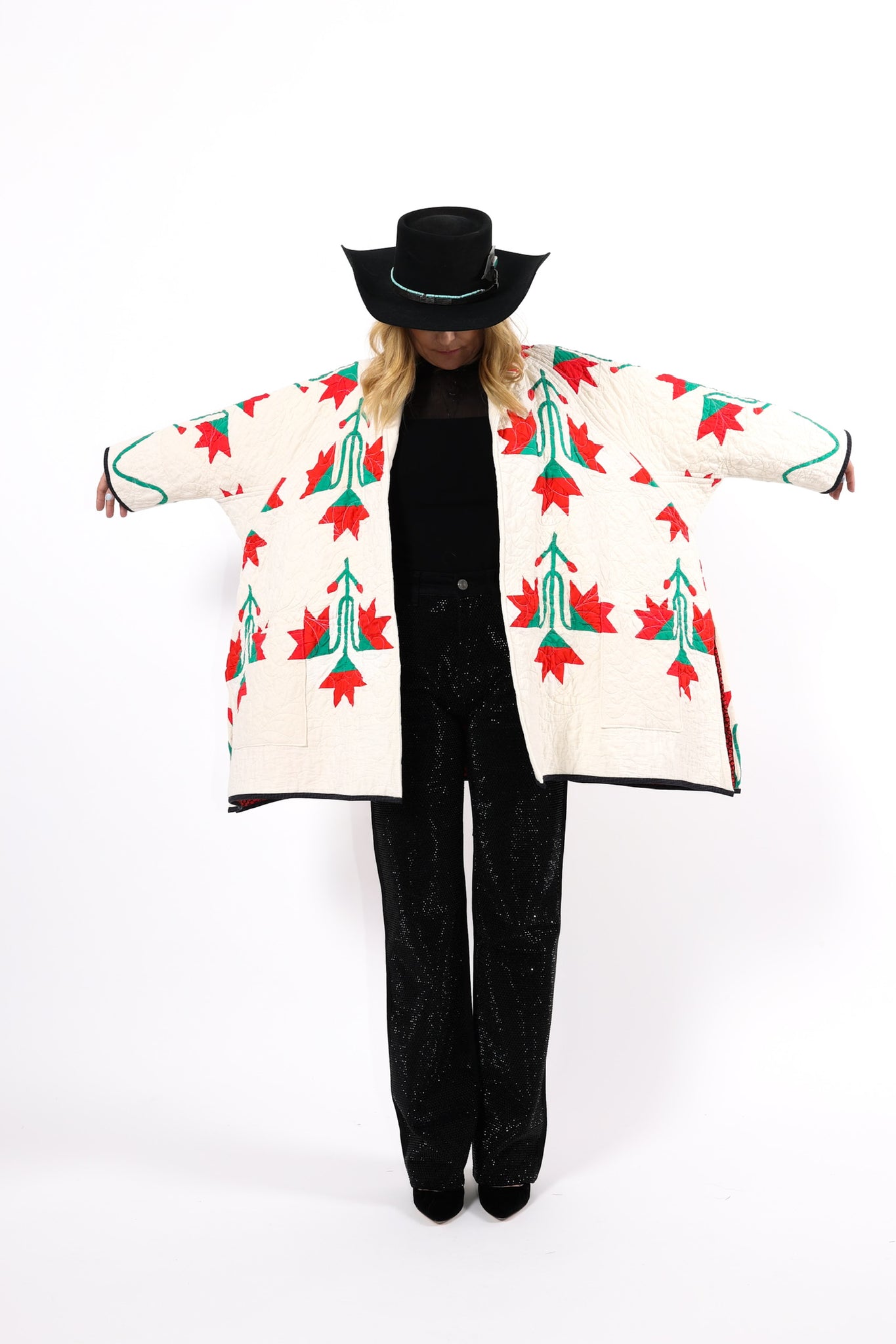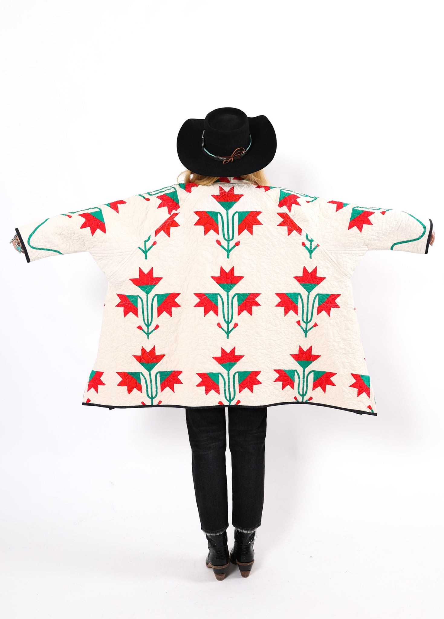 Do you like to dress on theme? If so, this is perfect for your next Christmas party! This is an antique American quilt top made circa 1950s-1970s.. It is a traditional Tulip applique quilt pattern. The top has been beautifully hand sewn and hand appliqued. To complete the quilt, we backed the top with a corresponding red novelty fabric which can best be appreciated when the jacket is worn inside out or the sleeves are cuffed. In our opinion, the jacket is soft, lightweight, and has an excellent drape. The ground fabric is not a stark white nor was it meant to be, it is more of an almond. This is a beauty and a stunner and is in excellent condition. This is a Lady Lancaster 10/10. It is wearable American Folk Art. If you have further questions, please direct message us and we are happy to send you a video.