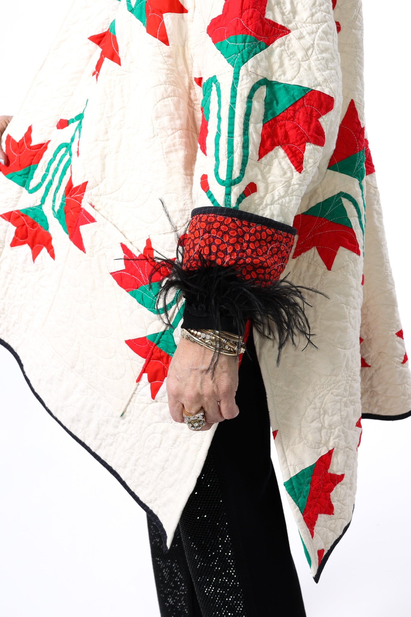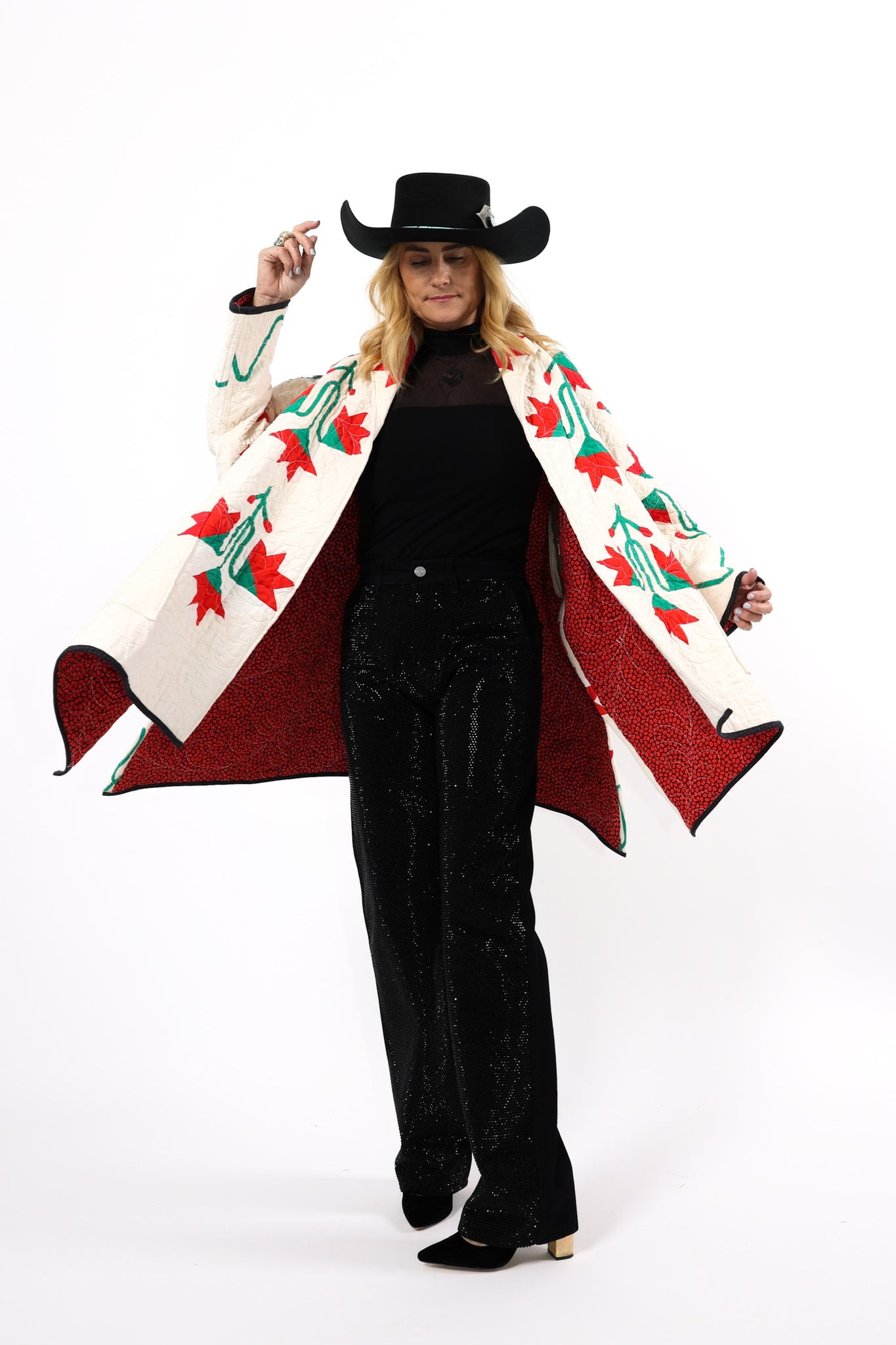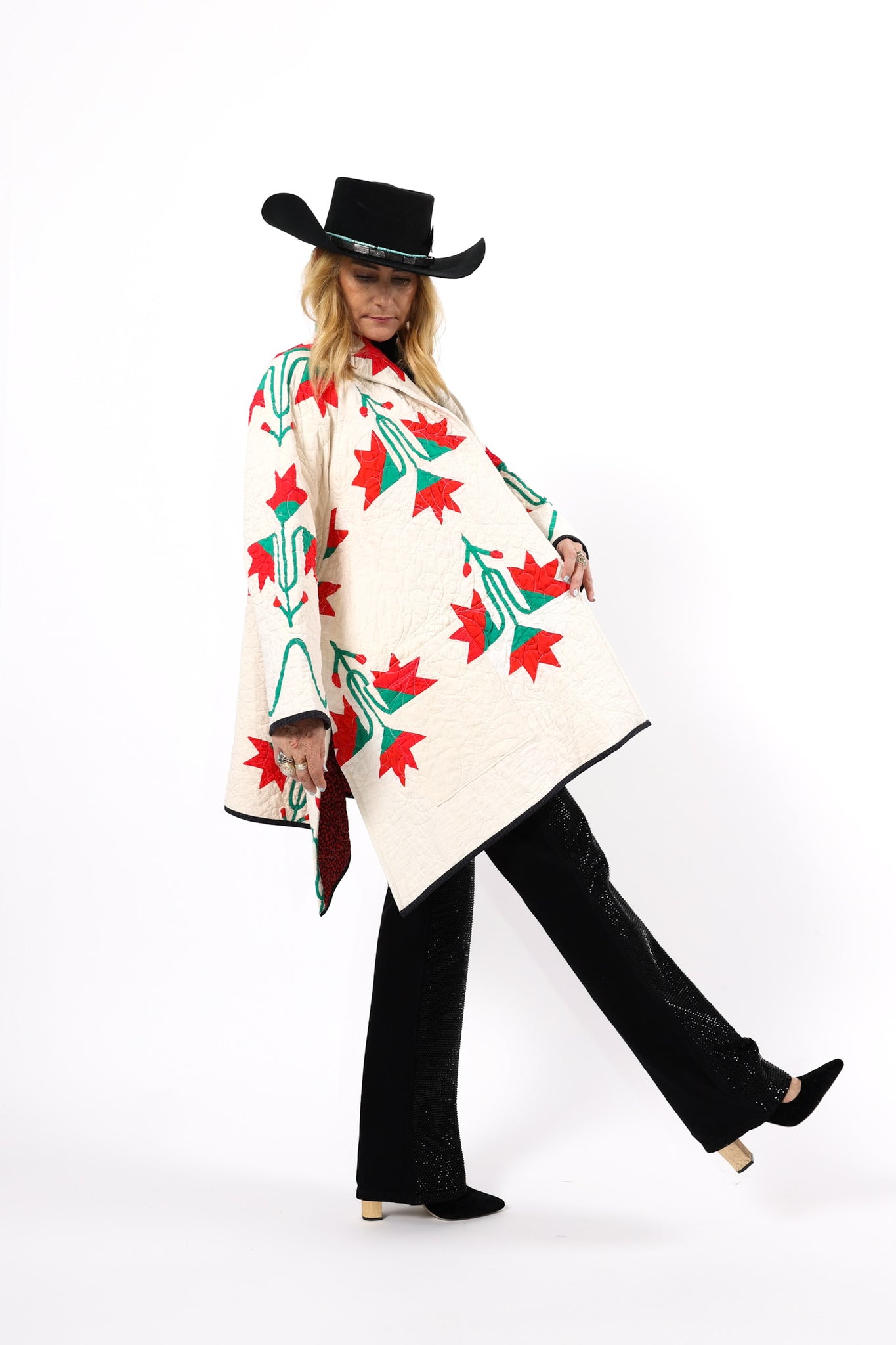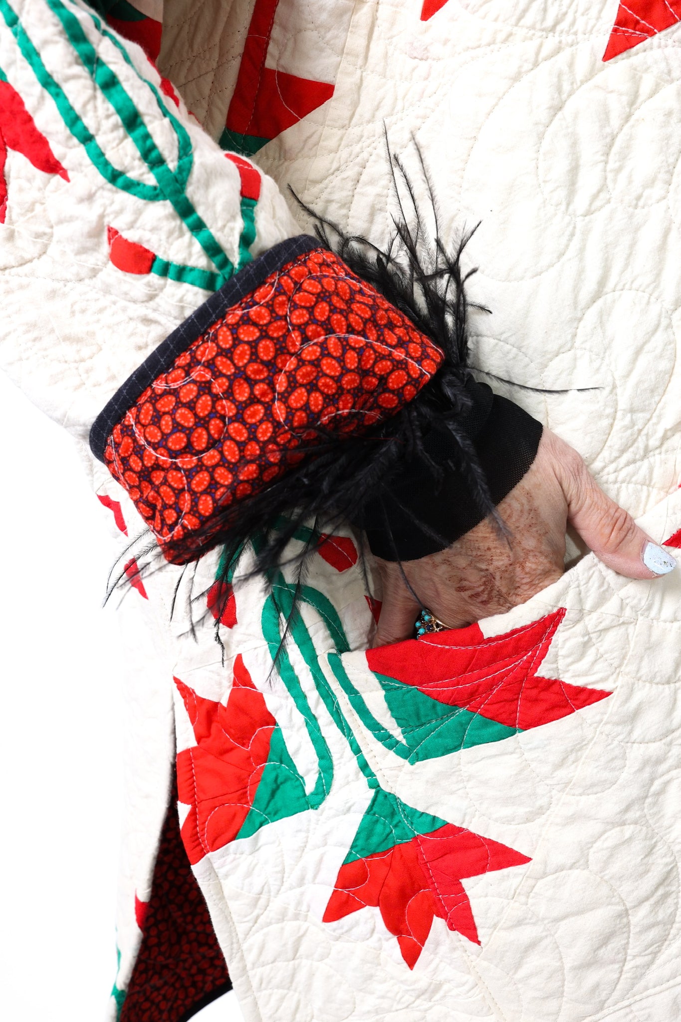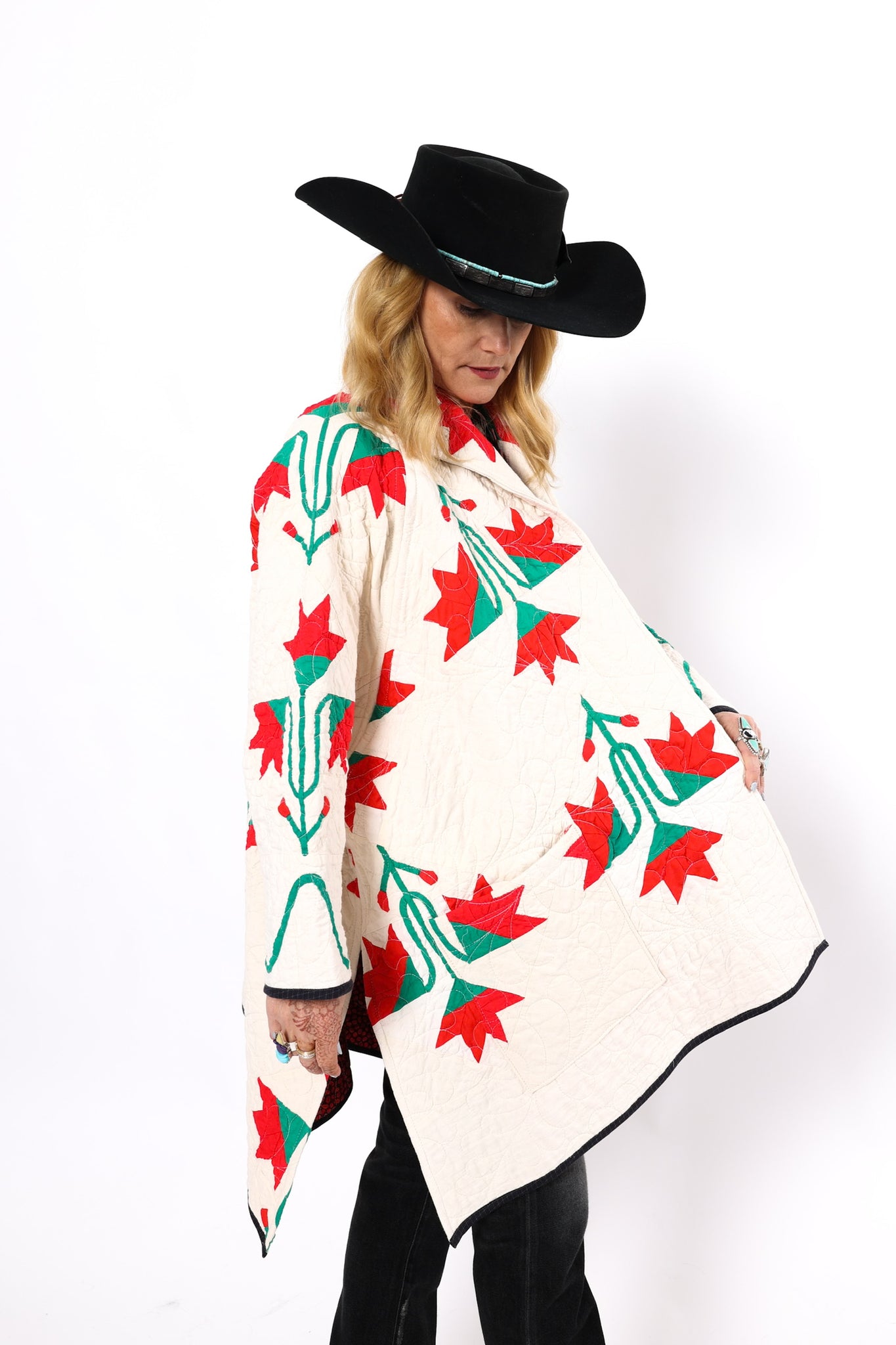 Do you like to dress on theme? If so, this is perfect for your next Christmas party! This is an antique American quilt top made circa 1950s-1970s.. It is a traditional Tulip applique quilt pattern. The top has been beautifully hand sewn and hand appliqued. To complete the quilt, we backed the top with a corresponding red novelty fabric which can best be appreciated when the jacket is worn inside out or the sleeves are cuffed. In our opinion, the jacket is soft, lightweight, and has an excellent drape. The ground fabric is not a stark white nor was it meant to be, it is more of an almond. This is a beauty and a stunner and is in excellent condition. This is a Lady Lancaster 10/10. It is wearable American Folk Art. If you have further questions, please direct message us and we are happy to send you a video.