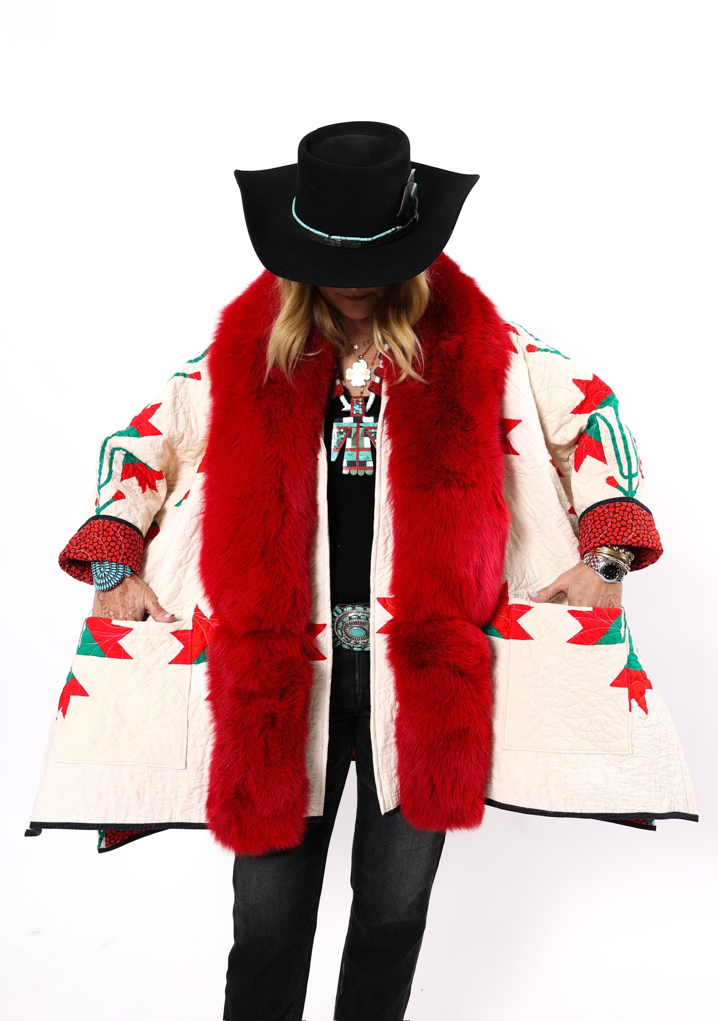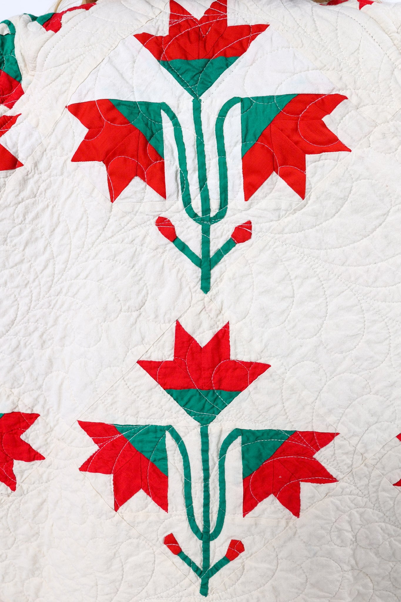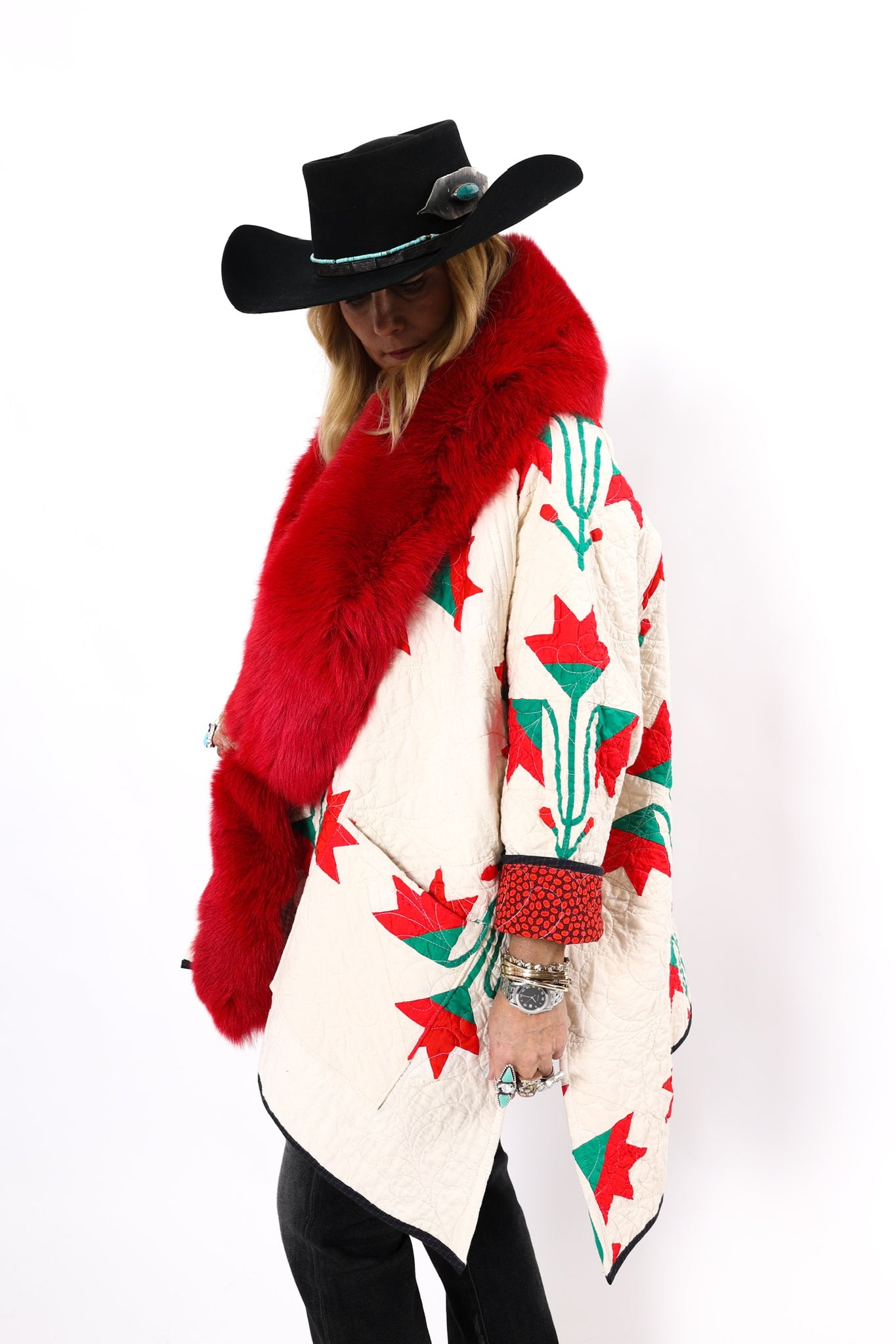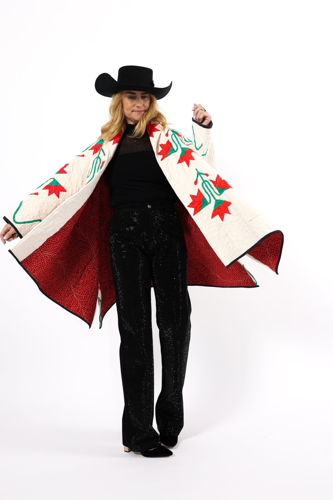 Do you like to dress on theme? If so, this is perfect for your next Christmas party! This is an antique American quilt top made circa 1950s-1970s.. It is a traditional Tulip applique quilt pattern. The top has been beautifully hand sewn and hand appliqued. To complete the quilt, we backed the top with a corresponding red novelty fabric which can best be appreciated when the jacket is worn inside out or the sleeves are cuffed. In our opinion, the jacket is soft, lightweight, and has an excellent drape. The ground fabric is not a stark white nor was it meant to be, it is more of an almond. This is a beauty and a stunner and is in excellent condition. This is a Lady Lancaster 10/10. It is wearable American Folk Art. If you have further questions, please direct message us and we are happy to send you a video.