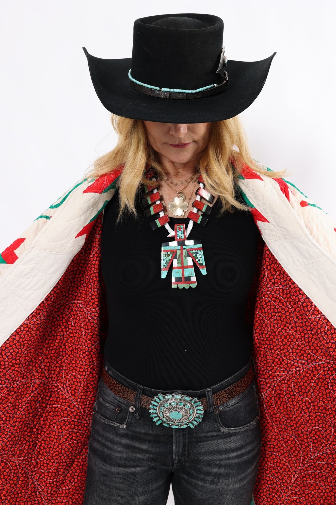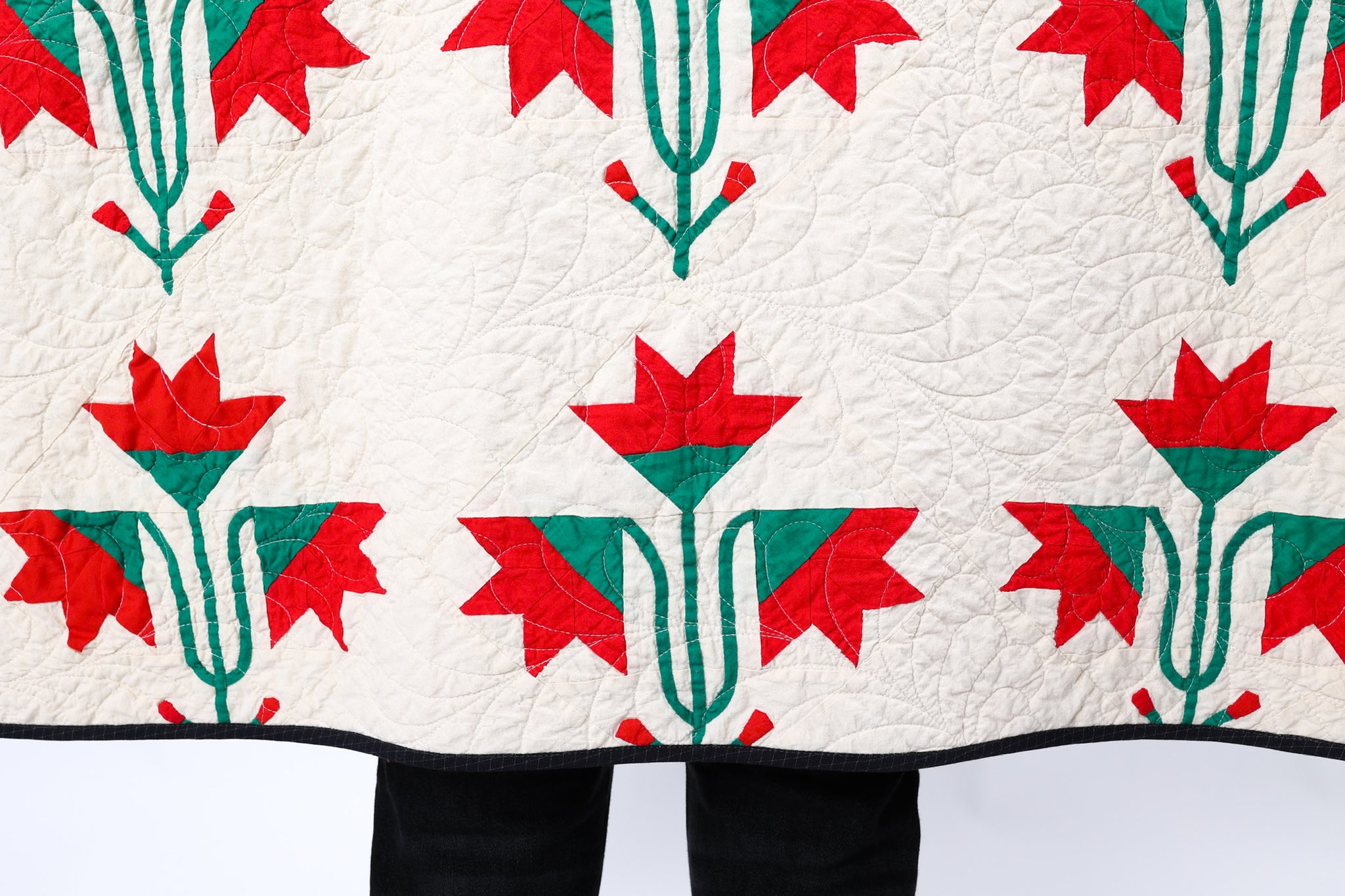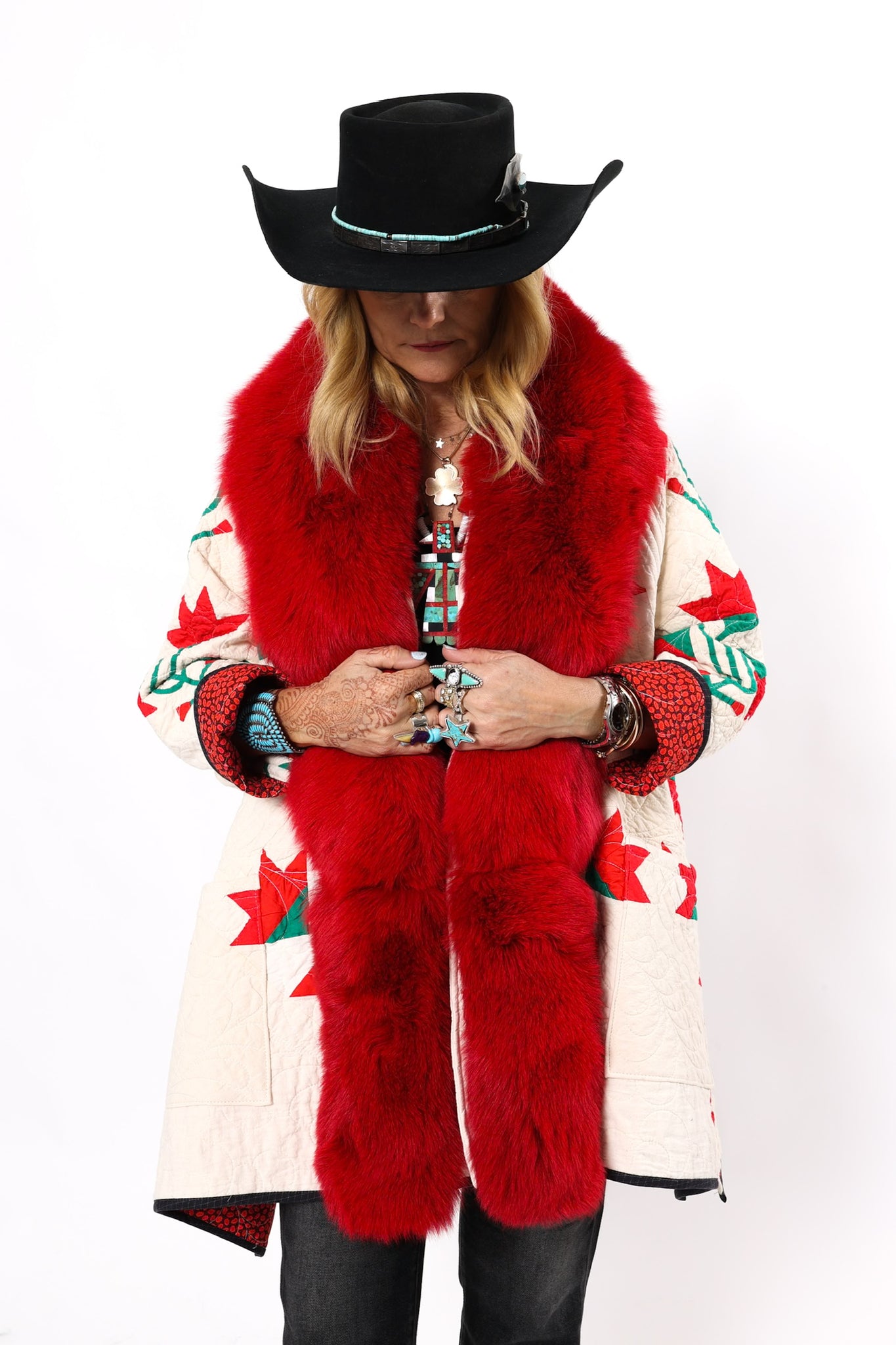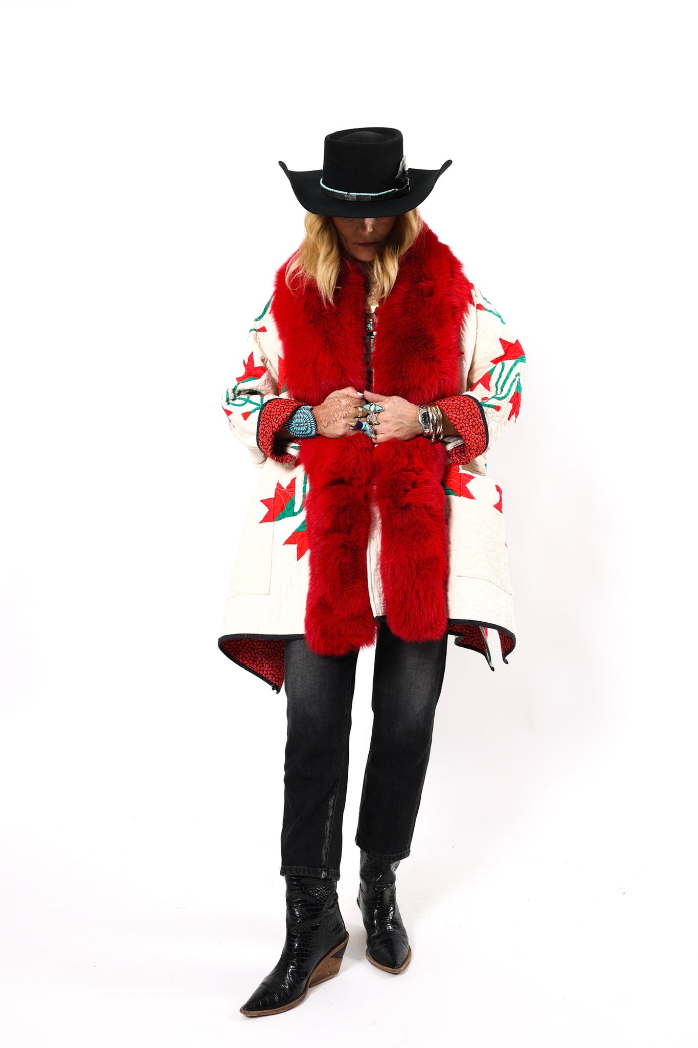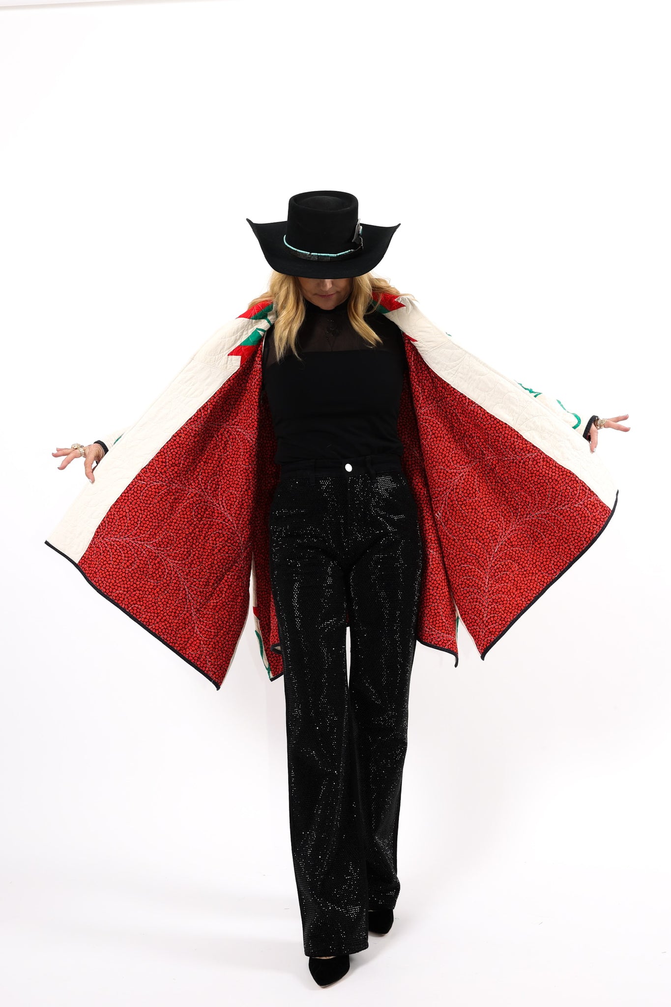Do you like to dress on theme? If so, this is perfect for your next Christmas party! This is an antique American quilt top made circa 1950s-1970s.. It is a traditional Tulip applique quilt pattern. The top has been beautifully hand sewn and hand appliqued. To complete the quilt, we backed the top with a corresponding red novelty fabric which can best be appreciated when the jacket is worn inside out or the sleeves are cuffed. In our opinion, the jacket is soft, lightweight, and has an excellent drape. The ground fabric is not a stark white nor was it meant to be, it is more of an almond. This is a beauty and a stunner and is in excellent condition. This is a Lady Lancaster 10/10. It is wearable American Folk Art. If you have further questions, please direct message us and we are happy to send you a video.
