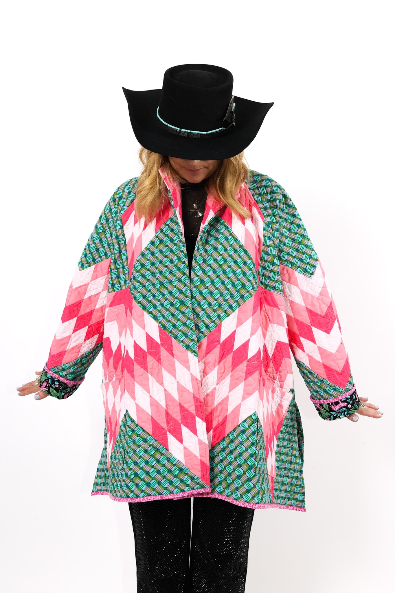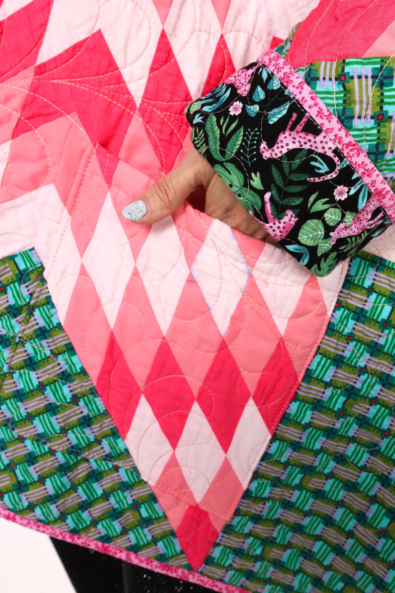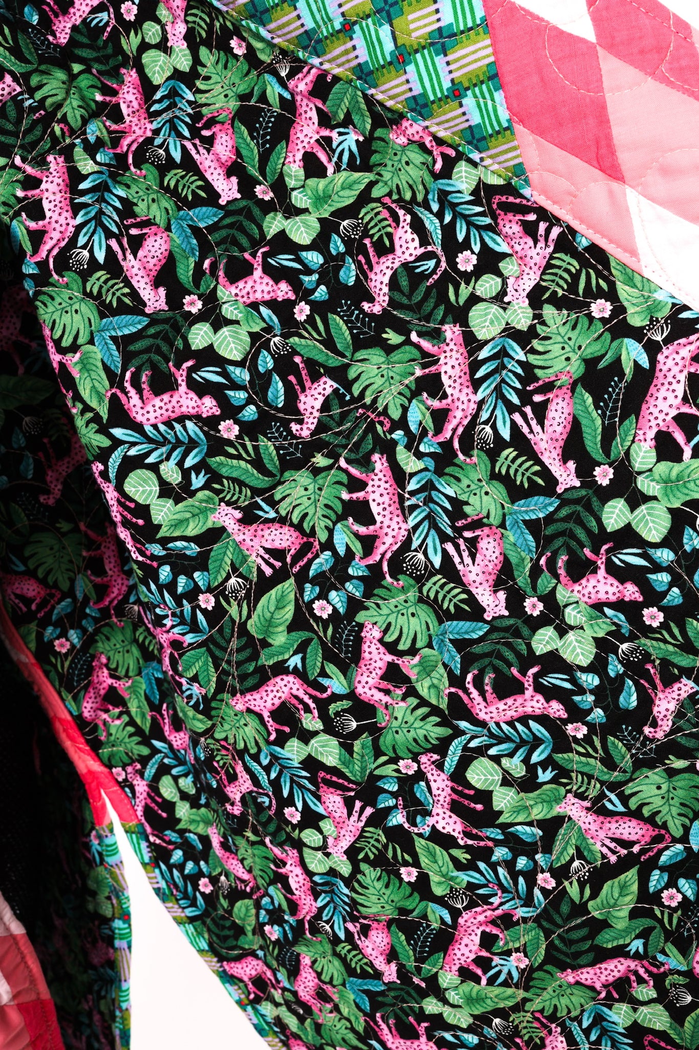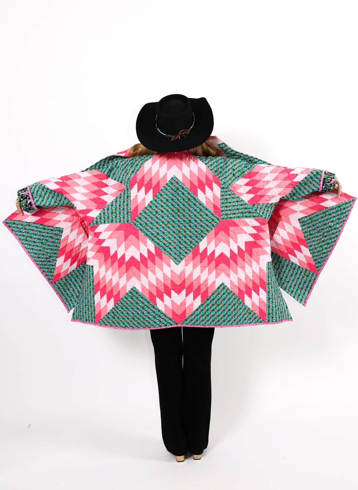 This is a Future Heirloom and an original design by Lady Lancaster. It is a Broken Star quilt pattern. The quilt was made using a combination of a midcentury quilt kit and contrasting leopard fabric. This is a work horse and a show horse! You don’t need to be super careful with as it can withstand heavy wear. It is completely reversible and we love the wild jungle backing fabric on the inside of the jacket This can best be appreciated when the cuffs are rolled or the jacket is worn inside out. In our opinion, the jacket is thin, lightweight, soft, and has a little loft (puffiness). The quilt was brought to life and quilted by our friend Zoe Dawn on her long arm. This is a Lady Lancaster 10/10. Please note: the sleeves are 4” longer than our standard Helen pattern. If you have further questions, please direct message us and we are happy to send you a video.