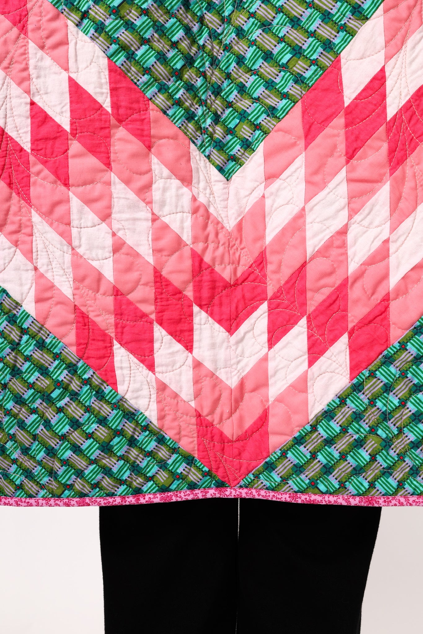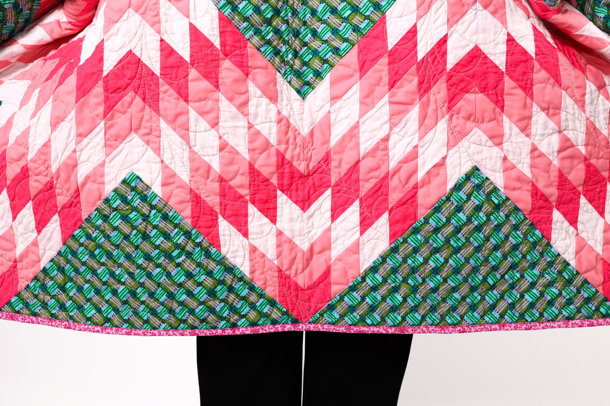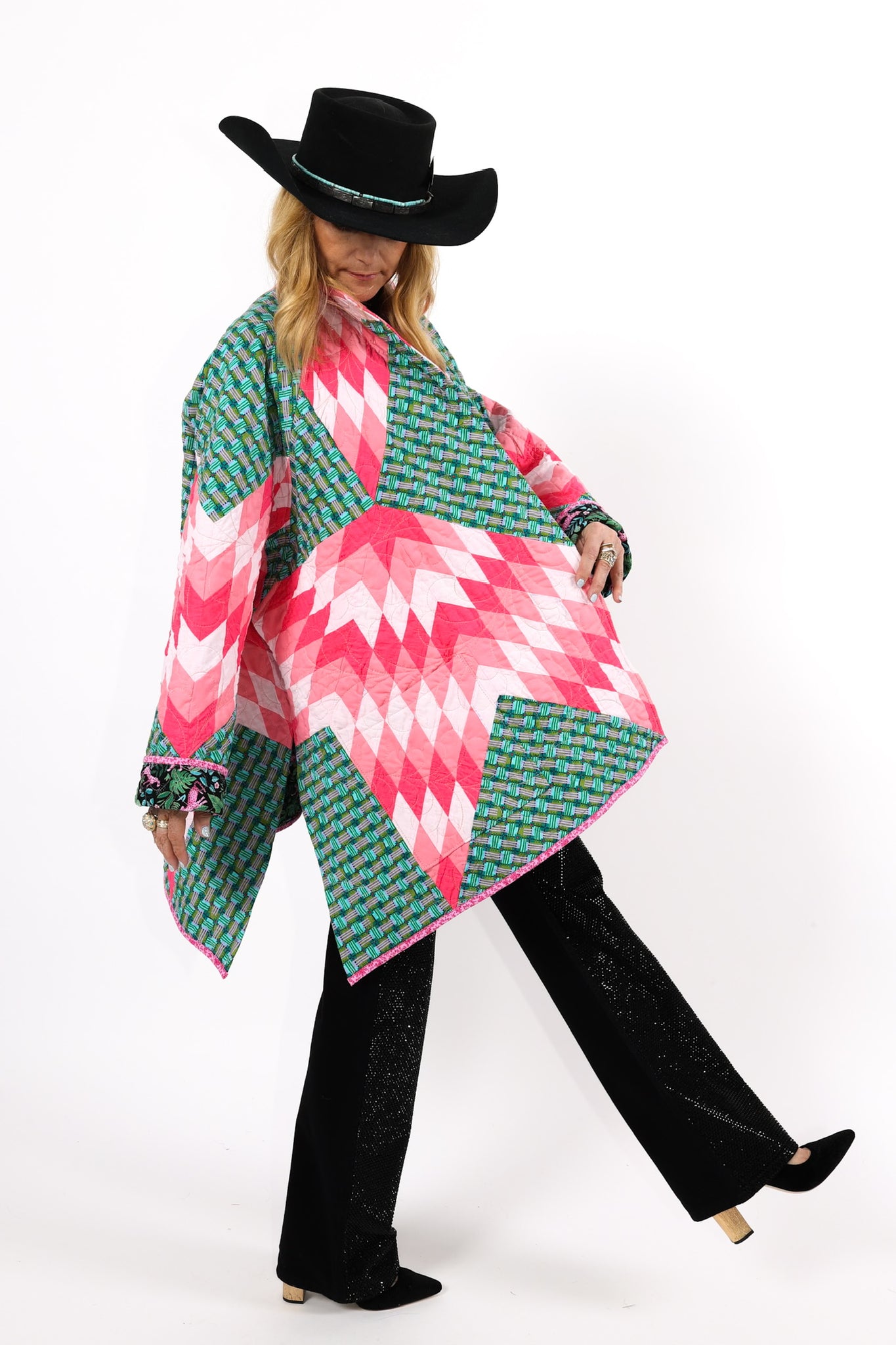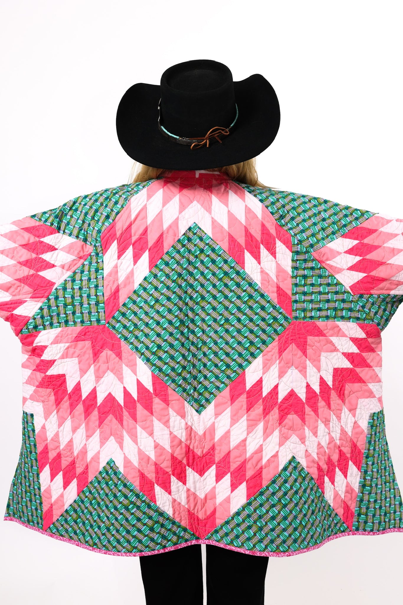 This is a Future Heirloom and an original design by Lady Lancaster. It is a Broken Star quilt pattern. The quilt was made using a combination of a midcentury quilt kit and contrasting leopard fabric. This is a work horse and a show horse! You don’t need to be super careful with as it can withstand heavy wear. It is completely reversible and we love the wild jungle backing fabric on the inside of the jacket This can best be appreciated when the cuffs are rolled or the jacket is worn inside out. In our opinion, the jacket is thin, lightweight, soft, and has a little loft (puffiness). The quilt was brought to life and quilted by our friend Zoe Dawn on her long arm. This is a Lady Lancaster 10/10. Please note: the sleeves are 4” longer than our standard Helen pattern. If you have further questions, please direct message us and we are happy to send you a video.