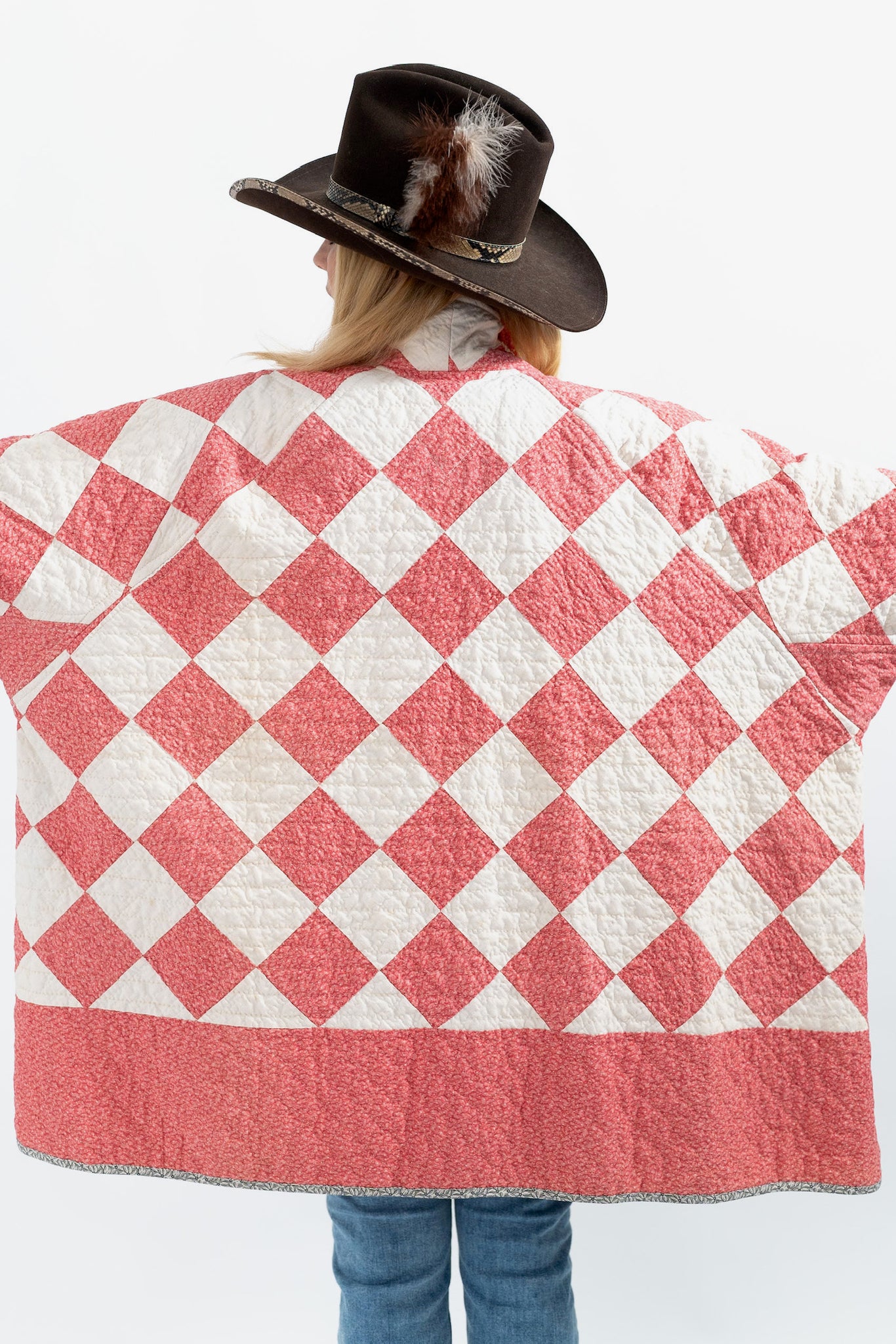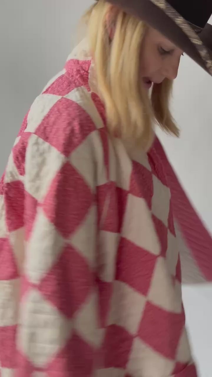This is an American Antique quilt made circa 1890s to 1920s. It is a beautiful Lancaster County Mennonite quilt. The photos don't do this piece justice. It is a traditional Postage Stamp Quilt Pattern. This piece has been beautifully hand quilted and hand sewn. The maker backed this quilt with a beautiful black and white calico fabric. You will want to cuff the sleeves to show this off! In our opinion, the jacket is very thin, very soft, very lightweight with no loft, and has a very good drape. The sleeves are 3” longer than our standard Helen pattern. Please note, there are some very small and faint age spots throughout many of the white squares. They are so faint and not eye catching, it is very hard to capture this. If you have further questions, please direct message us and we are happy to send you a video.