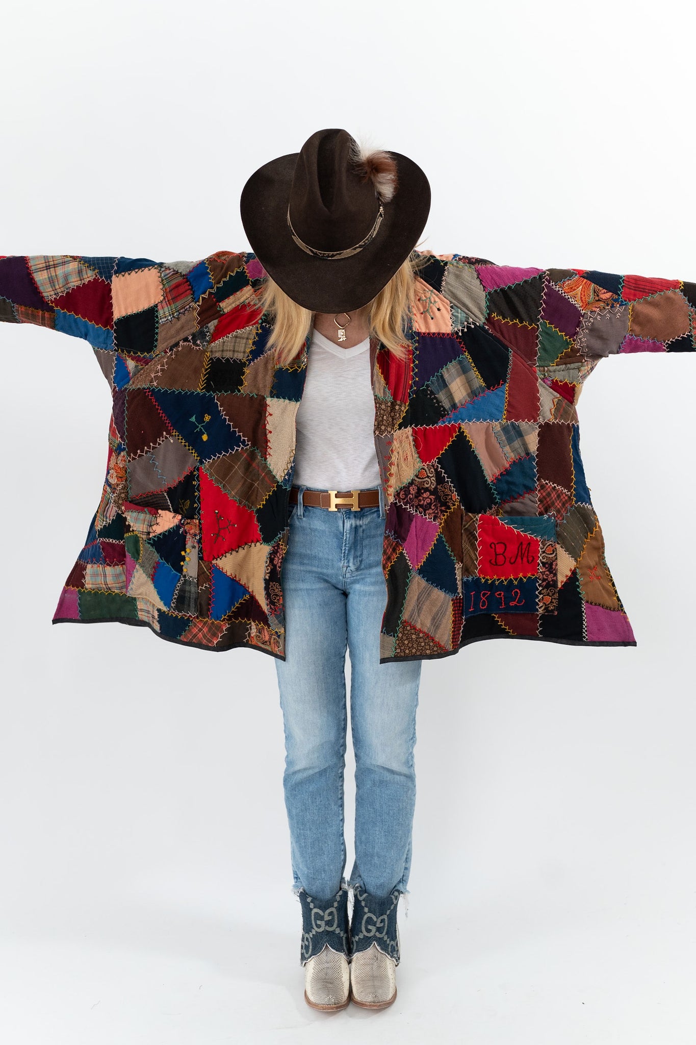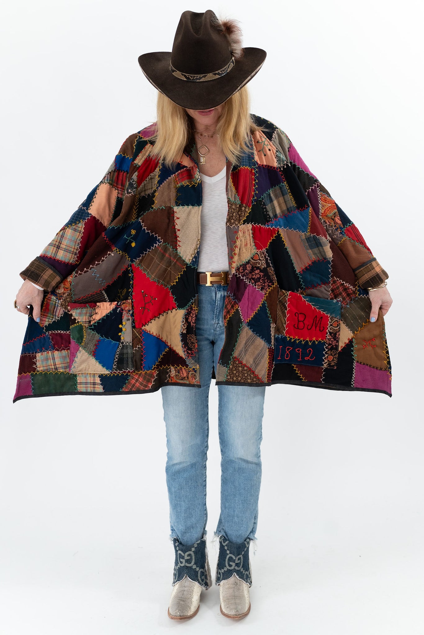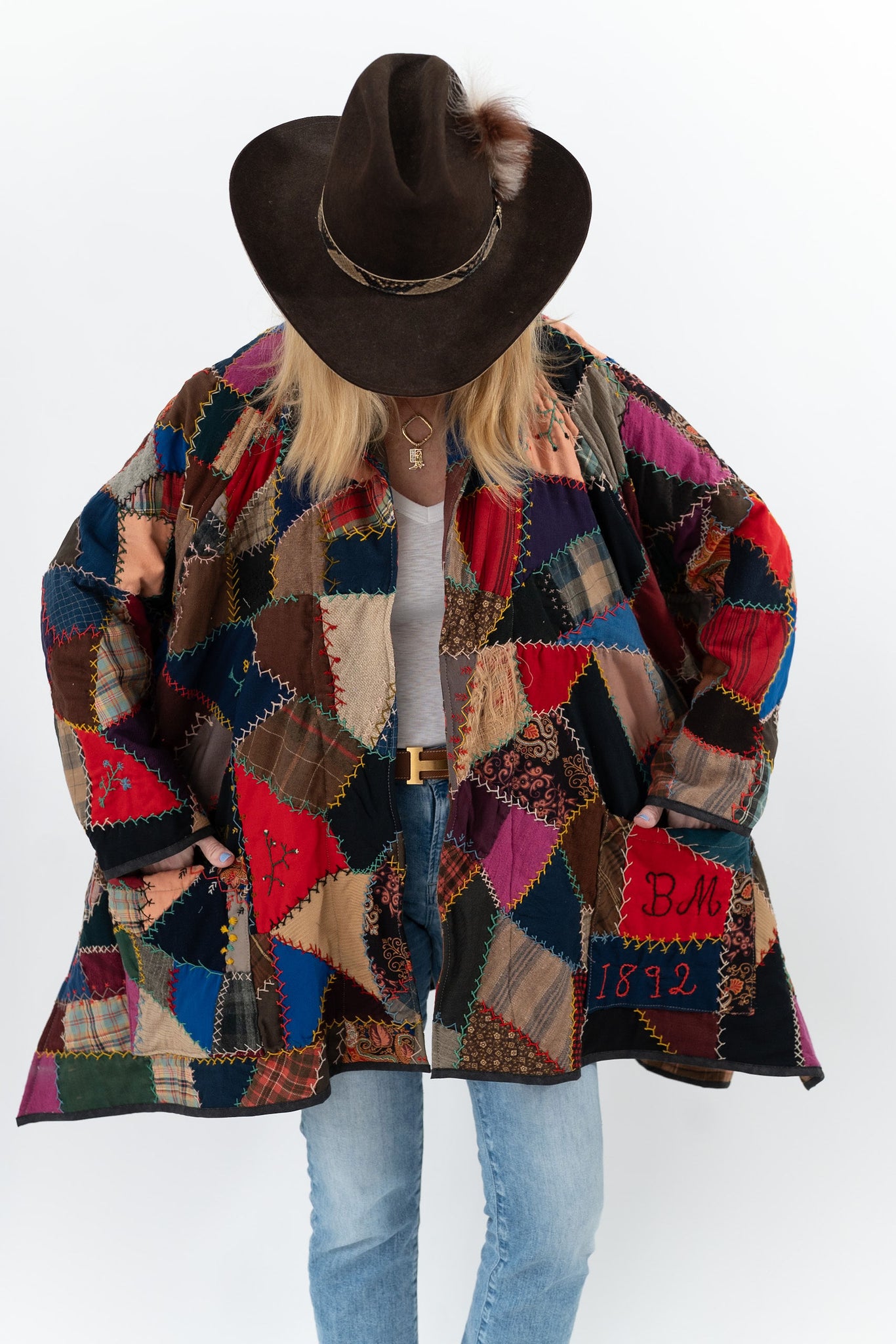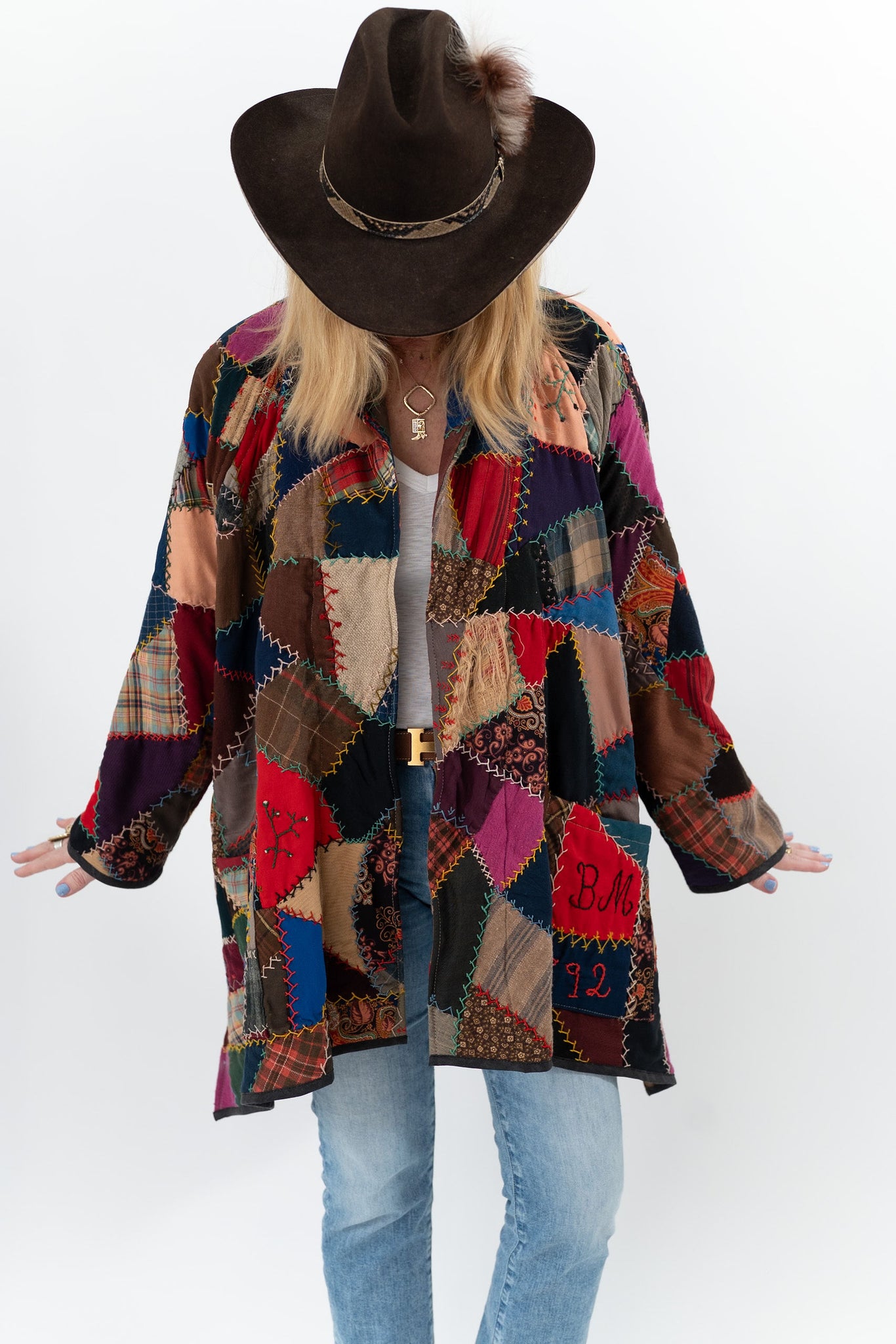 This is a crazy or scrappy quilt completed in 1892 by a woman with the initials BM, we have preserved the provenance and put it as a focal point on the pocket. The quilt contains men's shirt scraps, cottons, wools, and flannels. It is loaded with hand embroidery. The maker used a variety of different kinds of stitching techniques and thread colors. This is a museum-quality piece and should be purchased with a curator mentality. In our opinion, the jacket is thin, lightweight, and has a great drape. Please note there are a few patches that are shattered on the front that we have photographed for your convenience. The jacket looks smashing with a fur attached and we have showed you a few of our favorite options. If you would like a fur attached please reach out after purchasing. The sleeves are 3” longer than our standard Helen pattern. If you have further questions, please direct message us and we are happy to send you a video.