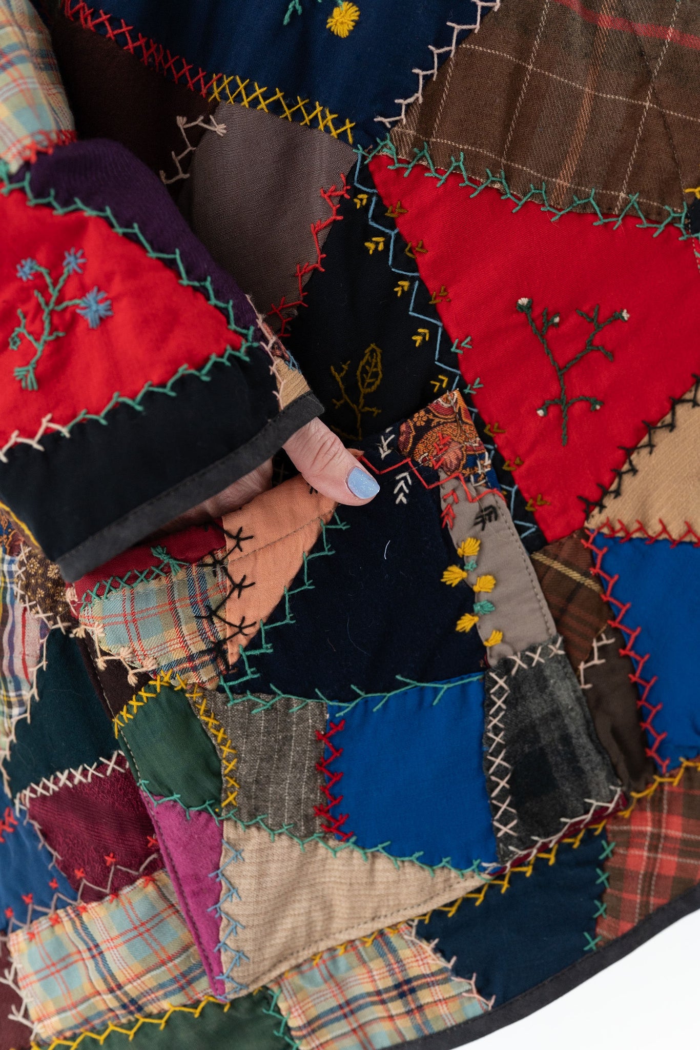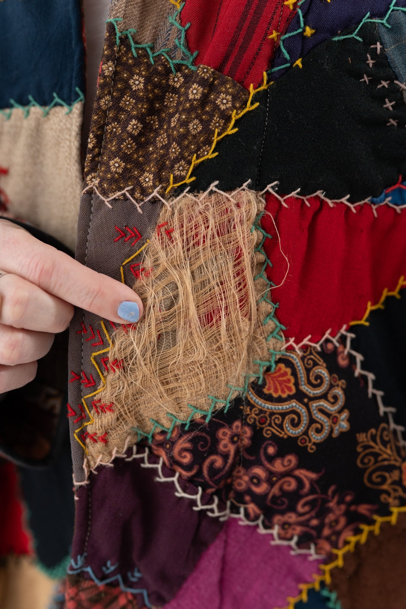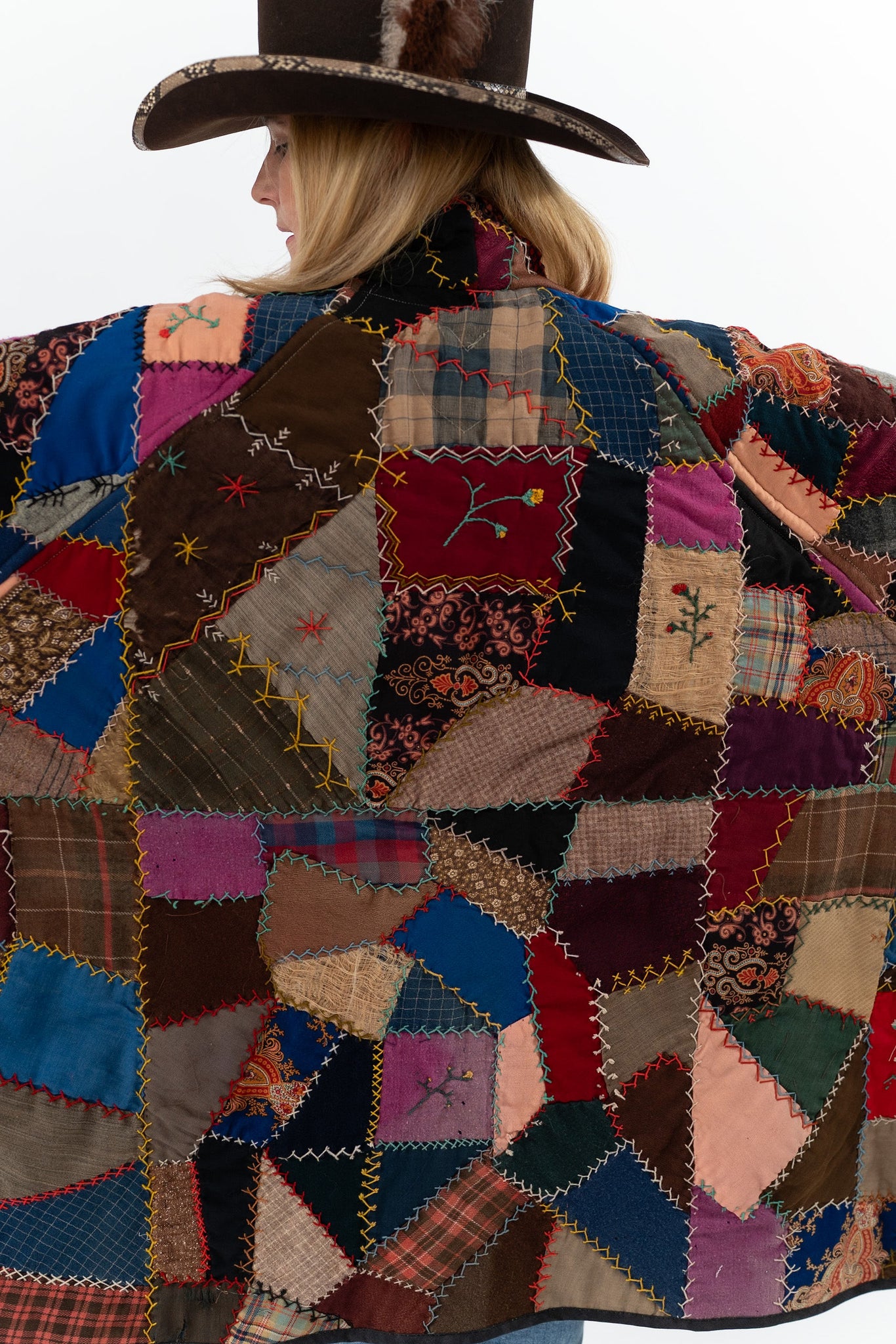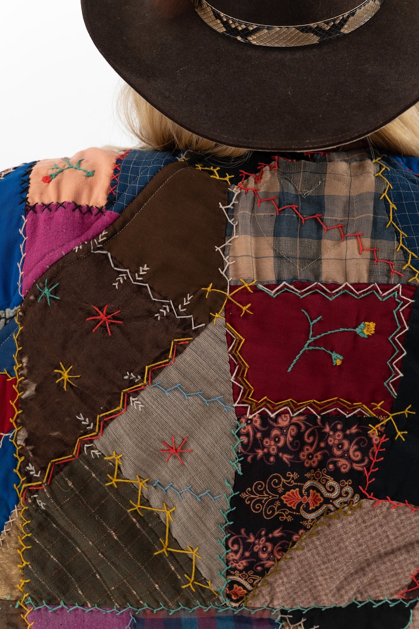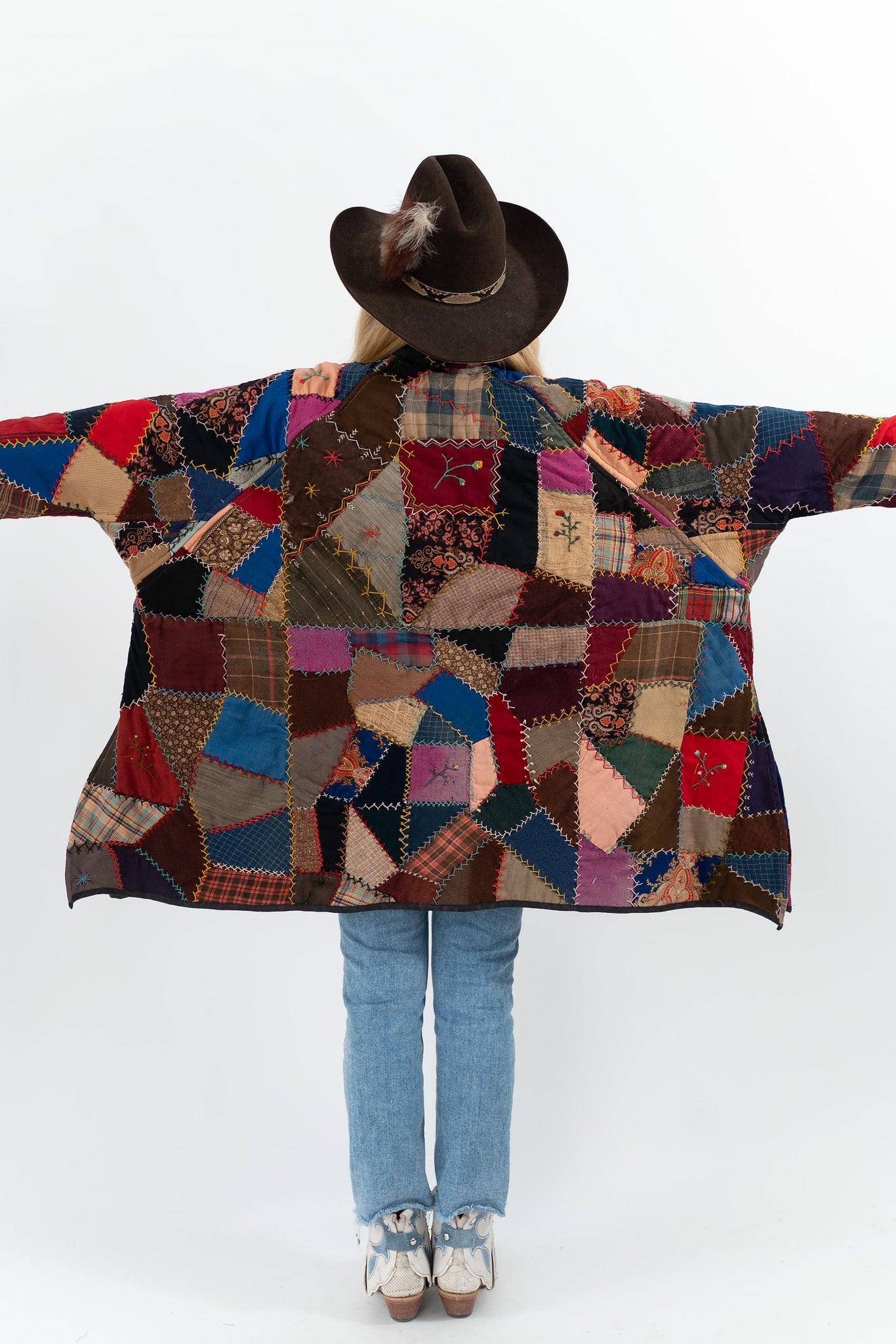 This is a crazy or scrappy quilt completed in 1892 by a woman with the initials BM, we have preserved the provenance and put it as a focal point on the pocket. The quilt contains men's shirt scraps, cottons, wools, and flannels. It is loaded with hand embroidery. The maker used a variety of different kinds of stitching techniques and thread colors. This is a museum-quality piece and should be purchased with a curator mentality. In our opinion, the jacket is thin, lightweight, and has a great drape. Please note there are a few patches that are shattered on the front that we have photographed for your convenience. The jacket looks smashing with a fur attached and we have showed you a few of our favorite options. If you would like a fur attached please reach out after purchasing. The sleeves are 3” longer than our standard Helen pattern. If you have further questions, please direct message us and we are happy to send you a video.