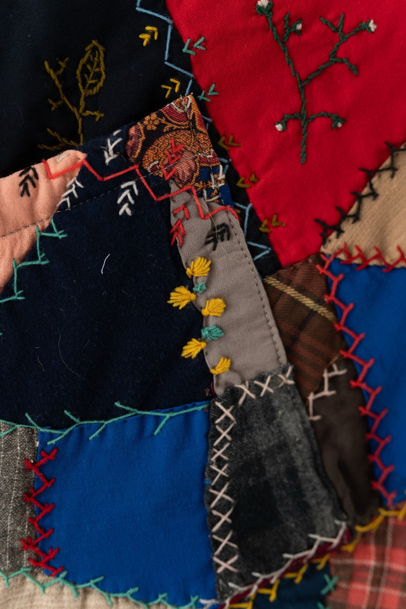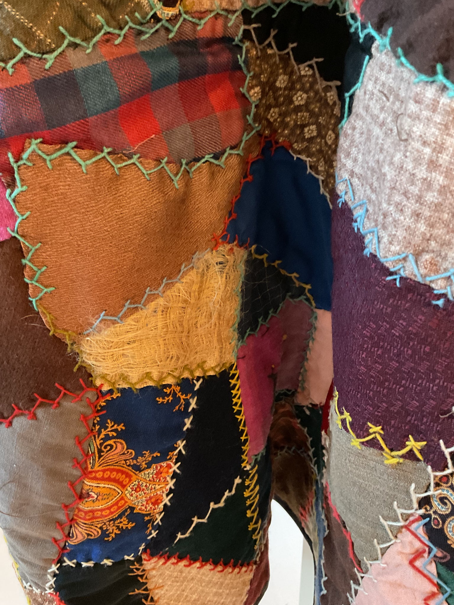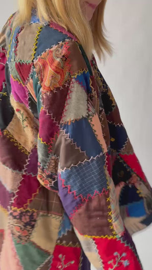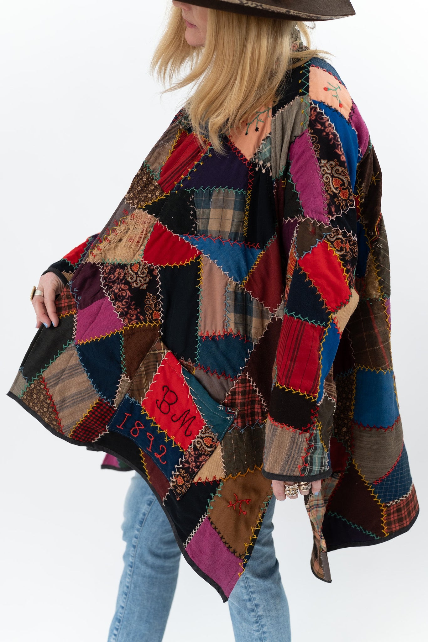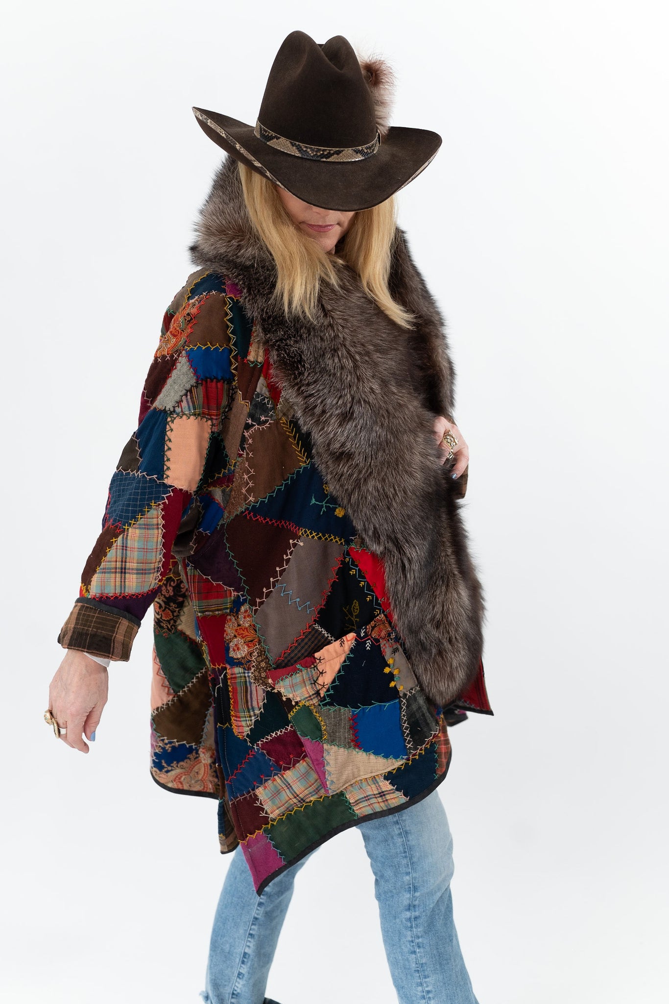 This is a crazy or scrappy quilt completed in 1892 by a woman with the initials BM, we have preserved the provenance and put it as a focal point on the pocket. The quilt contains men's shirt scraps, cottons, wools, and flannels. It is loaded with hand embroidery. The maker used a variety of different kinds of stitching techniques and thread colors. This is a museum-quality piece and should be purchased with a curator mentality. In our opinion, the jacket is thin, lightweight, and has a great drape. Please note there are a few patches that are shattered on the front that we have photographed for your convenience. The jacket looks smashing with a fur attached and we have showed you a few of our favorite options. If you would like a fur attached please reach out after purchasing. The sleeves are 3” longer than our standard Helen pattern. If you have further questions, please direct message us and we are happy to send you a video.