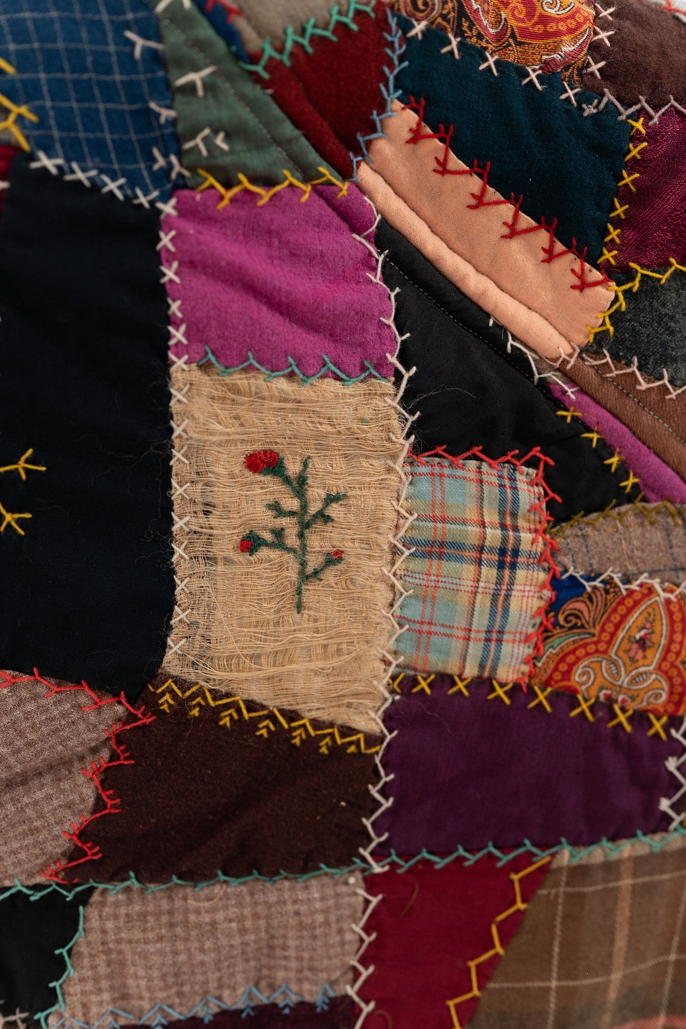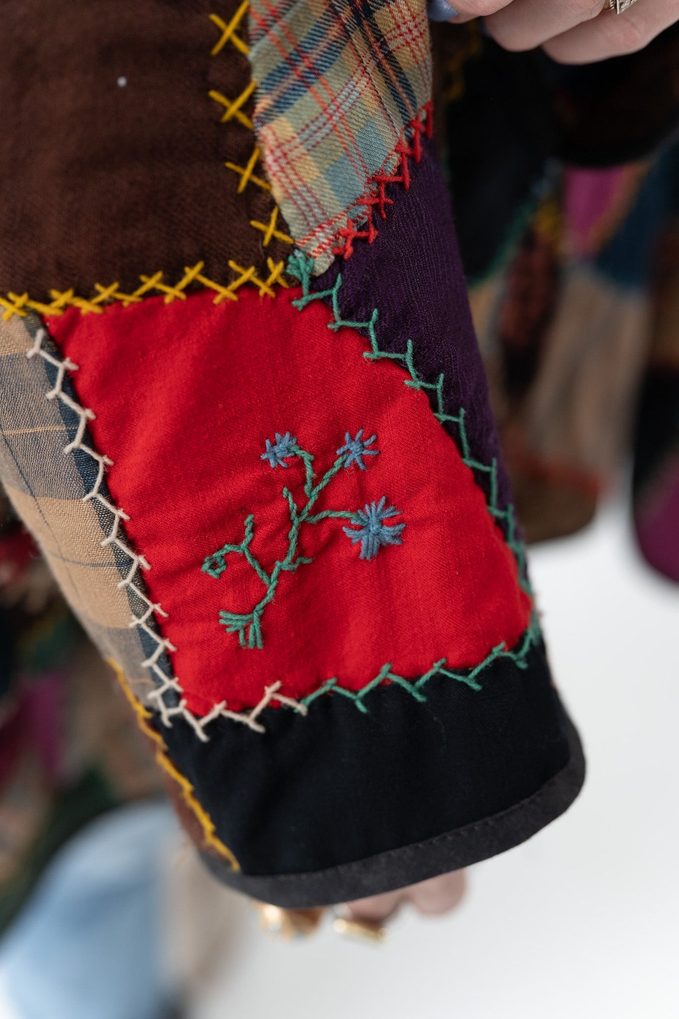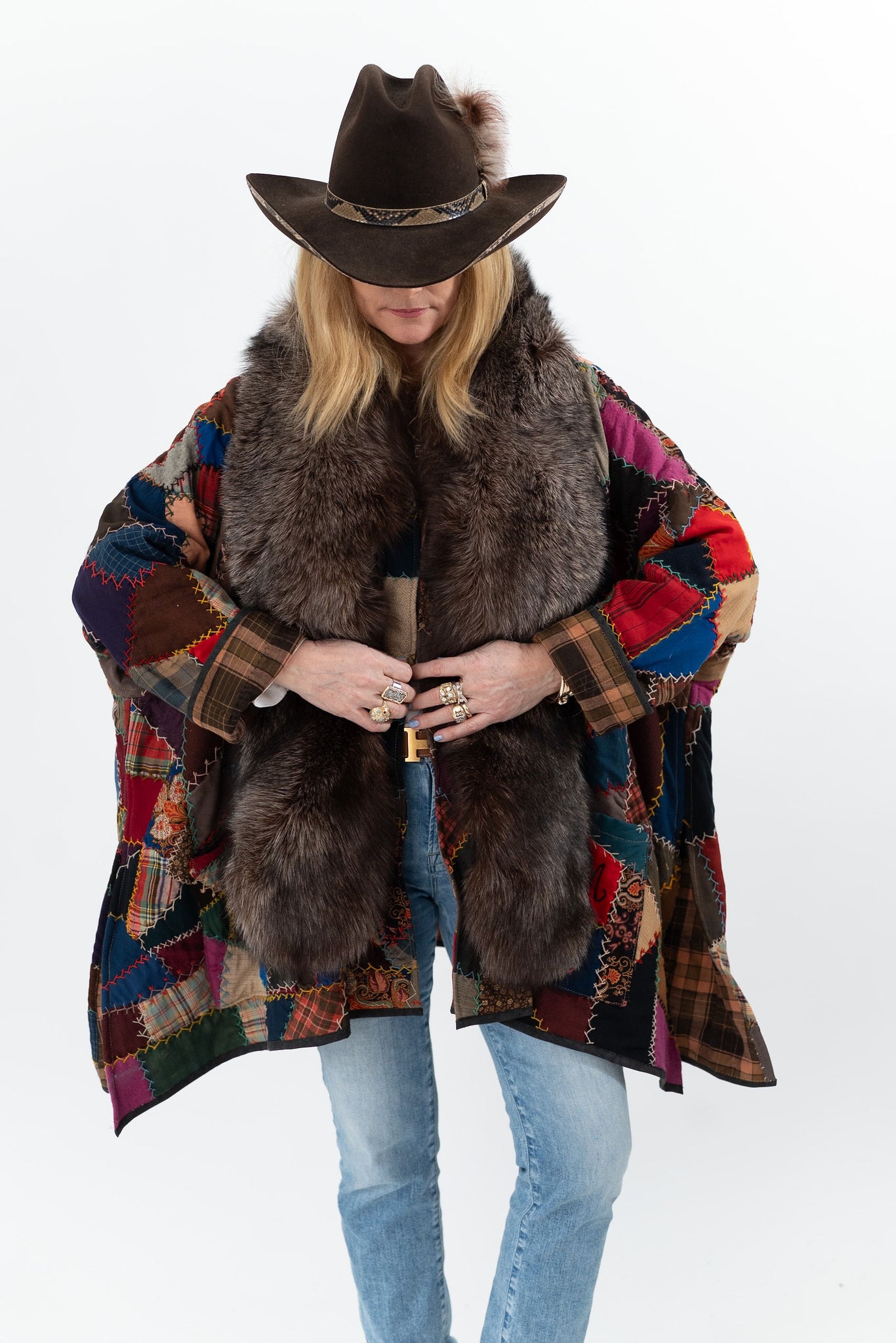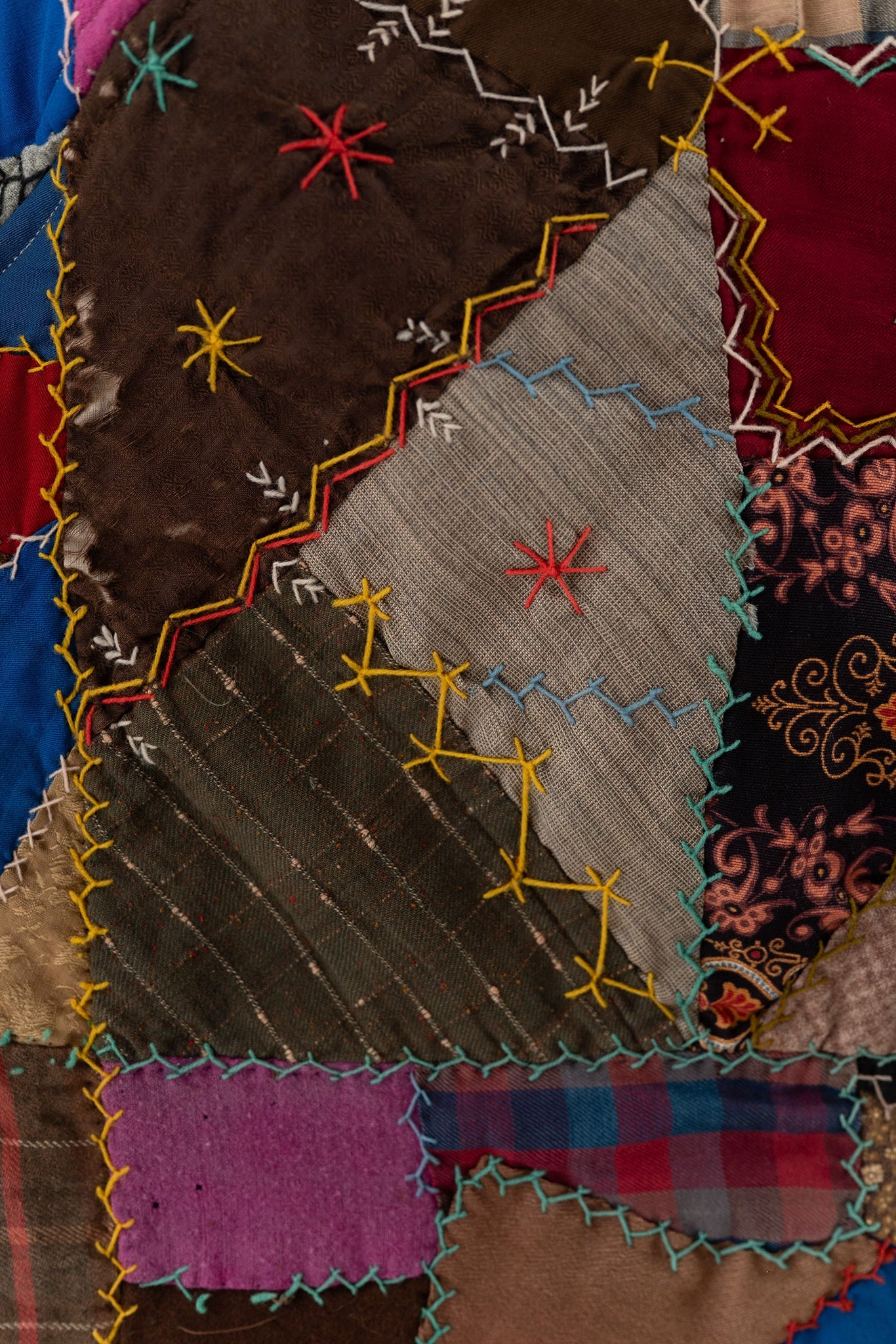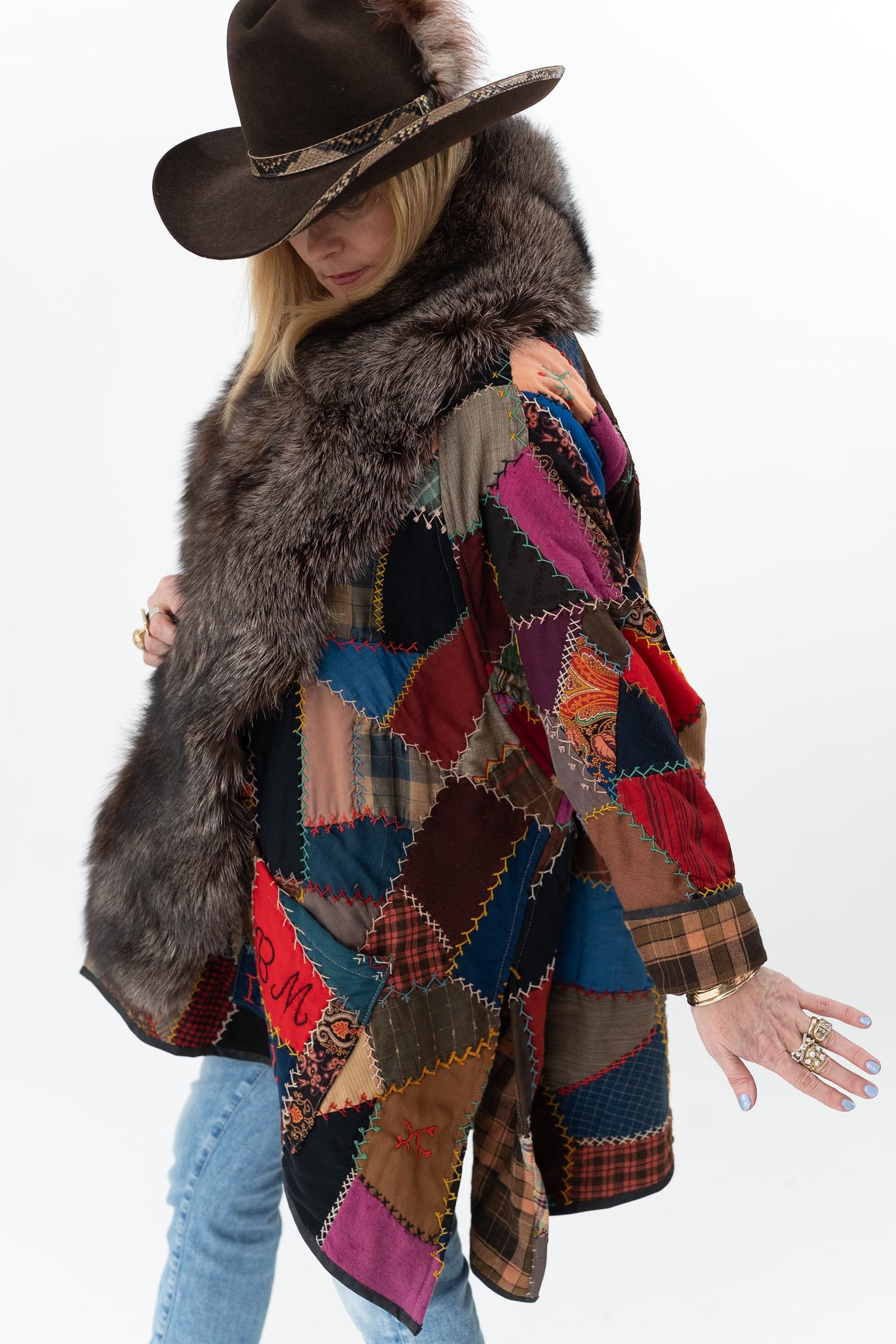 This is a crazy or scrappy quilt completed in 1892 by a woman with the initials BM, we have preserved the provenance and put it as a focal point on the pocket. The quilt contains men's shirt scraps, cottons, wools, and flannels. It is loaded with hand embroidery. The maker used a variety of different kinds of stitching techniques and thread colors. This is a museum-quality piece and should be purchased with a curator mentality. In our opinion, the jacket is thin, lightweight, and has a great drape. Please note there are a few patches that are shattered on the front that we have photographed for your convenience. The jacket looks smashing with a fur attached and we have showed you a few of our favorite options. If you would like a fur attached please reach out after purchasing. The sleeves are 3” longer than our standard Helen pattern. If you have further questions, please direct message us and we are happy to send you a video.