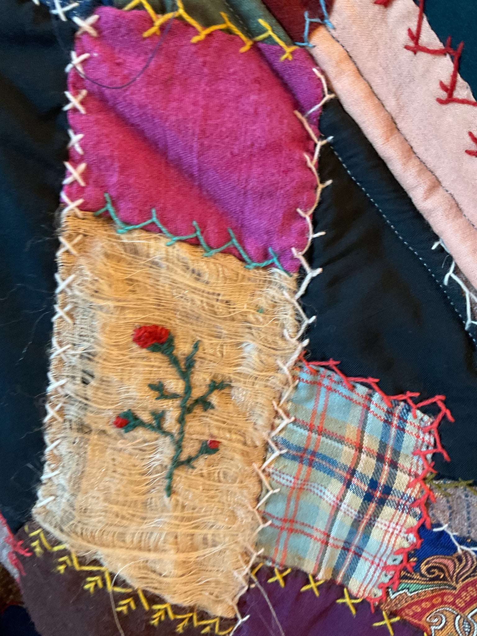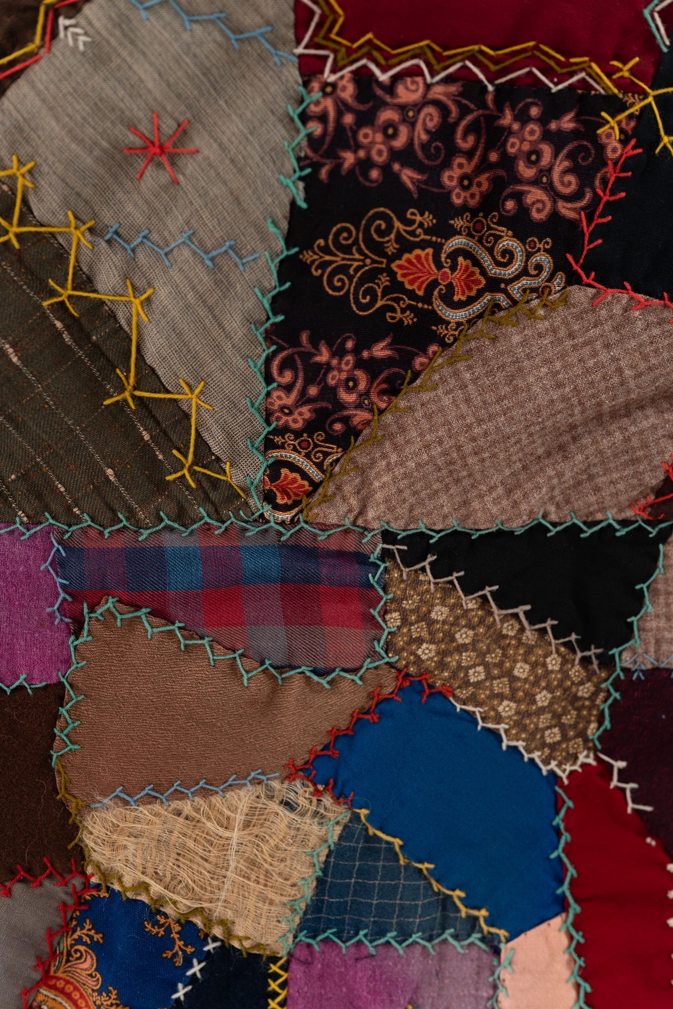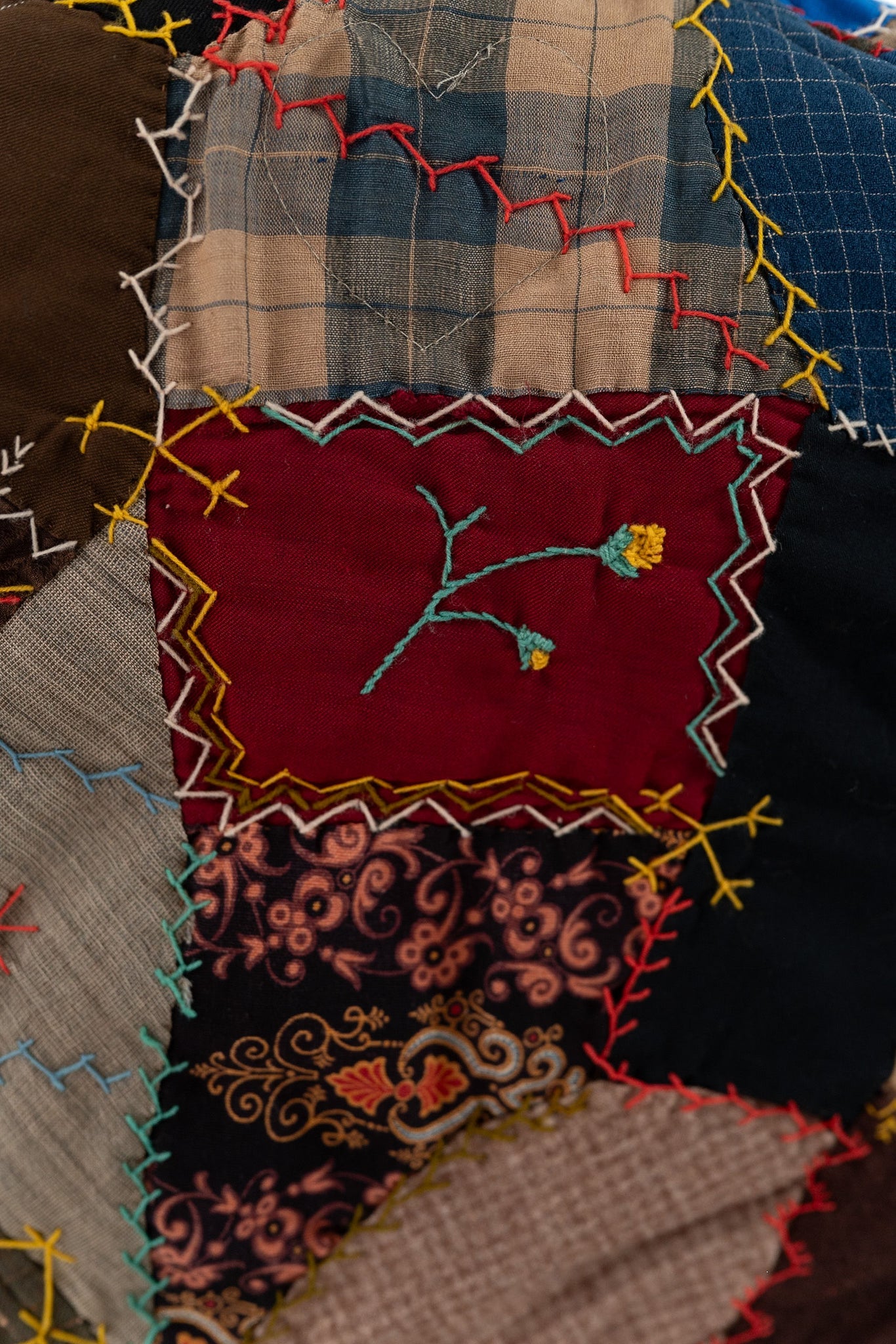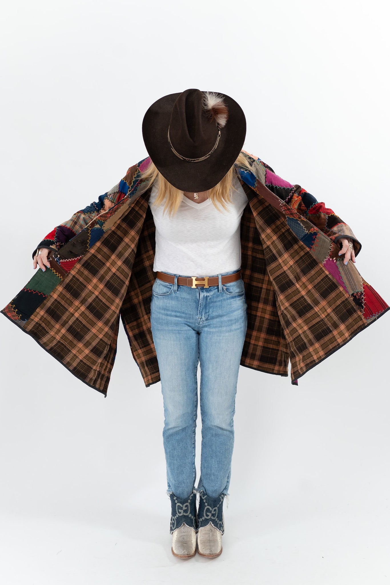 This is a crazy or scrappy quilt completed in 1892 by a woman with the initials BM, we have preserved the provenance and put it as a focal point on the pocket. The quilt contains men's shirt scraps, cottons, wools, and flannels. It is loaded with hand embroidery. The maker used a variety of different kinds of stitching techniques and thread colors. This is a museum-quality piece and should be purchased with a curator mentality. In our opinion, the jacket is thin, lightweight, and has a great drape. Please note there are a few patches that are shattered on the front that we have photographed for your convenience. The jacket looks smashing with a fur attached and we have showed you a few of our favorite options. If you would like a fur attached please reach out after purchasing. The sleeves are 3” longer than our standard Helen pattern. If you have further questions, please direct message us and we are happy to send you a video.