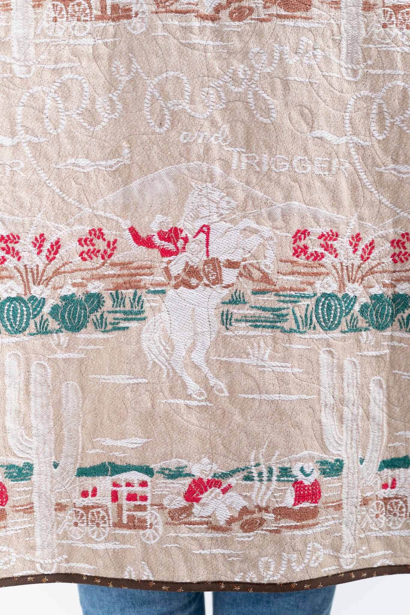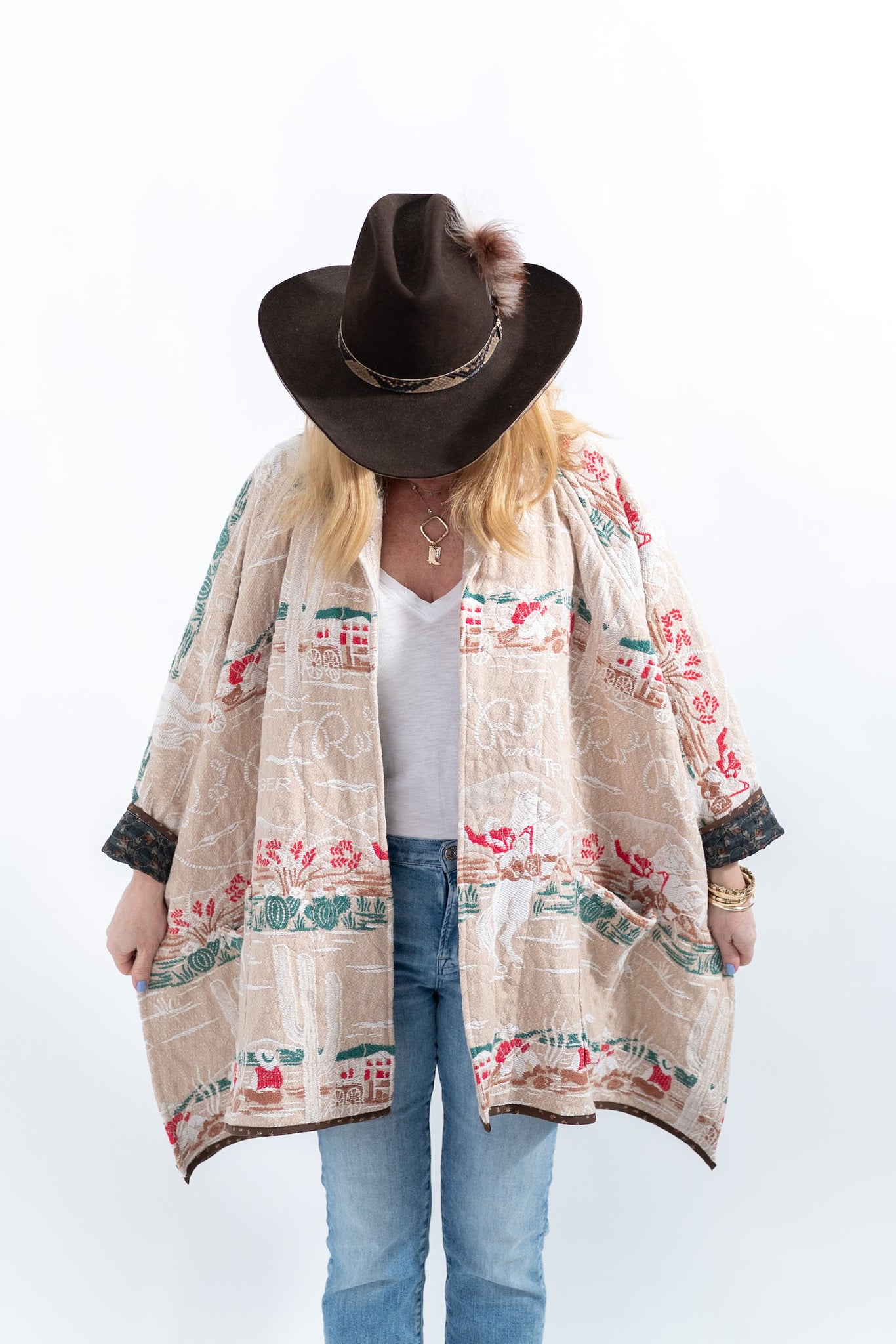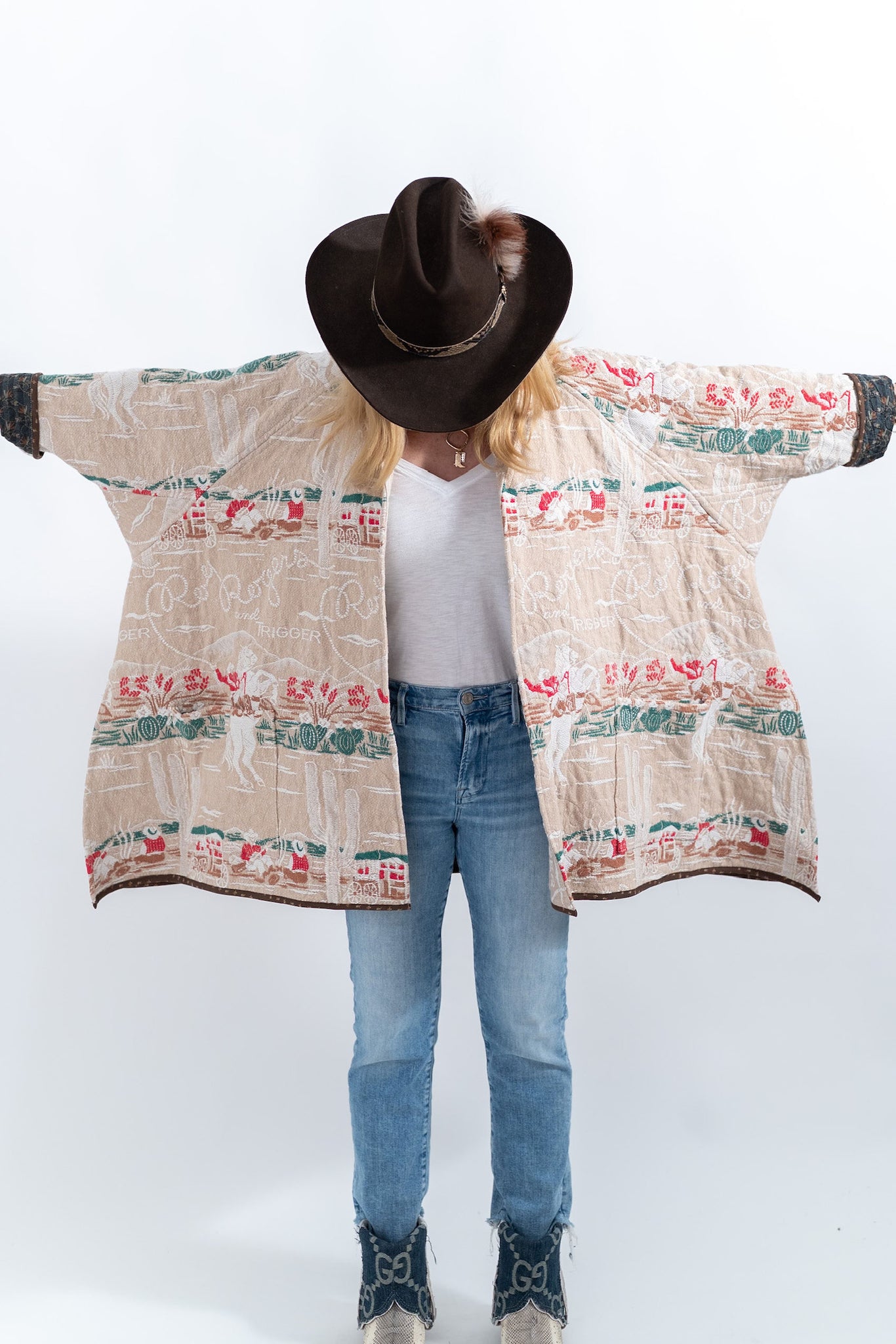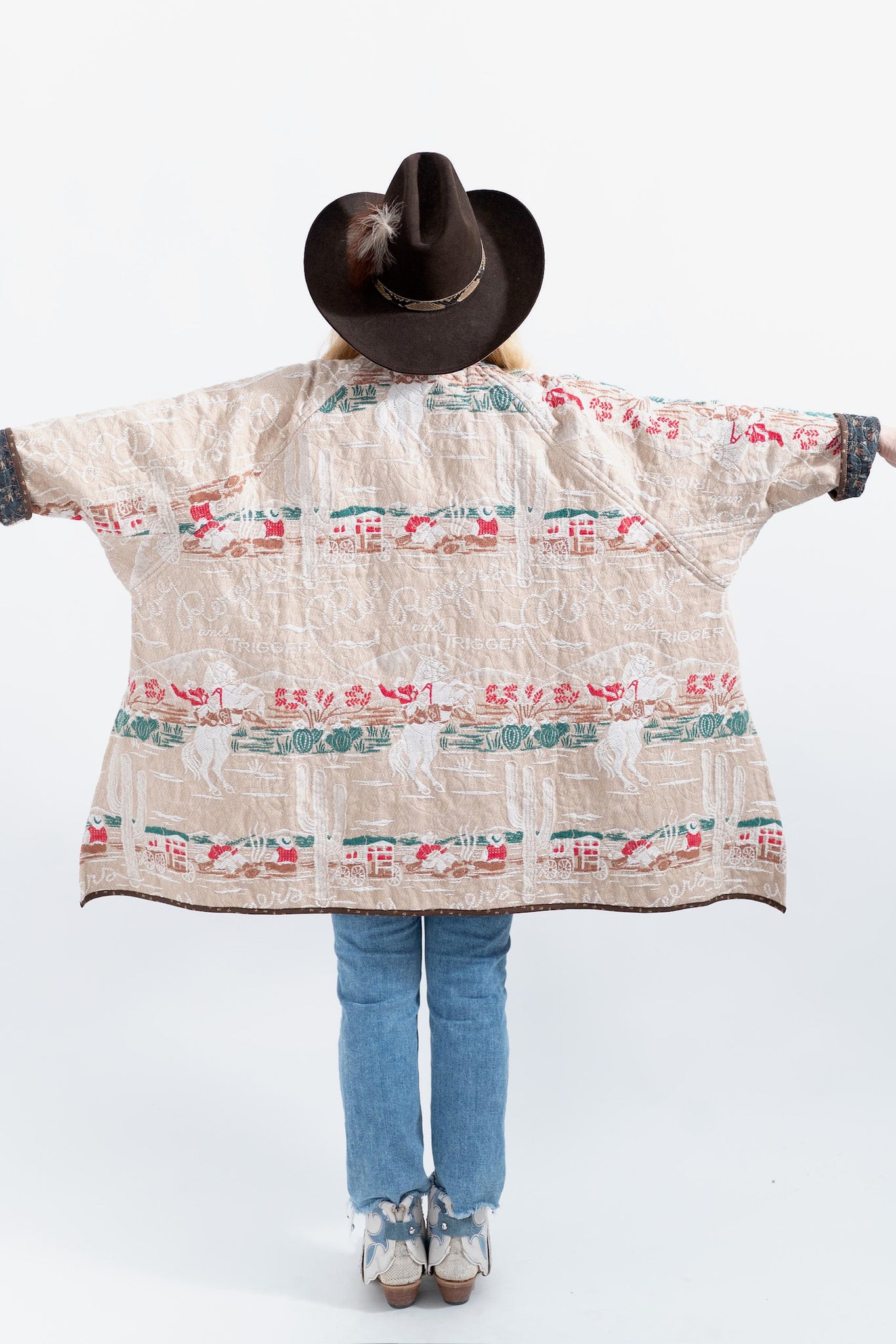 This quilt is a combination of a vintage Roy Rogers bedspread from the 1950s and reproduction turn of the century fabric. Zoe Dawn brought this piece to life on her long arm. If you look closely you can see the quilted horseshoes. In our opinion, the jacket is thin, soft, lightweight, and very floppy. This piece is very comfy and flattering to wear. It has a great drape. If you have further questions, please direct message us and we are happy to send you a video.