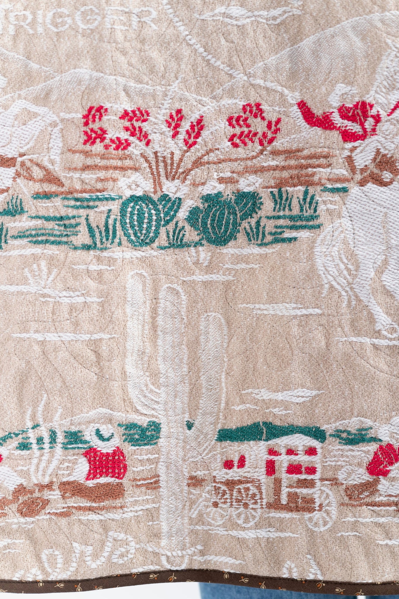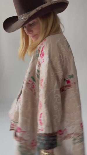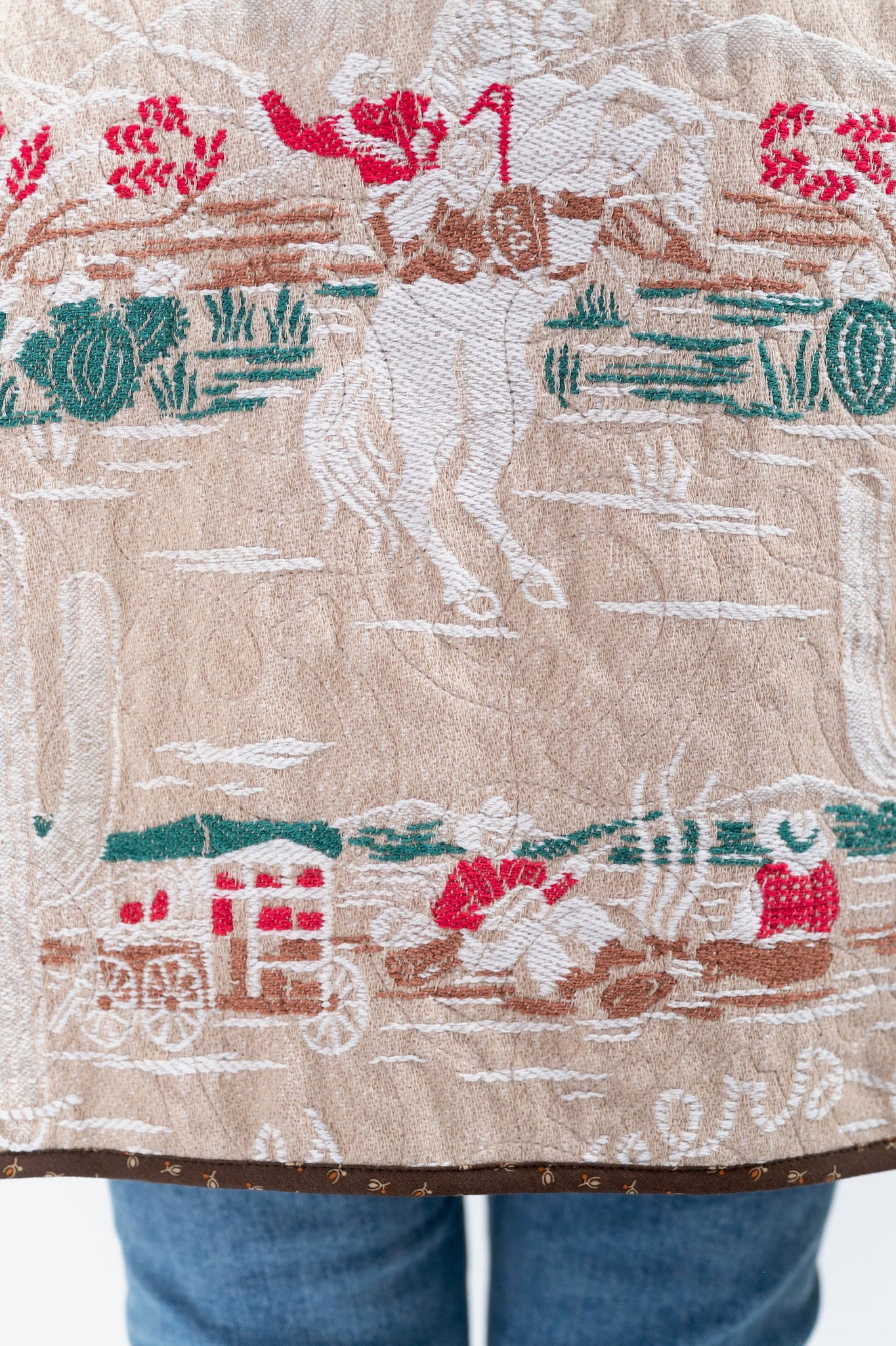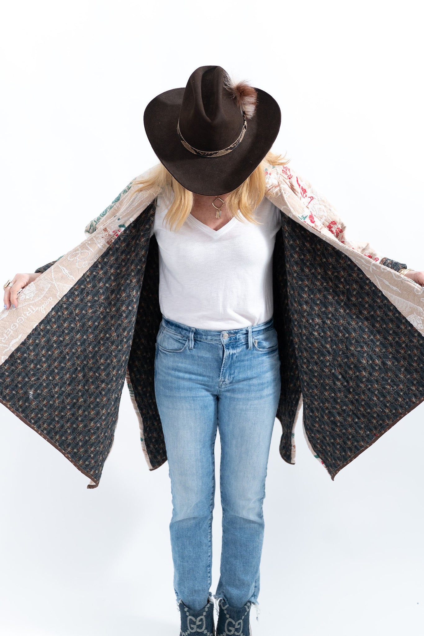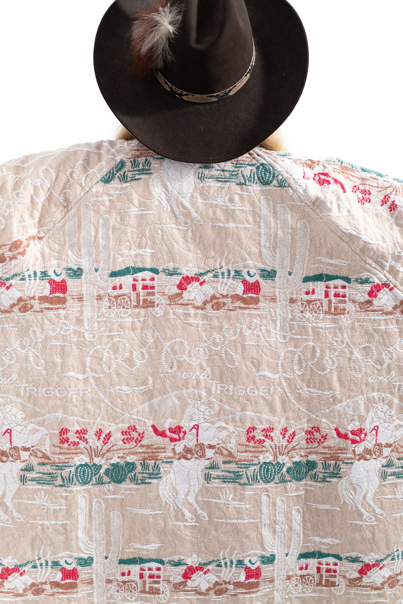 This quilt is a combination of a vintage Roy Rogers bedspread from the 1950s and reproduction turn of the century fabric. Zoe Dawn brought this piece to life on her long arm. If you look closely you can see the quilted horseshoes. In our opinion, the jacket is thin, soft, lightweight, and very floppy. This piece is very comfy and flattering to wear. It has a great drape. If you have further questions, please direct message us and we are happy to send you a video.
