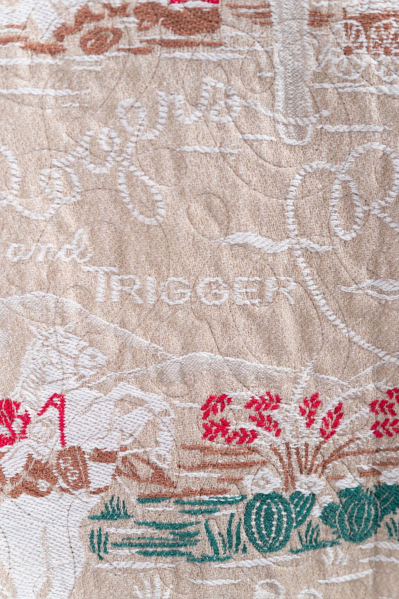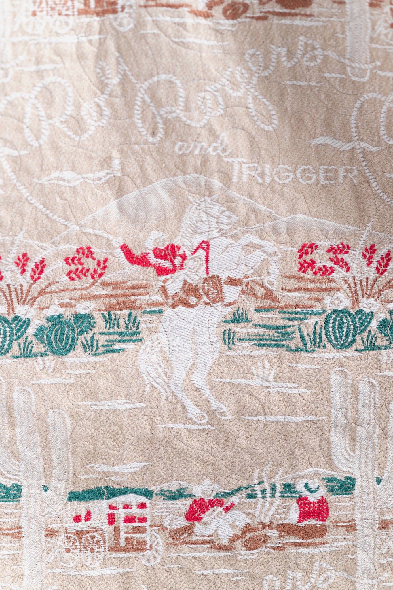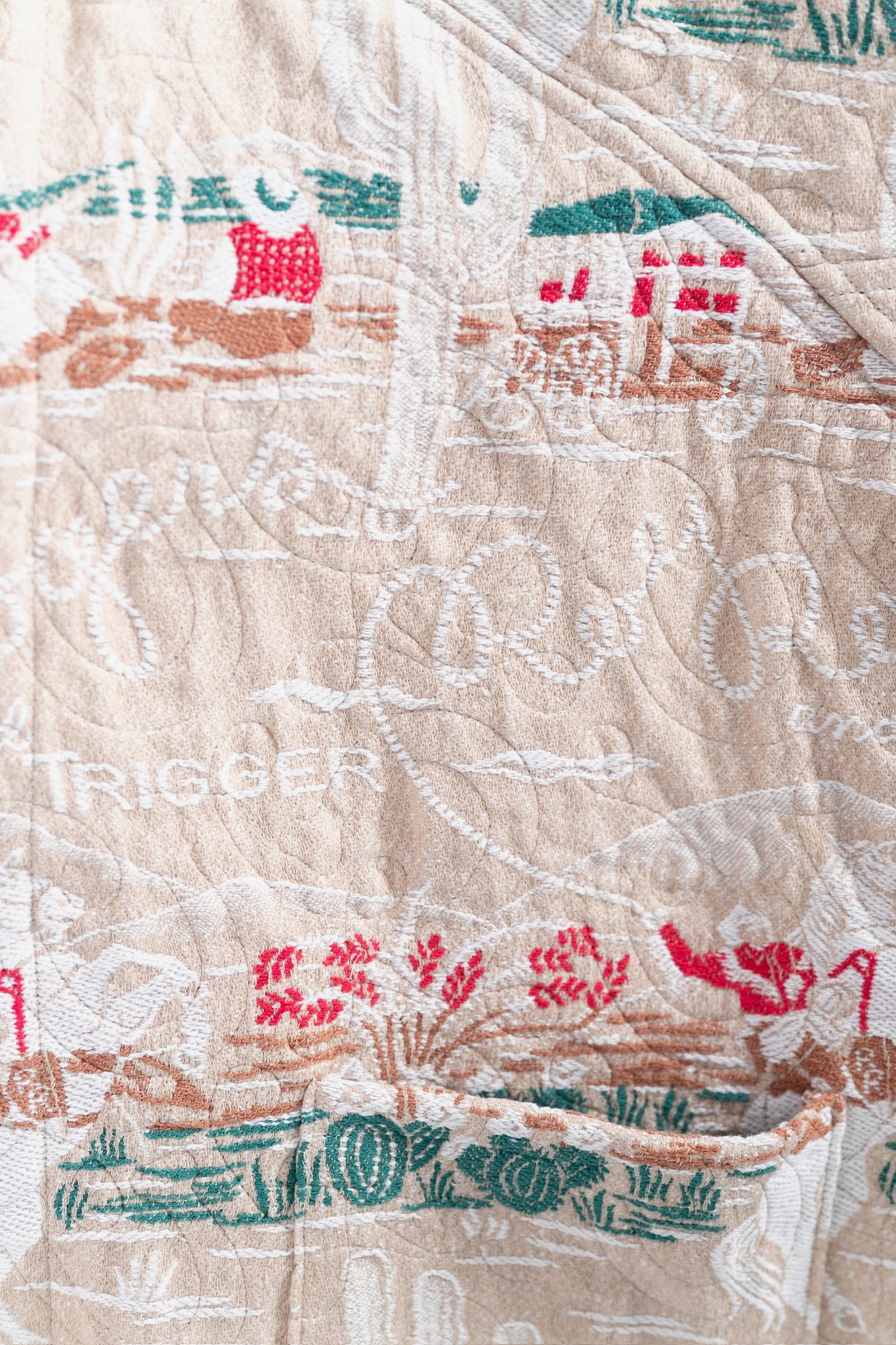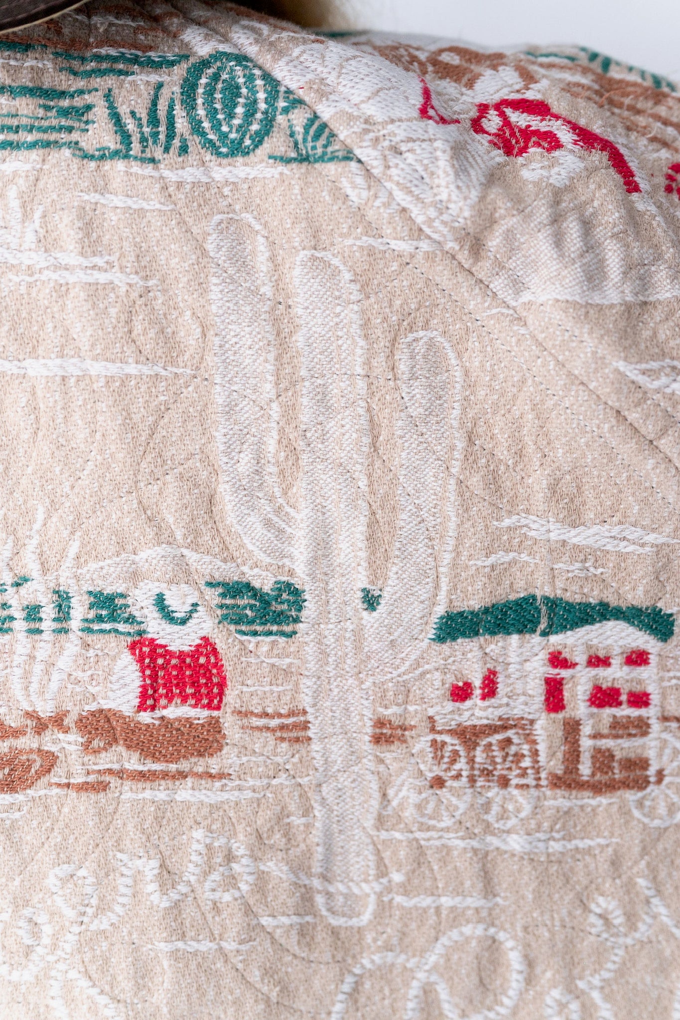 This quilt is a combination of a vintage Roy Rogers bedspread from the 1950s and reproduction turn of the century fabric. Zoe Dawn brought this piece to life on her long arm. If you look closely you can see the quilted horseshoes. In our opinion, the jacket is thin, soft, lightweight, and very floppy. This piece is very comfy and flattering to wear. It has a great drape. If you have further questions, please direct message us and we are happy to send you a video.