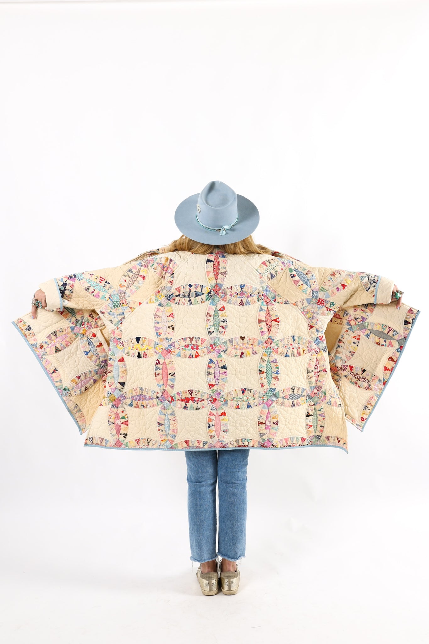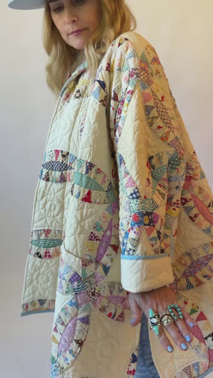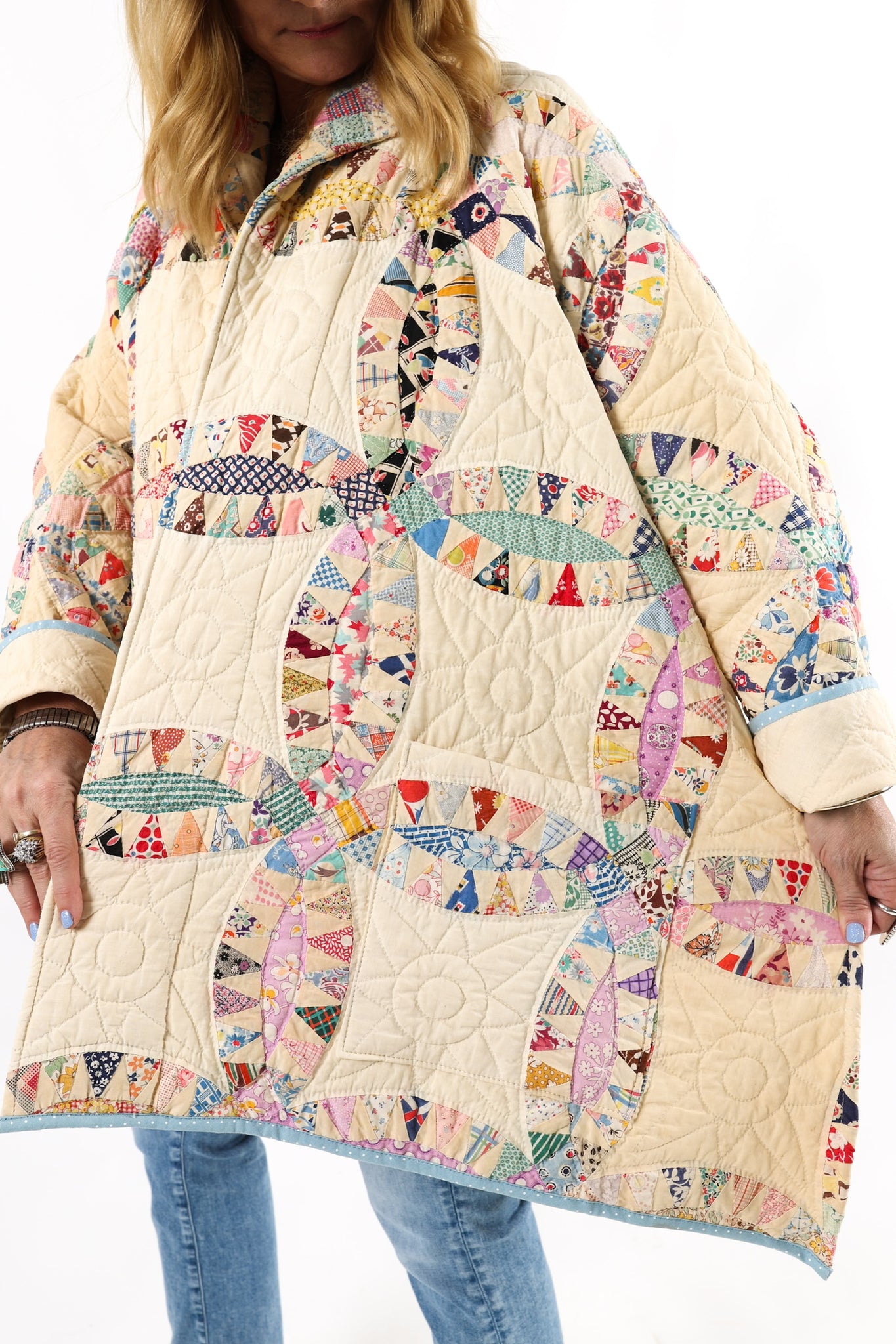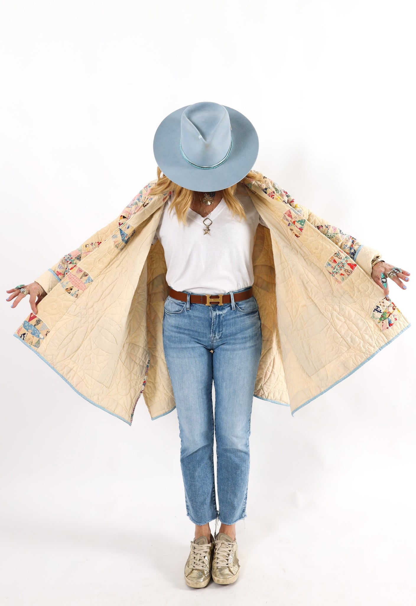 Please note that all of our jackets are made from antique quilts and the fabric reflects this. Our fabrics are sometimes older than 100 years old and are perfectly worn. We believe this is what makes them special and is part of their charm. All of our garments are pre-washed in a special restoration quilt wash. We recommend only spot cleaning if necessary.