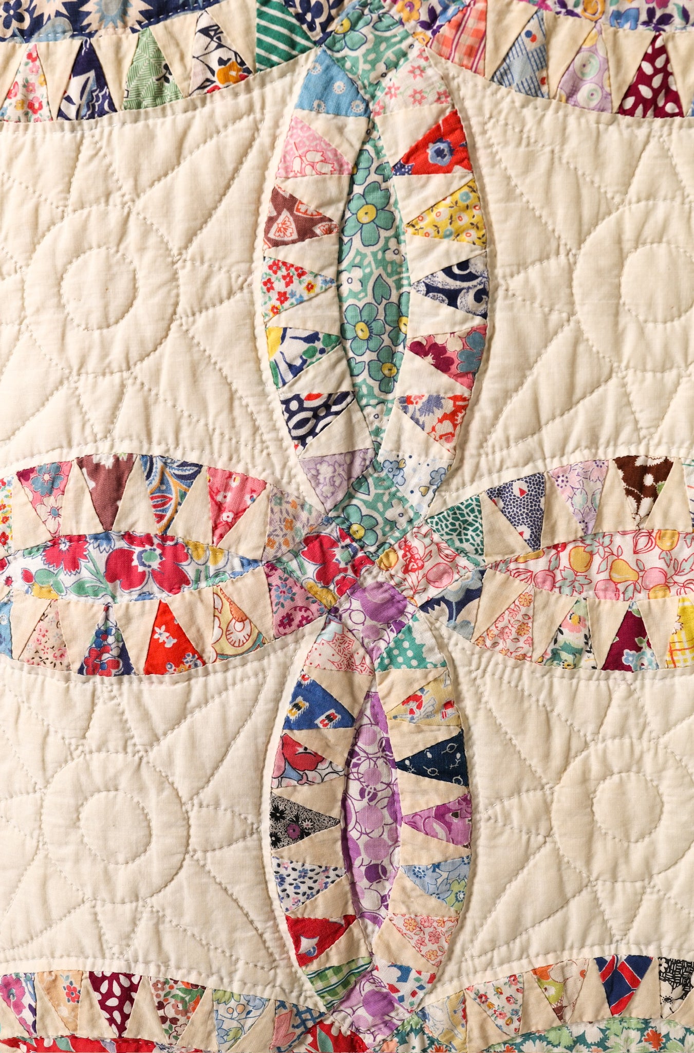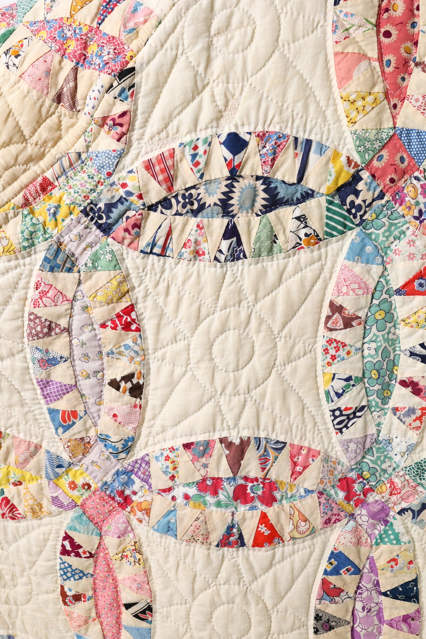This is an antique American quilt. The top was made circa 1930s to 1940s, however we believe that it was backed at a later time due to the fact that we believe the quilt contains poly batting. It is a traditional Pickle Dish quilt pattern. This quilt is exceptional for its very tiny pieces, beautiful hand quilting and meticulous hand sewing. The ground fabric is an almond color. It is not white nor was it meant to be white. In our opinion, the jacket is thin, lightweight, soft, and contains a little loft (puffiness). Overall, the quilt has a tea stain and gives a very shabby chic vibe. It is in excellent condition. Please note, there are a few minor zig zag mends and a very small age spot on the inside of the jacket. The sleeves are 3” longer than our standard Helen pattern. If you have further questions, please direct message us and we are happy to send you a video.