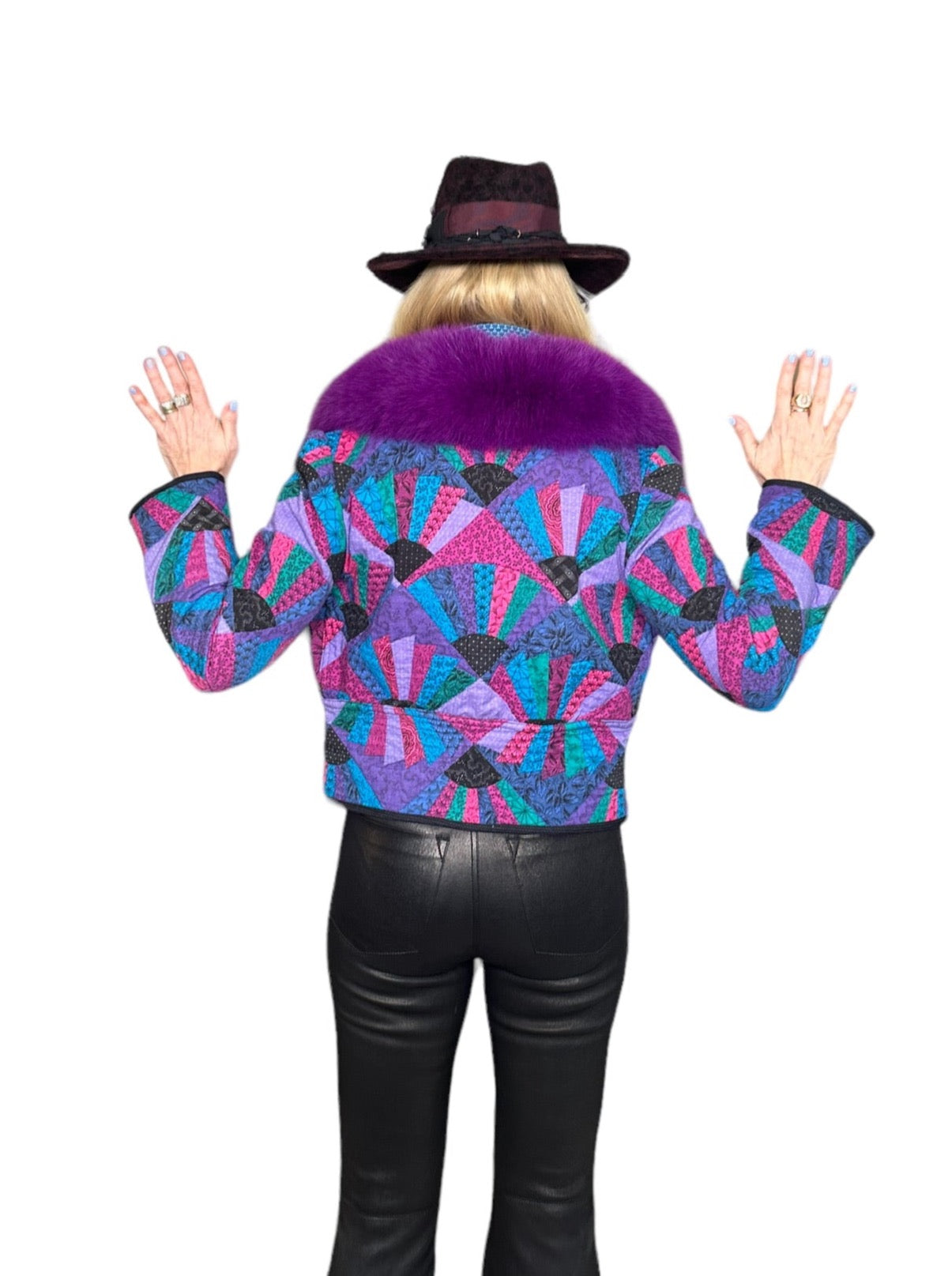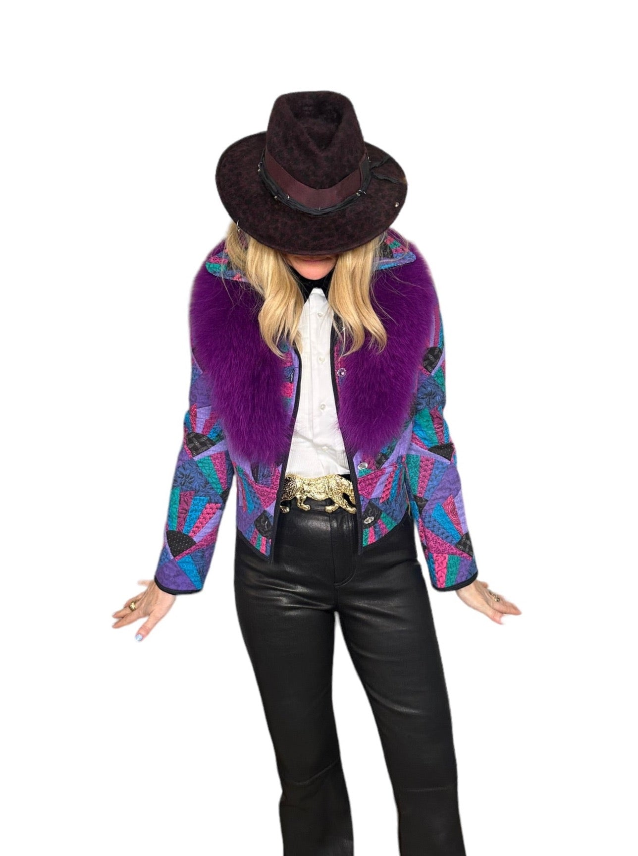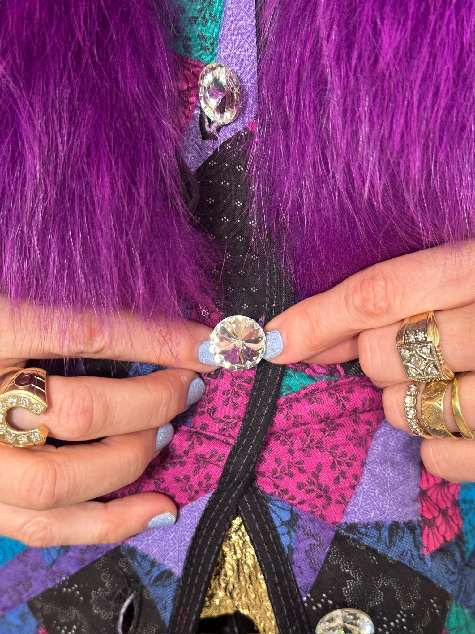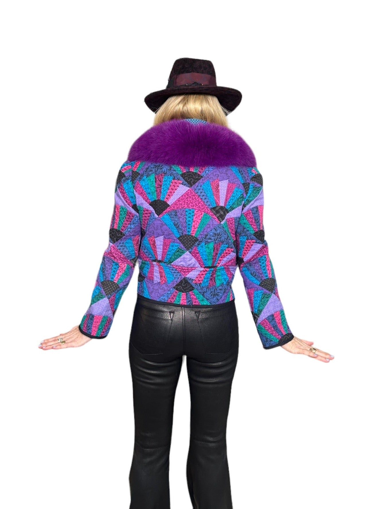 This is a vintage, Fan quilt pattern. It has been hand quilted. The maker hand quilted over a cheater quilt. We added a genuine detachable purple fur collar. For closures down the front we added crystal buttons. We believe that the fabric is a poly-cotton blend and in our opinion the quilt is very thin, very soft, and very light weight. This is a size XS. Pleas see size guide below and if you have any questions on size or fit please direct message us and we would be happy to help.