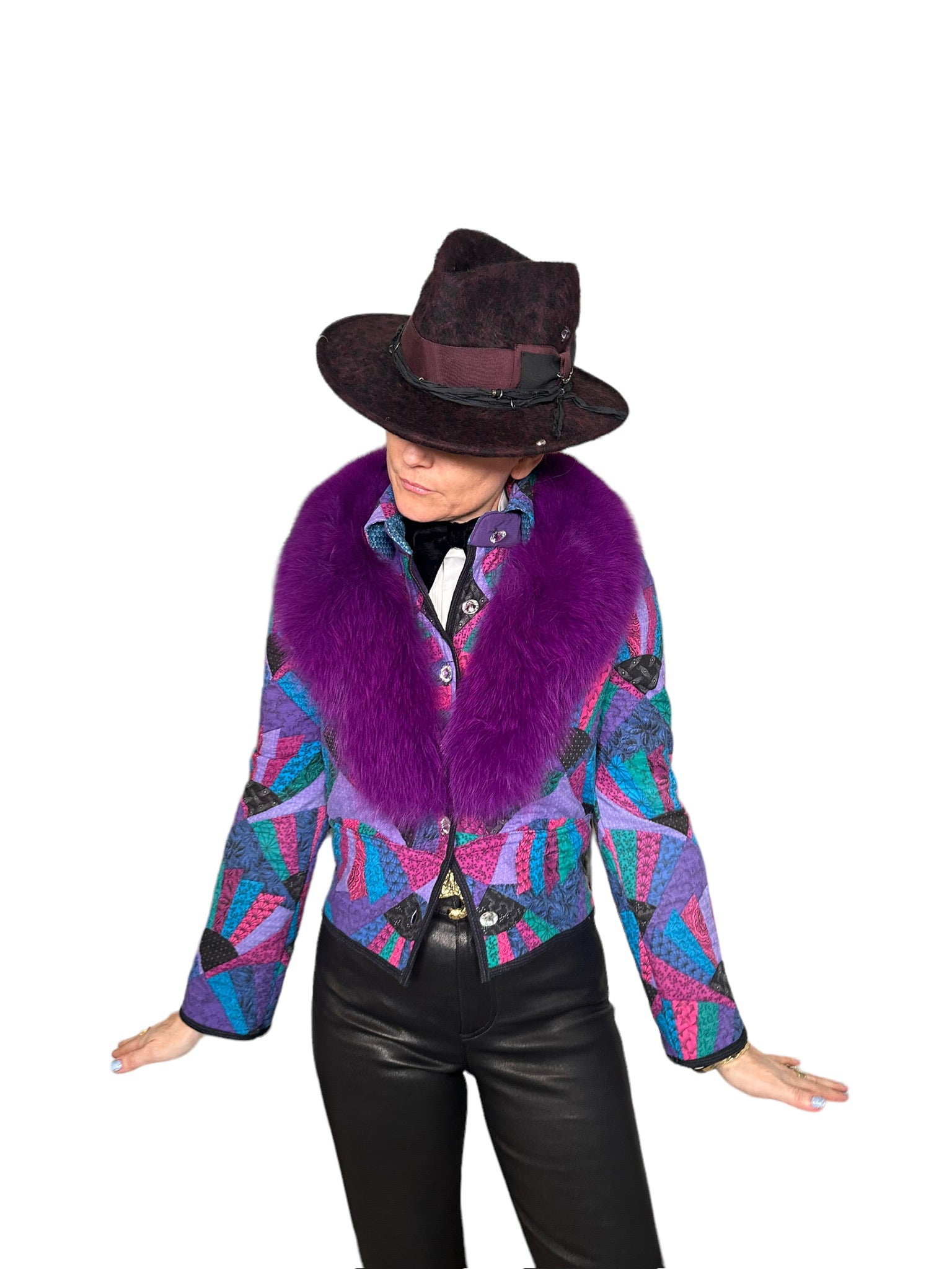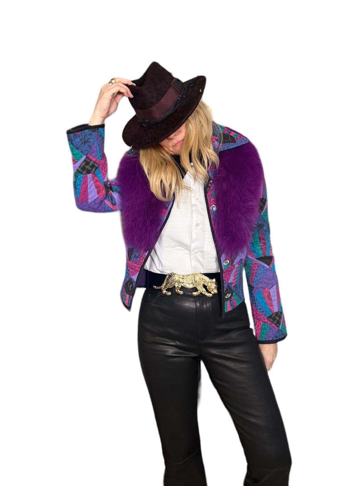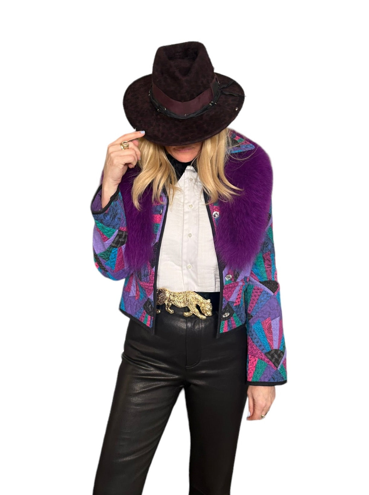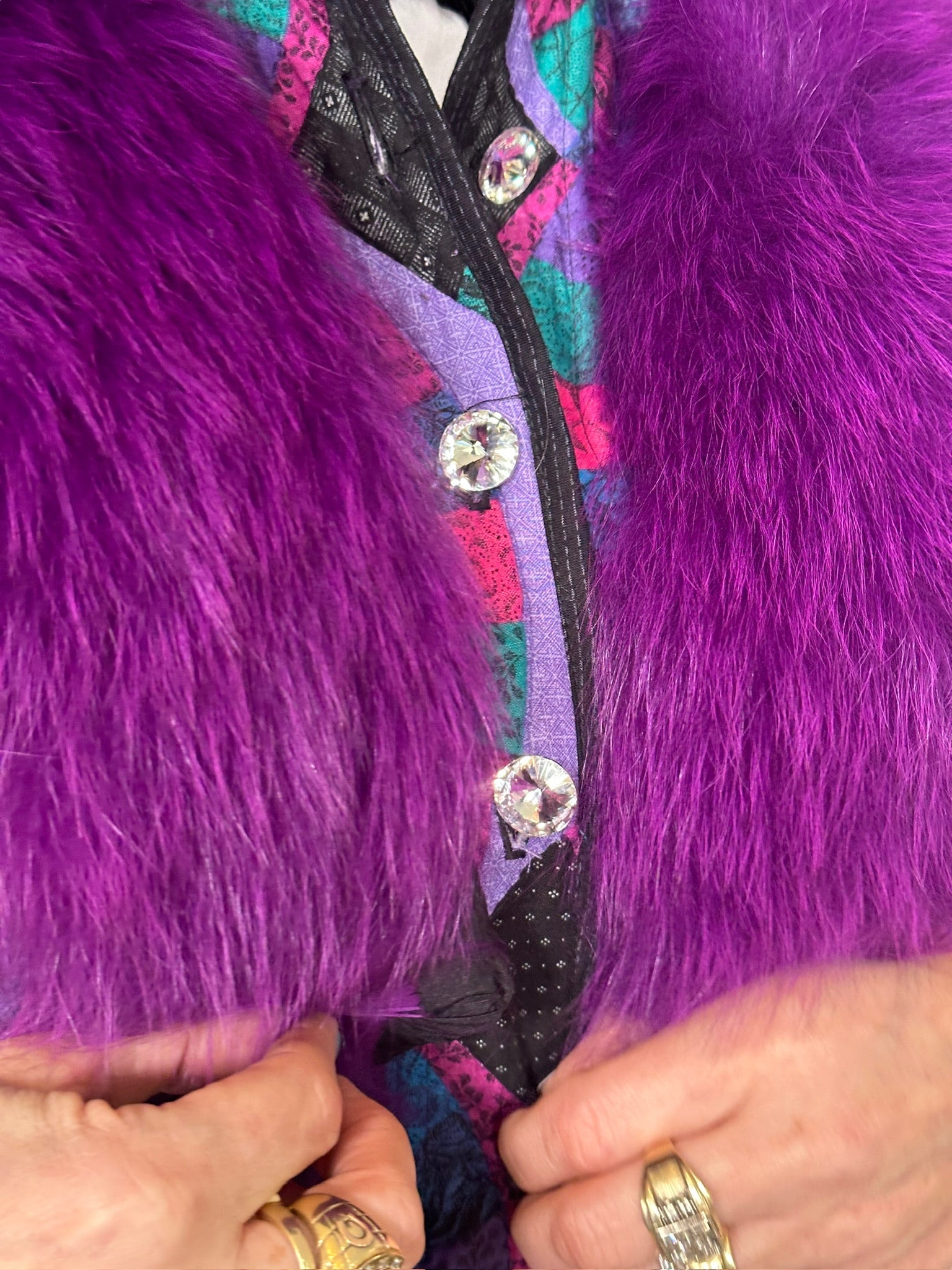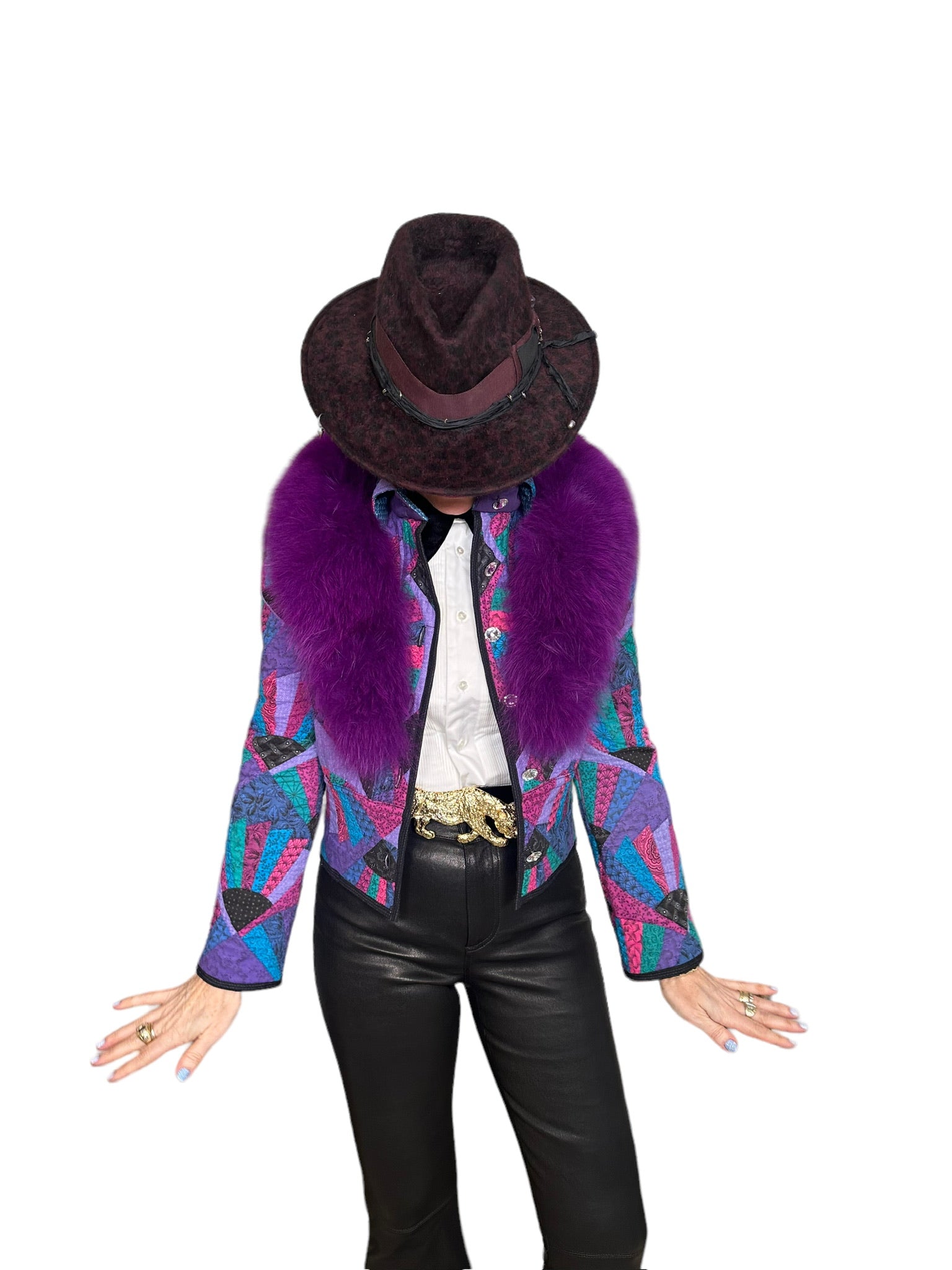 This is a vintage, Fan quilt pattern. It has been hand quilted. The maker hand quilted over a cheater quilt. We added a genuine detachable purple fur collar. For closures down the front we added crystal buttons. We believe that the fabric is a poly-cotton blend and in our opinion the quilt is very thin, very soft, and very light weight. This is a size XS. Pleas see size guide below and if you have any questions on size or fit please direct message us and we would be happy to help.