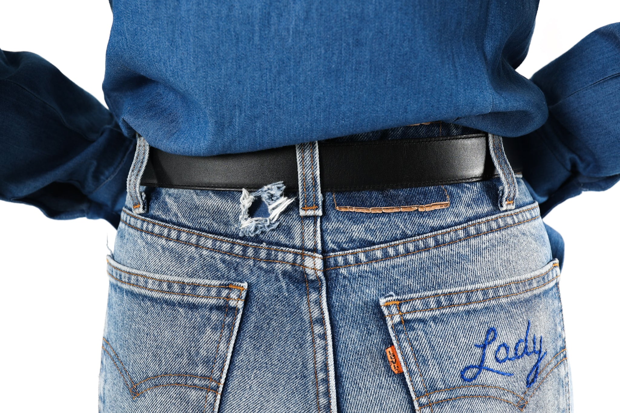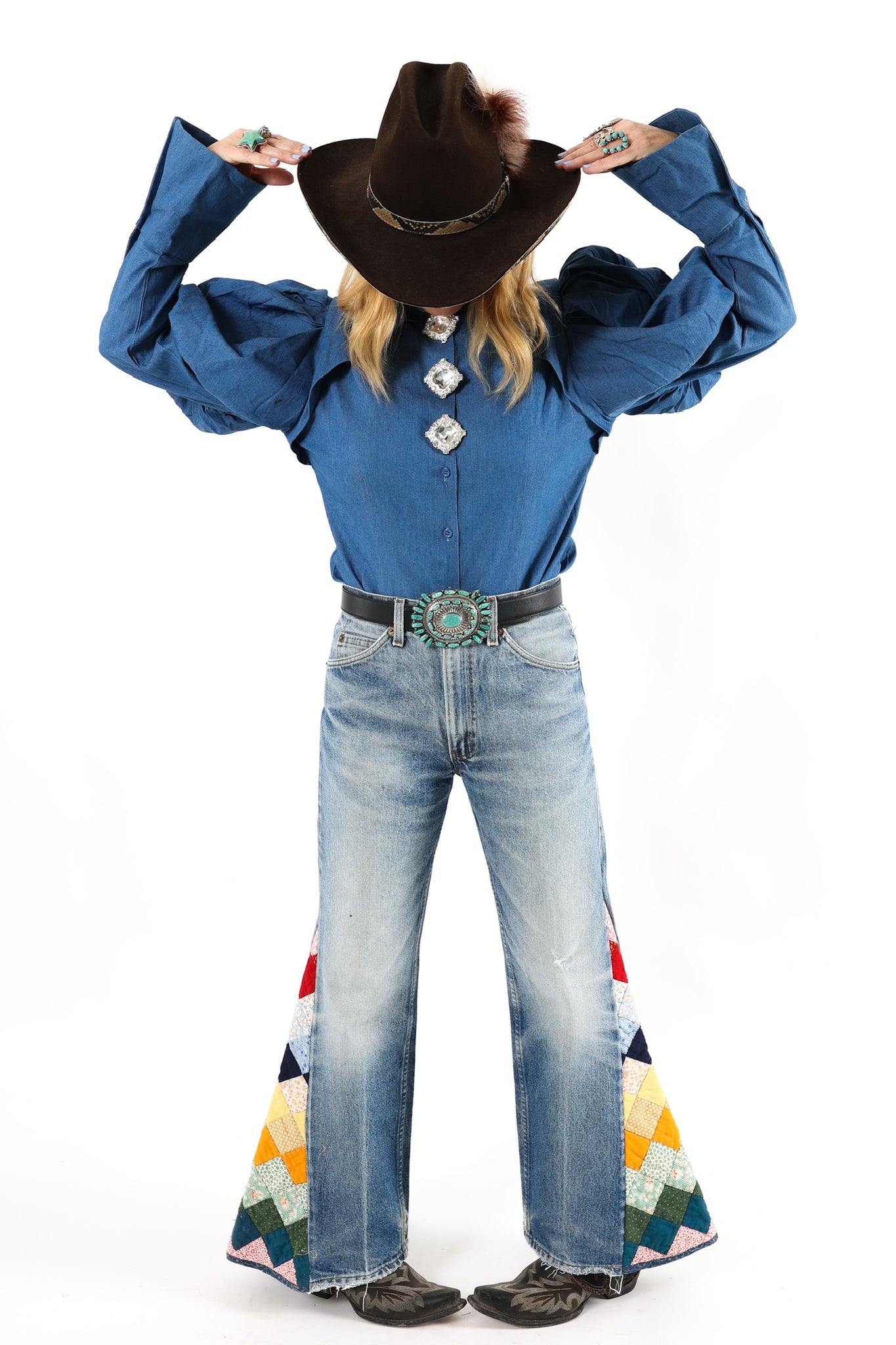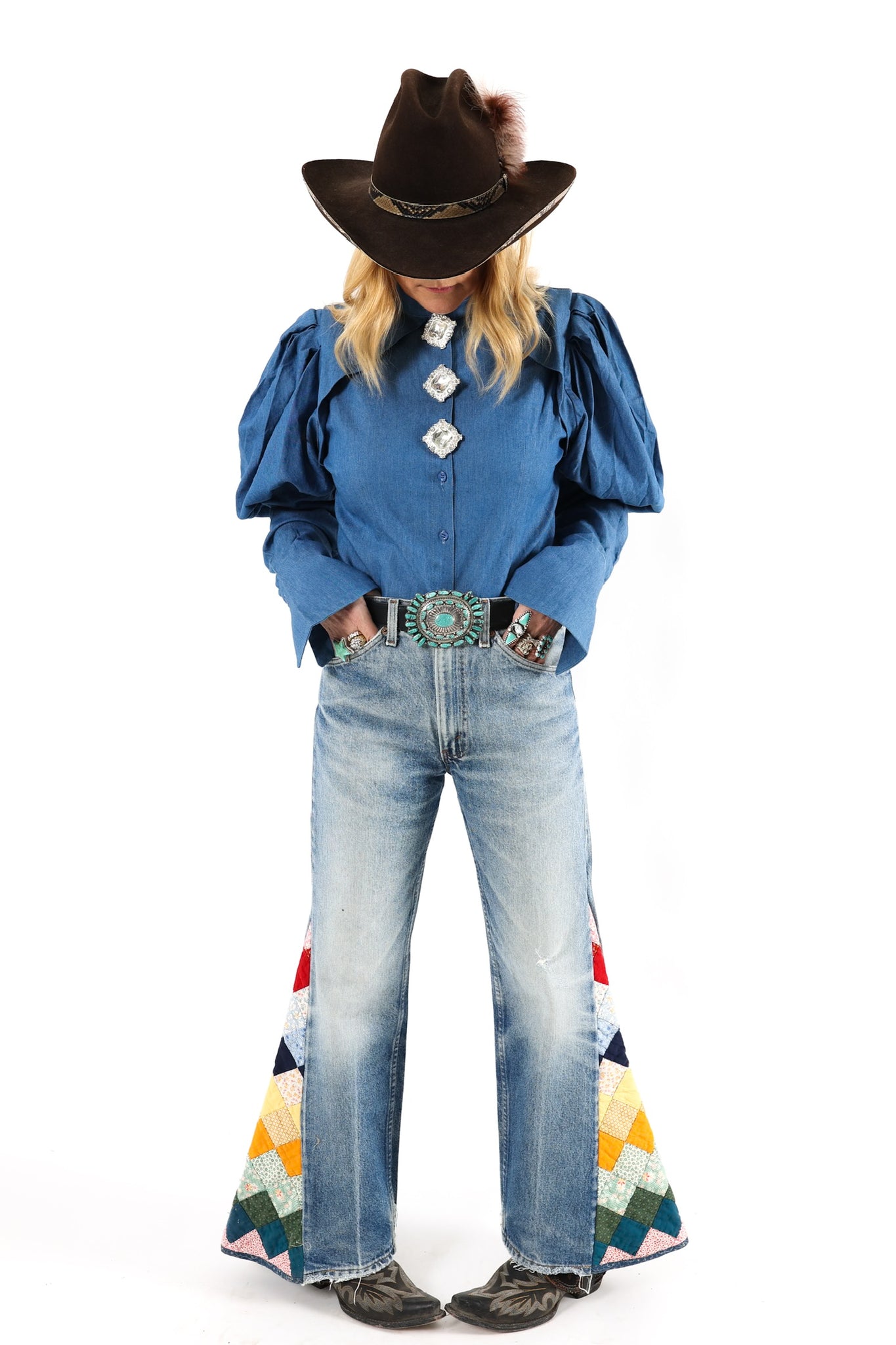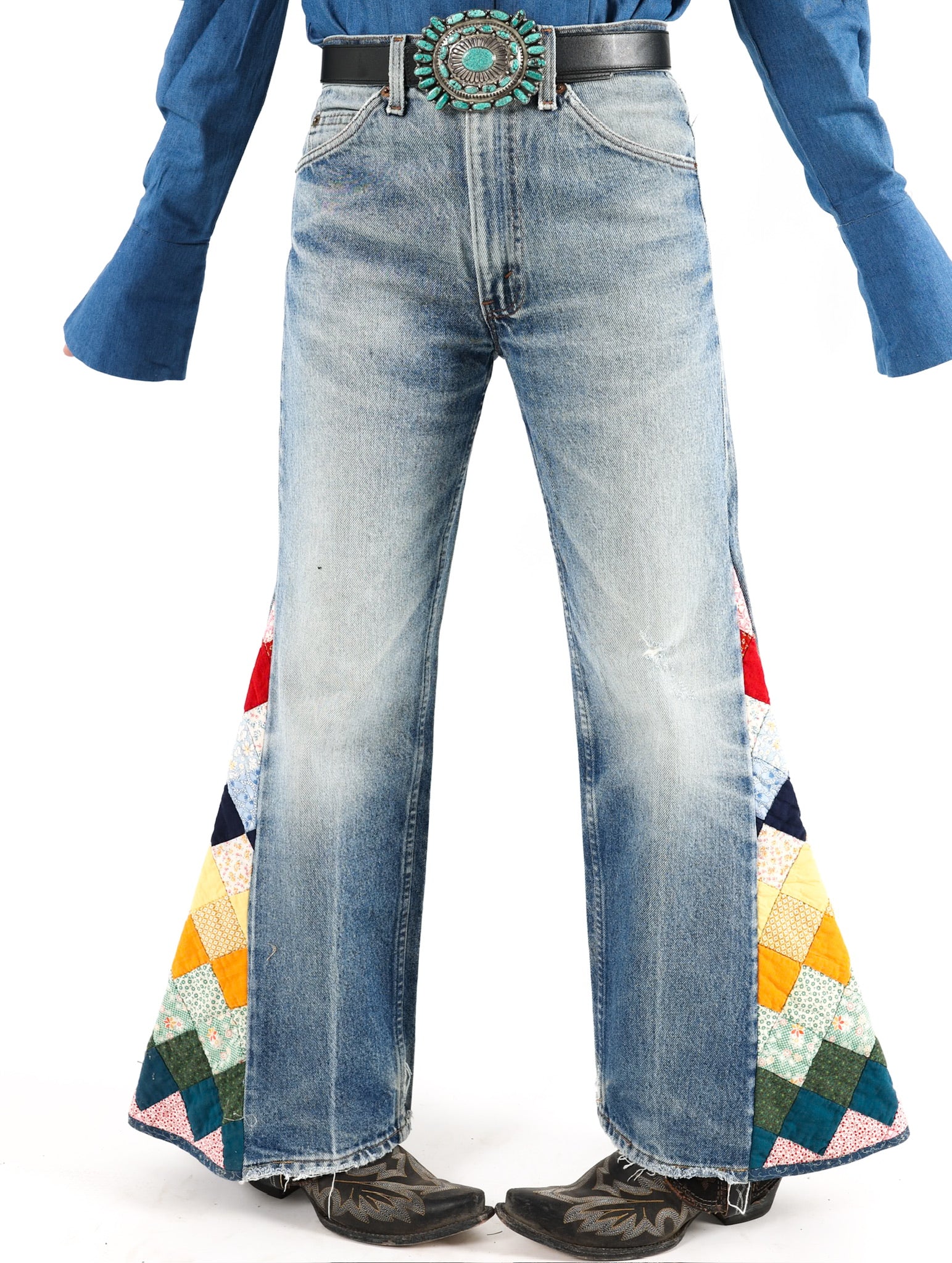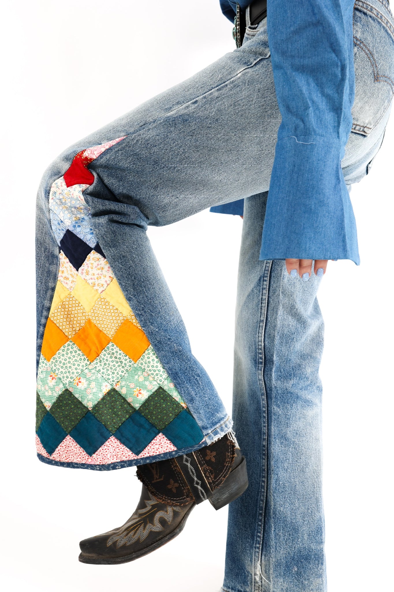 Our Maggie Bell Bottoms are a combination of distressed vintage jeans and an antique American quilt. The quilt is a traditional Trip Around the World quilt pattern. The quilt was made circa 1930s and is beautifully hand quilted. These jeans are very old, very rare, highly distressed, just the way we like them. Please take note of the hole on the backside, we have a photograph of this for your convenience. They are very collectible orange tag Levis. Since they are very distressed, the size tag is no longer in the jeans, so PLEASE read the measurements below for best fit!!!