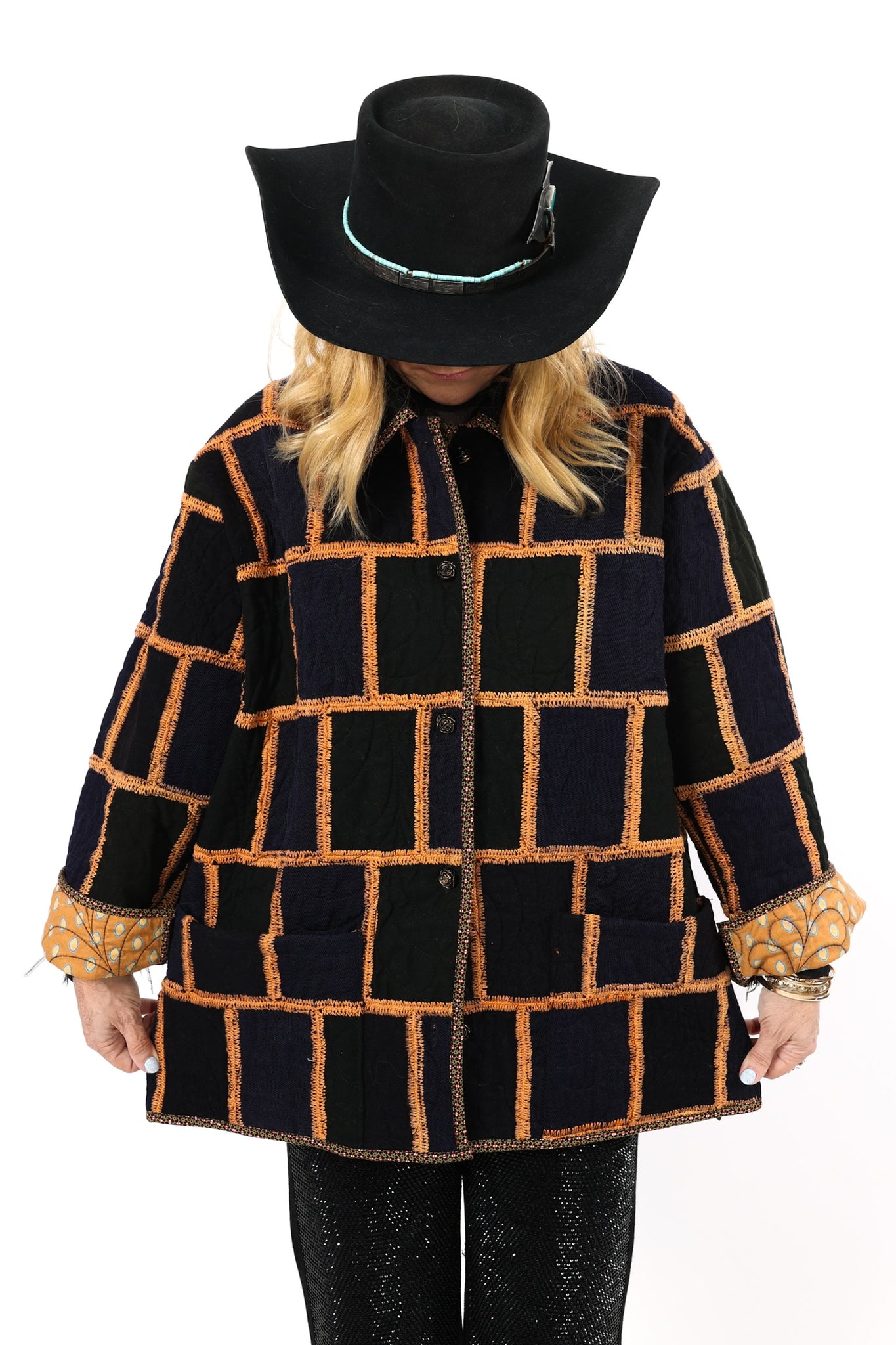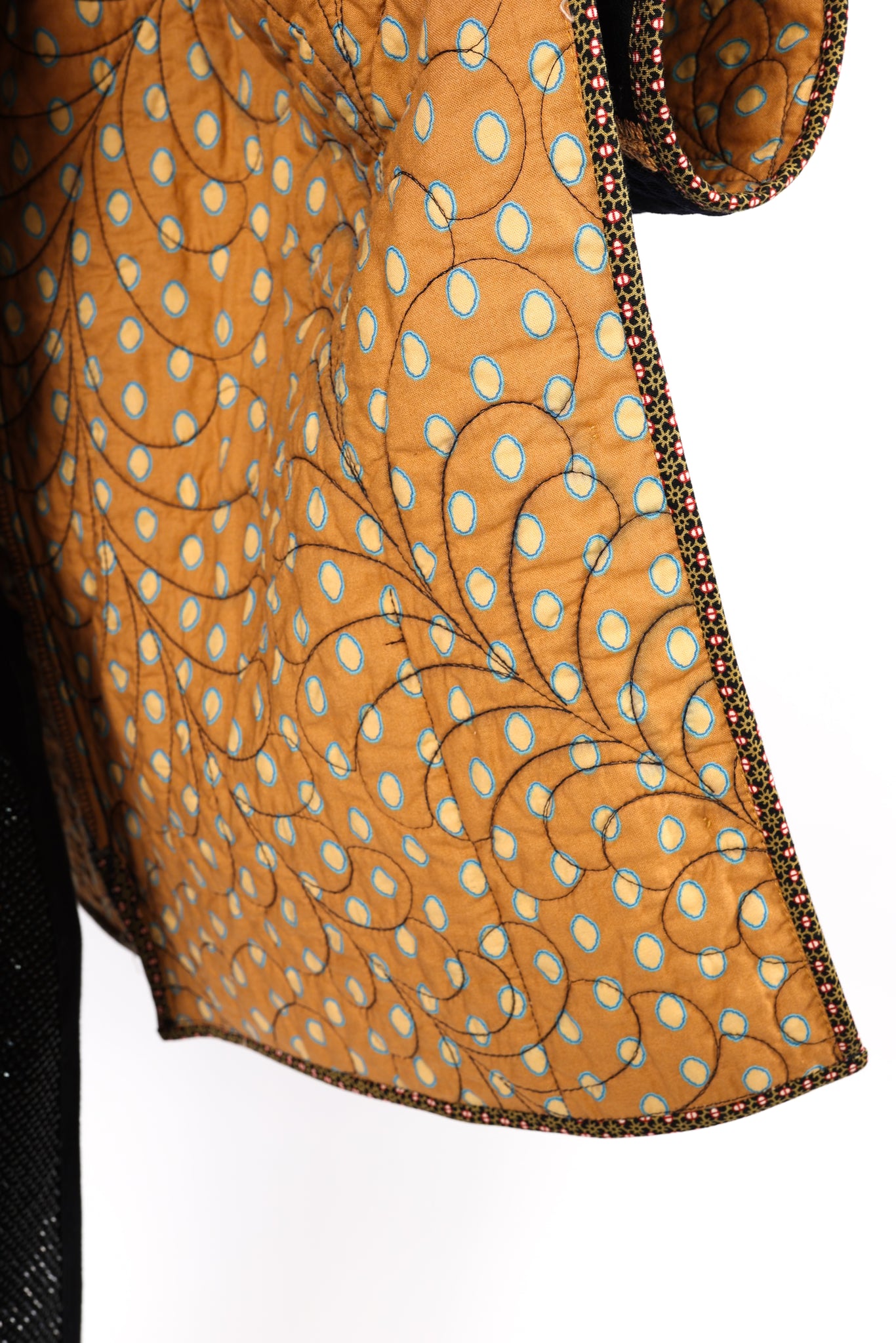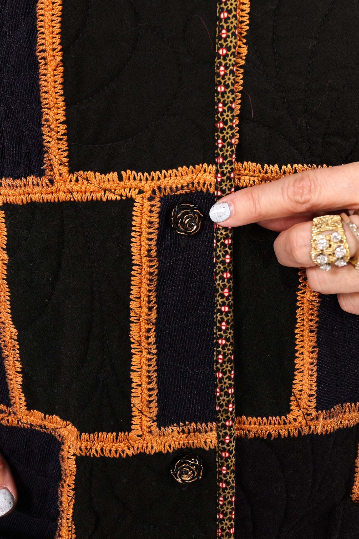 This is an American antique quilt top made circa 1920s to 1930s. It is a traditional scrappy or crazy quilt. The top is overflowing with dense embroidery stitches. It contains many wool cotton and felt fabrics. To complete the quilt we backed the top with a coordinating cotton fabric. In our opinion, the jacket is thin, has a little weight due to the wool, has a great drape, and is very comfortable to wear. We used black and gold glass rosette buttons as closures. This jacket would be a great candidate for fur. If you would like to add a fur, please reach out after purchasing! Please note, there are a few zig zag mends that blend into the quilt. Please note, this is a size MEDIUM. Please read the size measurements below. If you have any questions please direct message us and we are happy to bore you with many more details.