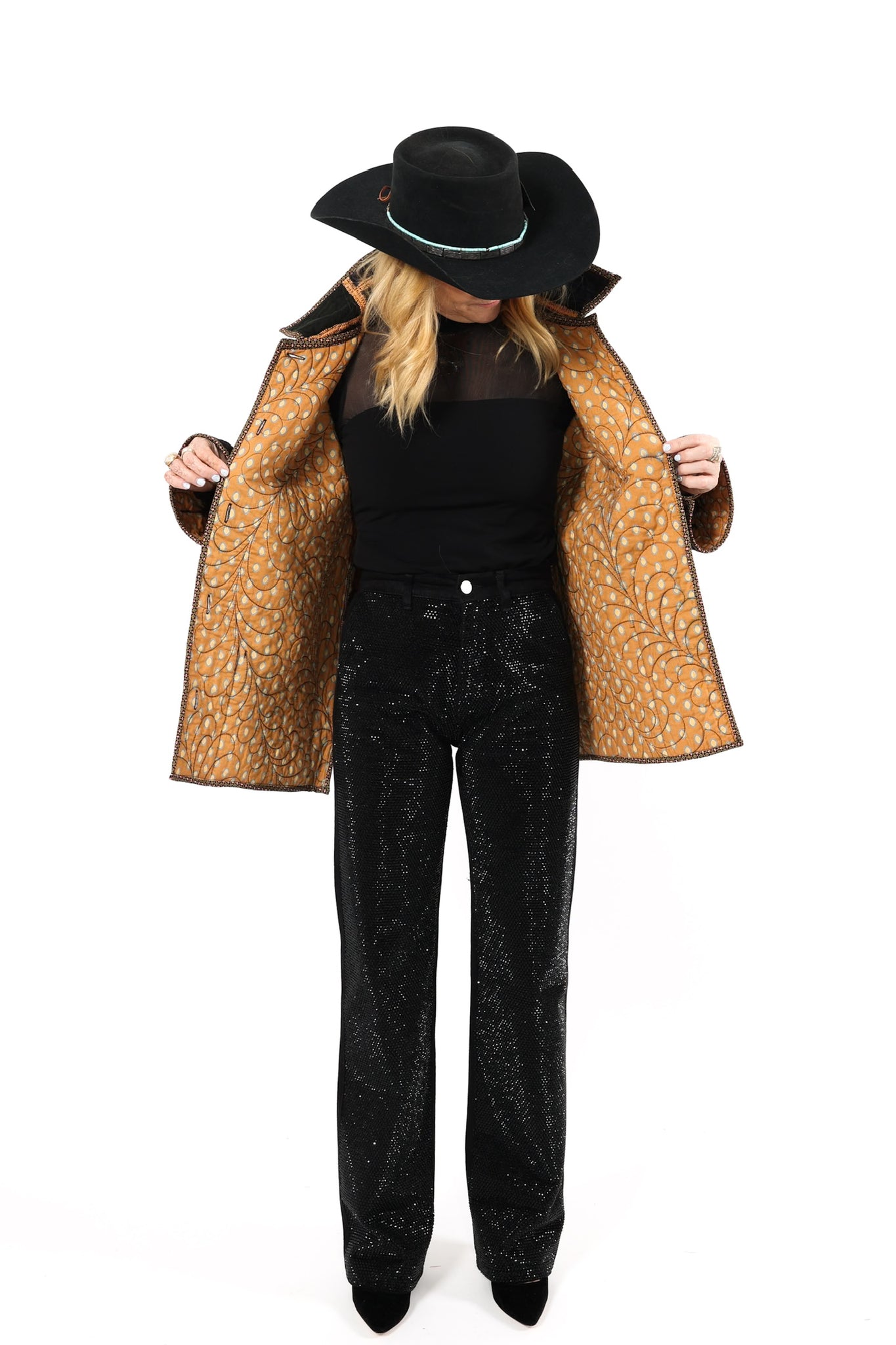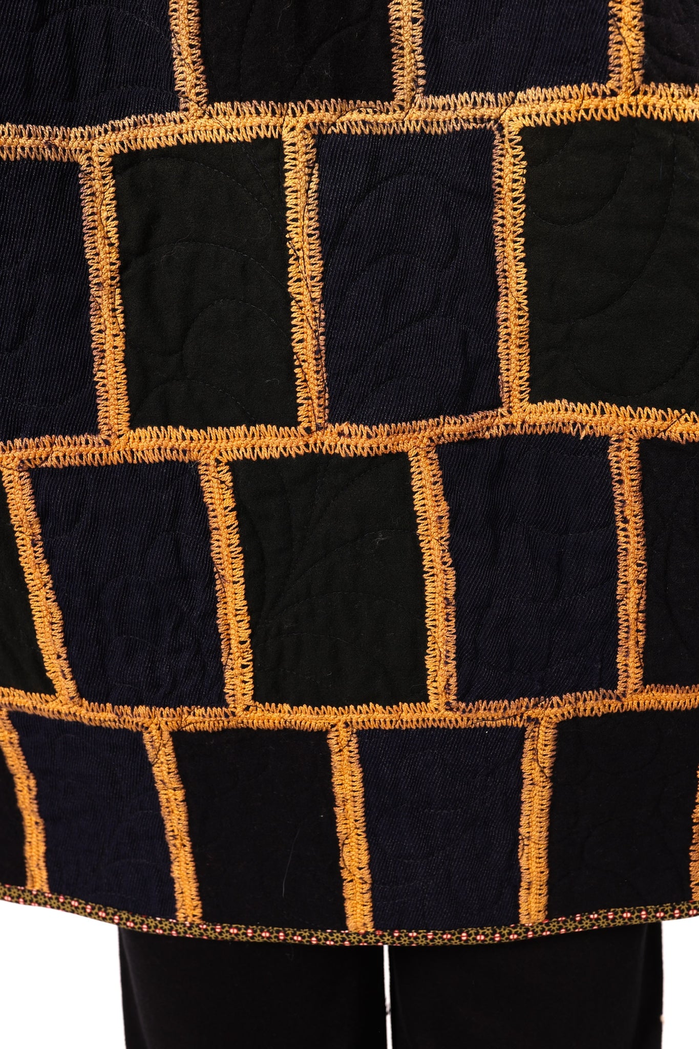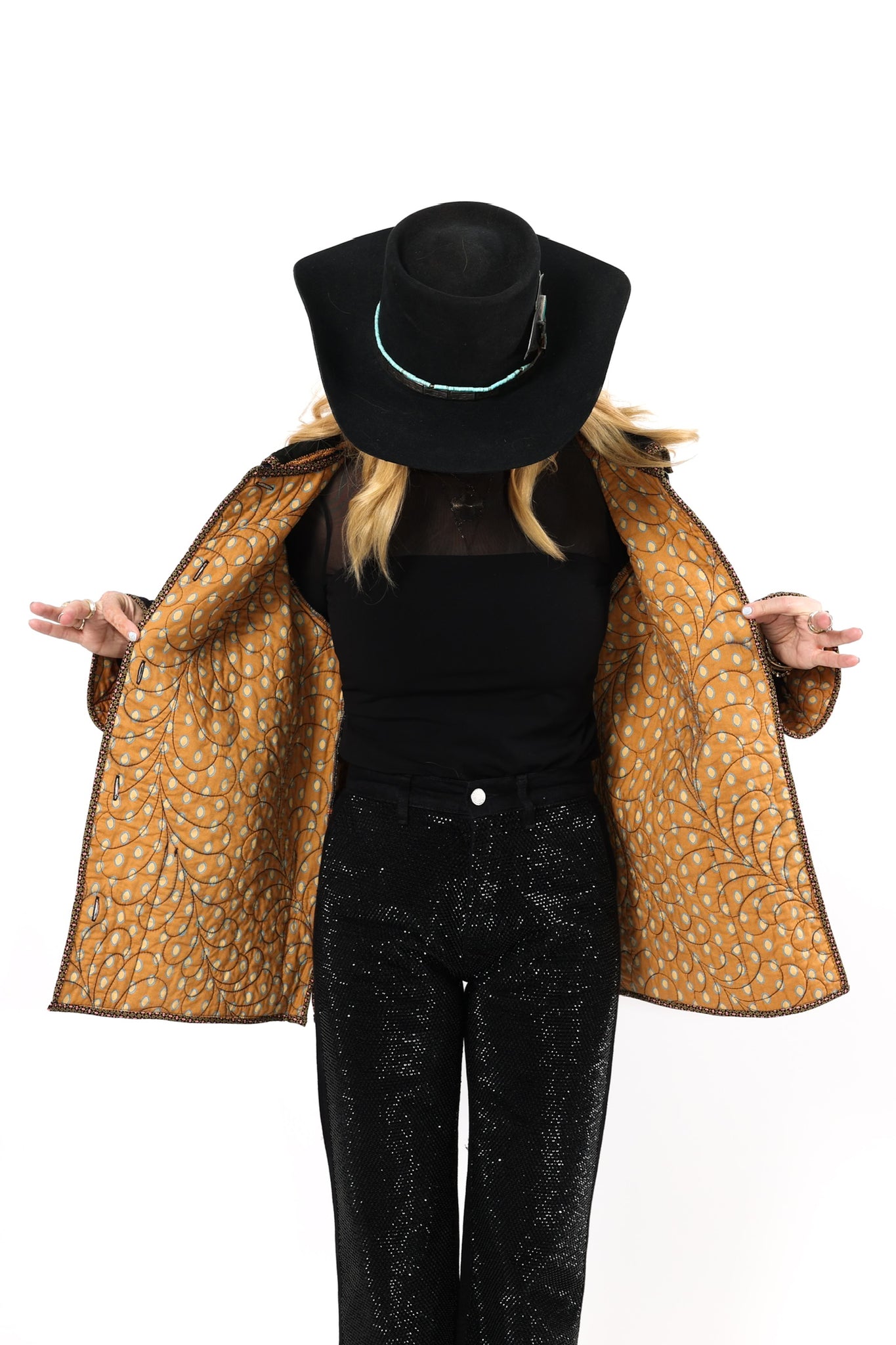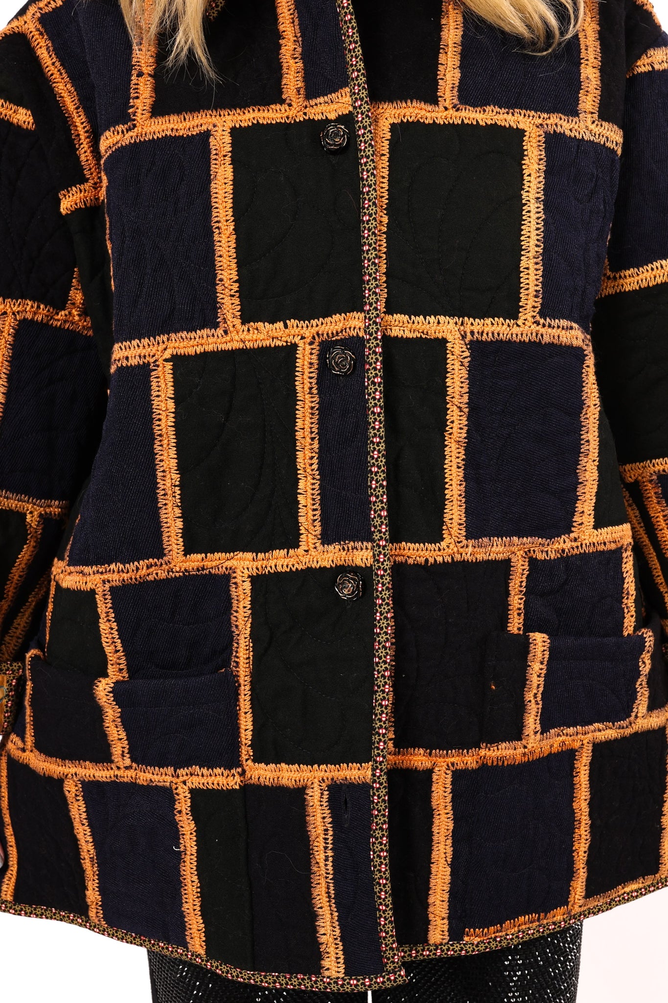 This is an American antique quilt top made circa 1920s to 1930s. It is a traditional scrappy or crazy quilt. The top is overflowing with dense embroidery stitches. It contains many wool cotton and felt fabrics. To complete the quilt we backed the top with a coordinating cotton fabric. In our opinion, the jacket is thin, has a little weight due to the wool, has a great drape, and is very comfortable to wear. We used black and gold glass rosette buttons as closures. This jacket would be a great candidate for fur. If you would like to add a fur, please reach out after purchasing! Please note, there are a few zig zag mends that blend into the quilt. Please note, this is a size MEDIUM. Please read the size measurements below. If you have any questions please direct message us and we are happy to bore you with many more details.