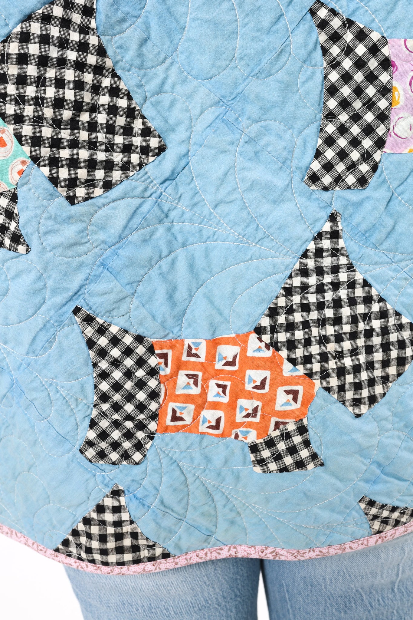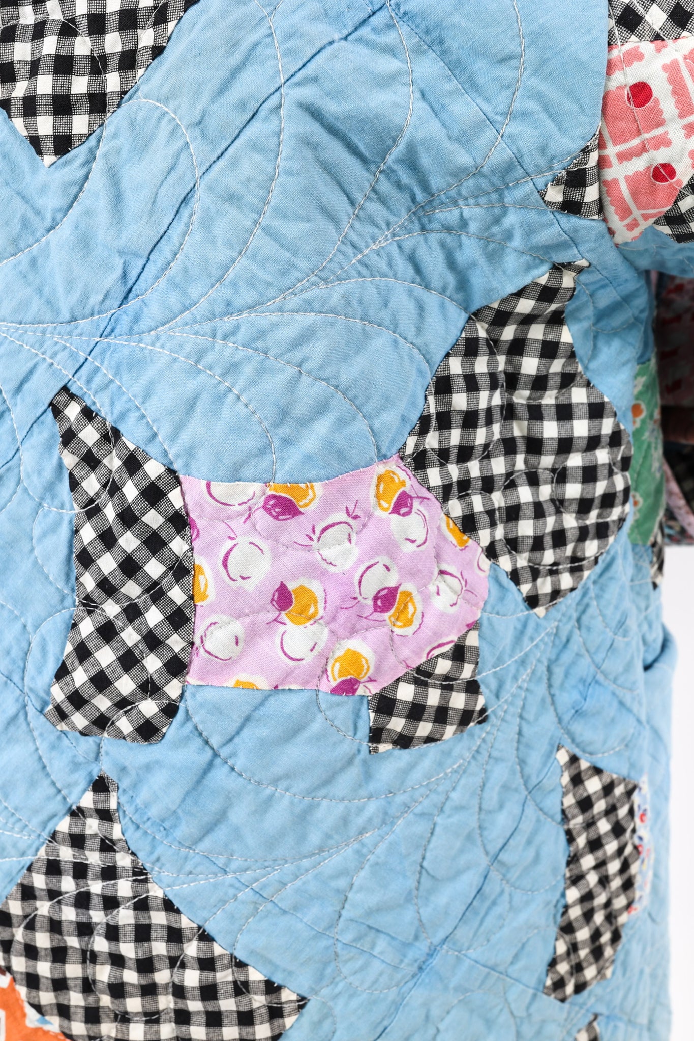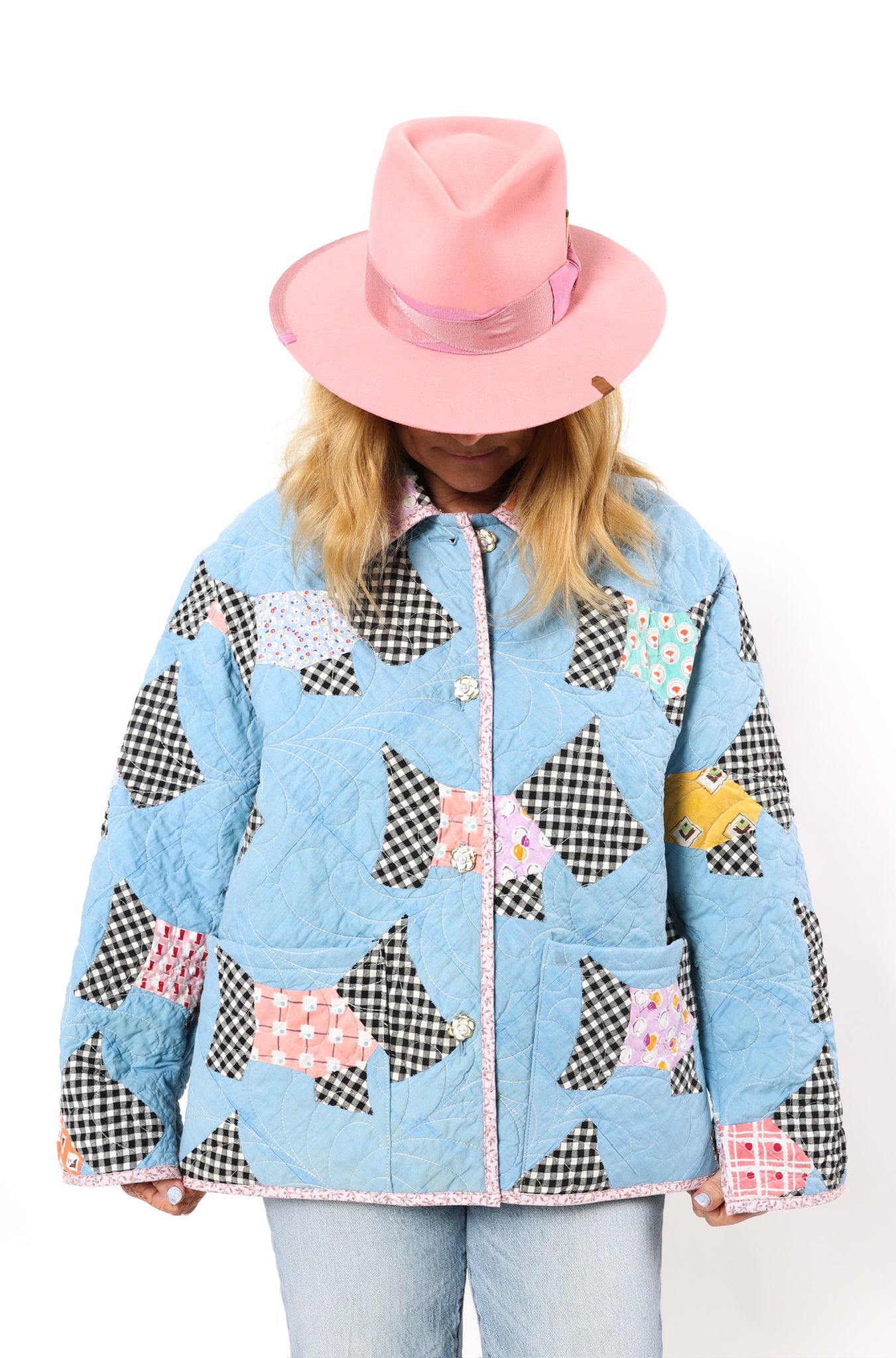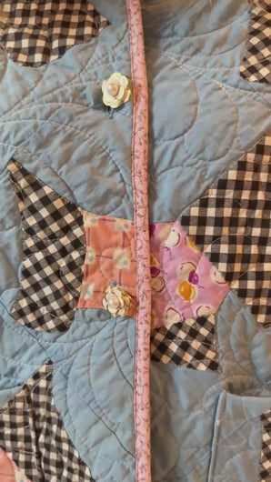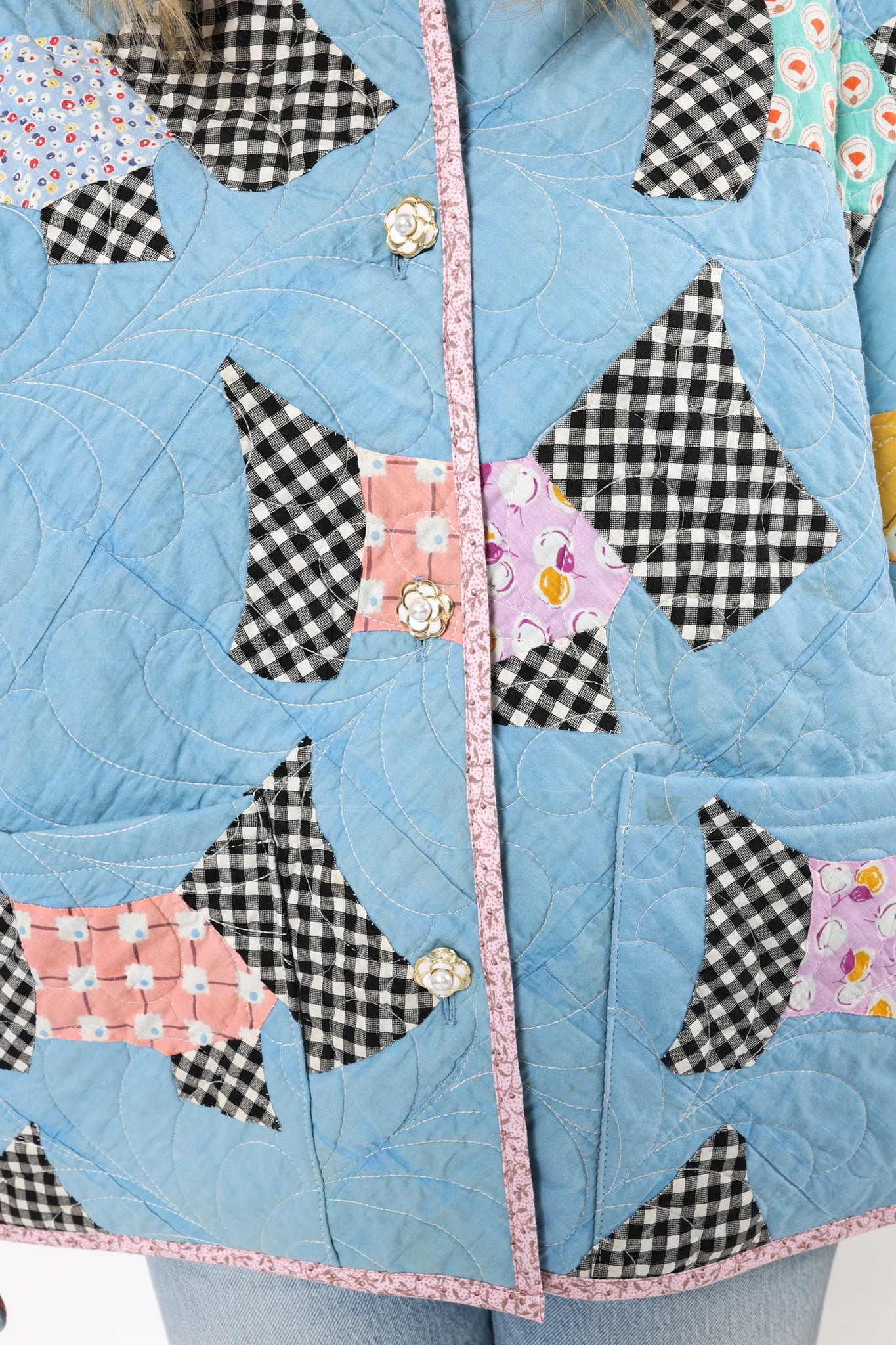 This is an antique American quilt top made circa 1930s to 1940s. It is an appliqued Scottie Dog quilt. The scottie dogs were hand pieced and hand appliqued. To give this orphaned quilt top a second life we backed it with coordinating 1930's reproduction fabric. You will want to cuff the sleeves to show this fabric off! Zoe Dawn Zoe Dawn quilted this beauty on her long arm. In our opinion, this jacket is soft, thin, lightweight with little loft(puffiness), and drapes well. We used gold and pearl enamel floral buttons as closures. Please note, this is a size MEDIUM. Please read the size measurements below. If you have any questions please direct message us and we are happy to bore you with many more details.