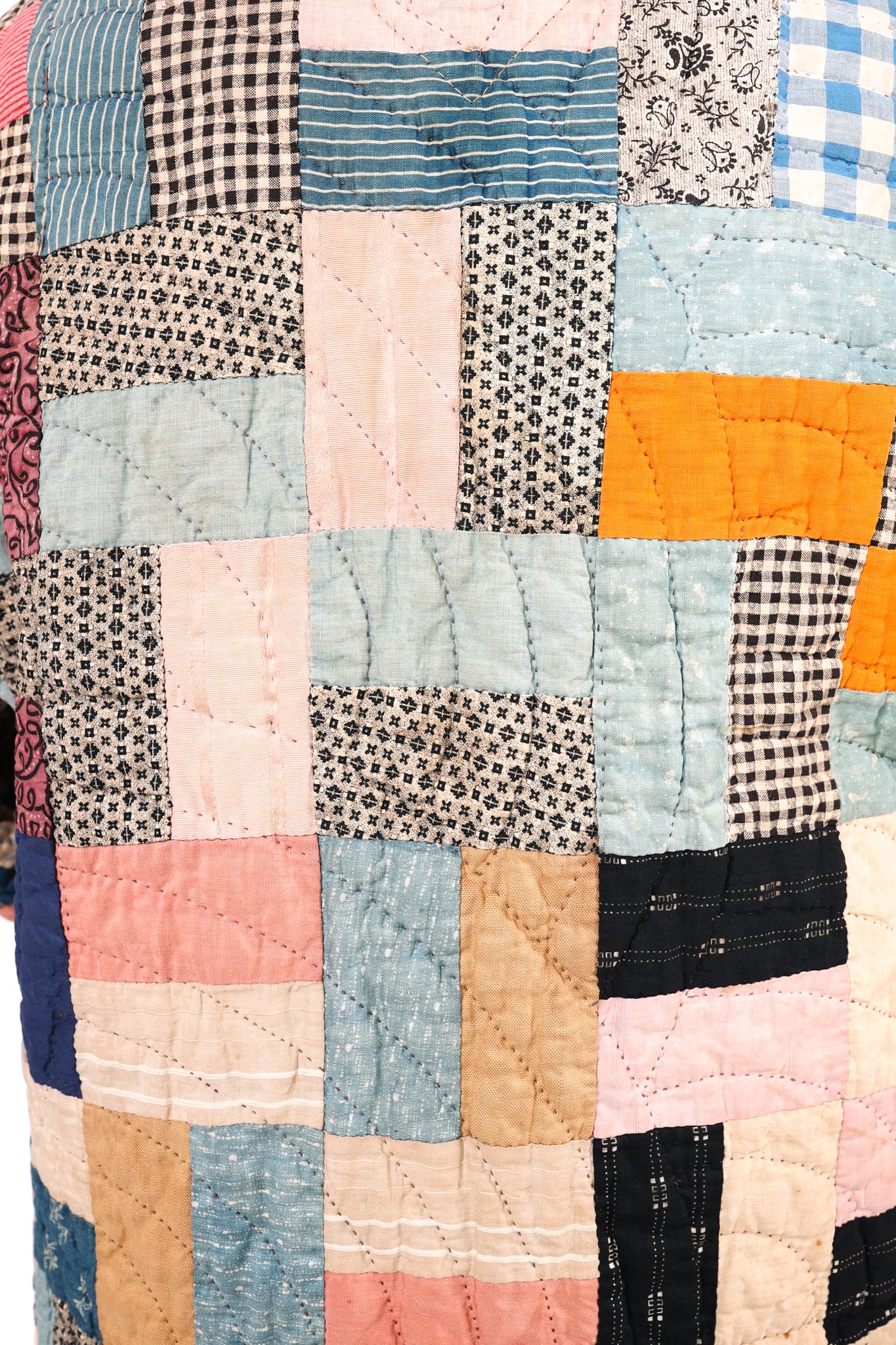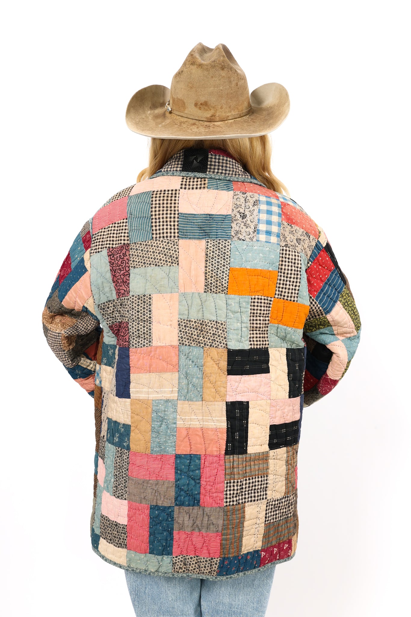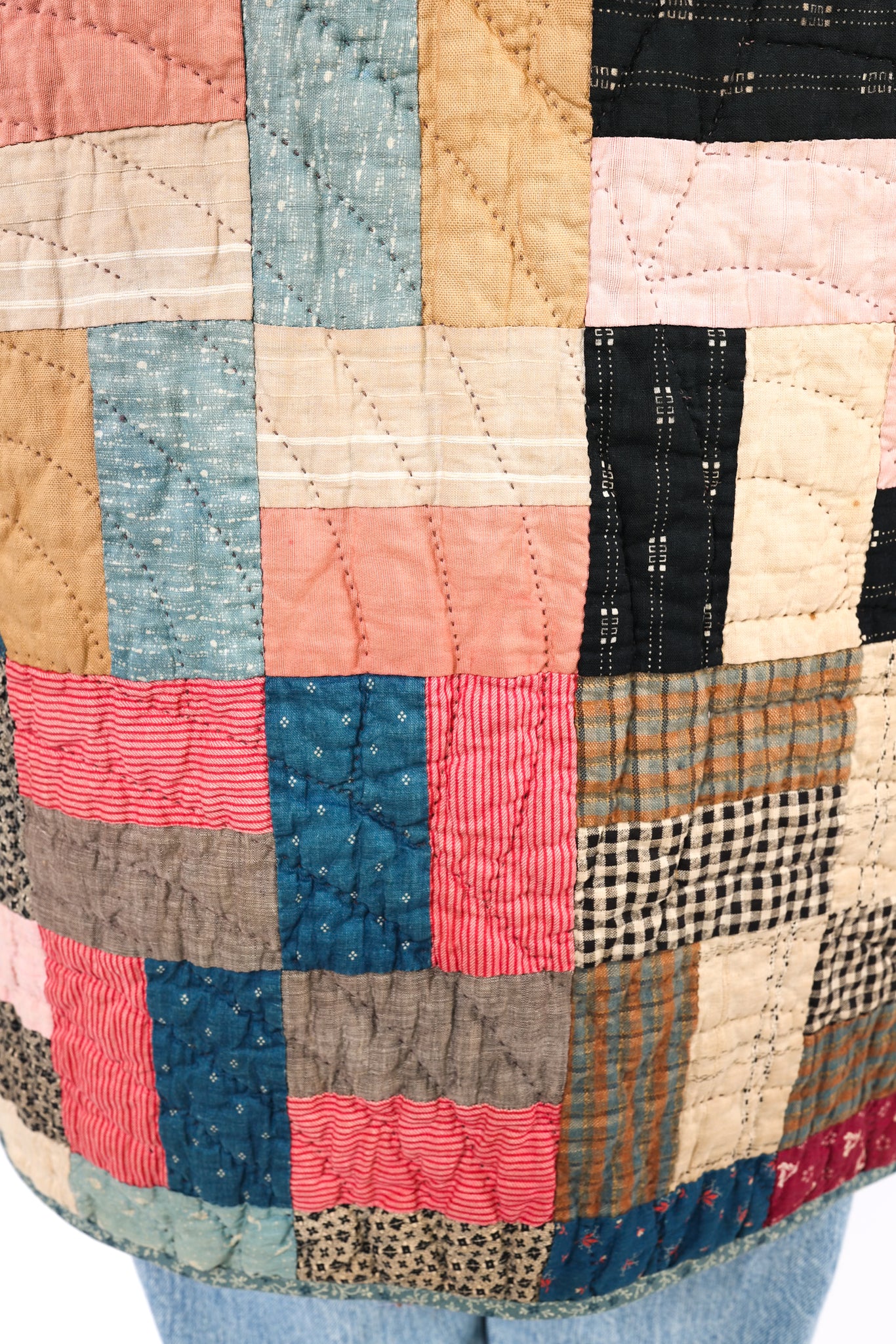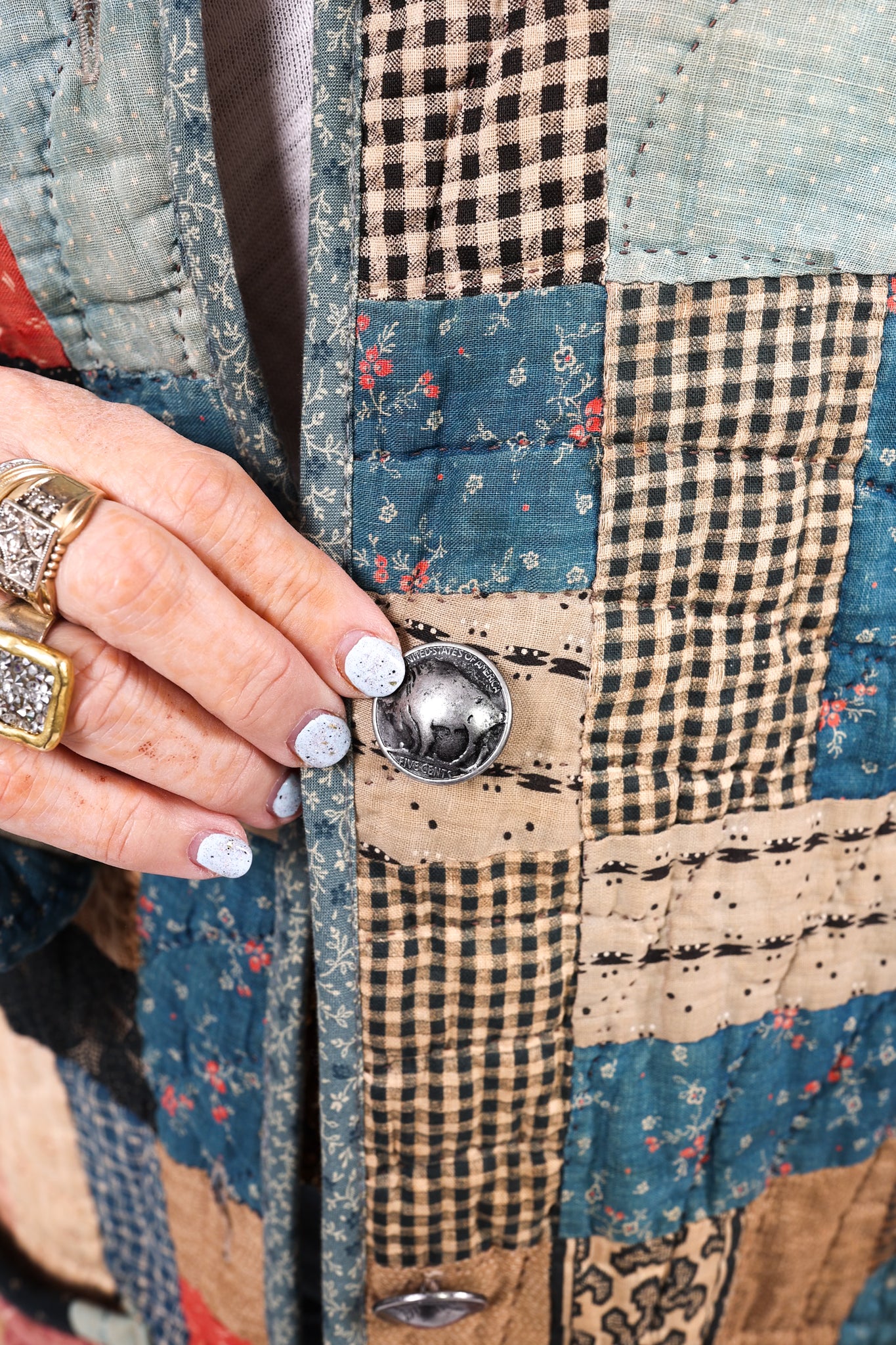 This is an antique American quilt made circa 1860s to 1890s. It is a traditional Endless Stairs quilt pattern. The quilt has been beautifully hand quilted and hand sewn. This piece fits into the scrappy genre and features fabrics from many other sewing projects. The most fascinating fabric is the backing fabric(inside of jacket). The maker used an old feedsack that clearly reads "Walhalla Cottons Mills Sheeting LL". This piece most likely was made around South Carolina, where this mill was located. This is a slice of American history and this is the kind of quilt Ralph Lauren imitated in the 80s. In our opinion, the quilt is thin, lightweight, soft, and has a little loft(puffiness). We used faux silver buffalo nickel buttons as closures. This is a true a true piece of American Folk Art. Overall, this quilt is in great condition for its age! This is a size LARGE, please read size measurements below. This piece fits a range of sizes depending on how you like to style your jackets. Please note, there are a few zig zag mends and faint age spots. If you have any questions please direct message us and we are happy to bore you with many more details.