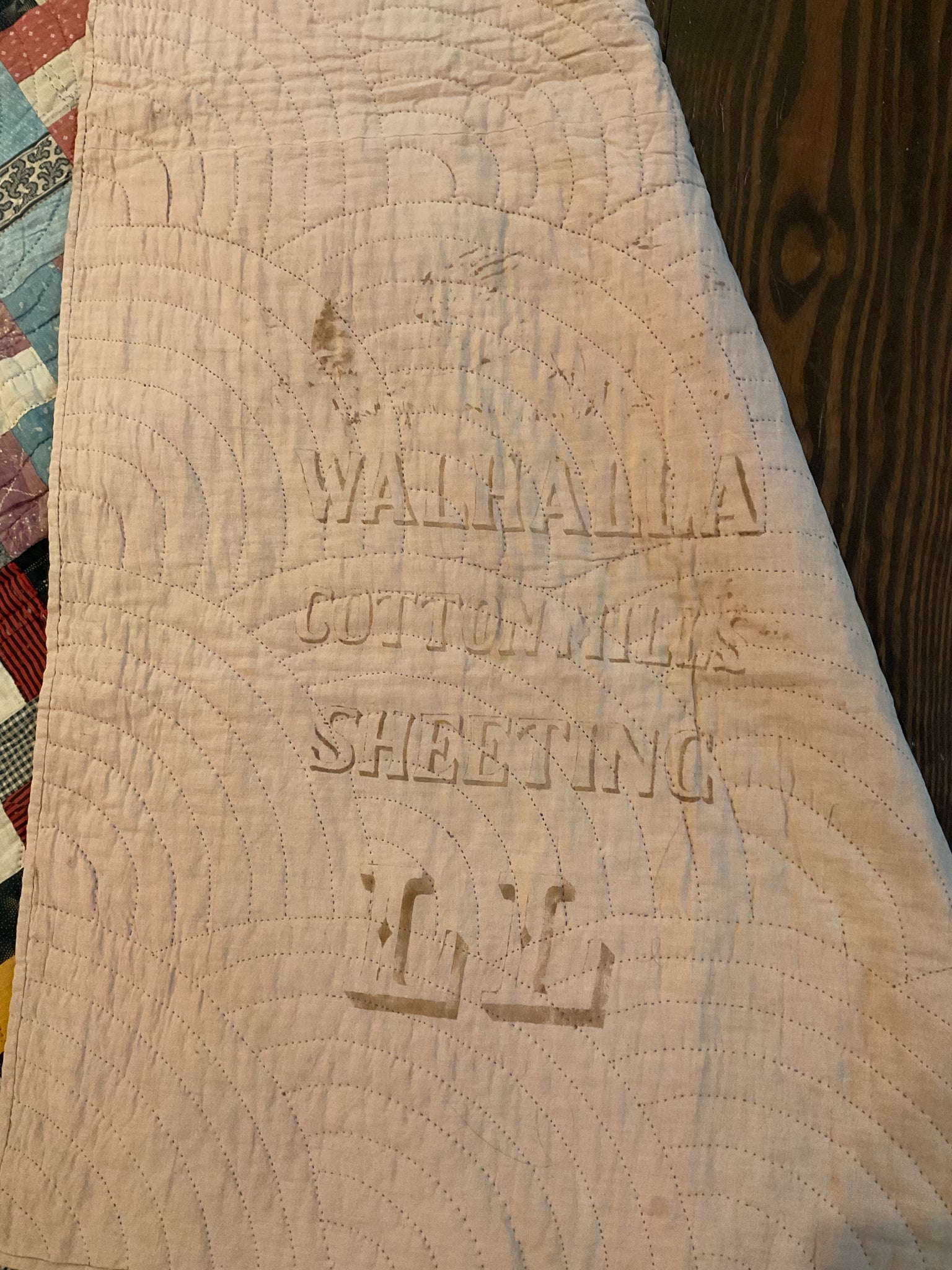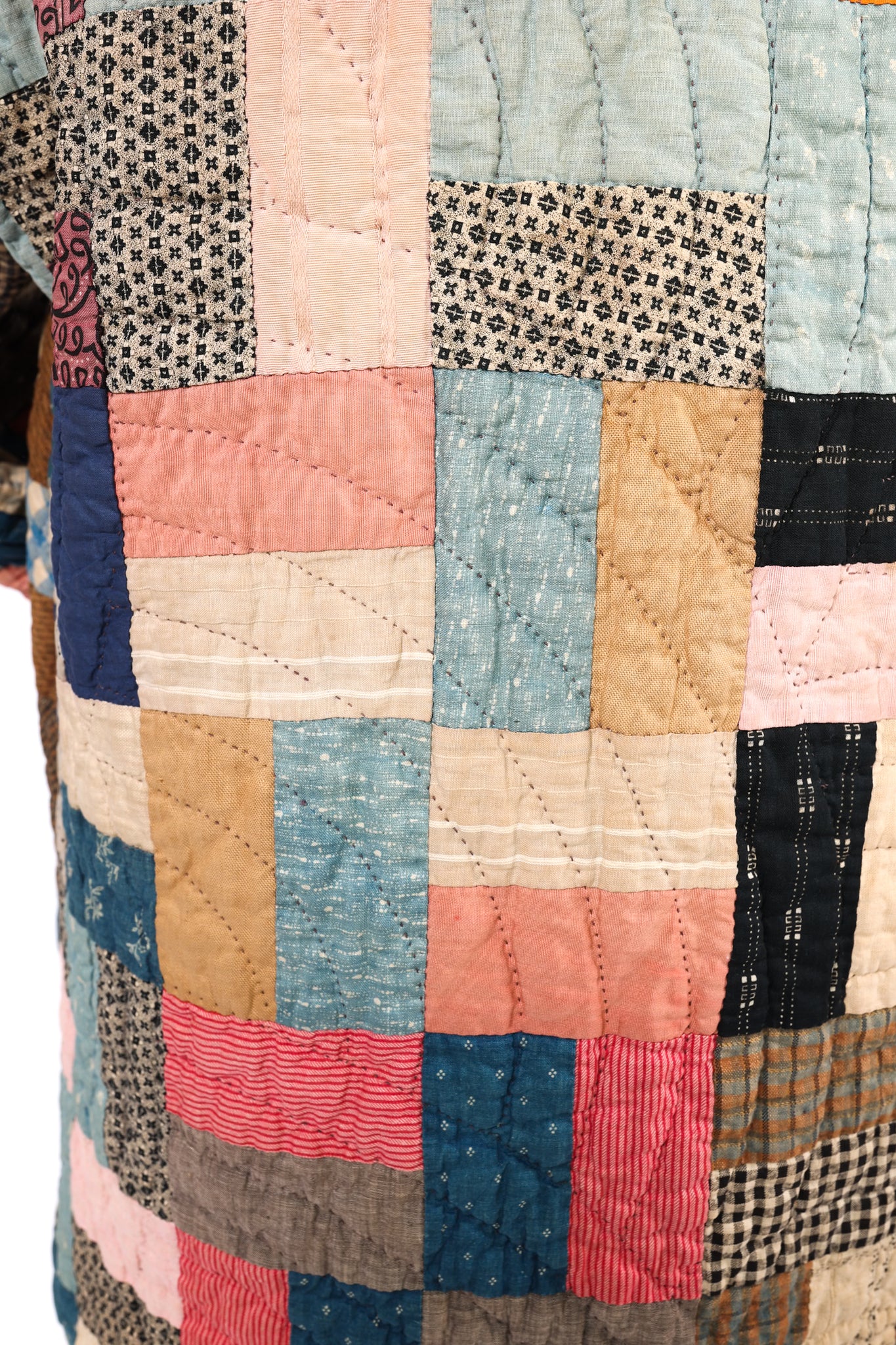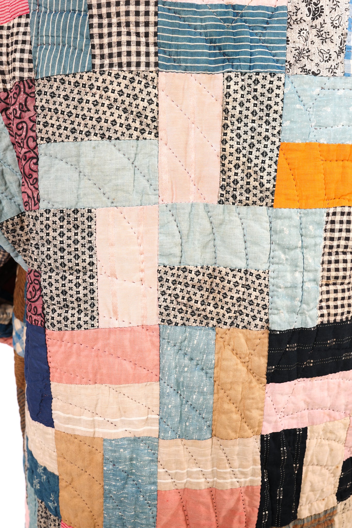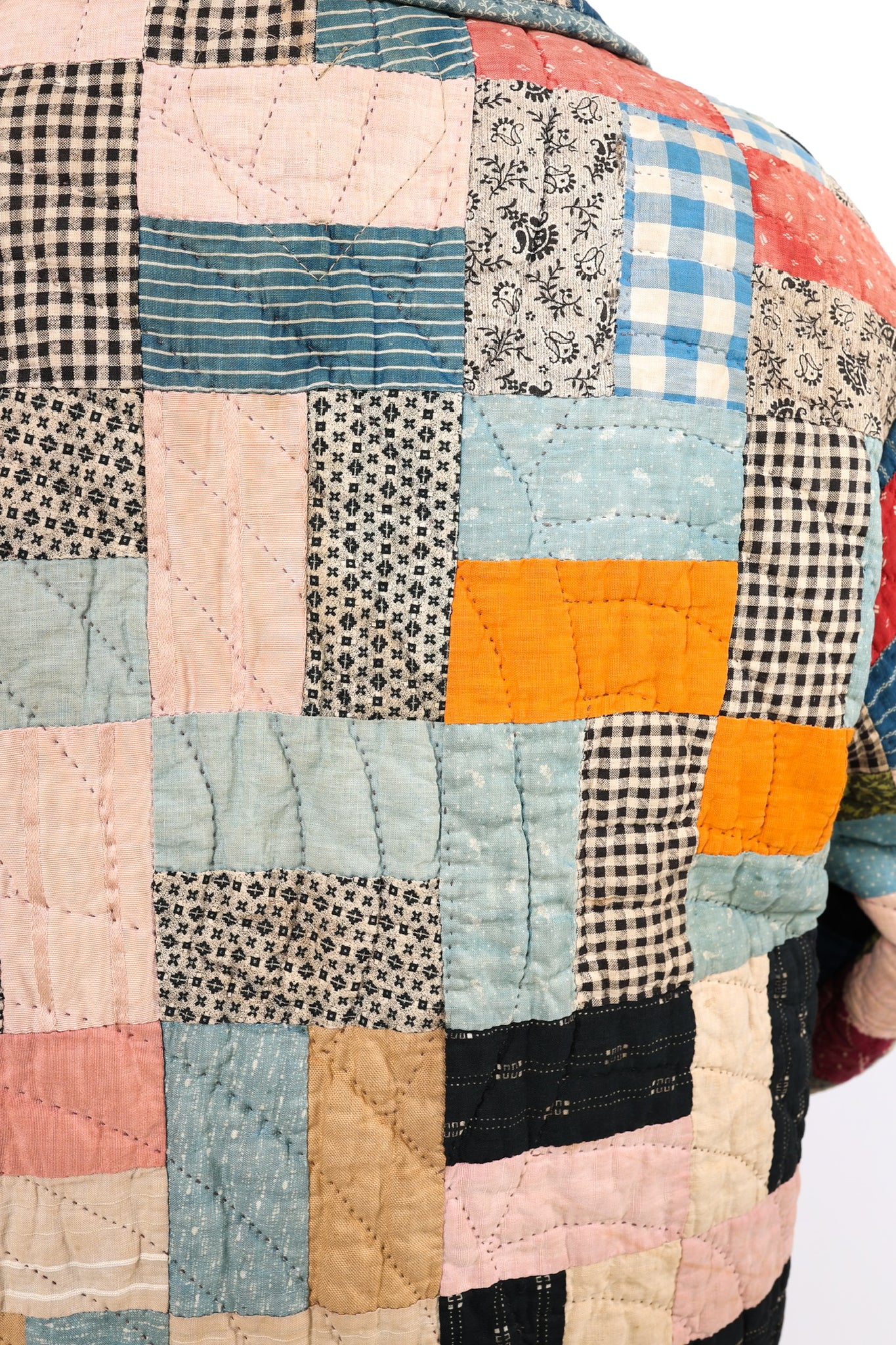 This is an antique American quilt made circa 1860s to 1890s. It is a traditional Endless Stairs quilt pattern. The quilt has been beautifully hand quilted and hand sewn. This piece fits into the scrappy genre and features fabrics from many other sewing projects. The most fascinating fabric is the backing fabric(inside of jacket). The maker used an old feedsack that clearly reads "Walhalla Cottons Mills Sheeting LL". This piece most likely was made around South Carolina, where this mill was located. This is a slice of American history and this is the kind of quilt Ralph Lauren imitated in the 80s. In our opinion, the quilt is thin, lightweight, soft, and has a little loft(puffiness). We used faux silver buffalo nickel buttons as closures. This is a true a true piece of American Folk Art. Overall, this quilt is in great condition for its age! This is a size LARGE, please read size measurements below. This piece fits a range of sizes depending on how you like to style your jackets. Please note, there are a few zig zag mends and faint age spots. If you have any questions please direct message us and we are happy to bore you with many more details.