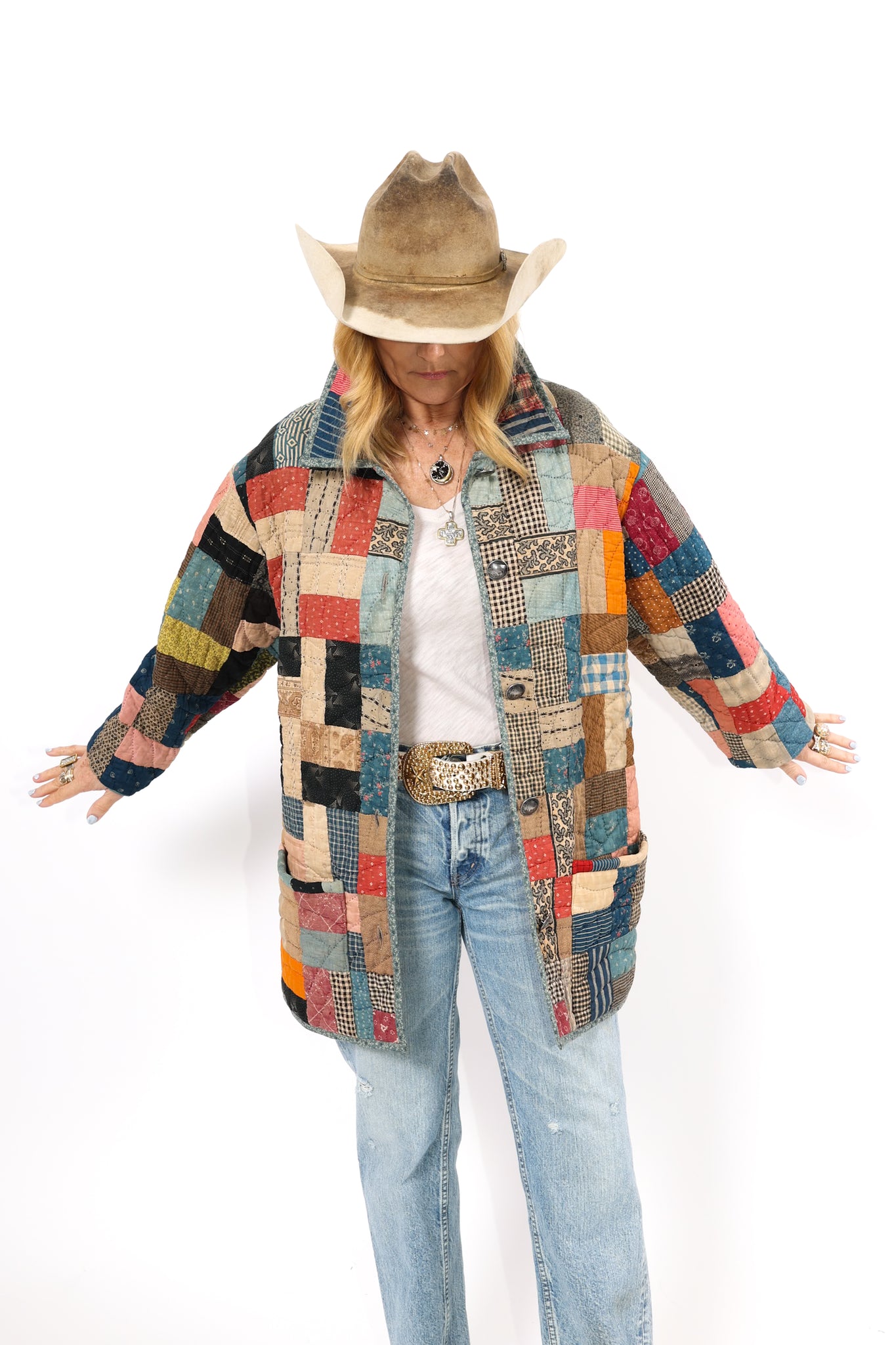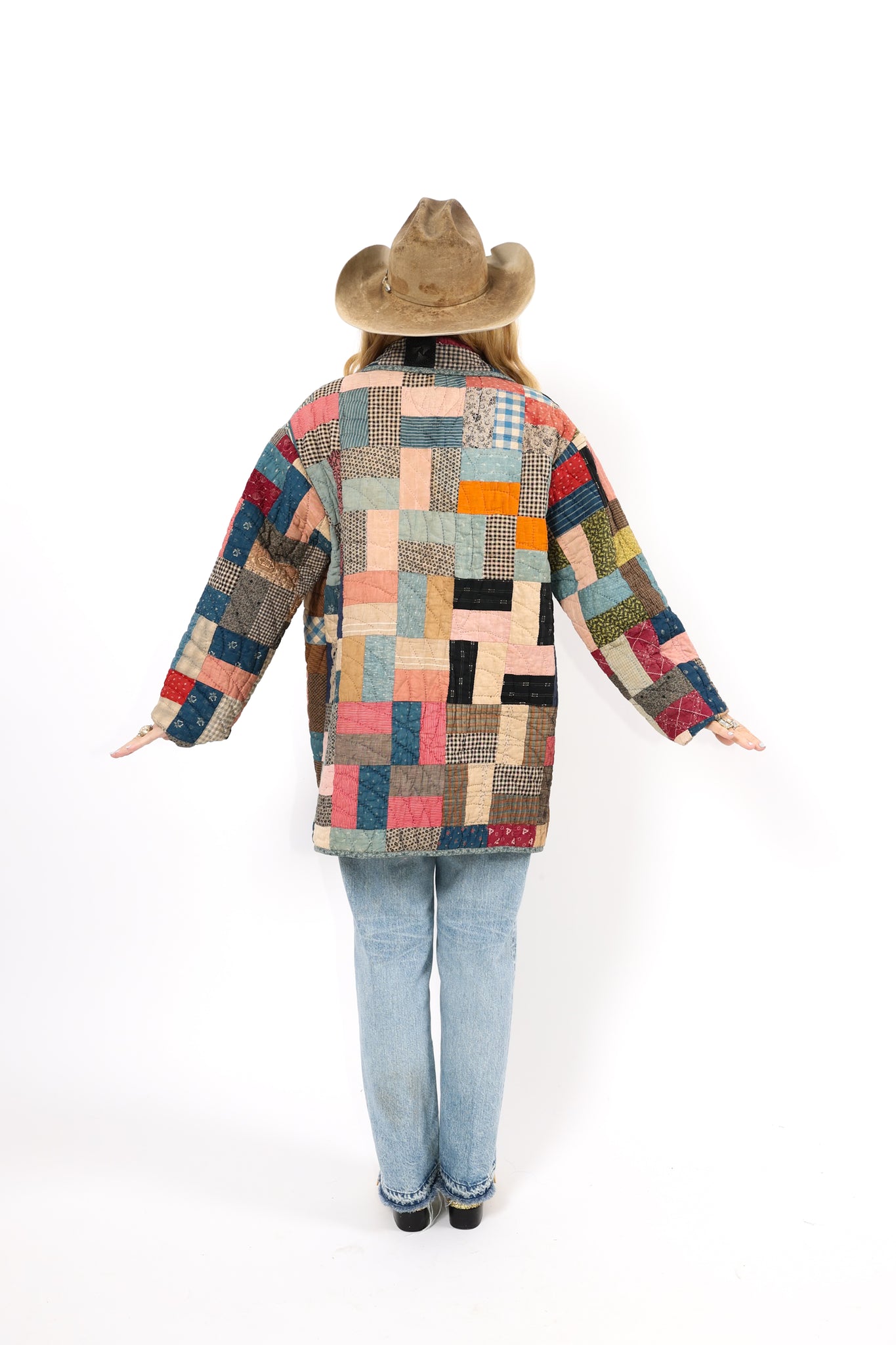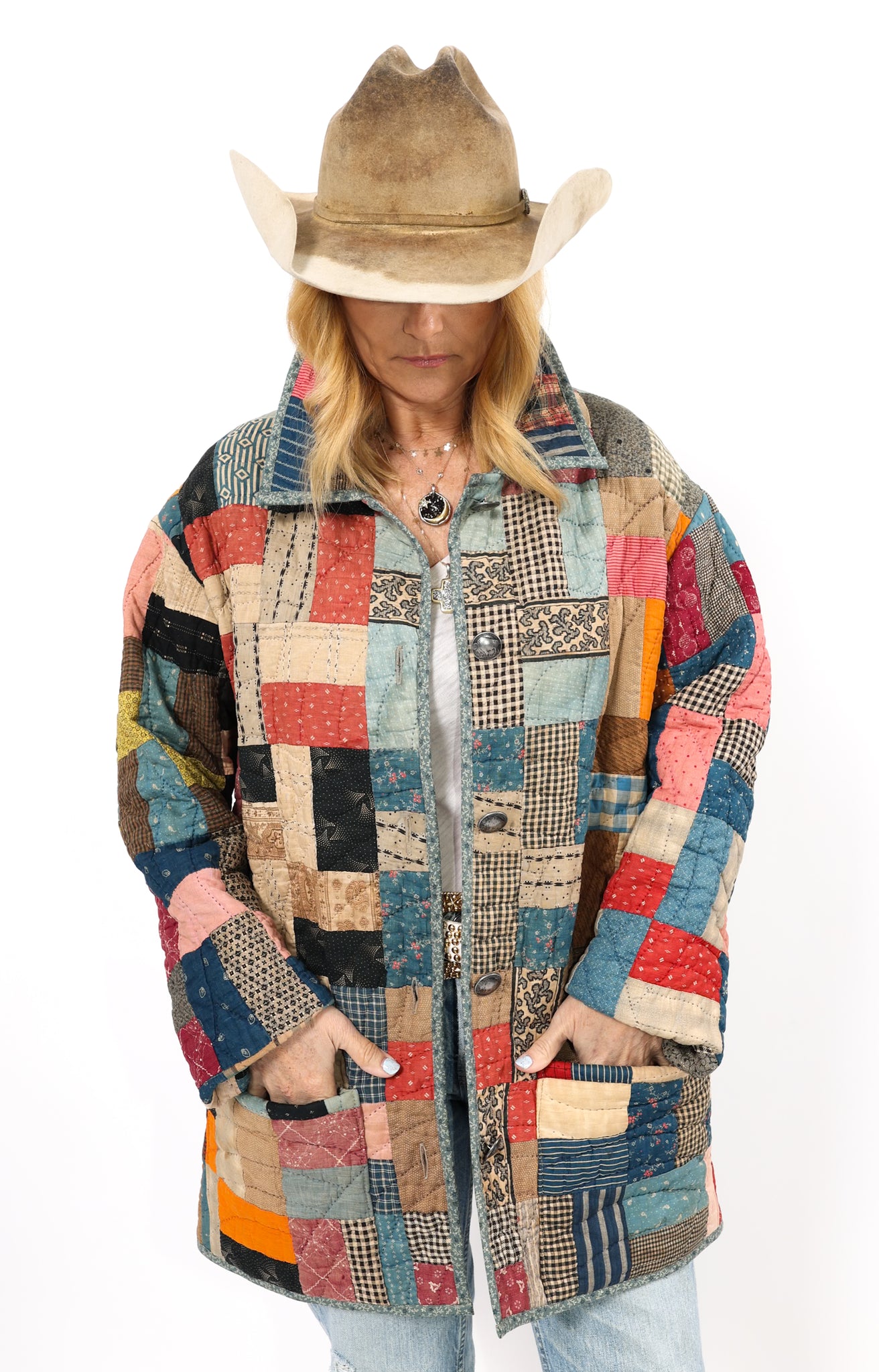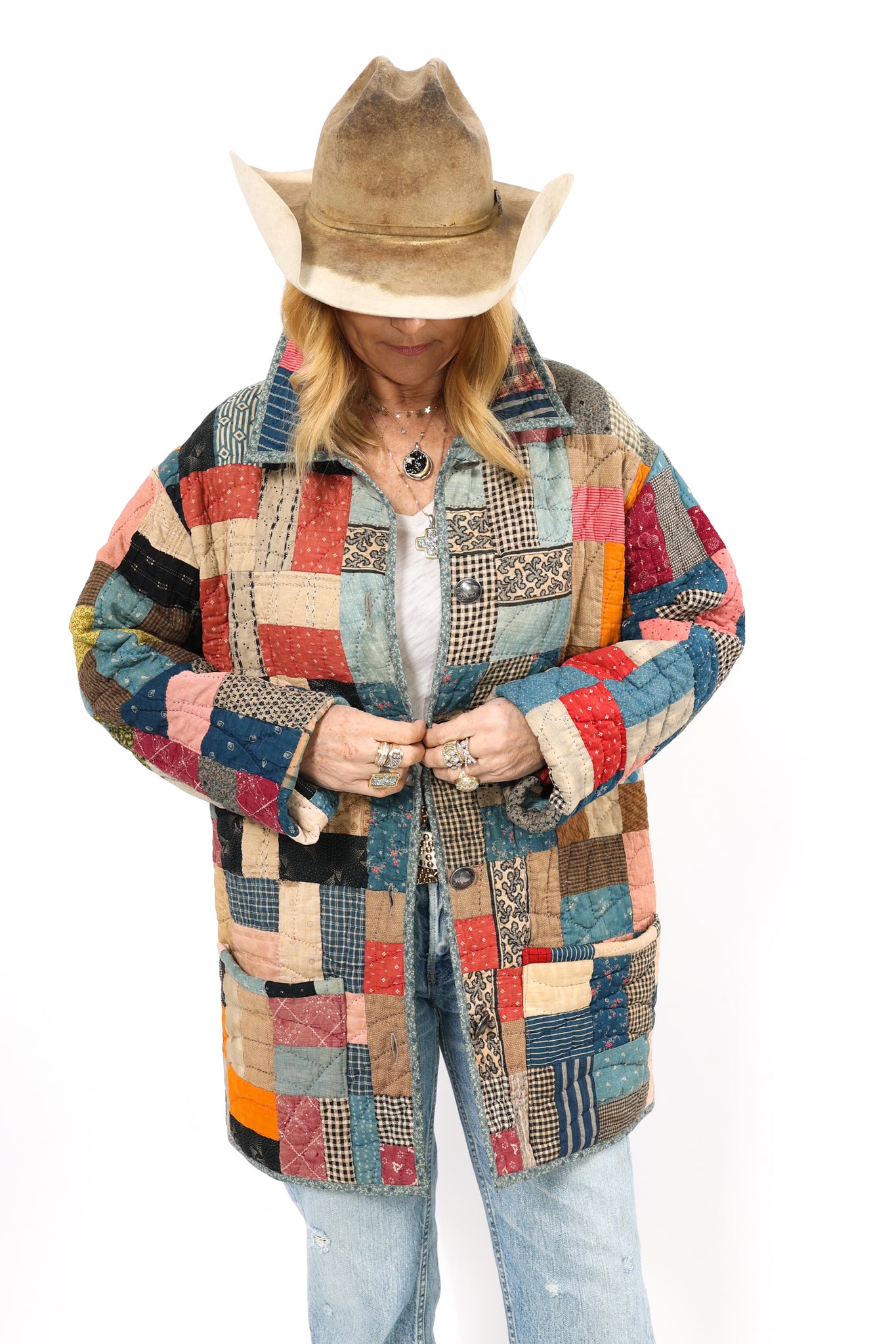 Please note that most of our jackets are made from antique quilts and the fabrics reflect this. Our fabrics are sometimes older than 100 years old and are perfectly worn. We believe this is what makes them special and is part of their charm. All of our garments are pre-washed in special restoration quilt wash. We recommend only spot cleaning if necessary.