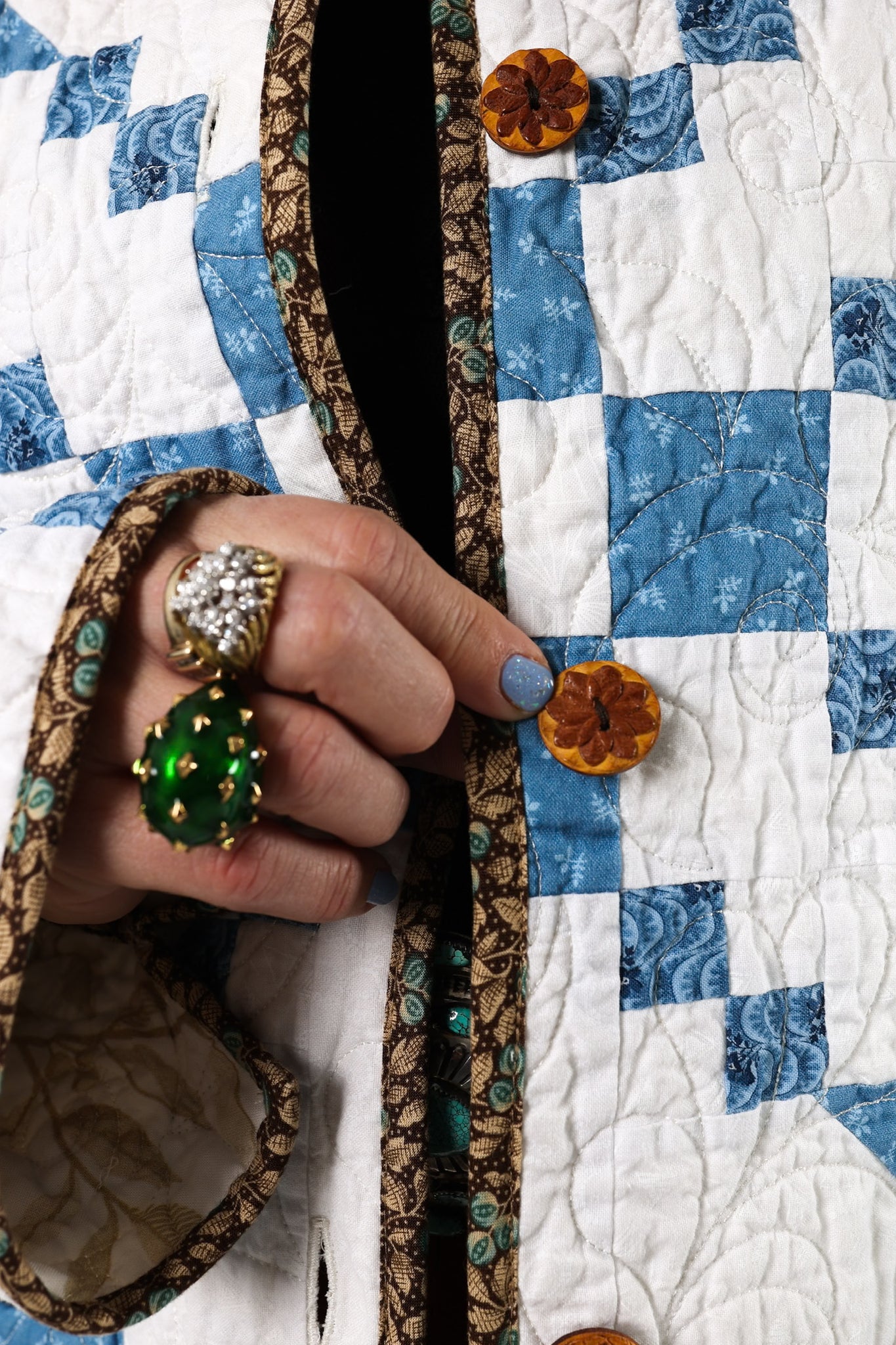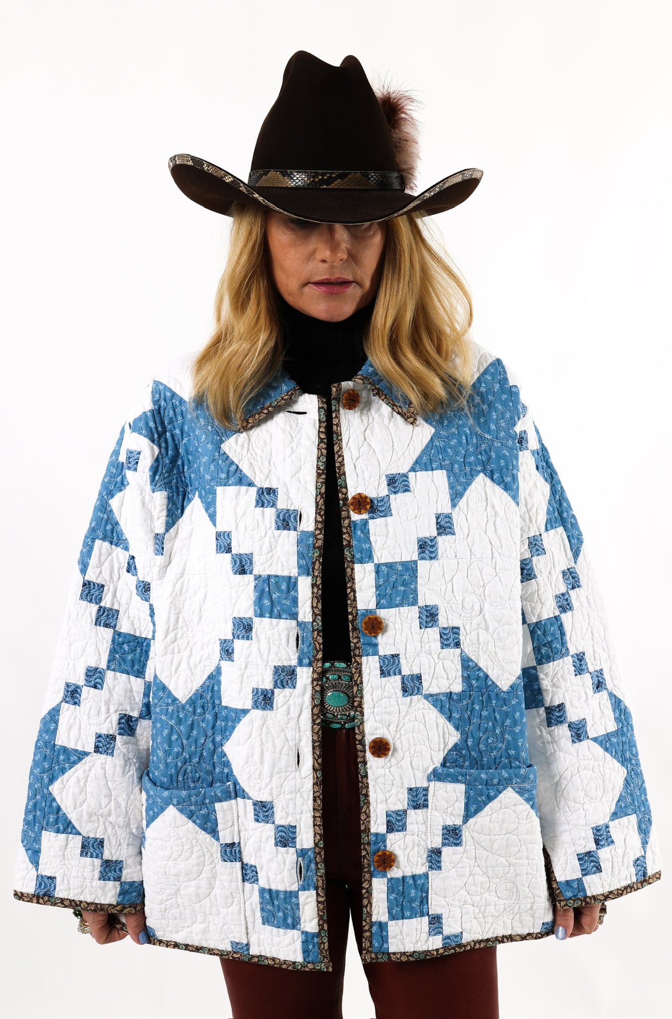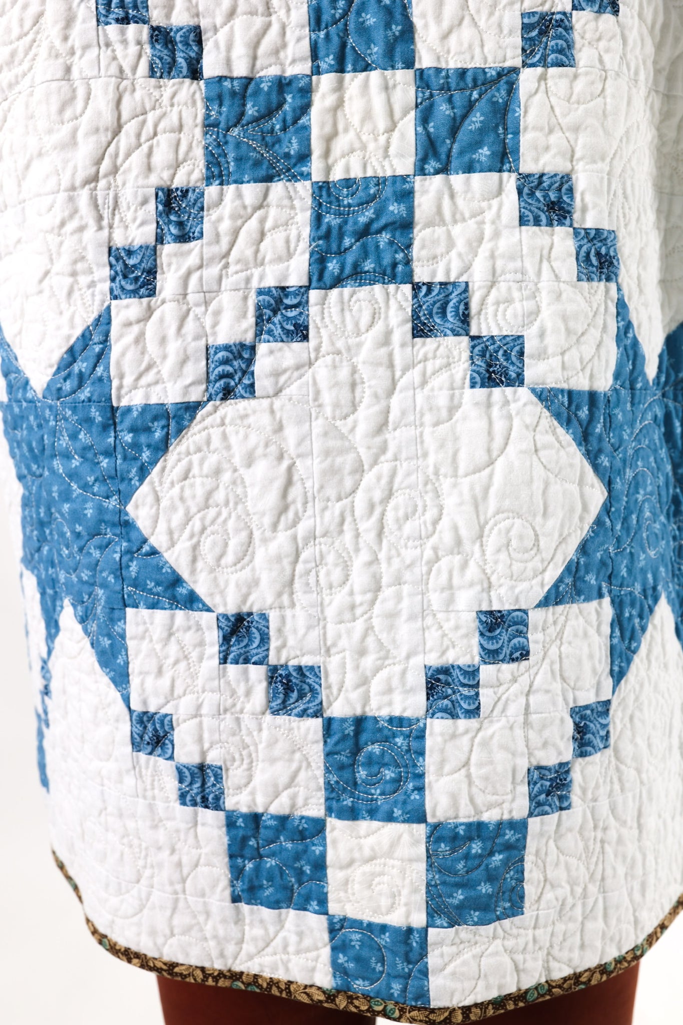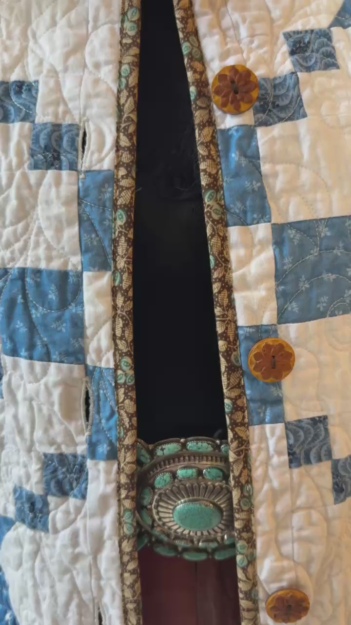 This is a contemporary American quilt made by Anne. According to Anne the quilt pattern is called Blue & White Stares Galore. We love fabrics chosen for this quilt! This is a perfect neutral piece! In our opinion, the quilt is thin, lightweight, and has a nice drape. Since this is a contemporary quilt made with new fabrics, you do not need to handle this piece with kid gloves or extra care. We used wooden floral buttons as closures. Please note, this is a size MEDIUM. Please read the size measurements below. If you have any questions please direct message us and we are happy to bore you with many more details.
