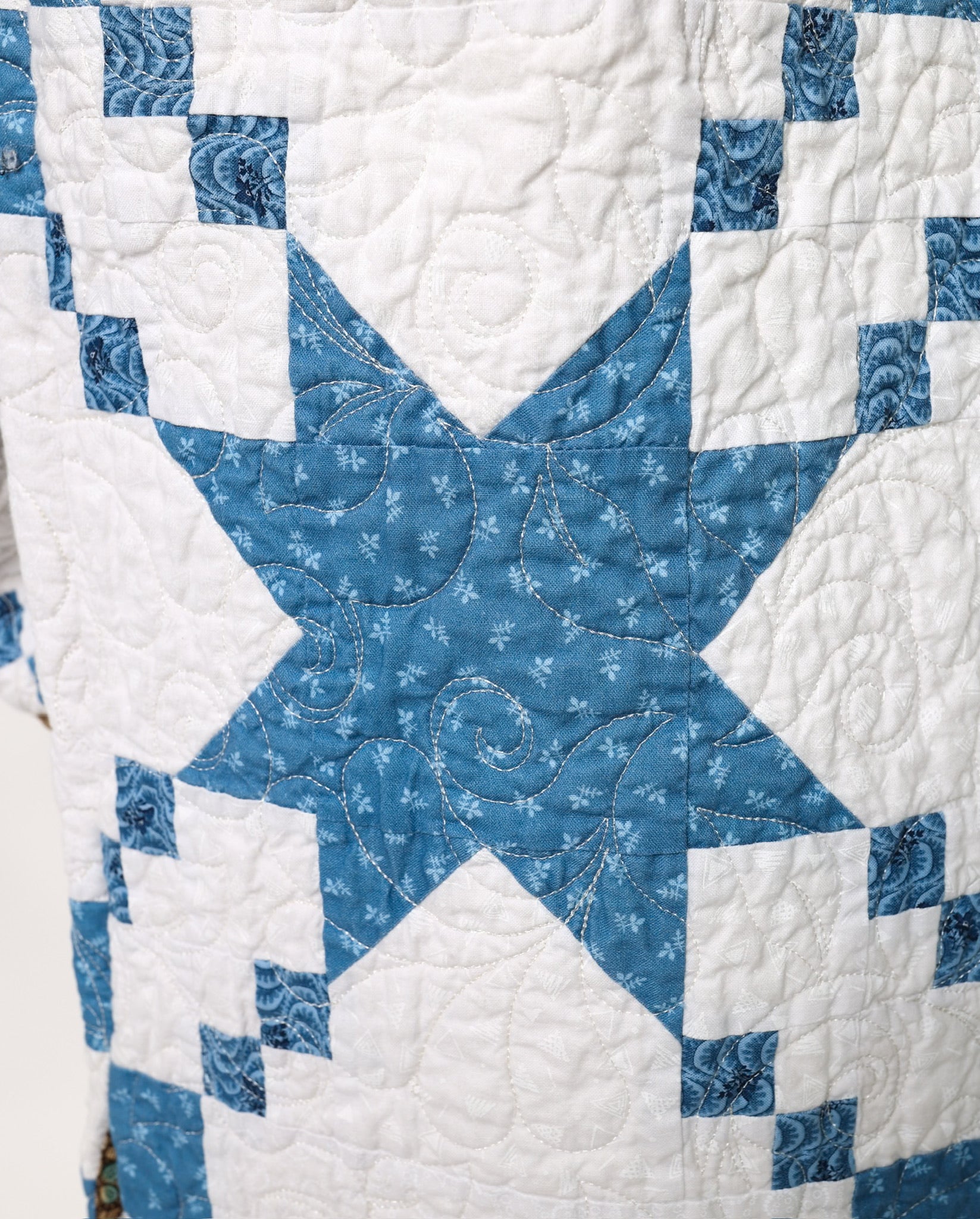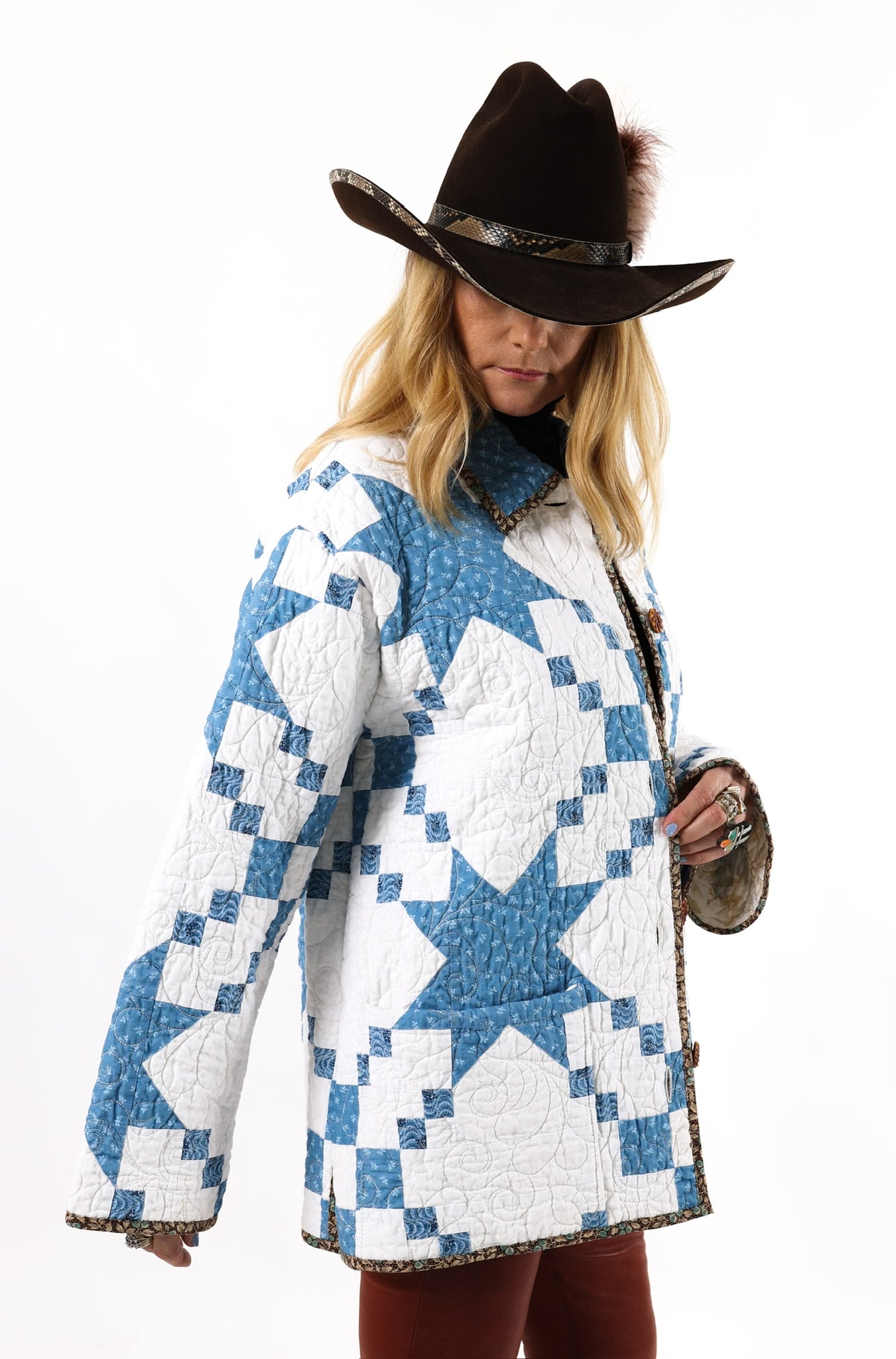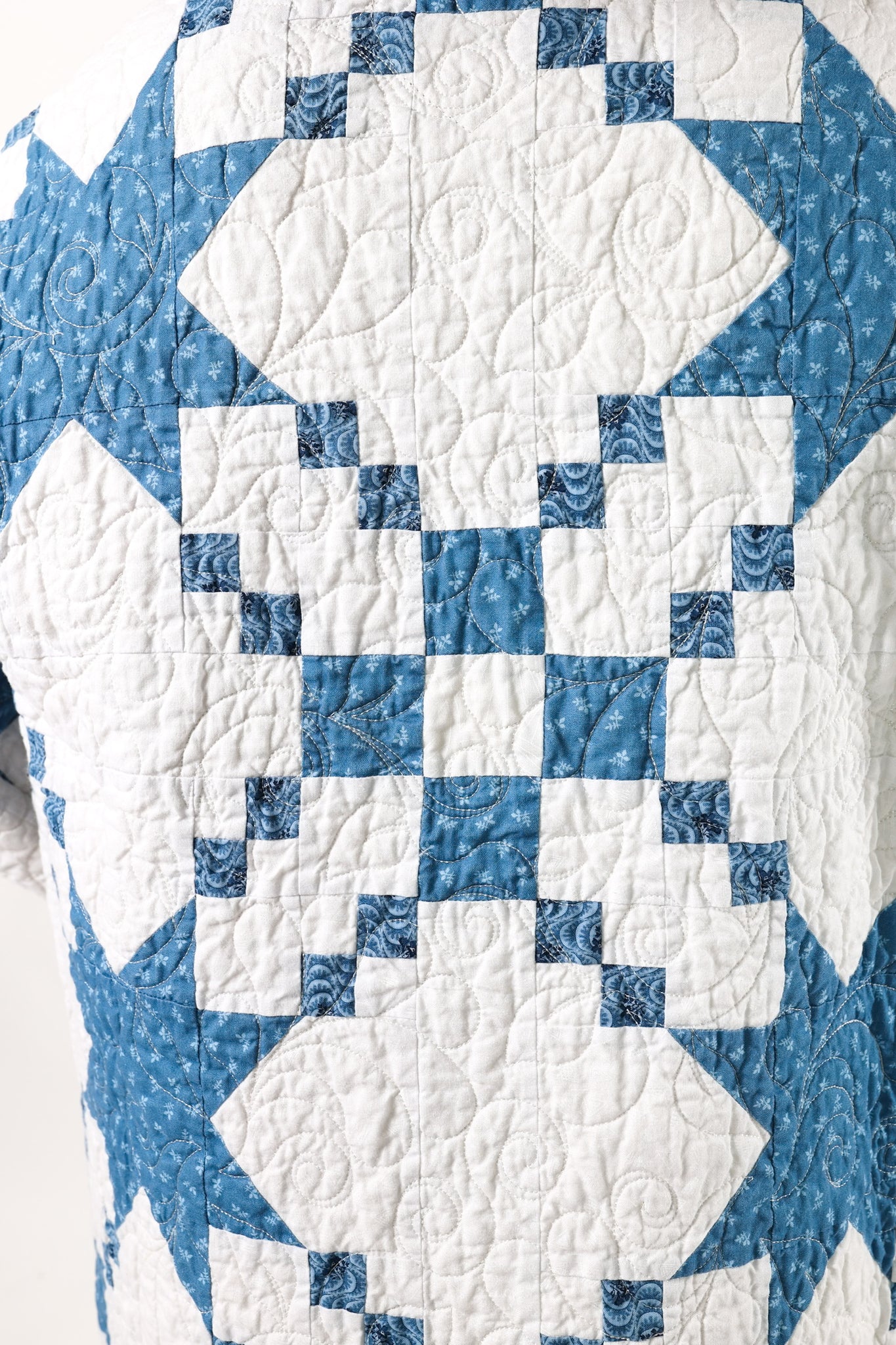 This is a contemporary American quilt made by Anne. According to Anne the quilt pattern is called Blue & White Stares Galore. We love fabrics chosen for this quilt! This is a perfect neutral piece! In our opinion, the quilt is thin, lightweight, and has a nice drape. Since this is a contemporary quilt made with new fabrics, you do not need to handle this piece with kid gloves or extra care. We used wooden floral buttons as closures. Please note, this is a size MEDIUM. Please read the size measurements below. If you have any questions please direct message us and we are happy to bore you with many more details.