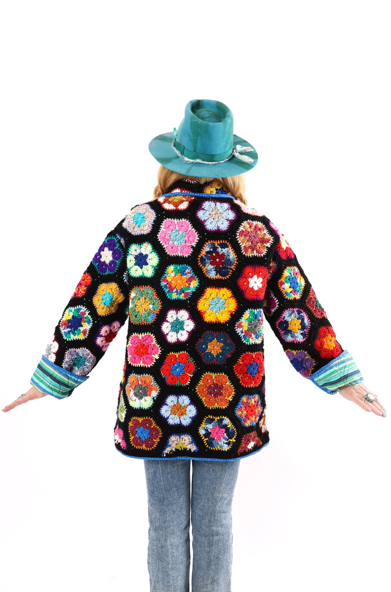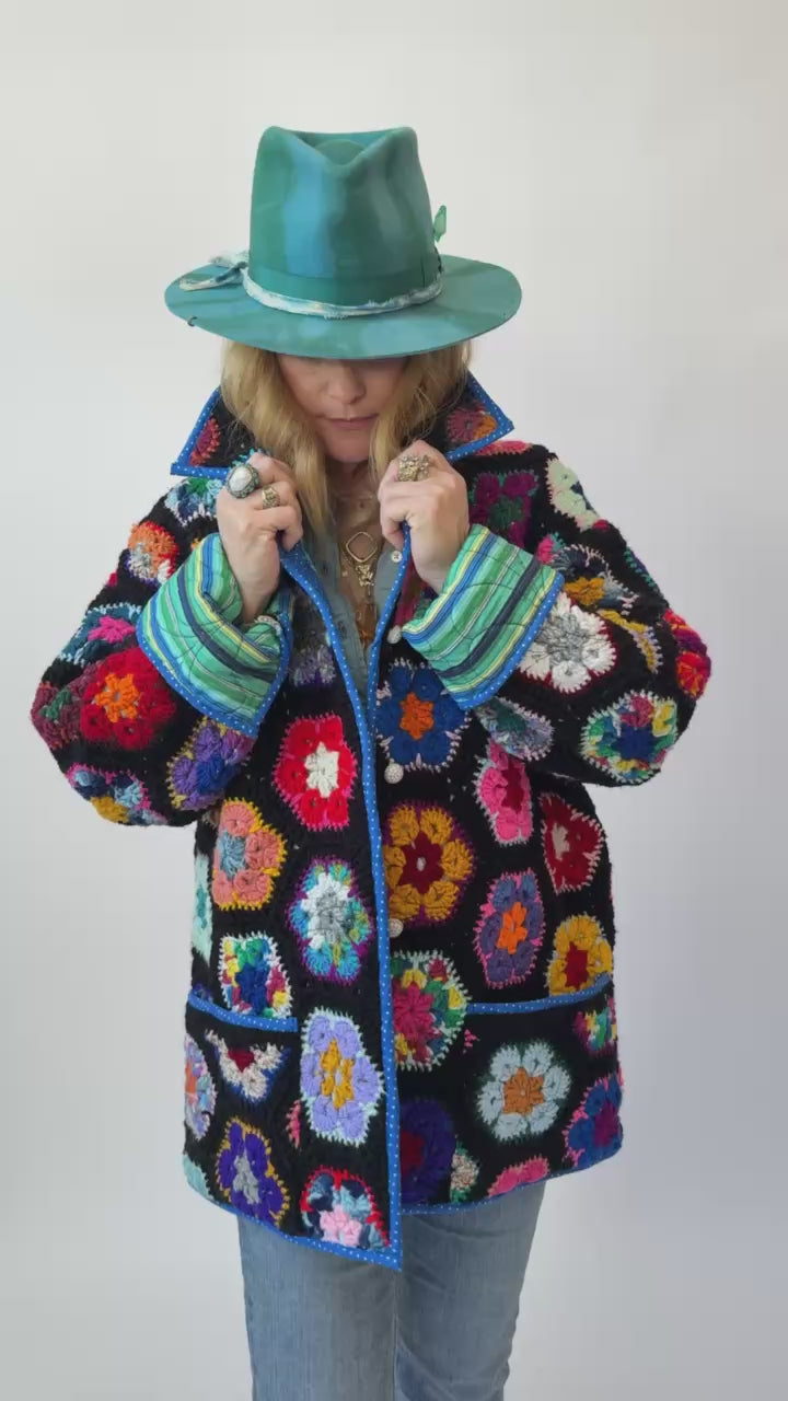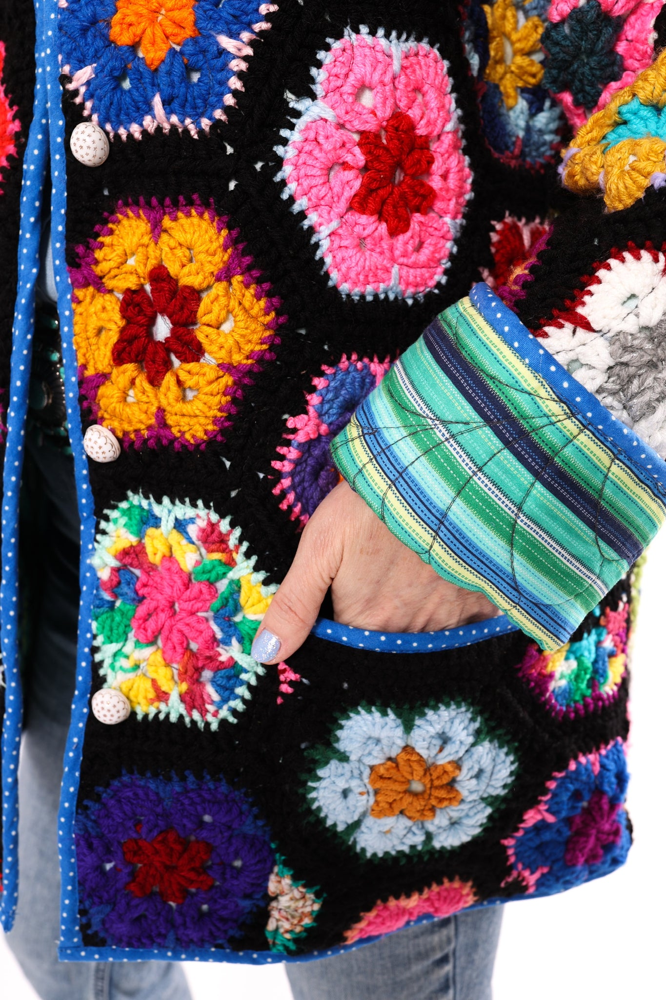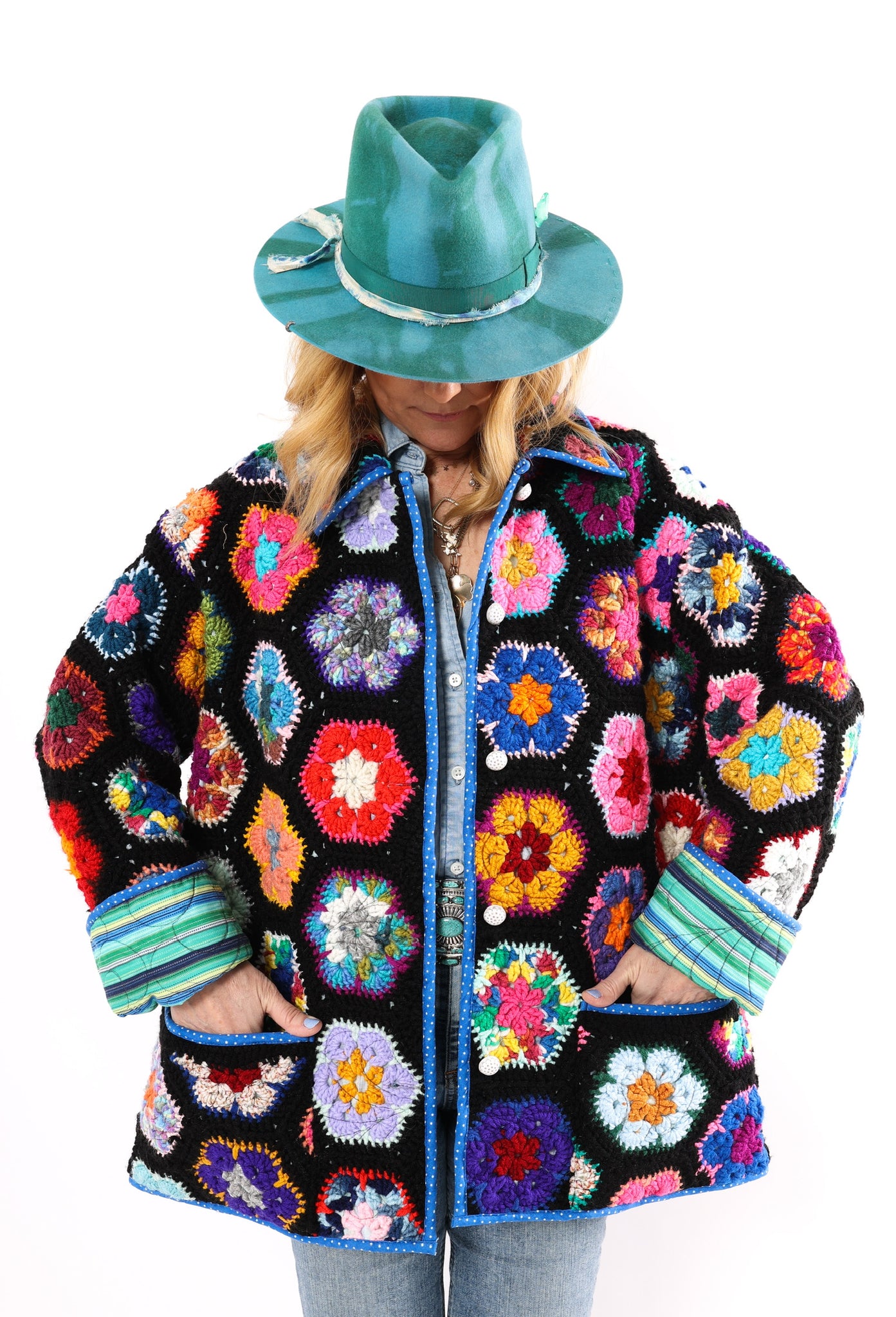 ONE OF ONE, WEARABLE ART! Lady Lancaster explored new territory combining a hand crochet blanket with novelty fabric. Our friend Zoe Dawn carefully longarmed this piece together! We believe the blanket was made circa 1960s to 1970s. The backing fabric is a cheerful green striped fabric, which adds a fun pop when the sleeves are rolled. This piece is definitely on the thicker and heavier side, so please be aware if you live in a warm climate! Due to the nature of the open weave, there could be the potential for snags. We added antique white and gold glass buttons as closures. Please note: The button holes have been altered and intentionally made them tighter in the anticipation of future stretching. This is a size LARGE, please read size measurements below. This piece fits a range of sizes depending on how you like to style your jackets. Please note, there is a minor small age spot on the inside of the jacket. If you have any questions please direct message us and we are happy to bore you with many more details.