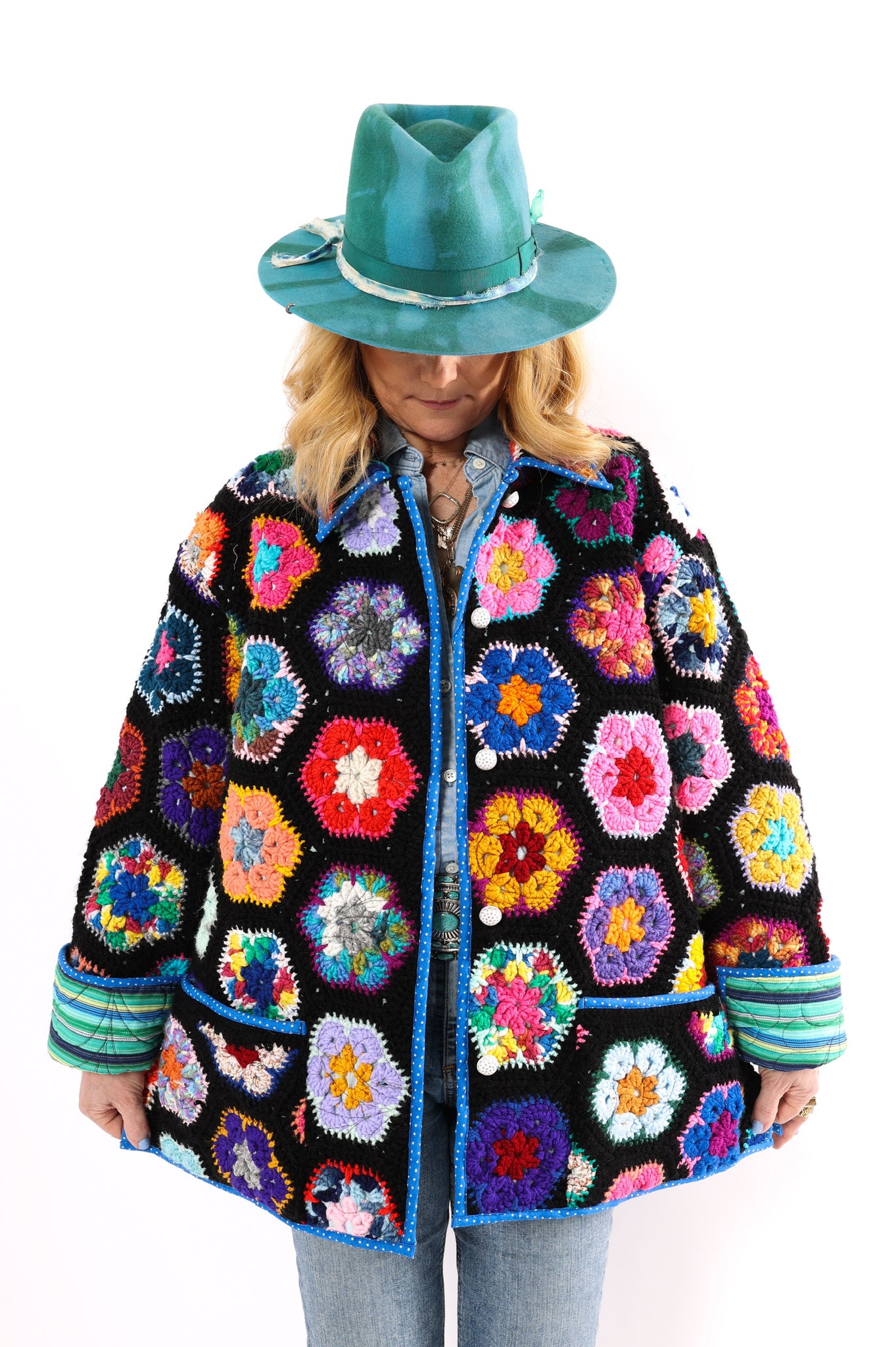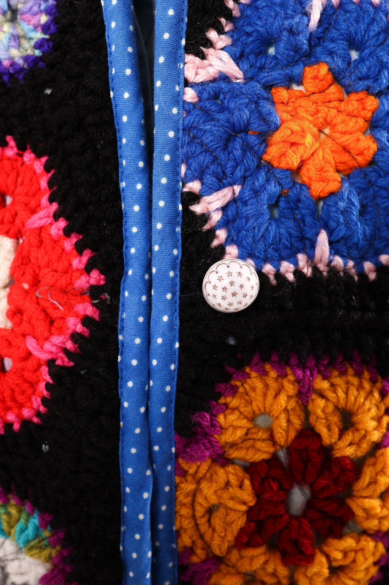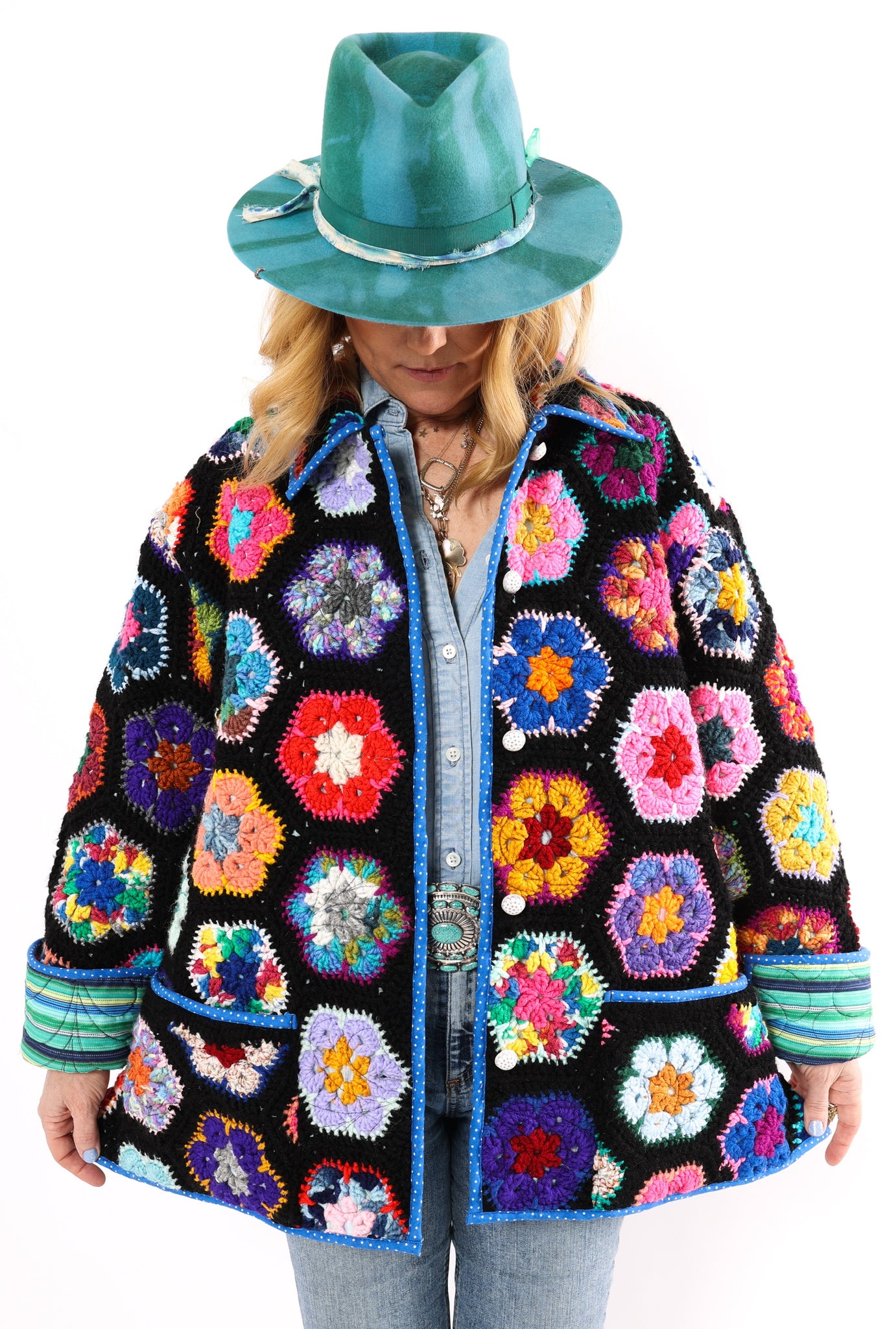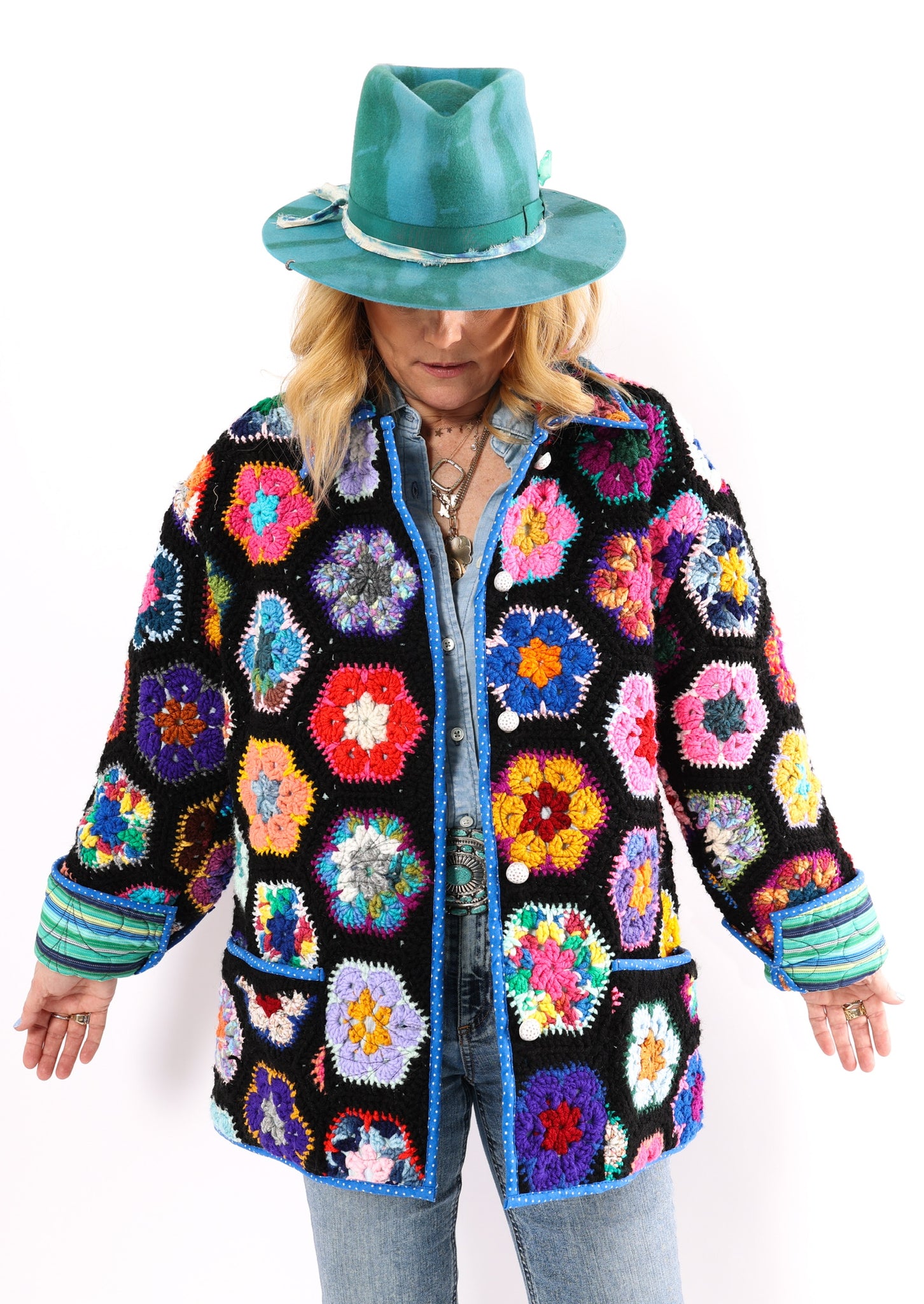 ONE OF ONE, WEARABLE ART! Lady Lancaster explored new territory combining a hand crochet blanket with novelty fabric. Our friend Zoe Dawn carefully longarmed this piece together! We believe the blanket was made circa 1960s to 1970s. The backing fabric is a cheerful green striped fabric, which adds a fun pop when the sleeves are rolled. This piece is definitely on the thicker and heavier side, so please be aware if you live in a warm climate! Due to the nature of the open weave, there could be the potential for snags. We added antique white and gold glass buttons as closures. Please note: The button holes have been altered and intentionally made them tighter in the anticipation of future stretching. This is a size LARGE, please read size measurements below. This piece fits a range of sizes depending on how you like to style your jackets. Please note, there is a minor small age spot on the inside of the jacket. If you have any questions please direct message us and we are happy to bore you with many more details.