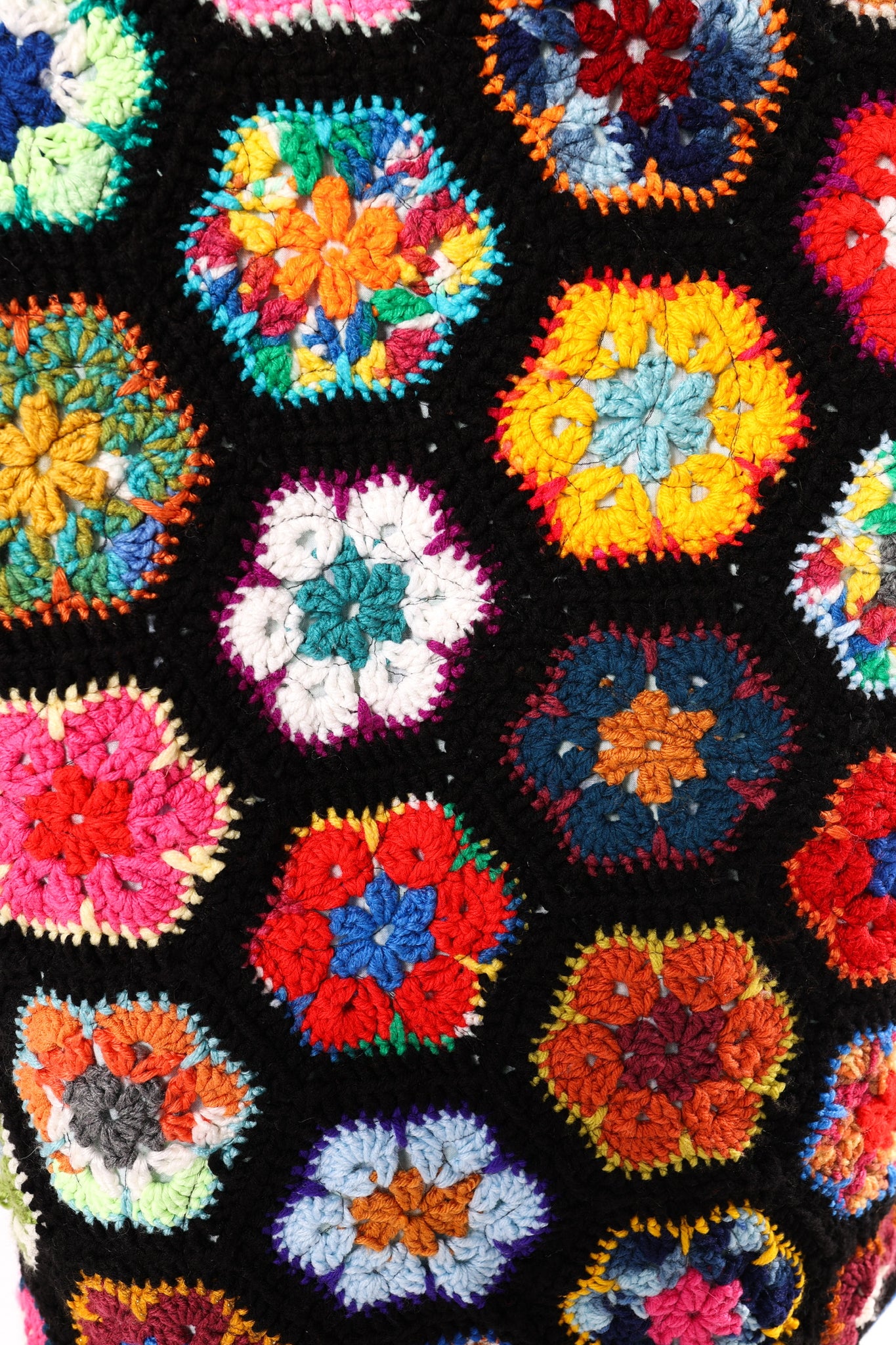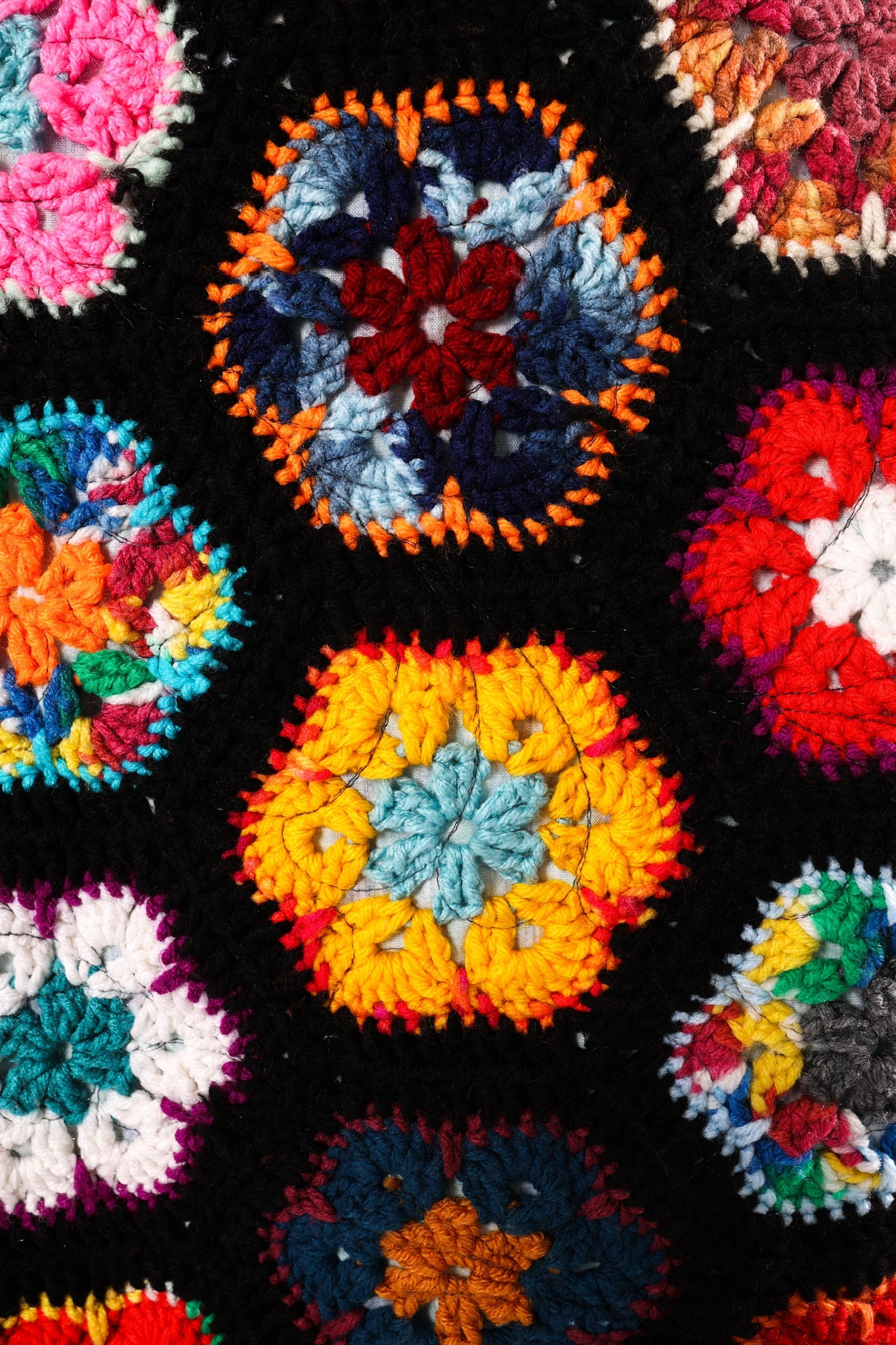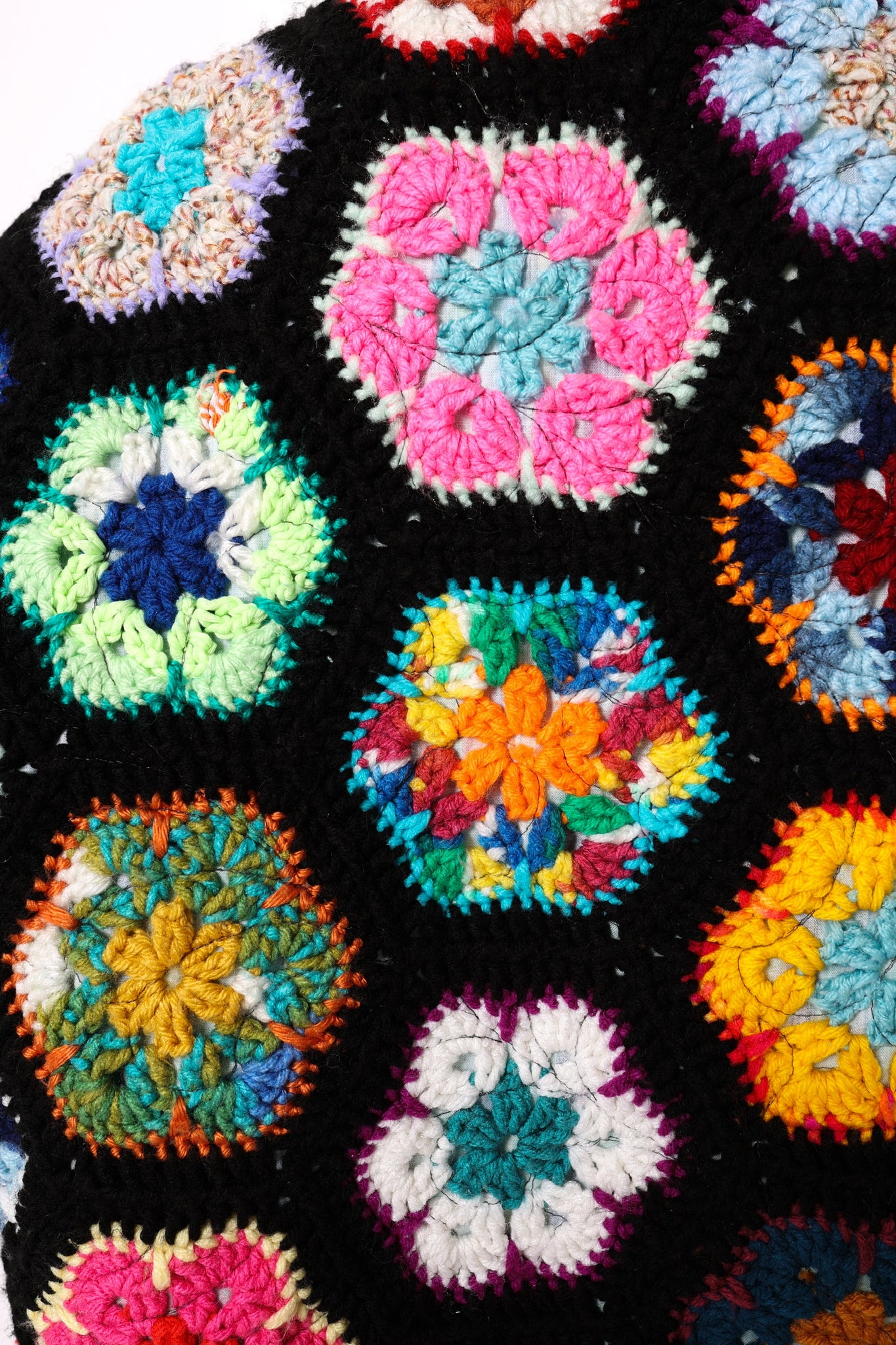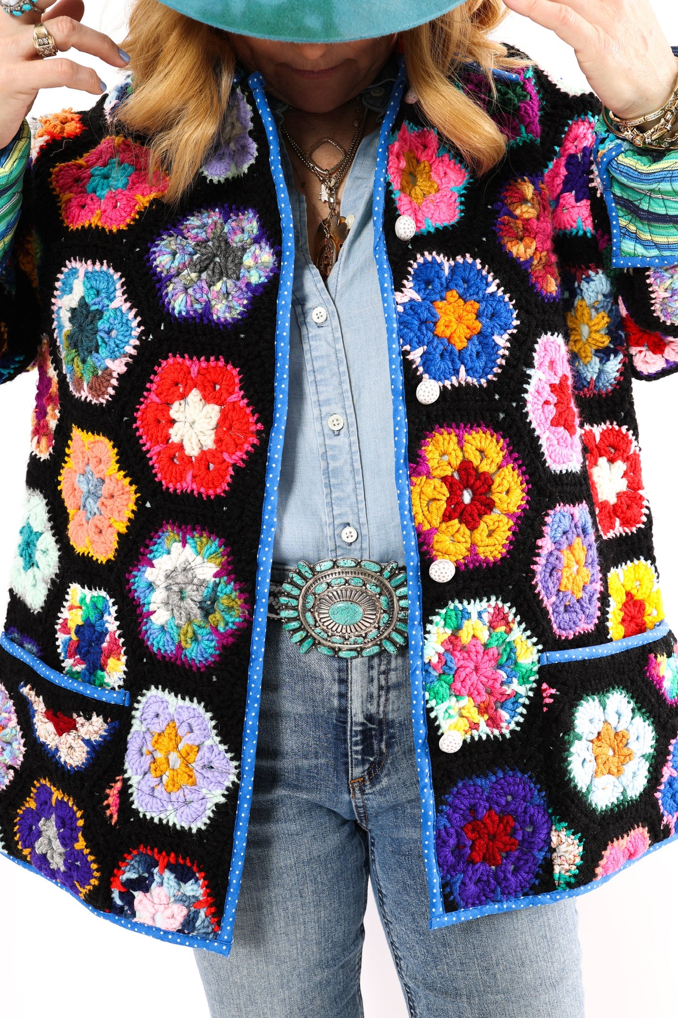 ONE OF ONE, WEARABLE ART! Lady Lancaster explored new territory combining a hand crochet blanket with novelty fabric. Our friend Zoe Dawn carefully longarmed this piece together! We believe the blanket was made circa 1960s to 1970s. The backing fabric is a cheerful green striped fabric, which adds a fun pop when the sleeves are rolled. This piece is definitely on the thicker and heavier side, so please be aware if you live in a warm climate! Due to the nature of the open weave, there could be the potential for snags. We added antique white and gold glass buttons as closures. Please note: The button holes have been altered and intentionally made them tighter in the anticipation of future stretching. This is a size LARGE, please read size measurements below. This piece fits a range of sizes depending on how you like to style your jackets. Please note, there is a minor small age spot on the inside of the jacket. If you have any questions please direct message us and we are happy to bore you with many more details.