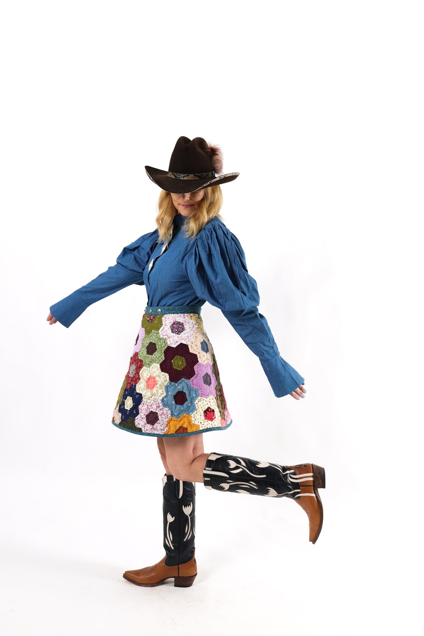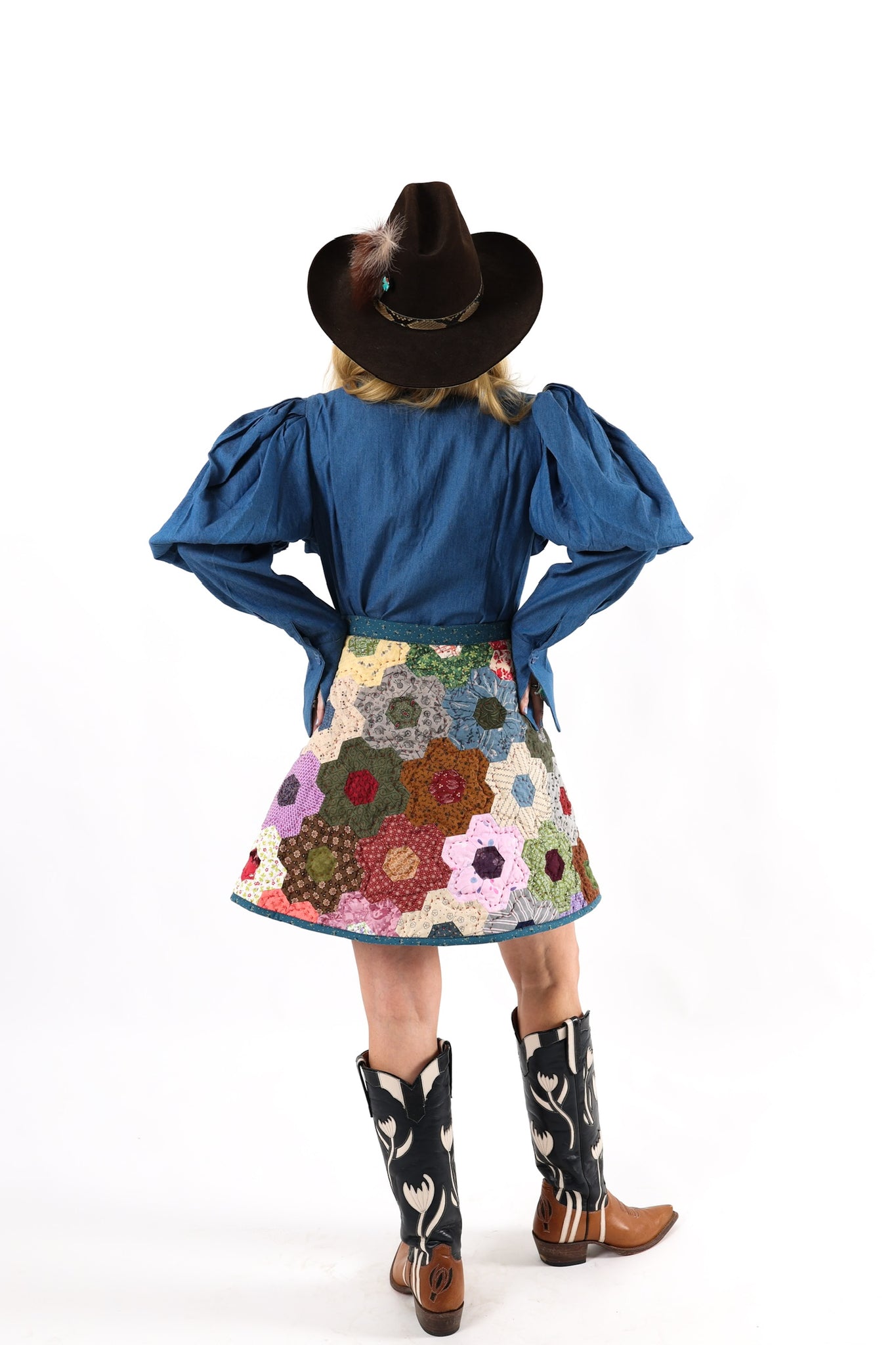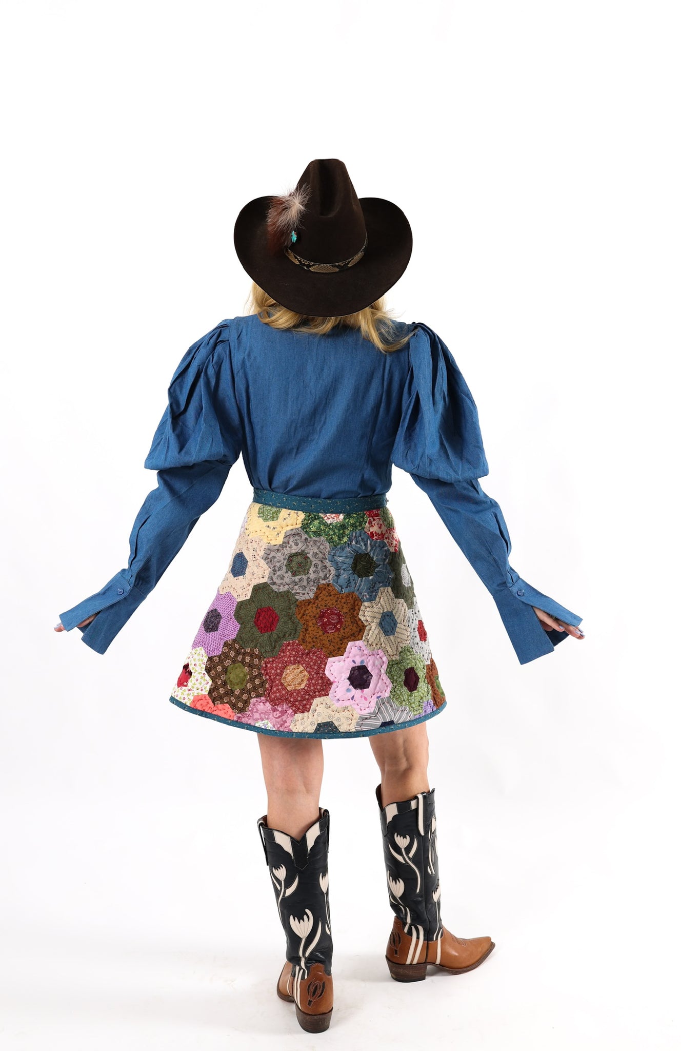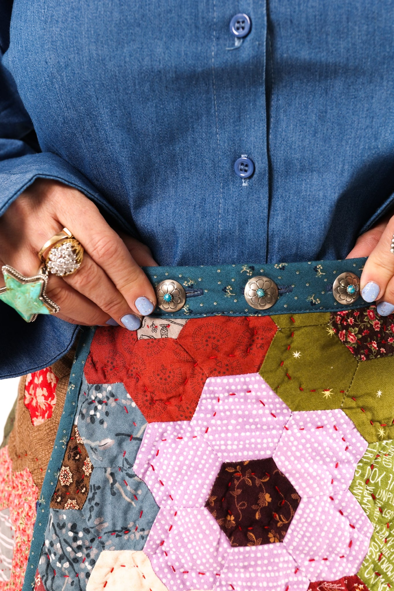 This is a contemporary American quilt and a future heirloom. It is a traditional Grandma’s Garden quilt pattern. The quilt has been hand quilted with contrasting red embroidery thread, this adds an extra pop and overall interest to the quilt. The quilt is very soft but does have a little loft! Dress this skirt up for dinner and cocktails or style with your favorite rocker tee and trainers. We designed this skirt to fit many different sizes. It has adjustable faux turquoise concho buttons at the waistline. It is a strait cut and very flattering. It is a wrap skirt style, please see video at the end of this listing for more details. This skirt best fits a US size 2 to size 8. Please DM us with questions and we will be happy to help. If you have further questions, please direct message us and we are happy to send you a video.