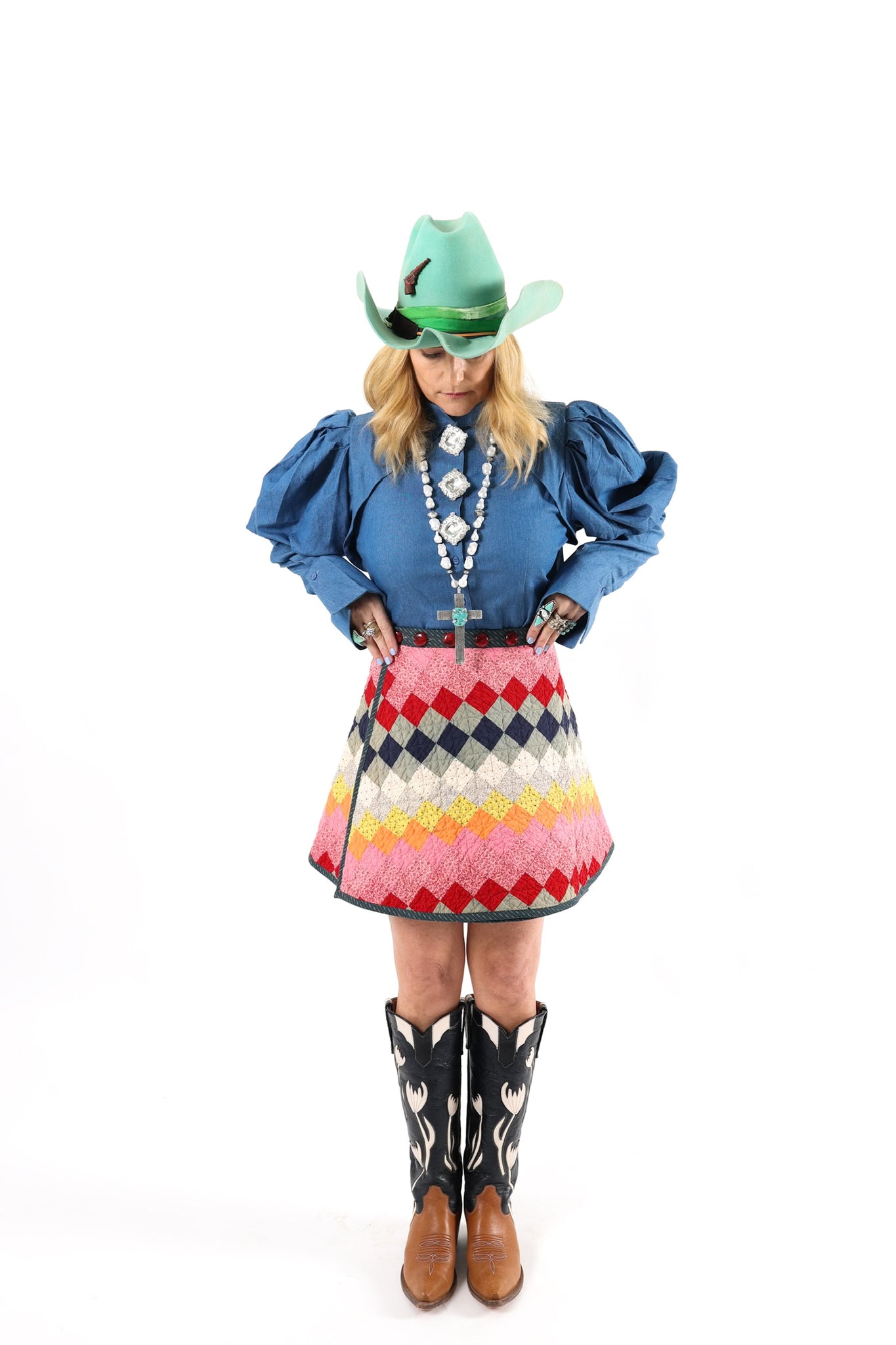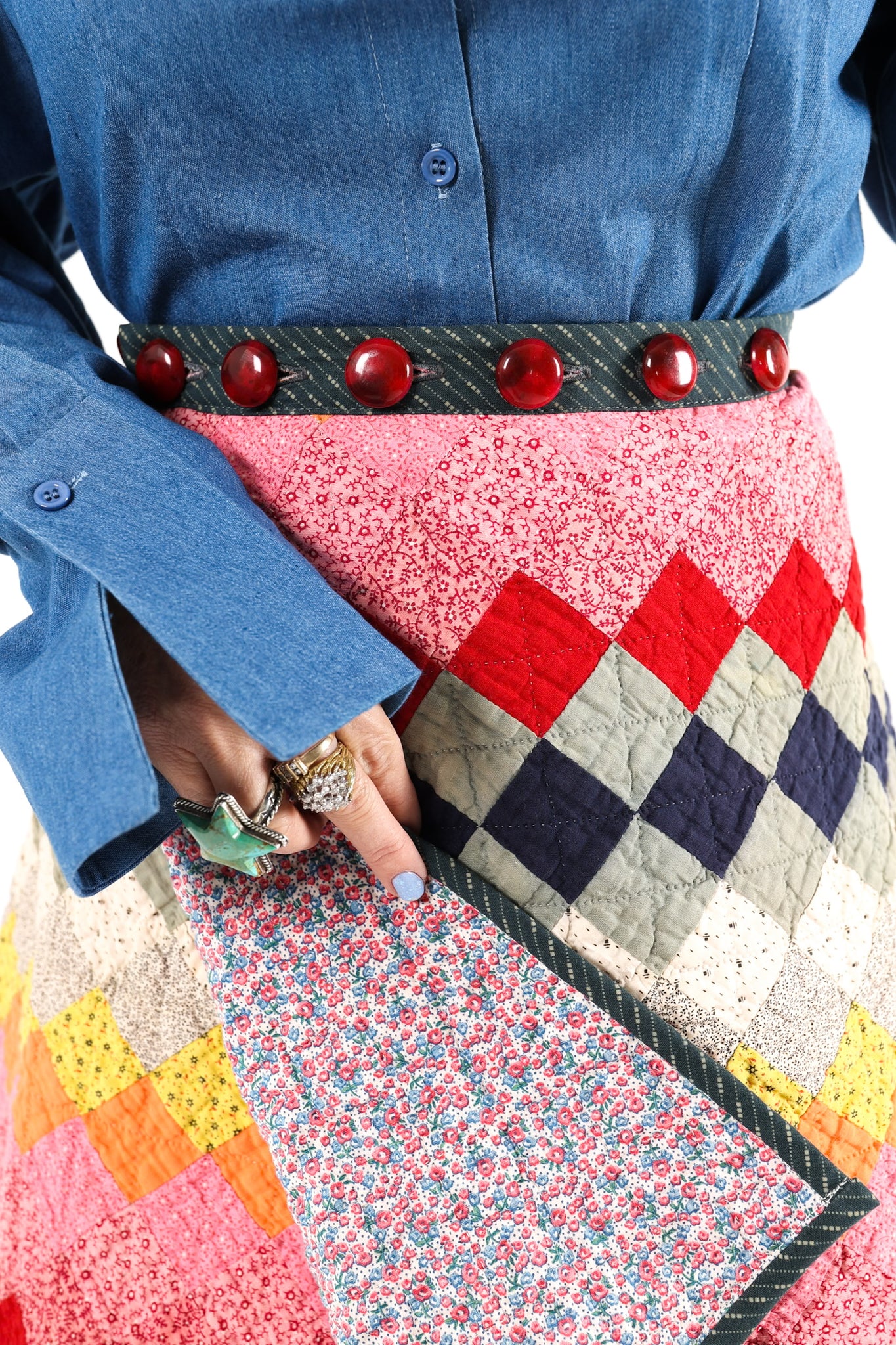 This is an Antique American quilt made circa 1880s to 1915. It is traditional Trip Around the World quilt pattern. This is a highly collectable quilt believed to be made by Old Order Mennonites from Lancaster County. The quilt has been beautifully hand quilted, however we believe it was pieced on a Treadle sewing machine. The quilt is thin and lightweight. The maker backed the quilt(inside of skirt), with a beautiful floral fabric. This piece did not come from a humble home, which is ironic considering it to be a Mennonite quilt. We were able to make a corresponding Wolfe Vest if you're looking for a full ensemble! Dress this skirt up for dinner and cocktails or style with your favorite rocker tee and trainers. We designed this skirt to fit many different sizes. It has adjustable red antique glass button waistline. The skirt is a strait cut and very flattering. It is a wrap skirt style, please see video at the end of this listing for more details. This skirt best fits a US size 2 to size 10. Please DM us with questions and we will be happy to help. If you have further questions, please direct message us and we are happy to send you a video.