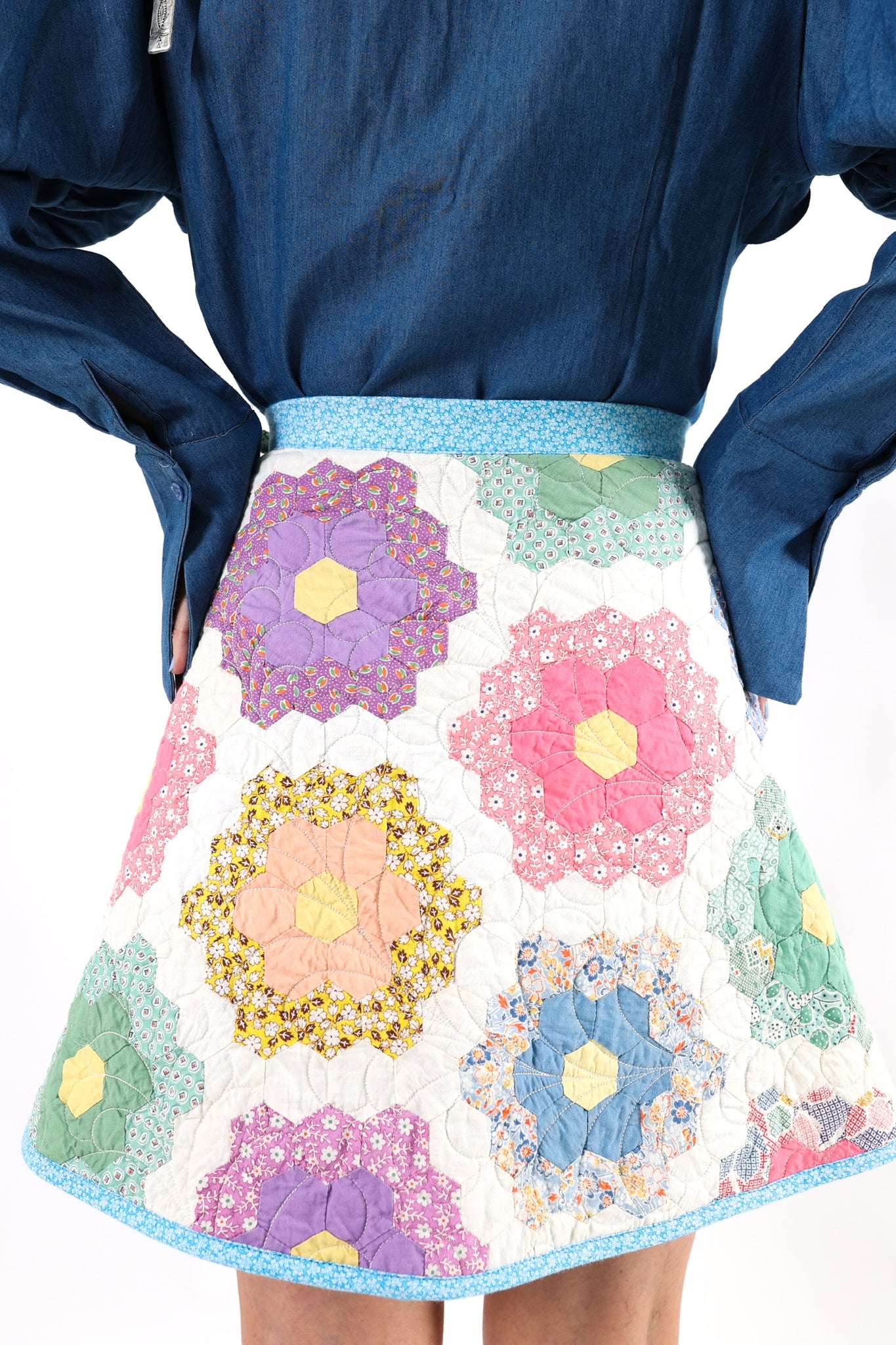 This is an Antique American quilt top made circa 1930s to 1940s. It is a traditional Grandmother's Garden quilt pattern. The quilt top was meticulously hand sewn. If you look closely you will find feedsack fabrics throughout this piece. To complete the quilt we backed the orphaned top with coordinating blue polka dot fabric. The quilt is very thin, and lightweight. We have used gold and pearl enamel flower buttons as closures. You will notice that the buttons on this skirt are on the opposite side, this was done to cover a very minor stain. We designed this skirt to fit many different sizes. It has adjustable button waistband. It is a strait cut and very flattering. It is a wrap skirt style, please see video at the end of this listing for more details. This skirt best fits a US size 2 to size 8. Please DM us with questions and we will be happy to help. If you have further questions, please direct message us and we are happy to send you a video.