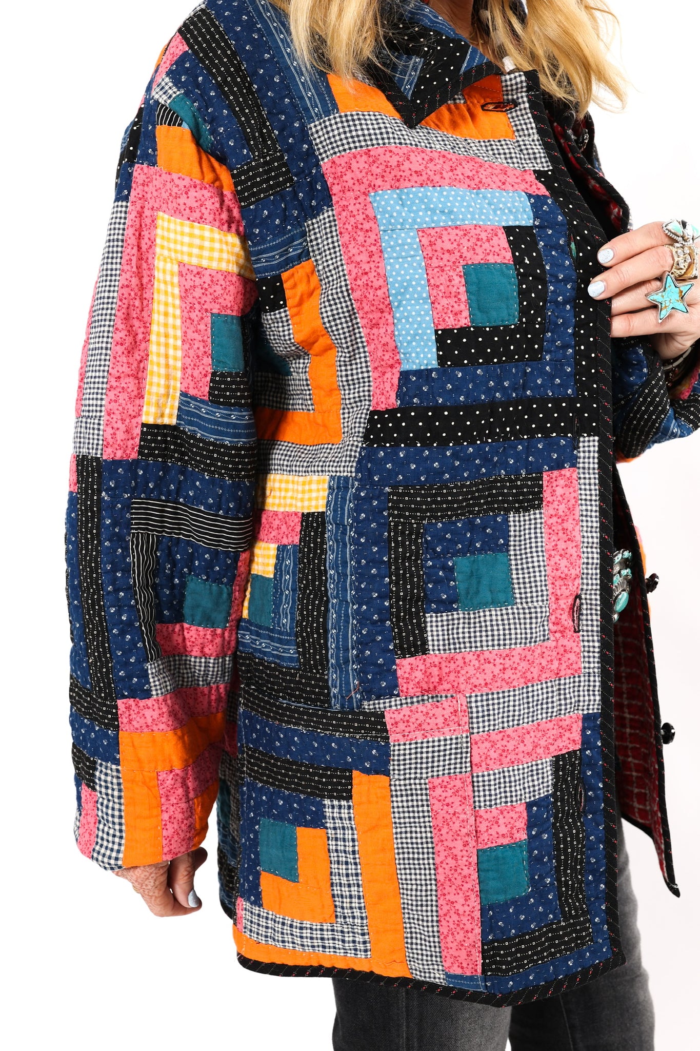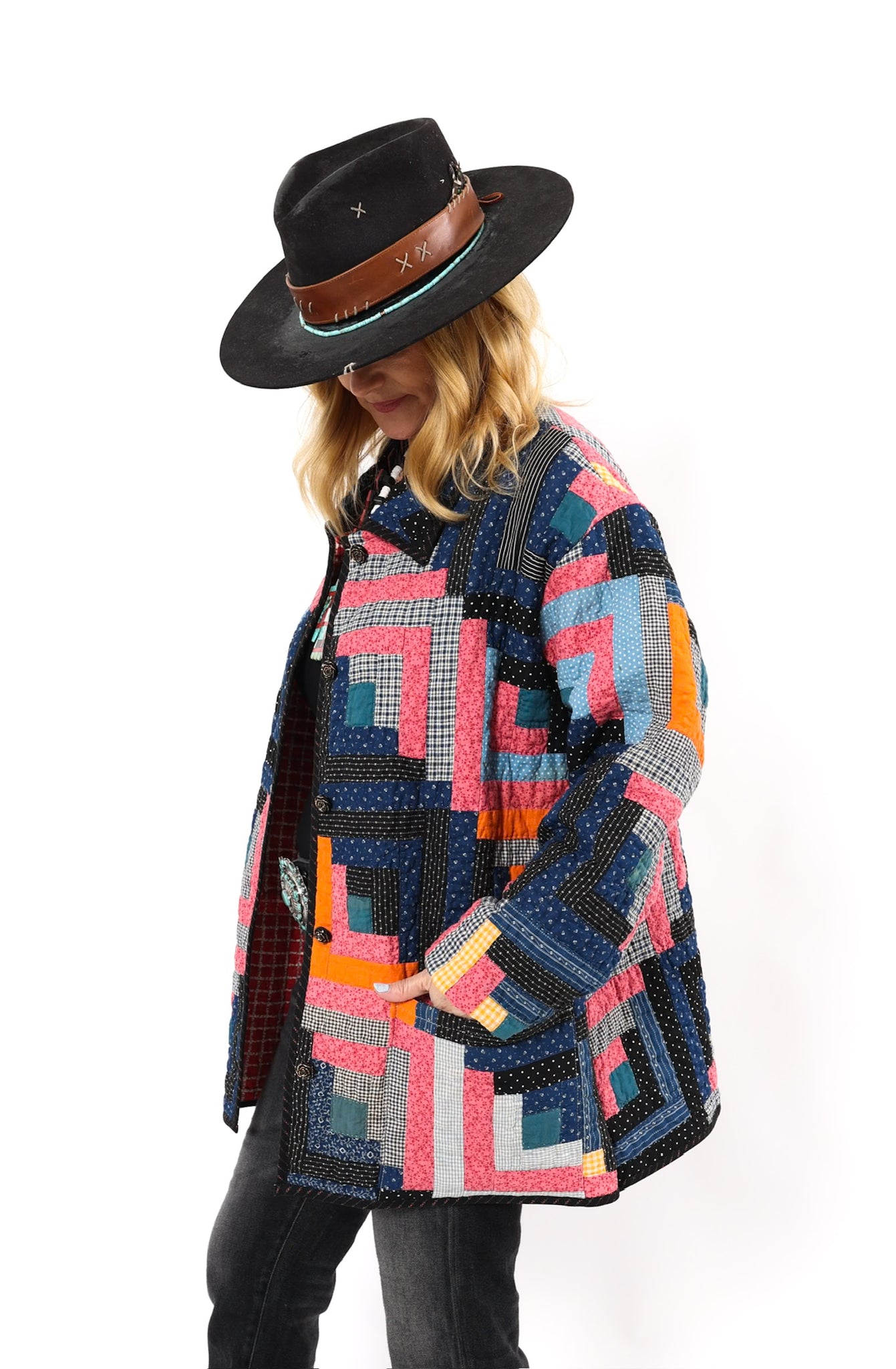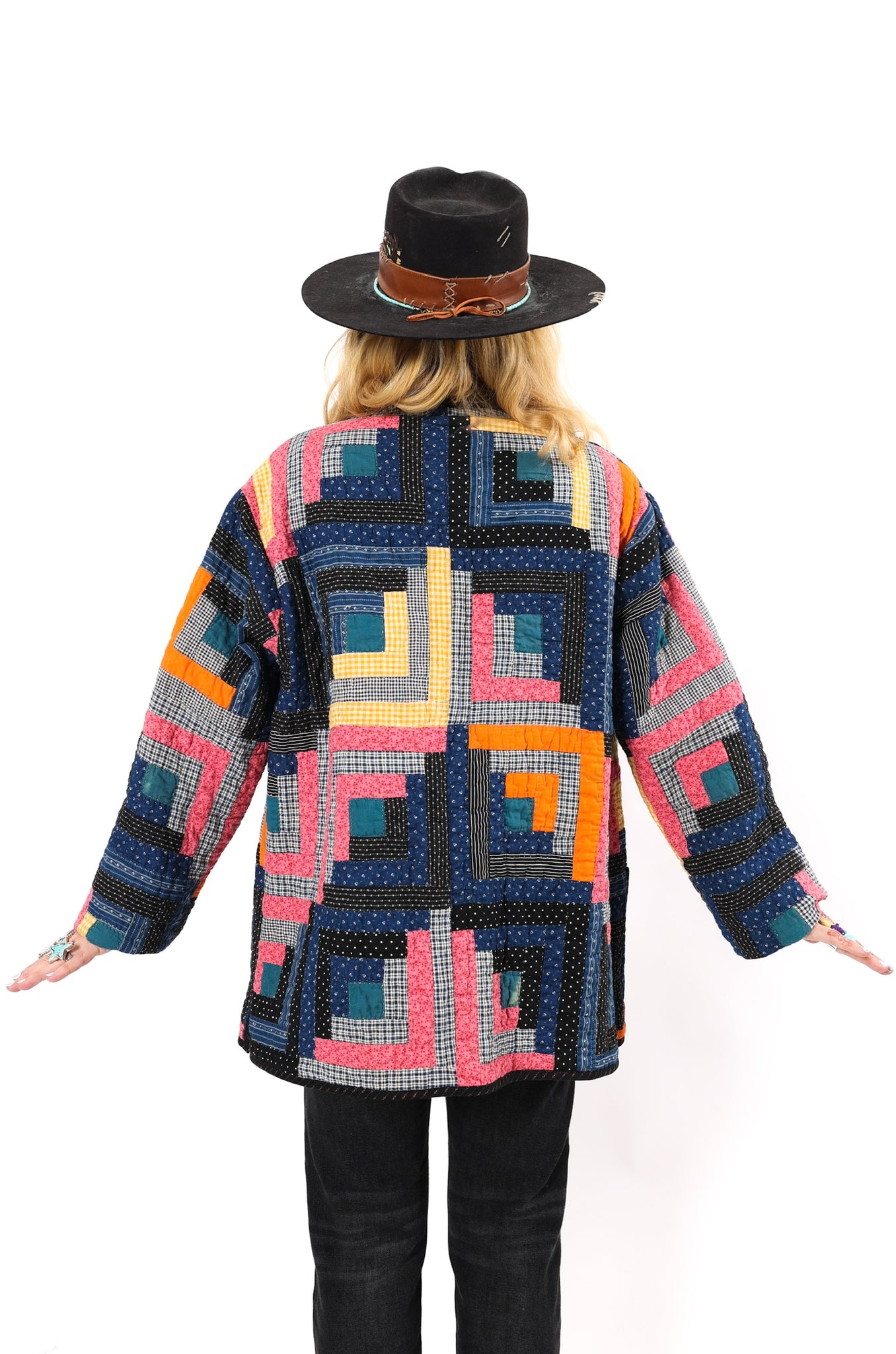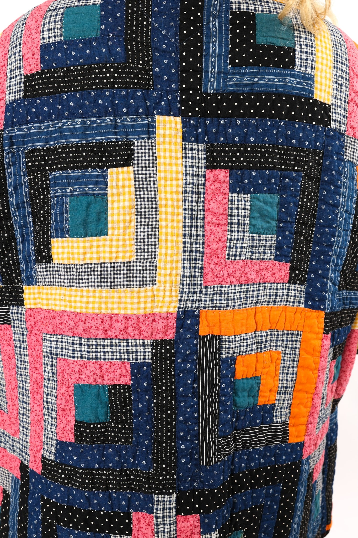 This is an American antique quilt made circa 1890s to 1920s by or for Mildred. The maker hand stitched this name into the quilt. We have preserved and placed the name on the inside of the jacket. It is a traditional Log Cabin quilt pattern. The quilt has been beautifully hand quilted and hand sewn which is a labor of love and a lost art. It is a highly collectible quilt from this era! The quilt is overflowing with, rare and valuable indigos, crisp and vibrant cheddar, and many pristine black fabrics. It is rare that the indigos and blacks have survived the test of time. The quilt did not come from a humble home. The maker backed this quilt with a contrasting red grid fabric, you will want to cuff the sleeves to show this off! We used black and gold glass rosette antique buttons as closures. In our opinion, the jacket is very thin, very lightweight with very little loft(puffiness), soft, and very comfortable to wear. It has a great drape. This is a Lady Lancaster 10/10. This is a size LARGE, please read size measurements below. This piece fits a range of sizes depending on how you like to style your jackets. Please note, there is a minor small age spot on the inside of the jacket. If you have any questions please direct message us and we are happy to bore you with many more details.
