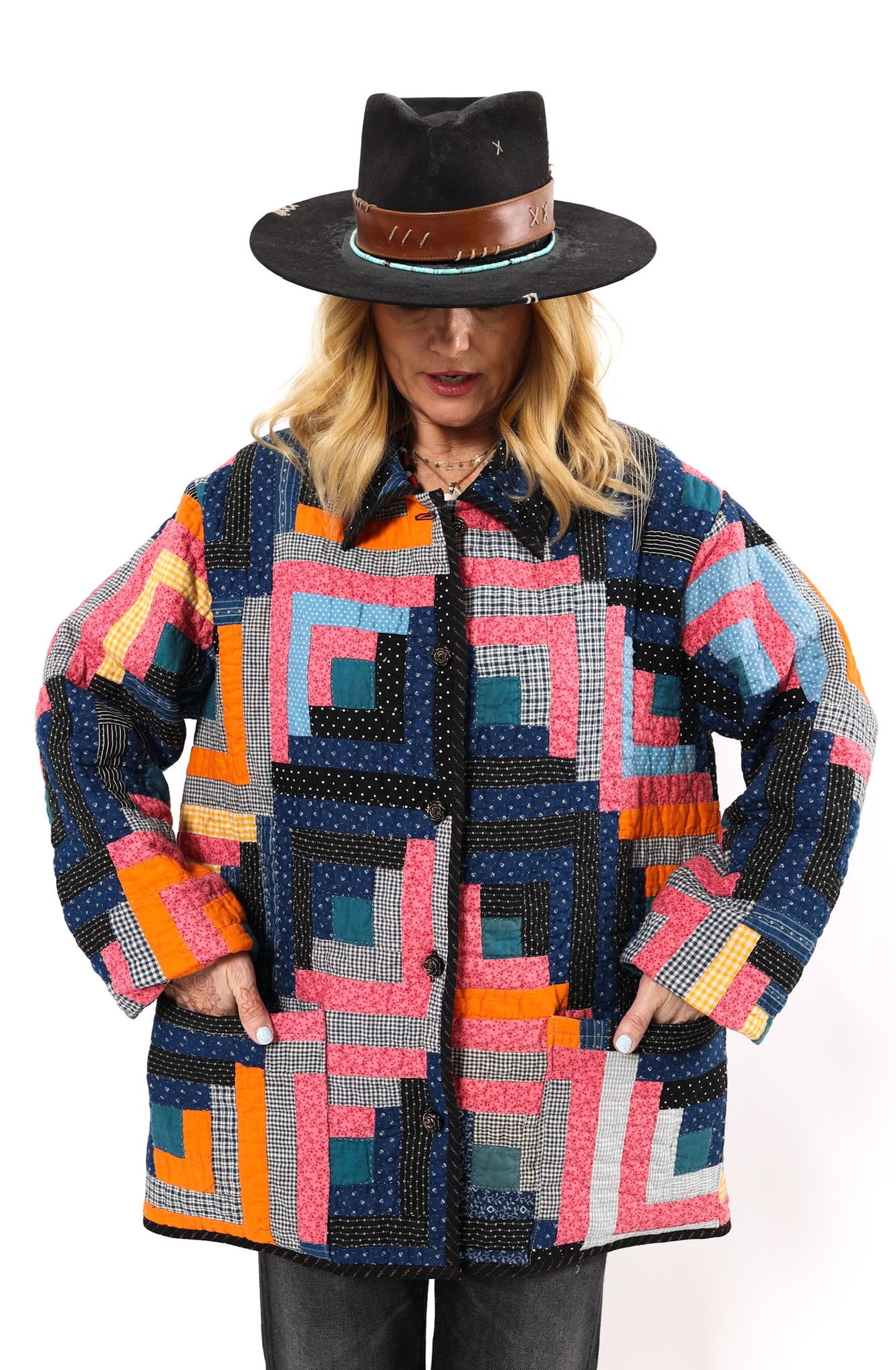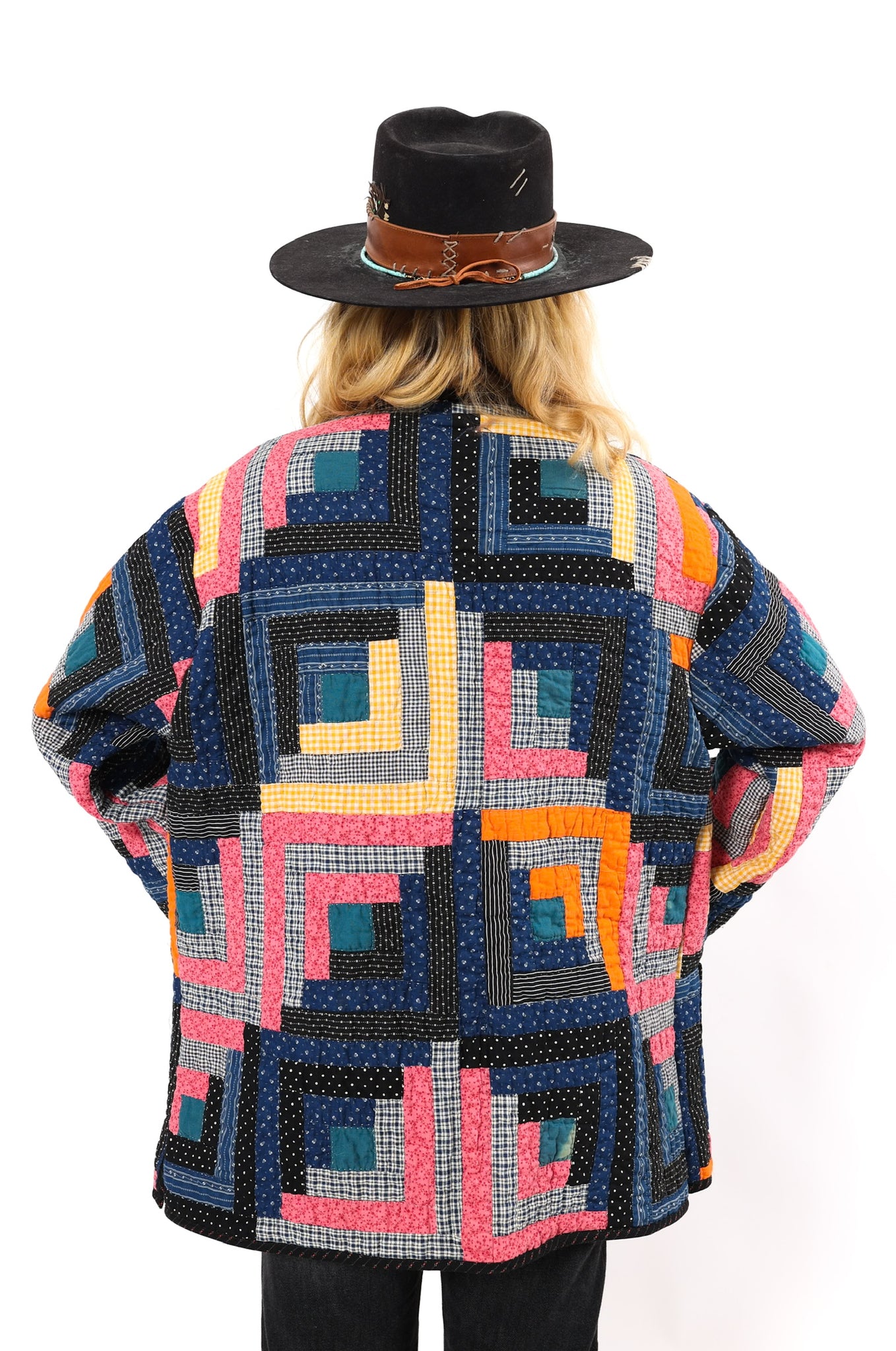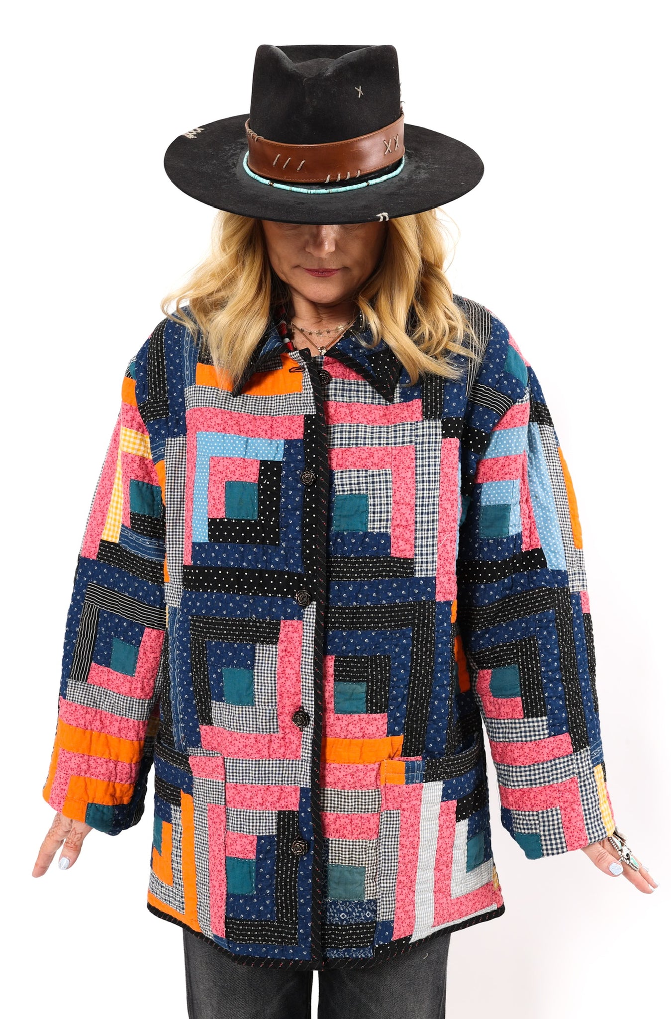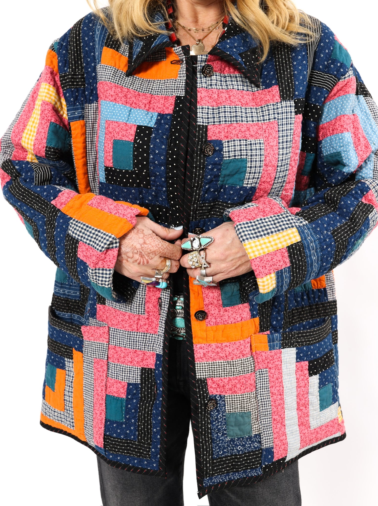 This is an American antique quilt made circa 1890s to 1920s by or for Mildred. The maker hand stitched this name into the quilt. We have preserved and placed the name on the inside of the jacket. It is a traditional Log Cabin quilt pattern. The quilt has been beautifully hand quilted and hand sewn which is a labor of love and a lost art. It is a highly collectible quilt from this era! The quilt is overflowing with, rare and valuable indigos, crisp and vibrant cheddar, and many pristine black fabrics. It is rare that the indigos and blacks have survived the test of time. The quilt did not come from a humble home. The maker backed this quilt with a contrasting red grid fabric, you will want to cuff the sleeves to show this off! We used black and gold glass rosette antique buttons as closures. In our opinion, the jacket is very thin, very lightweight with very little loft(puffiness), soft, and very comfortable to wear. It has a great drape. This is a Lady Lancaster 10/10. This is a size LARGE, please read size measurements below. This piece fits a range of sizes depending on how you like to style your jackets. Please note, there is a minor small age spot on the inside of the jacket. If you have any questions please direct message us and we are happy to bore you with many more details.