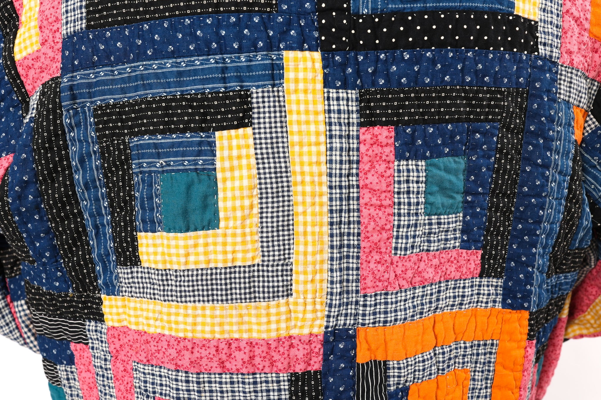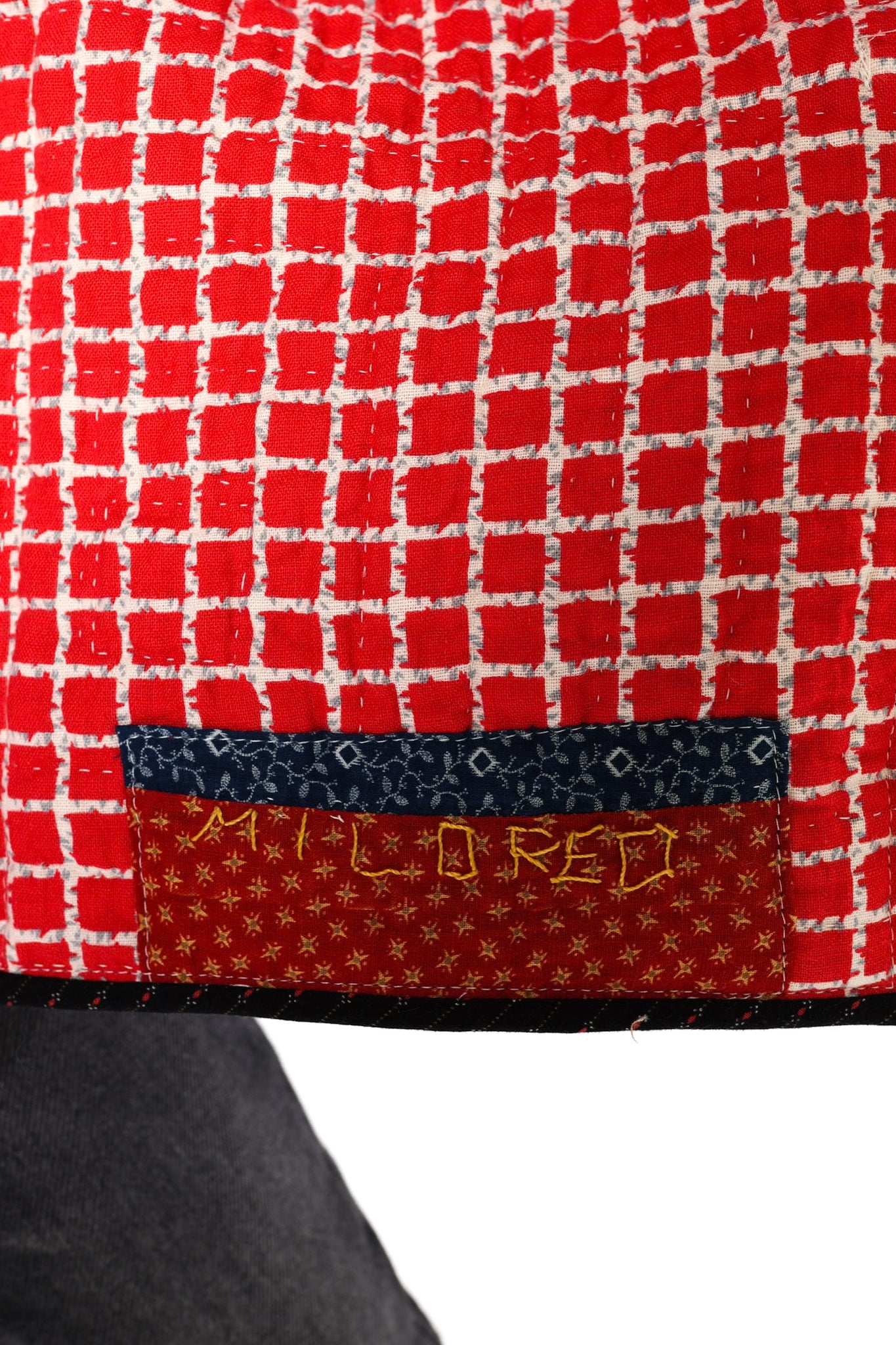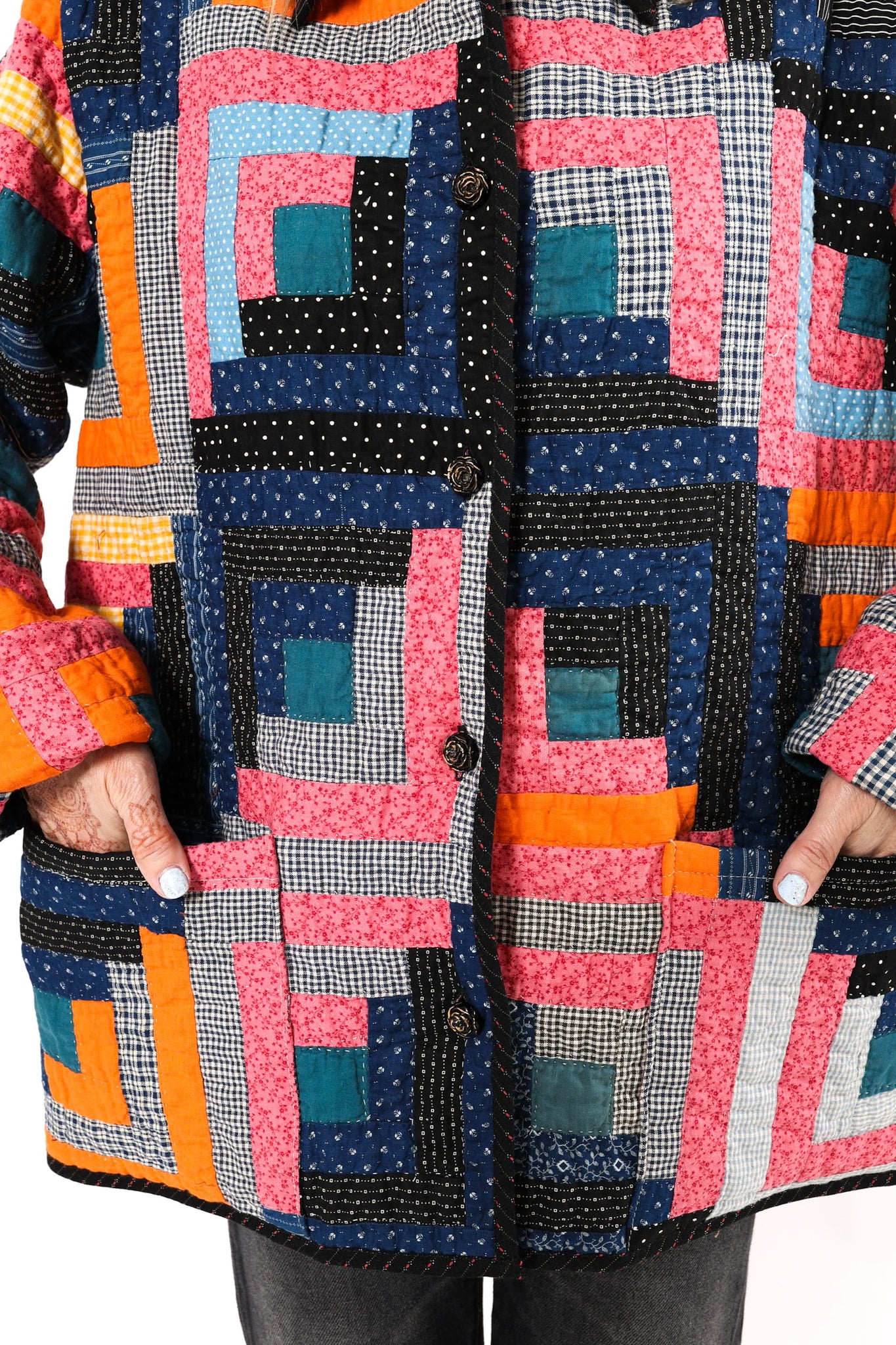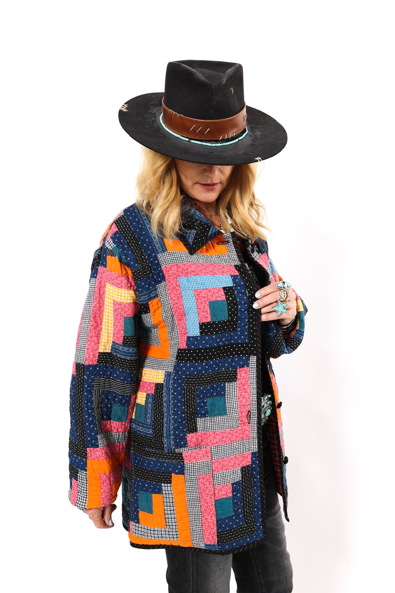 This is an American antique quilt made circa 1890s to 1920s by or for Mildred. The maker hand stitched this name into the quilt. We have preserved and placed the name on the inside of the jacket. It is a traditional Log Cabin quilt pattern. The quilt has been beautifully hand quilted and hand sewn which is a labor of love and a lost art. It is a highly collectible quilt from this era! The quilt is overflowing with, rare and valuable indigos, crisp and vibrant cheddar, and many pristine black fabrics. It is rare that the indigos and blacks have survived the test of time. The quilt did not come from a humble home. The maker backed this quilt with a contrasting red grid fabric, you will want to cuff the sleeves to show this off! We used black and gold glass rosette antique buttons as closures. In our opinion, the jacket is very thin, very lightweight with very little loft(puffiness), soft, and very comfortable to wear. It has a great drape. This is a Lady Lancaster 10/10. This is a size LARGE, please read size measurements below. This piece fits a range of sizes depending on how you like to style your jackets. Please note, there is a minor small age spot on the inside of the jacket. If you have any questions please direct message us and we are happy to bore you with many more details.
