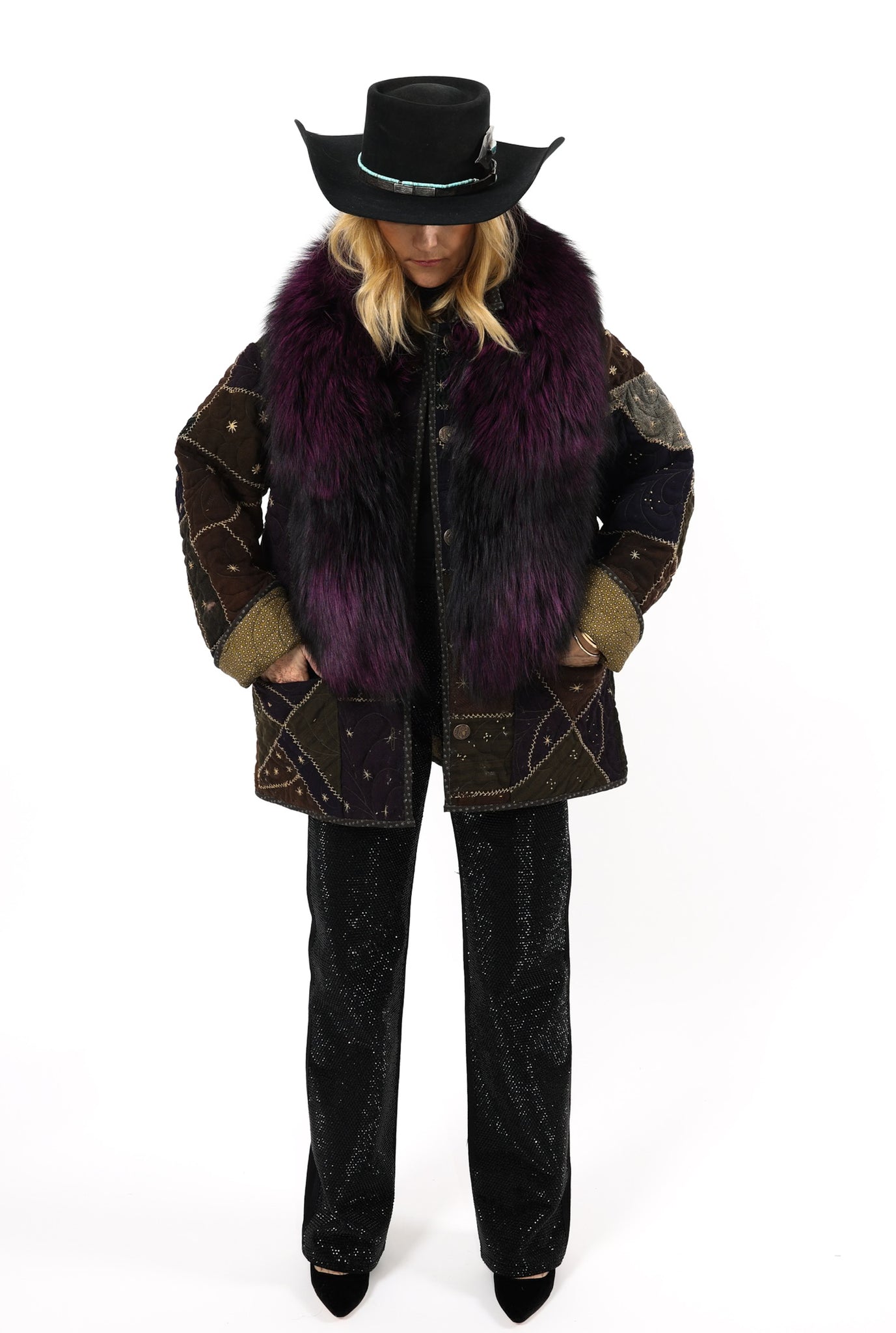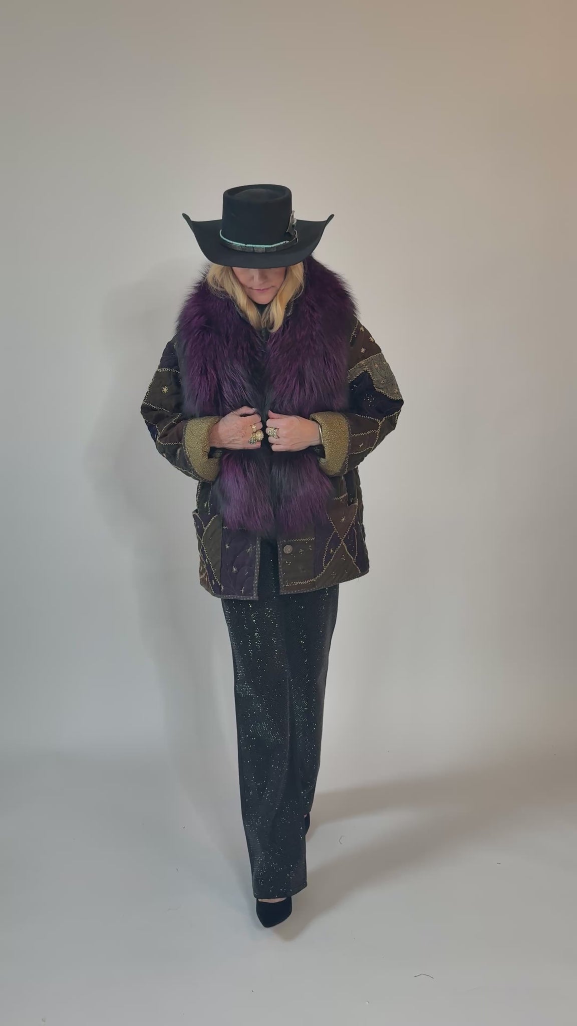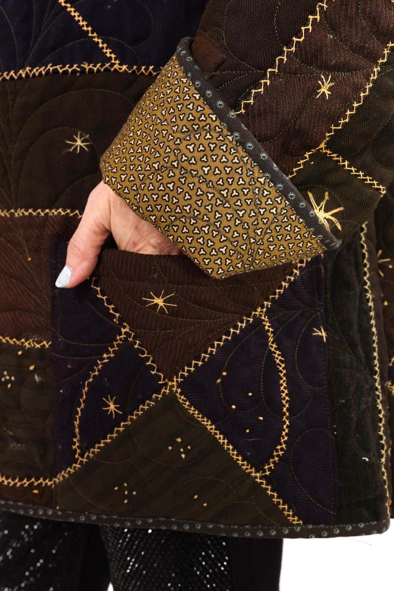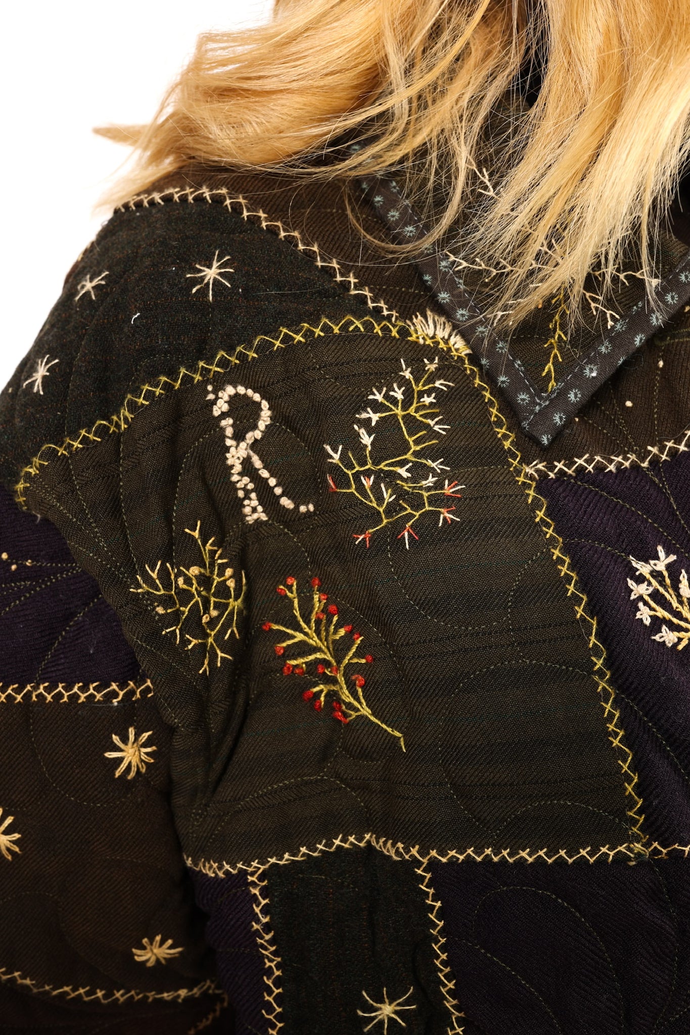 This is an antique American quilt top started in 1883 and completed in 1918 by M.D.S.C. We know this because the maker hand embroidered this information on the quilt. We have preserved this provenance and placed it on the center back of the jacket. It is a Scrappy or Crazy quilt pattern loaded with beautiful hand embroidery. We absolutely love the little French knots and turkey trot stitches that add interest and depth to the piece! To complete the quilt we backed this piece with coordinating turn-of-the-century reproduction fabric. You will want to cuff the sleeves to show this fabric off! This quilt contains wool fabrics from men‘s suit scraps. If you are sensitive to wool, please do not consider purchasing this piece. This jacket is thicker, heavier and loftier (has more puff)than we typically create. It is great for fall, winter weather, or colder climates. This piece would also look epic with a fur attached! We have shown a combo that we love! If you would like a fur, please reach out after purchasing and we will show you options! For closures we used bronze faux coin buttons. There are a few zig zag mends throughout that we have captured in photographs for your convenience. This is a size LARGE, please read size measurements below. This piece fits a range of sizes depending on how you like to style your jackets. If you have any questions please direct message us and we are happy to bore you with many more details.