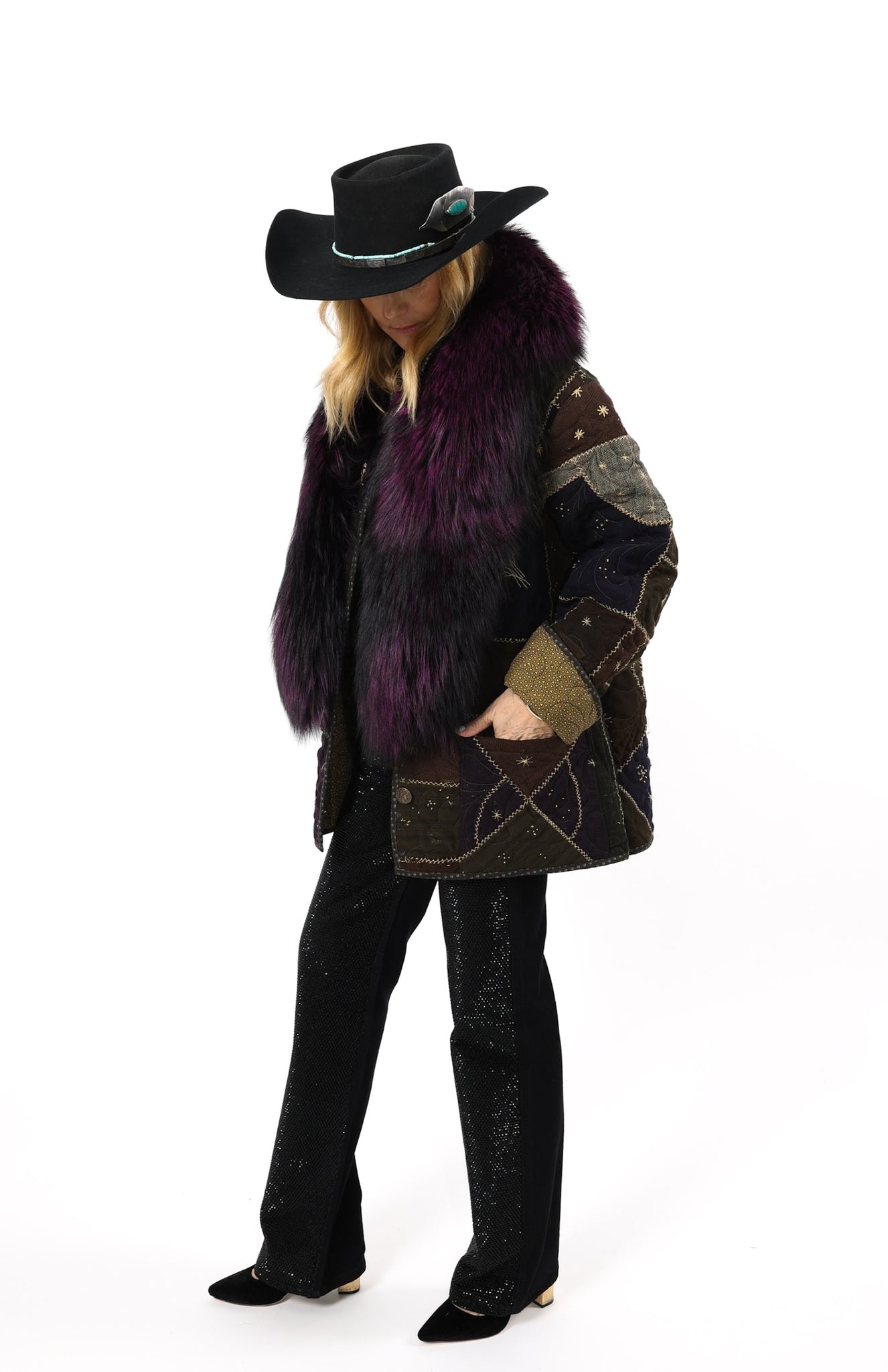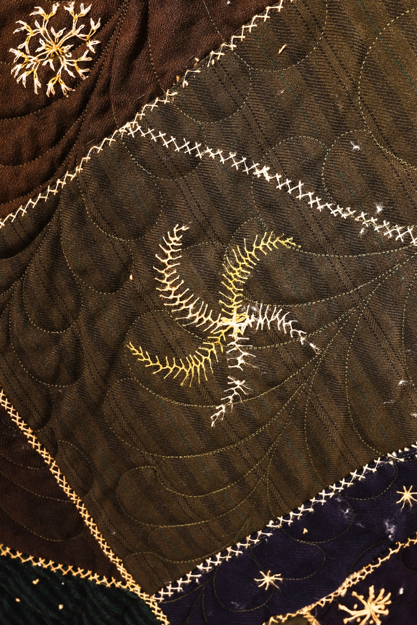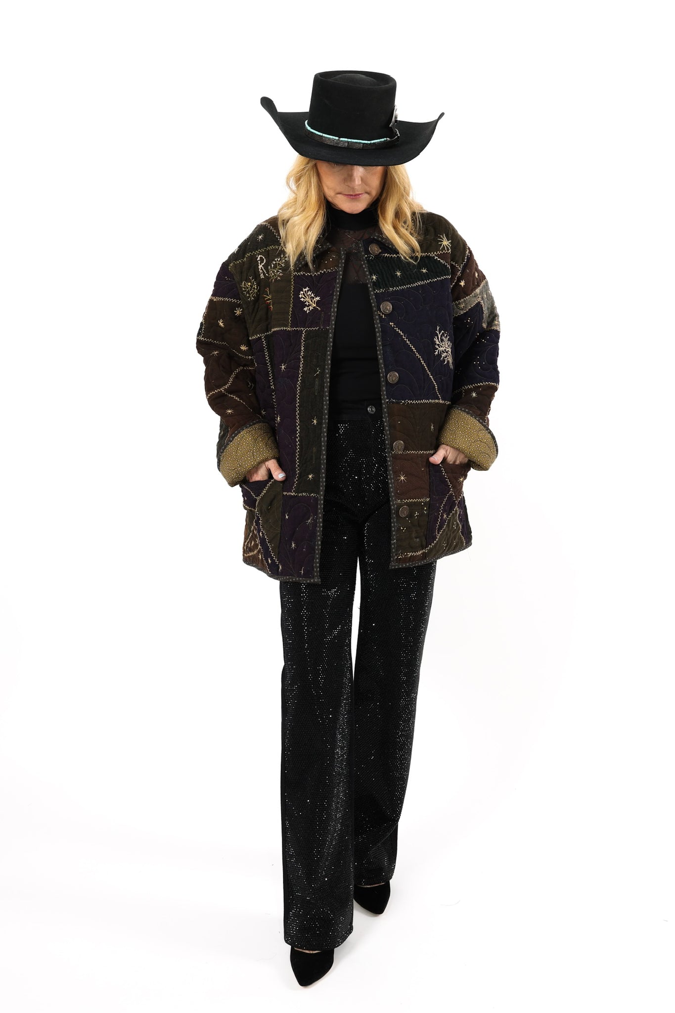 This is an antique American quilt top started in 1883 and completed in 1918 by M.D.S.C. We know this because the maker hand embroidered this information on the quilt. We have preserved this provenance and placed it on the center back of the jacket. It is a Scrappy or Crazy quilt pattern loaded with beautiful hand embroidery. We absolutely love the little French knots and turkey trot stitches that add interest and depth to the piece! To complete the quilt we backed this piece with coordinating turn-of-the-century reproduction fabric. You will want to cuff the sleeves to show this fabric off! This quilt contains wool fabrics from men‘s suit scraps. If you are sensitive to wool, please do not consider purchasing this piece. This jacket is thicker, heavier and loftier (has more puff)than we typically create. It is great for fall, winter weather, or colder climates. This piece would also look epic with a fur attached! We have shown a combo that we love! If you would like a fur, please reach out after purchasing and we will show you options! For closures we used bronze faux coin buttons. There are a few zig zag mends throughout that we have captured in photographs for your convenience. This is a size LARGE, please read size measurements below. This piece fits a range of sizes depending on how you like to style your jackets. If you have any questions please direct message us and we are happy to bore you with many more details.