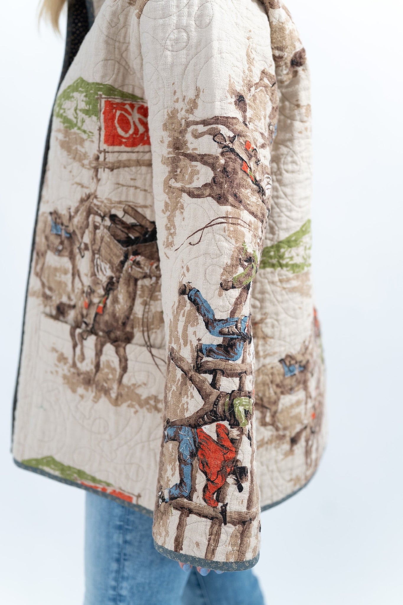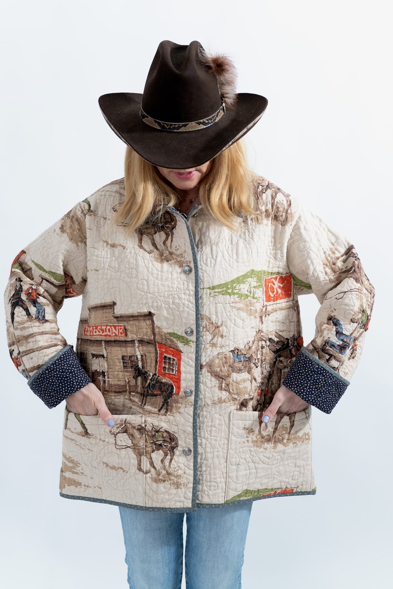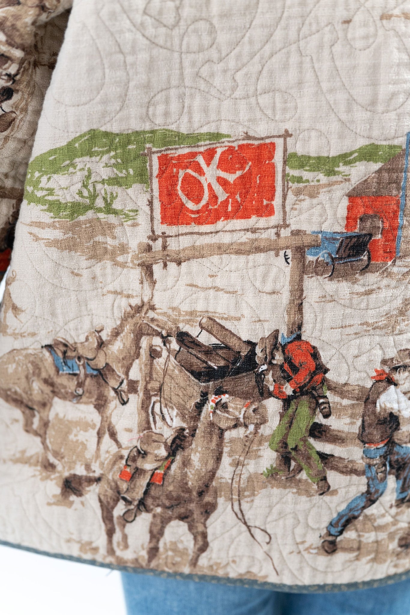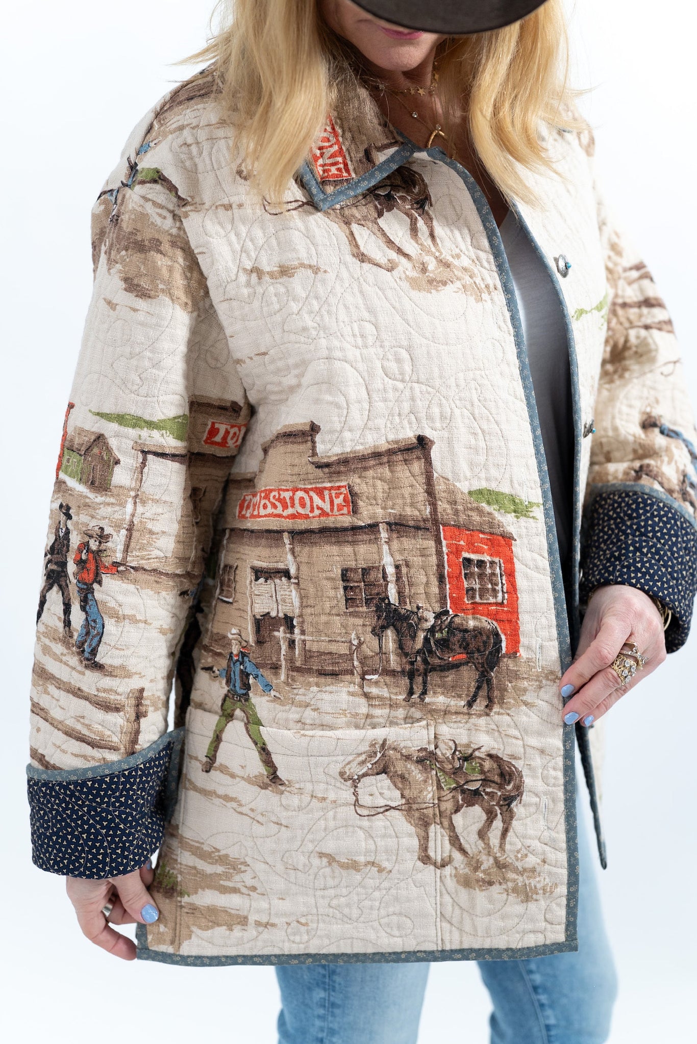 This is a Lady Lancaster original design that was brought to life by Zoe Dawn and her long arm. This quilt is a combination of western barkcloth from the 1970s and reproduction turn of the century fabric. The barkcloth shows a scene of a shoot out at the O.K. corral in the town of Tombstone. In our opinion, the jacket is very soft, very lightweight, and comfortable to wear. This piece will look great with everything in your closet. We used faux silver and turquoise buttons as closures. This piece is great for a warmer climates or if you run hott! This is a size LARGE, please read size measurements below. This piece fits a range of sizes depending on how you like to style your jackets. If you have any questions please direct message us and we are happy to bore you with many more details.