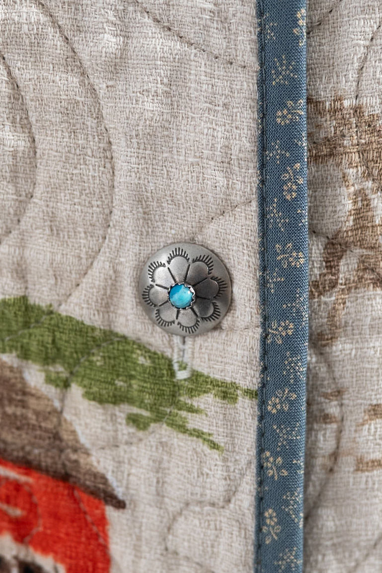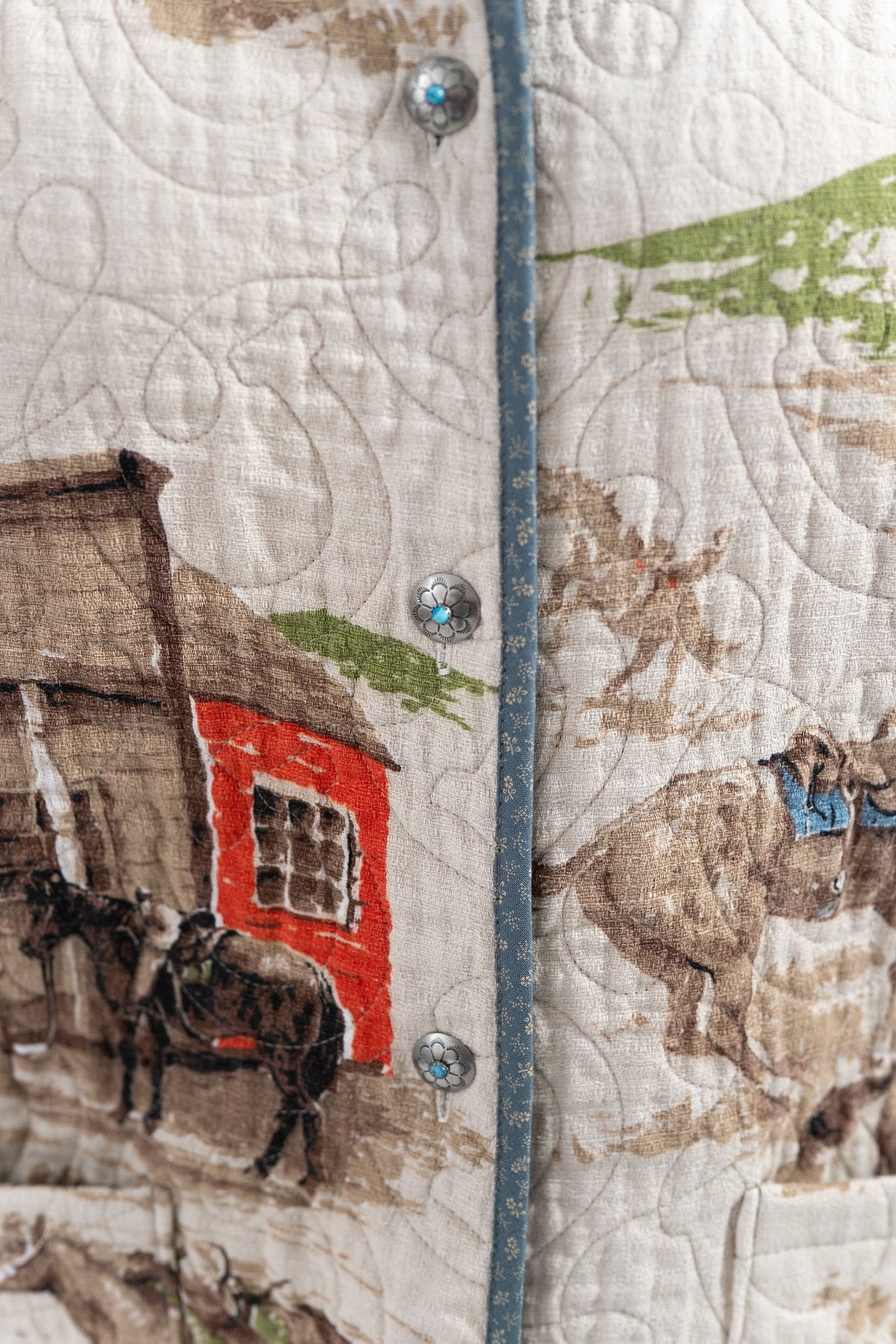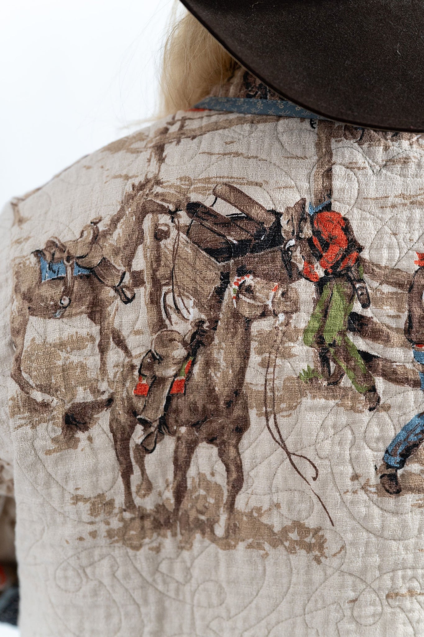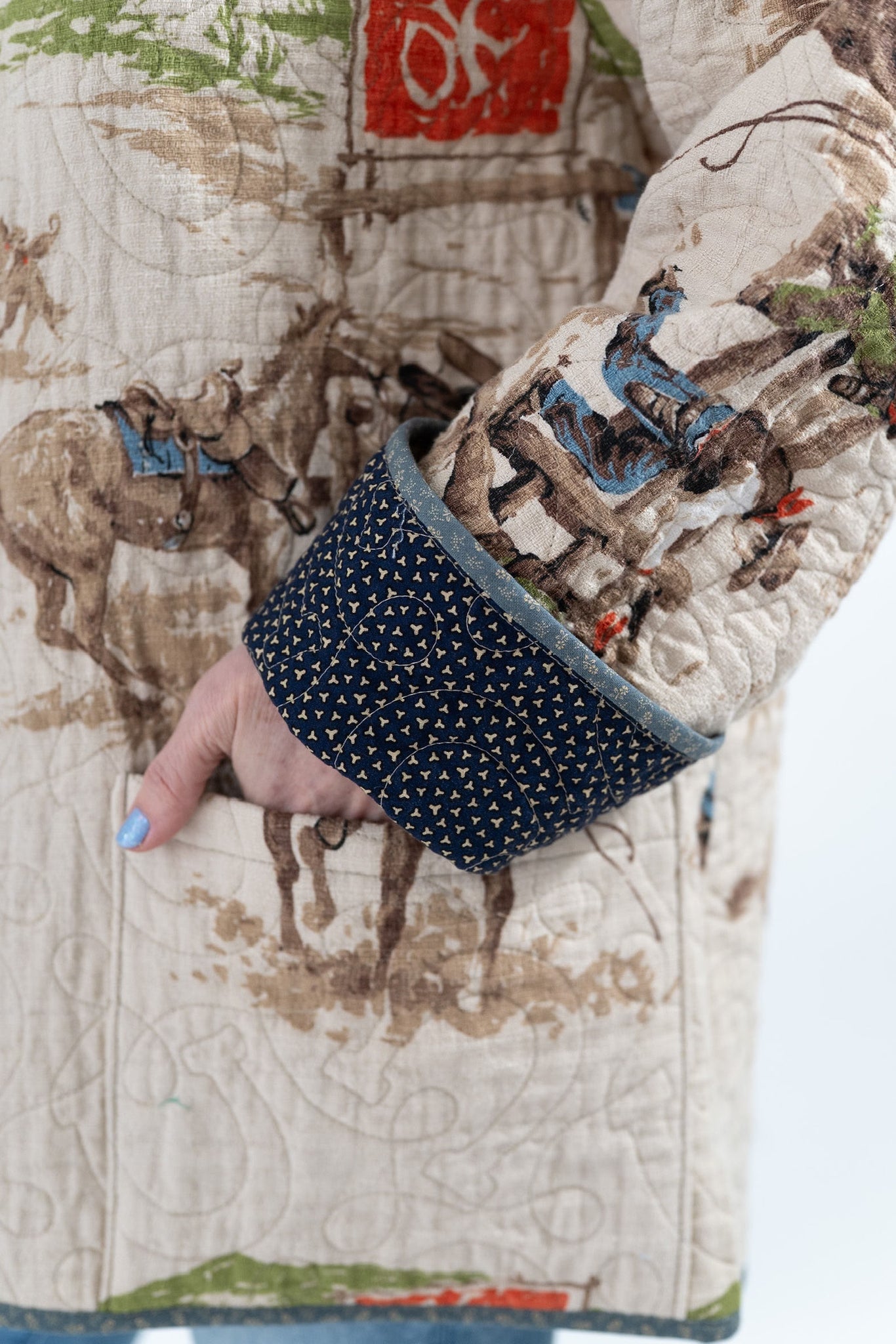 This is a Lady Lancaster original design that was brought to life by Zoe Dawn and her long arm. This quilt is a combination of western barkcloth from the 1970s and reproduction turn of the century fabric. The barkcloth shows a scene of a shoot out at the O.K. corral in the town of Tombstone. In our opinion, the jacket is very soft, very lightweight, and comfortable to wear. This piece will look great with everything in your closet. We used faux silver and turquoise buttons as closures. This piece is great for a warmer climates or if you run hott! This is a size LARGE, please read size measurements below. This piece fits a range of sizes depending on how you like to style your jackets. If you have any questions please direct message us and we are happy to bore you with many more details.