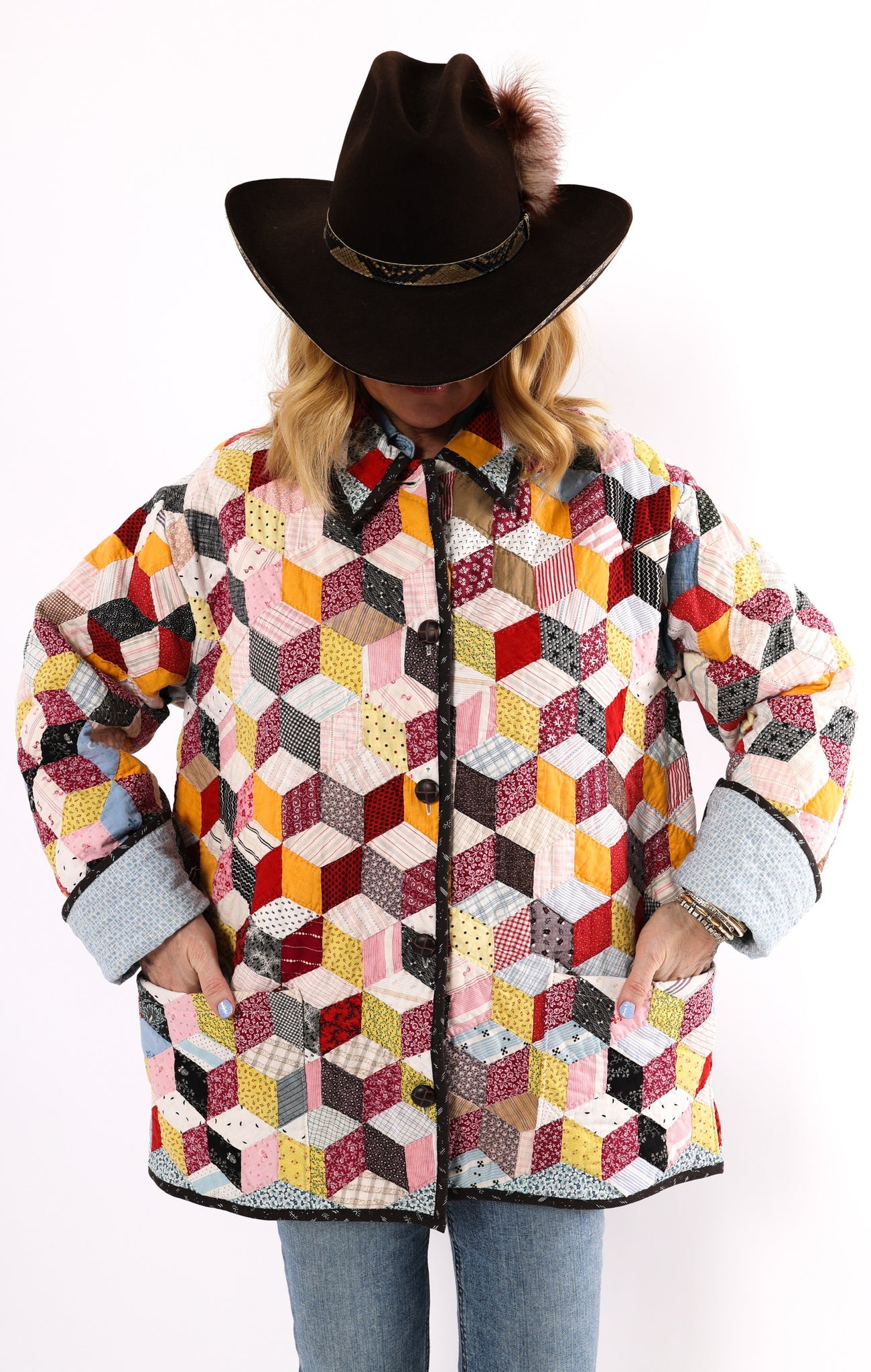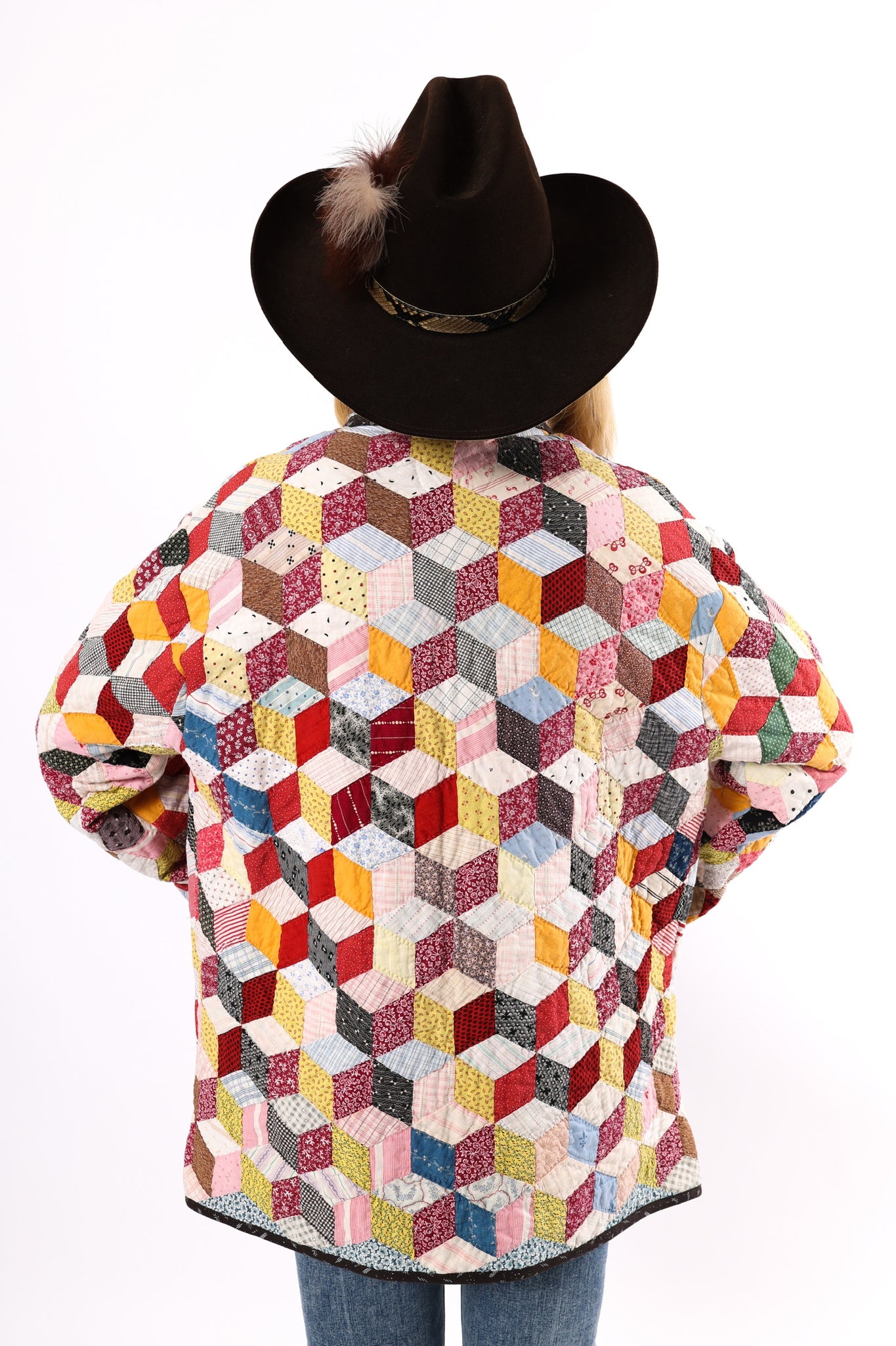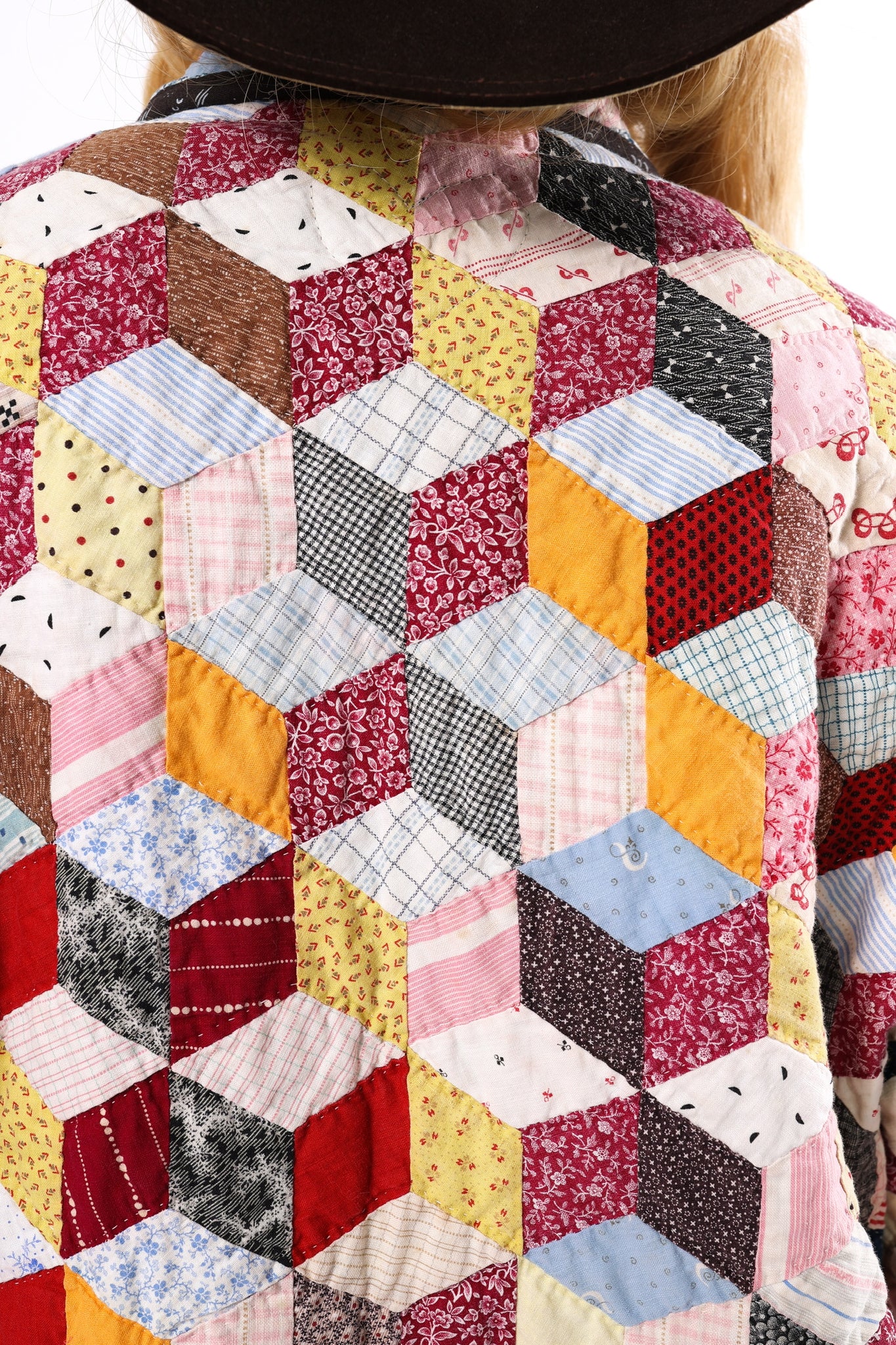 This is a Lancaster County Mennonite quilt made by an absolute master! This piece was constructed circa 1890s to 1920. It is a traditional Tumbling Block quilt pattern. It is a heritage piece and a window into the turn of the century. The quilt was beautifully hand quilted and hand sewn. It is spectacular for its tiny pieces and crisp points. In our opinion, the jacket is very thin and very lightweight. This is what we consider a summer weight quilt, meaning it was made for aesthetics, not warmth. It is very comfortable to wear. The maker backed this piece with a beautiful blue backing fabric, inside of jacket. You will want to cuff the sleeves to show this off! For closures, we used faux leather buttons. Please note, there is a very subtle color bleed into the cheddar, which we have captured in the photographs. This is a size LARGE, please read size measurements below. This piece fits a range of sizes depending on how you like to style your jackets. If you have any questions please direct message us and we are happy to bore you with many more details.