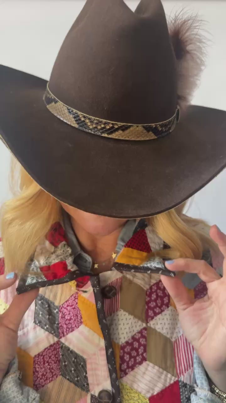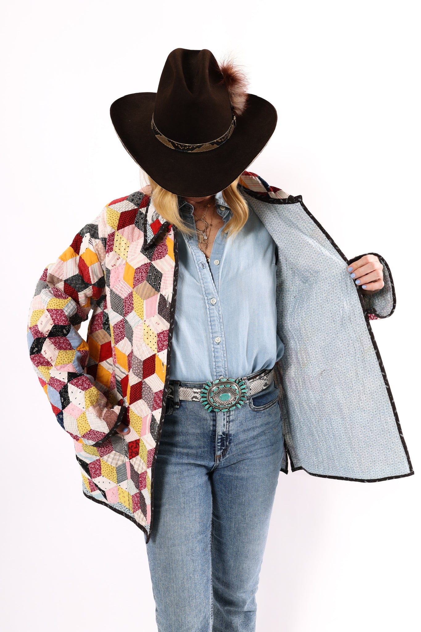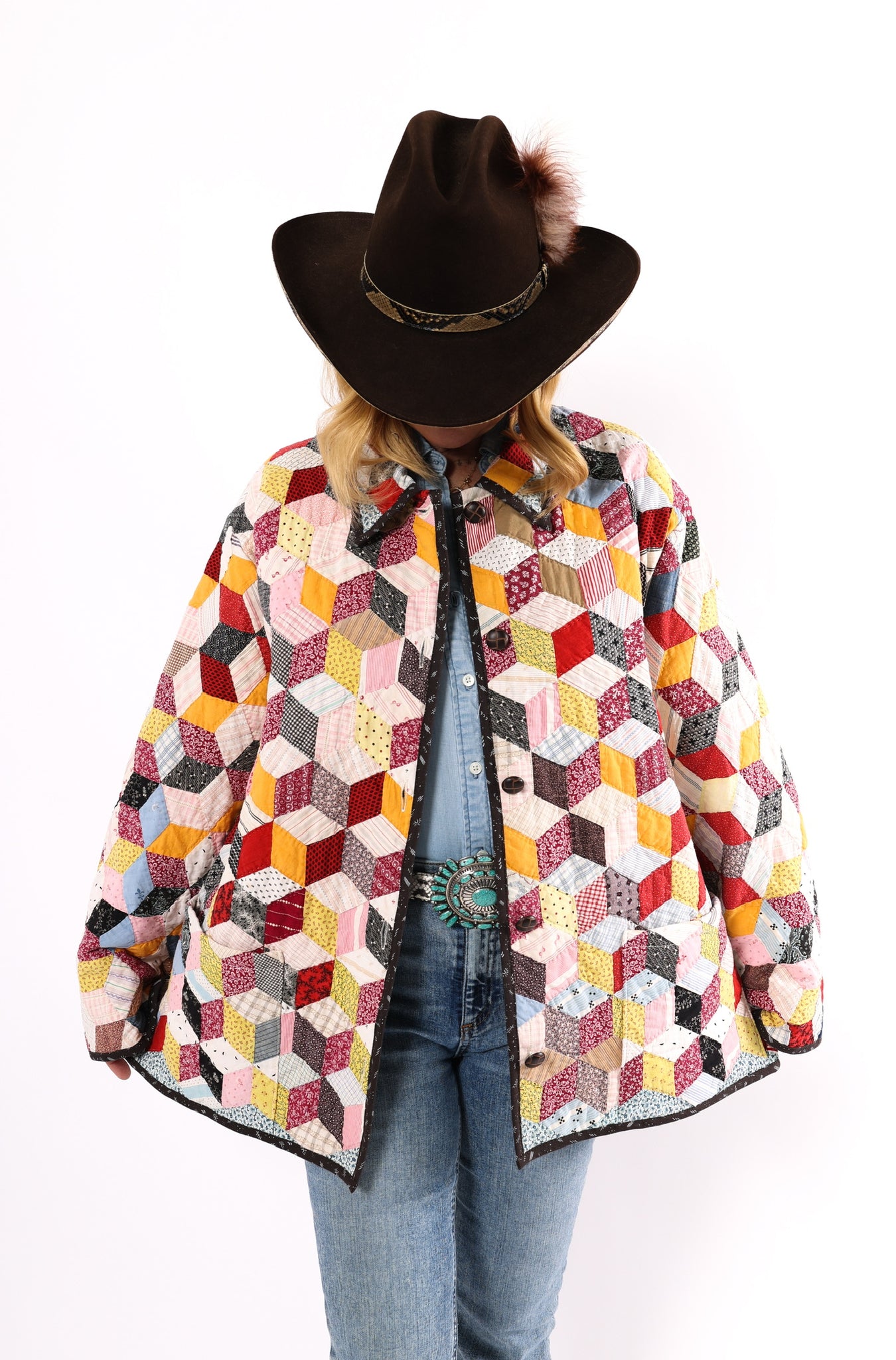 This is a Lancaster County Mennonite quilt made by an absolute master! This piece was constructed circa 1890s to 1920. It is a traditional Tumbling Block quilt pattern. It is a heritage piece and a window into the turn of the century. The quilt was beautifully hand quilted and hand sewn. It is spectacular for its tiny pieces and crisp points. In our opinion, the jacket is very thin and very lightweight. This is what we consider a summer weight quilt, meaning it was made for aesthetics, not warmth. It is very comfortable to wear. The maker backed this piece with a beautiful blue backing fabric, inside of jacket. You will want to cuff the sleeves to show this off! For closures, we used faux leather buttons. Please note, there is a very subtle color bleed into the cheddar, which we have captured in the photographs. This is a size LARGE, please read size measurements below. This piece fits a range of sizes depending on how you like to style your jackets. If you have any questions please direct message us and we are happy to bore you with many more details.