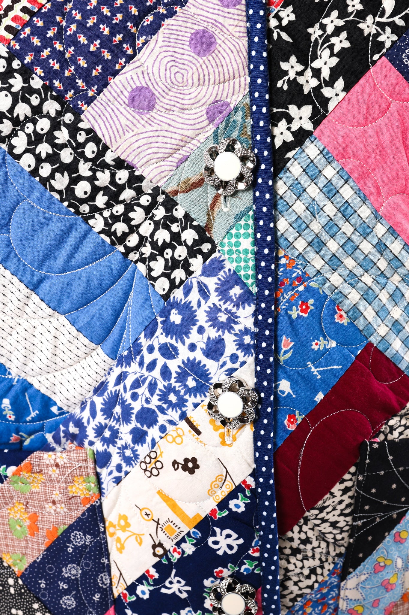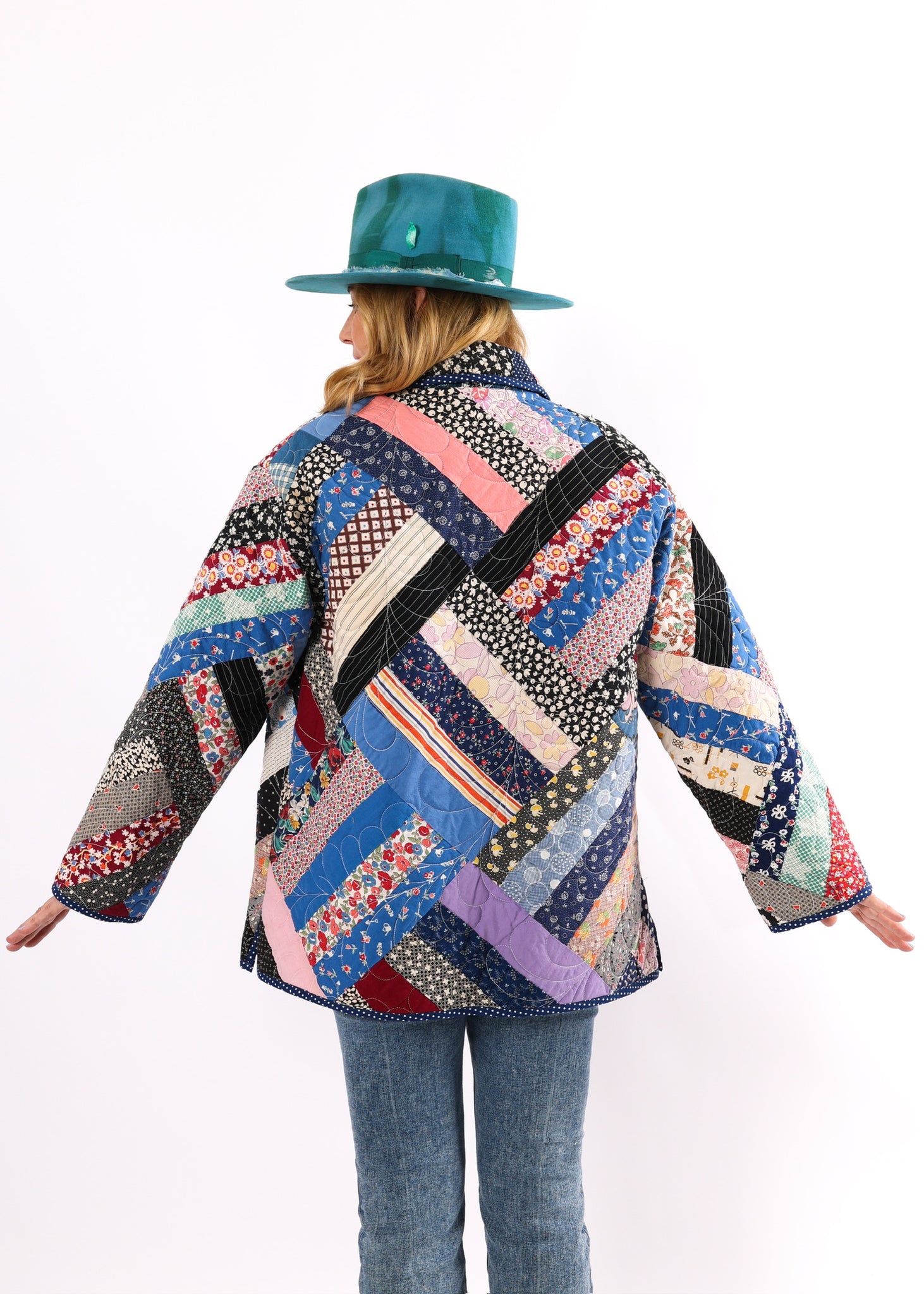 This is an antique American quilt top made circa 1930s to 1940s. The quilt pattern has been referred to as Colt's Corral, Five Stripes, or Modern Blocks. To complete the quilt we backed the orphan top with novelty fabric. The quilt top was beautifully hand sewn. The piece was quilted on a long arm by our friend Zoe Dawn. We used silver and white buttons as closures. In our opinion, the jacket is thin, lightweight with very little loft(puffiness), soft, and very comfortable to wear. This piece will go with everything in your closet. This is a size Medium, please read size measurements below. This piece fits a range of sizes depending on how you like to style your jackets. If you have any questions please direct message us and we are happy to bore you with many more details.