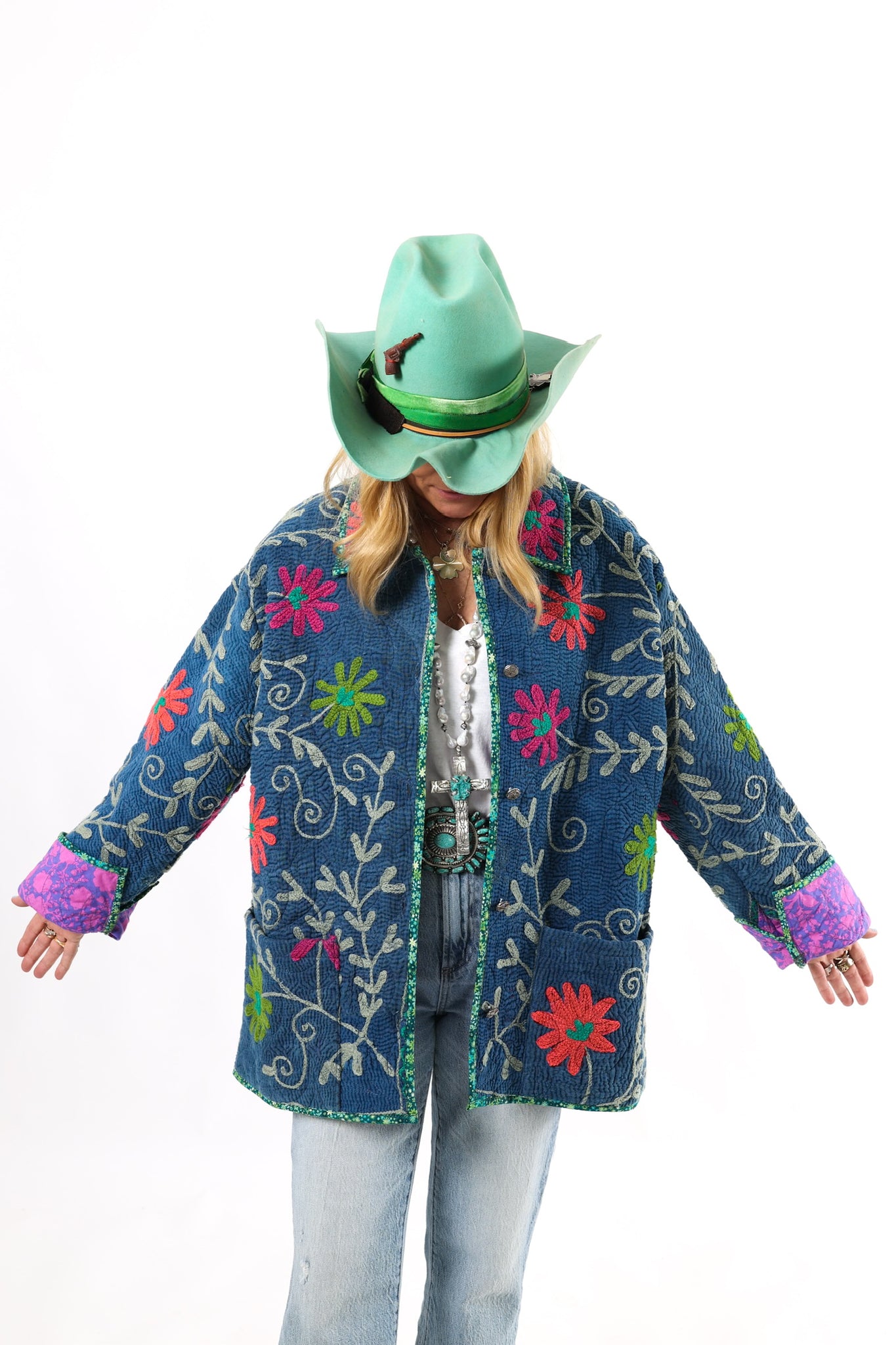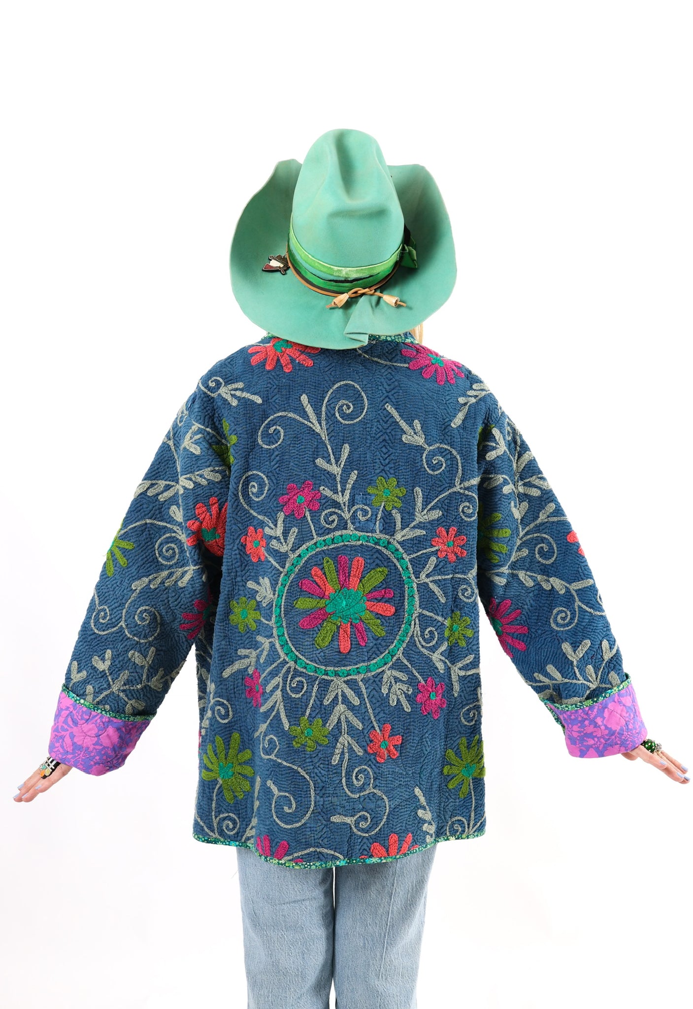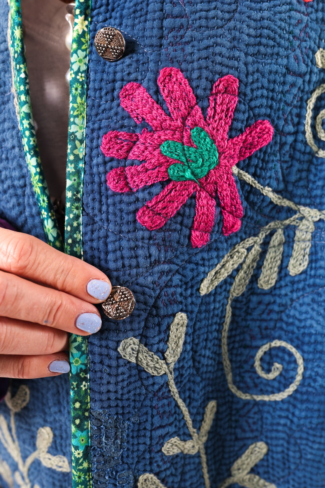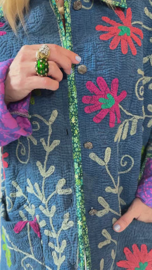 This quilt is a combination of a vintage Indian Kantha and very cheerful Free Spirit fabric. The kantha is a very soft over dyed indigo. It is loaded with heavy embroidery. The kantha was hand quilted with a running stitch, the whole quilt was then long armed by Zoe Dawn. It does not have a super floppy drape. We added vintage silver glass buttons as closures. This is a size LARGE, please read size measurements below. This piece fits a range of sizes depending on how you like to style your jackets. If you have any questions please direct message us and we are happy to bore you with many more details.