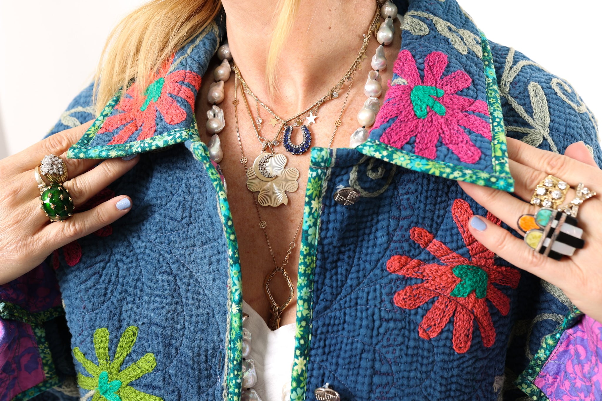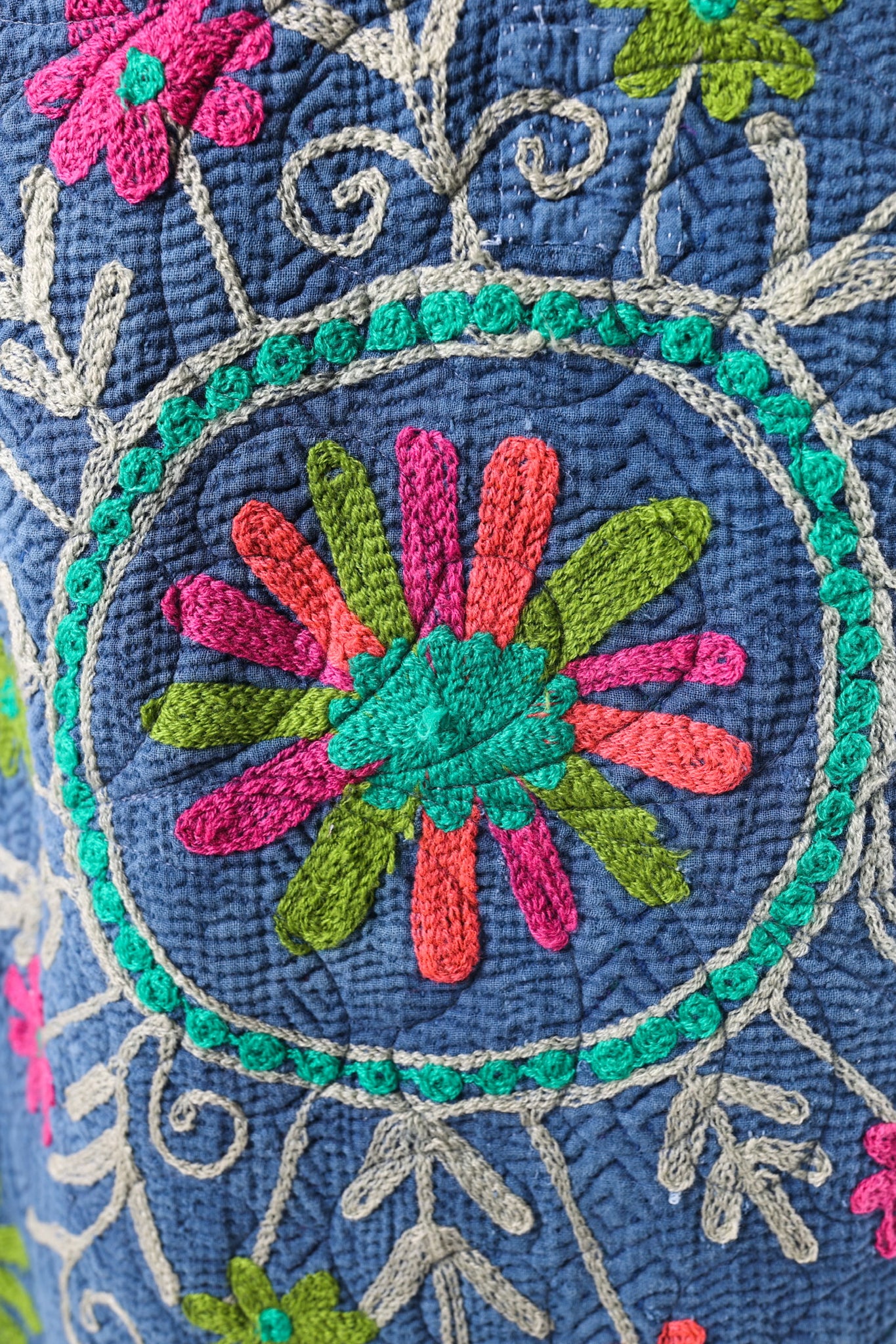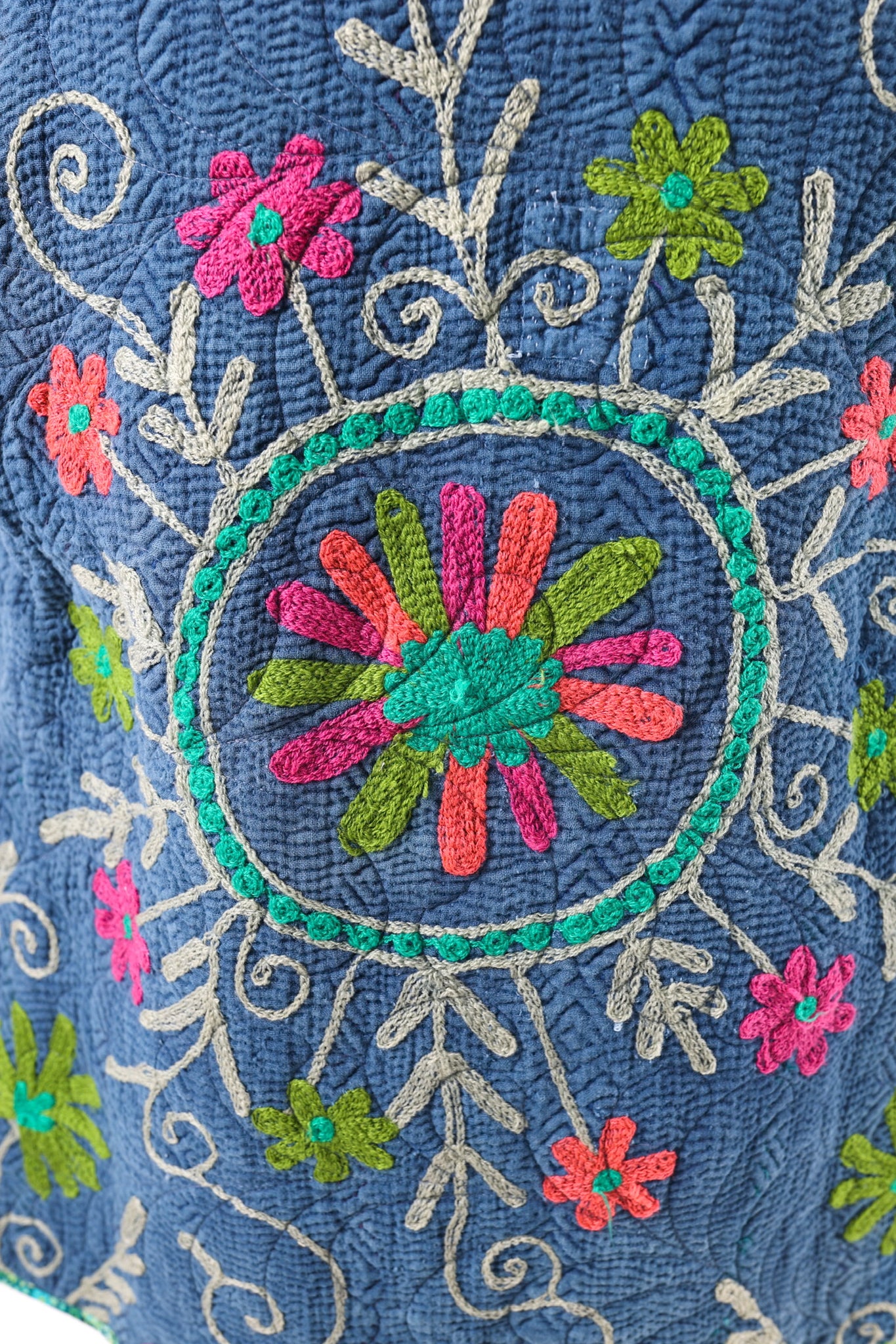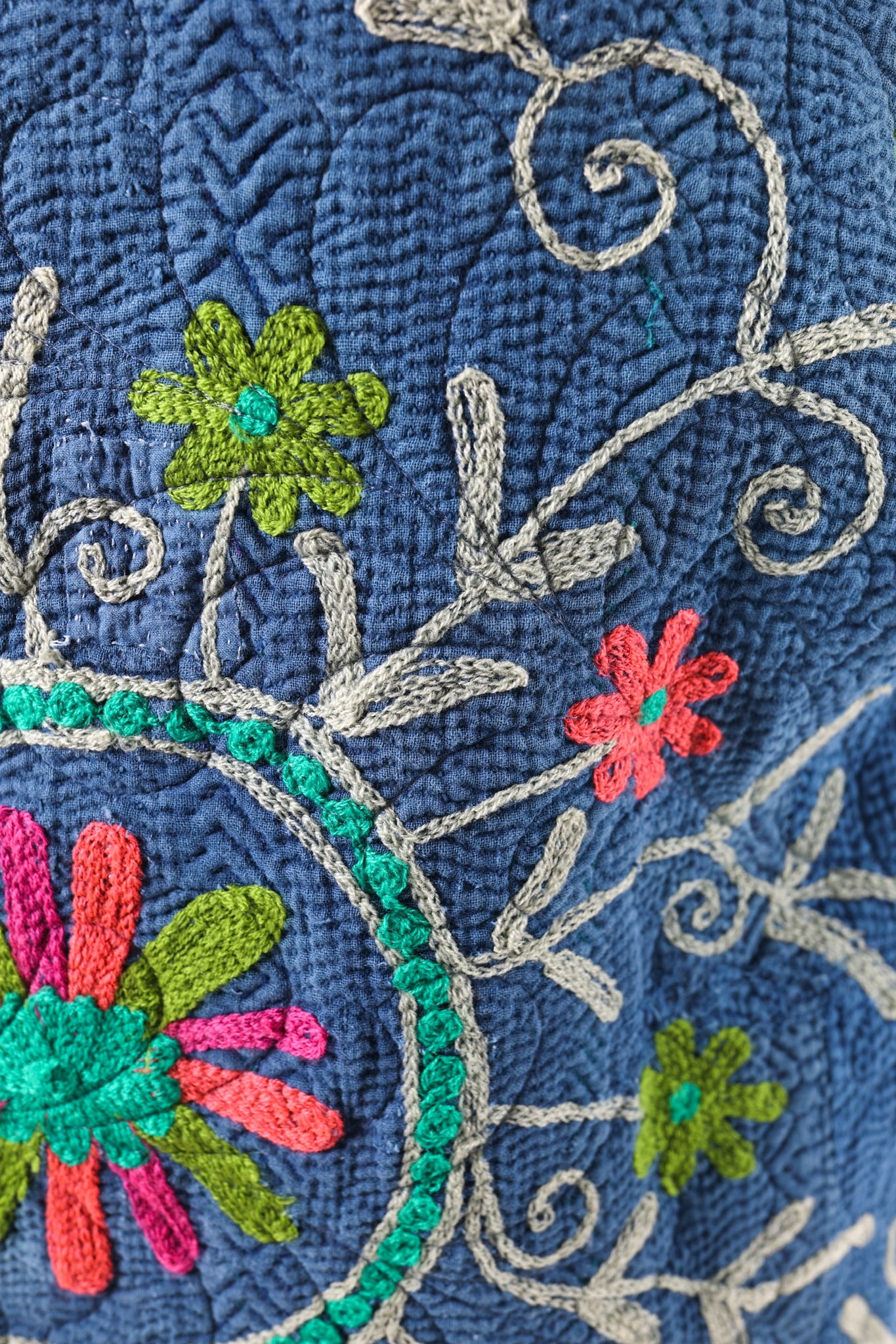 This quilt is a combination of a vintage Indian Kantha and very cheerful Free Spirit fabric. The kantha is a very soft over dyed indigo. It is loaded with heavy embroidery. The kantha was hand quilted with a running stitch, the whole quilt was then long armed by Zoe Dawn. It does not have a super floppy drape. We added vintage silver glass buttons as closures. This is a size LARGE, please read size measurements below. This piece fits a range of sizes depending on how you like to style your jackets. If you have any questions please direct message us and we are happy to bore you with many more details.